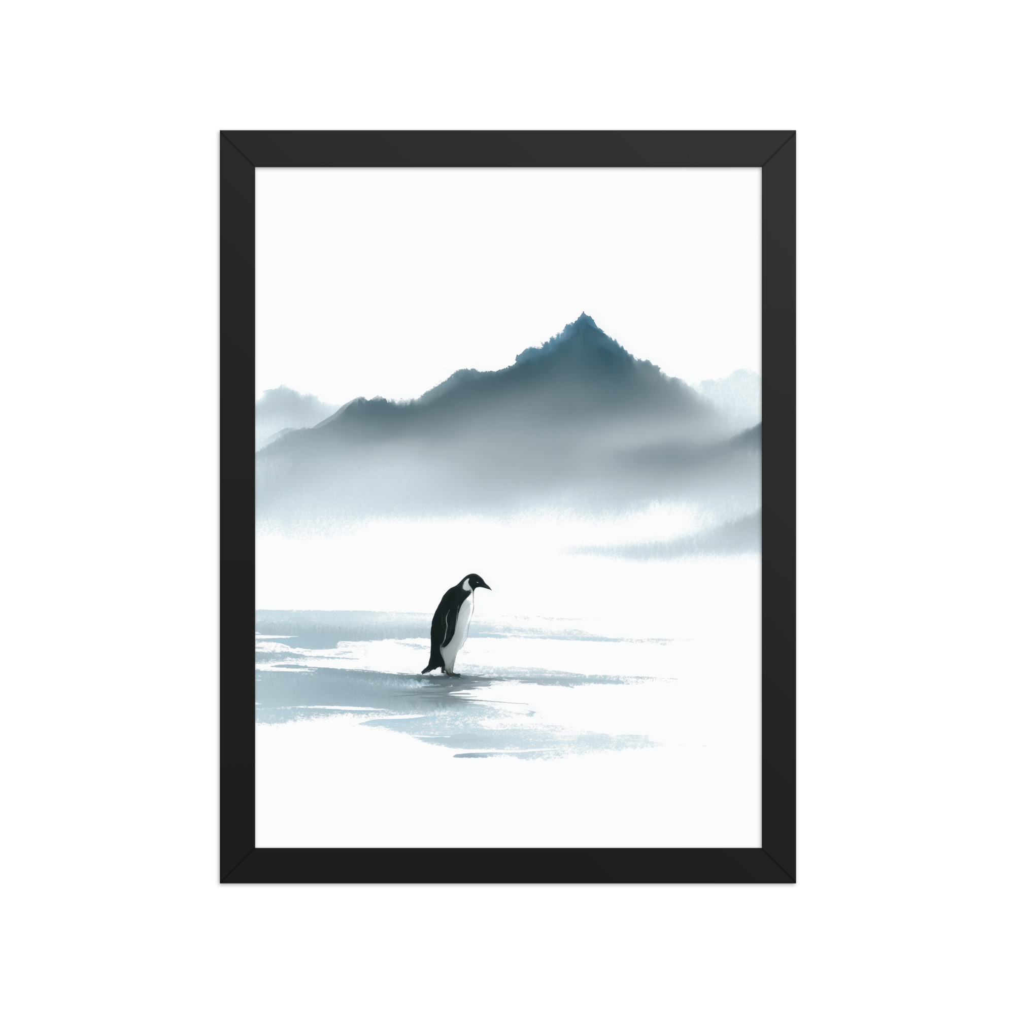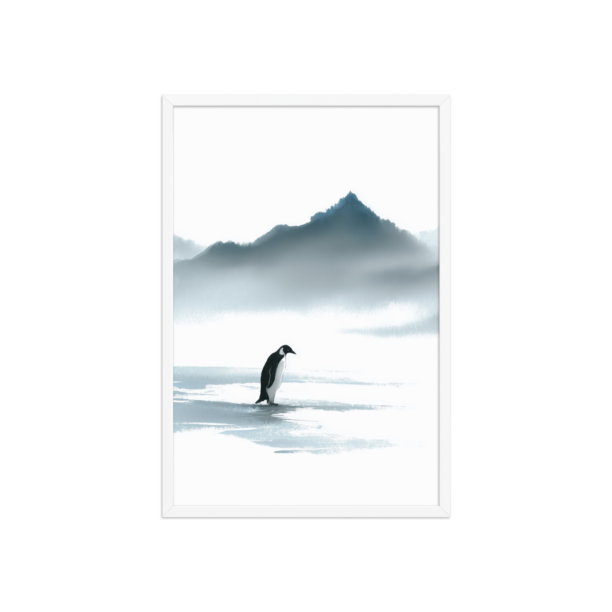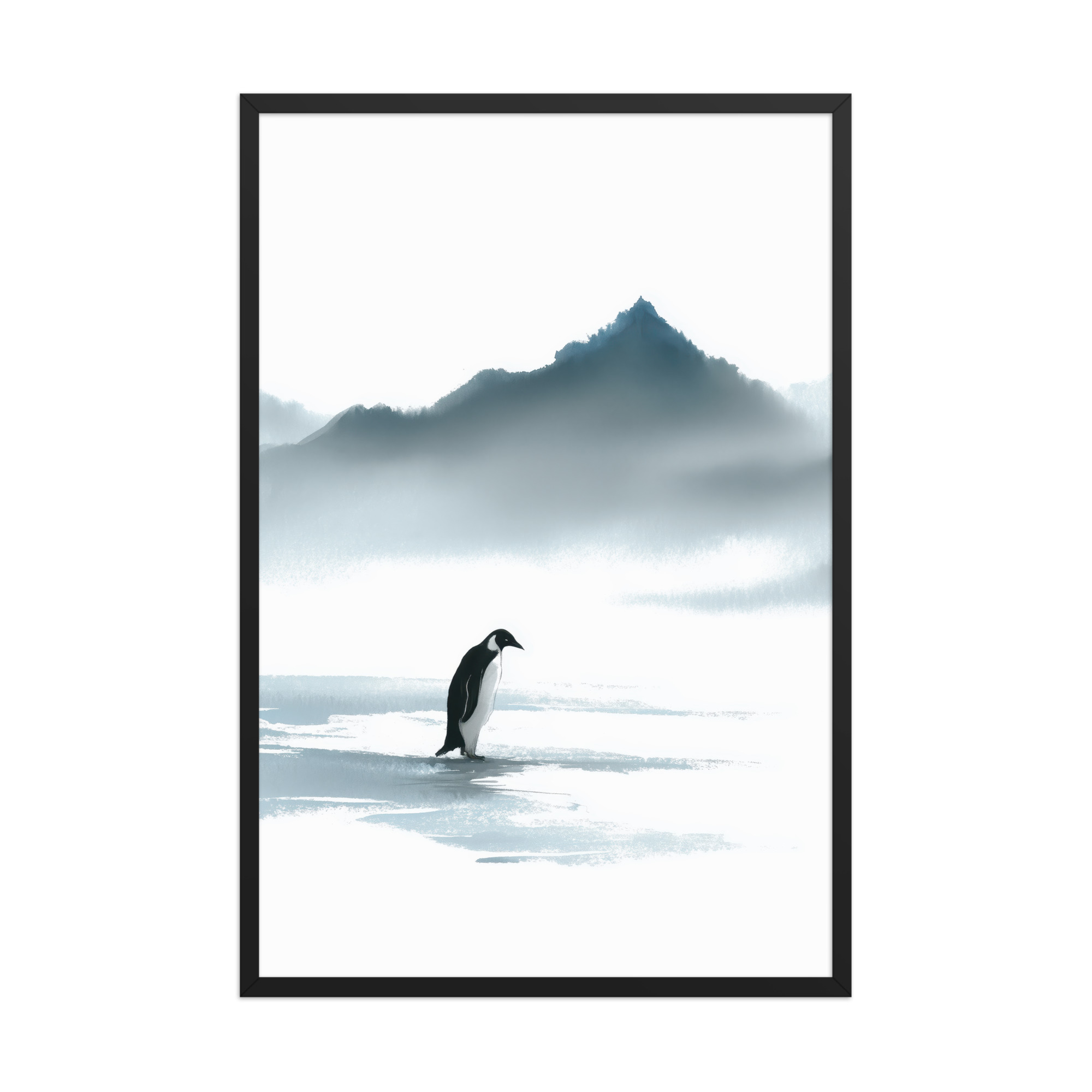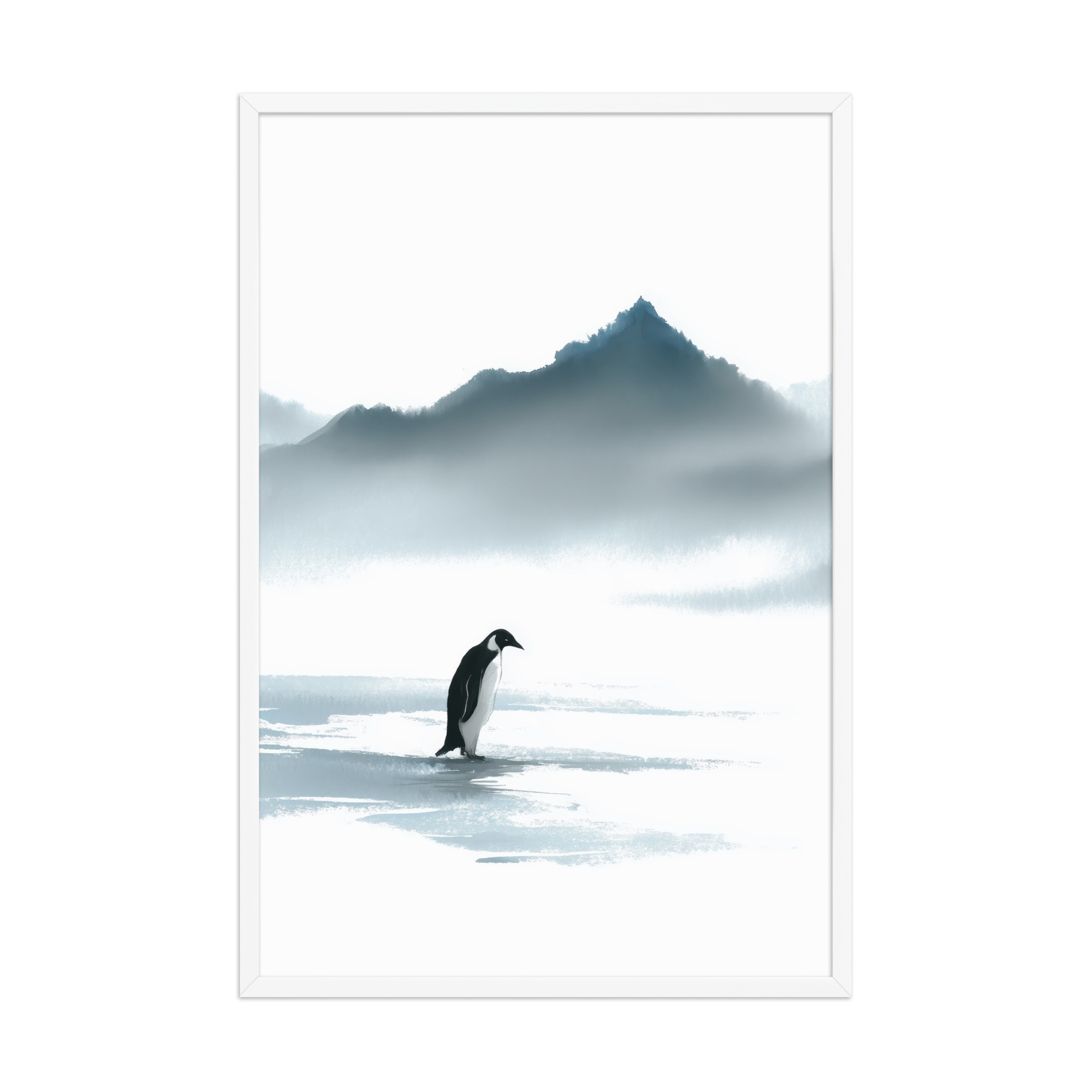 Lone Penguin Mist I captures a quiet pause in the arctic: a single penguin holding still while cool light washes over fog-softened peaks. The generous negative space and restrained palette create an atmosphere of clarity and calm for minimalist and Japandi interiors.