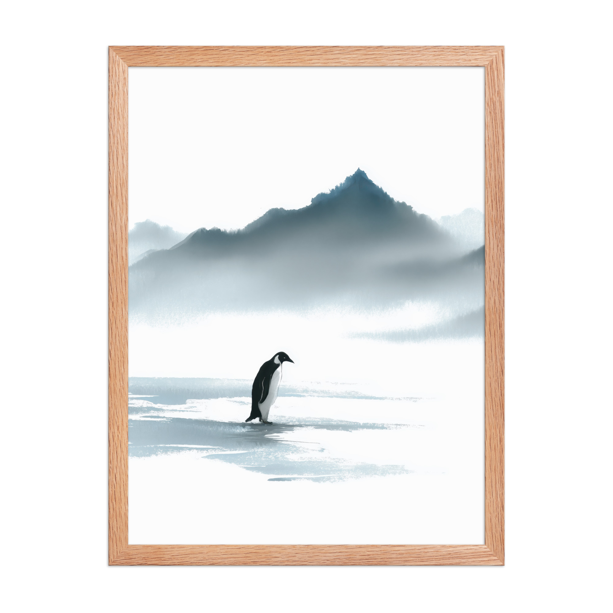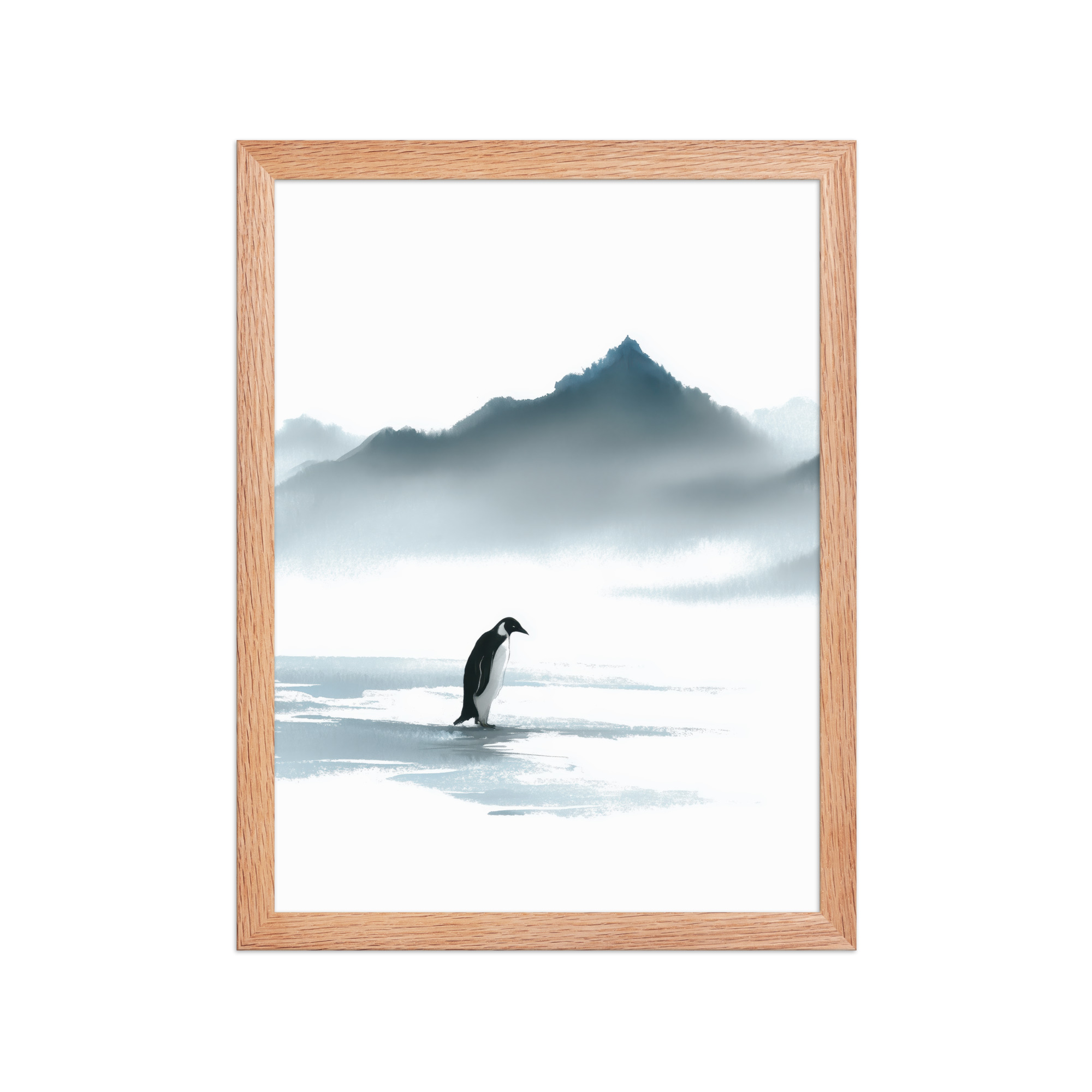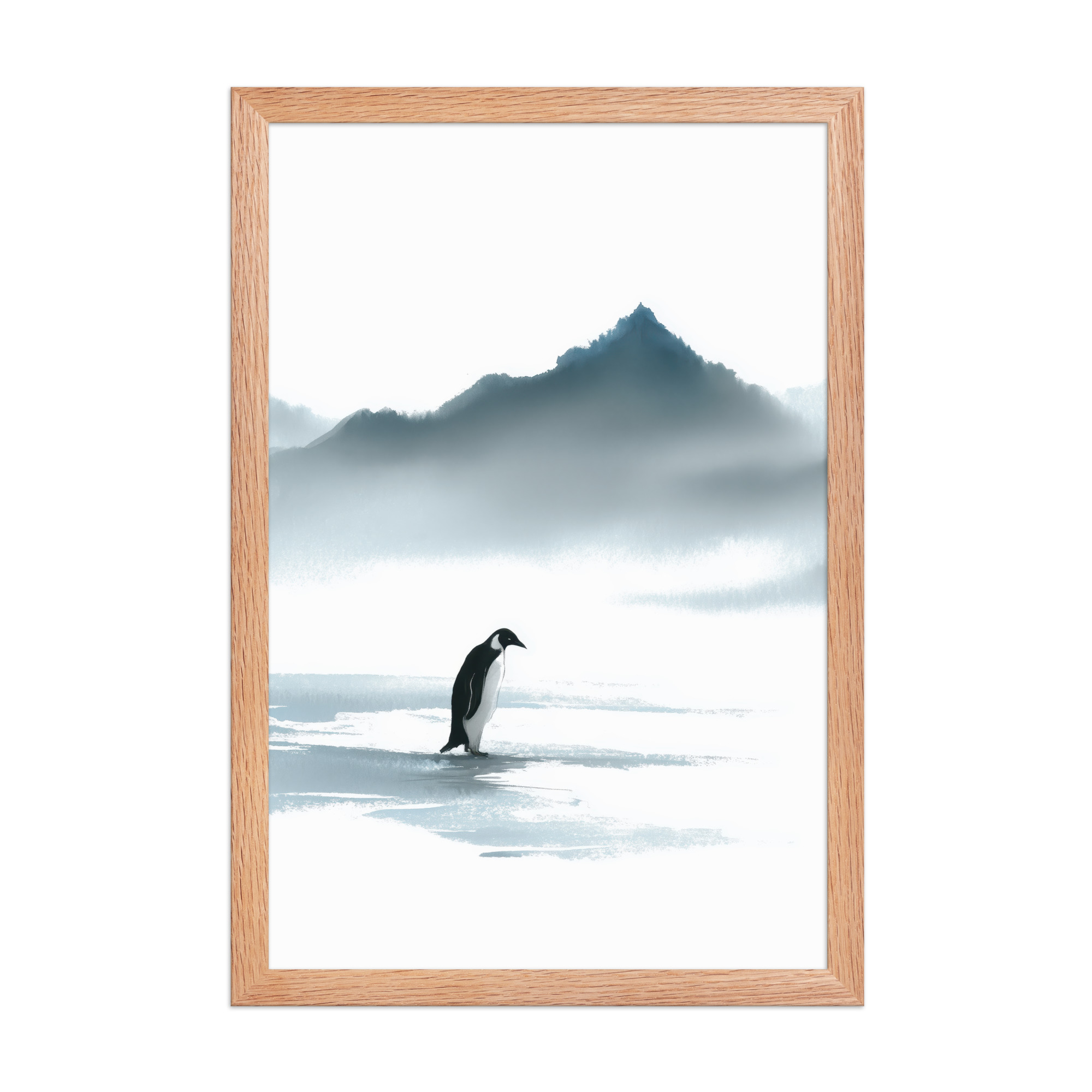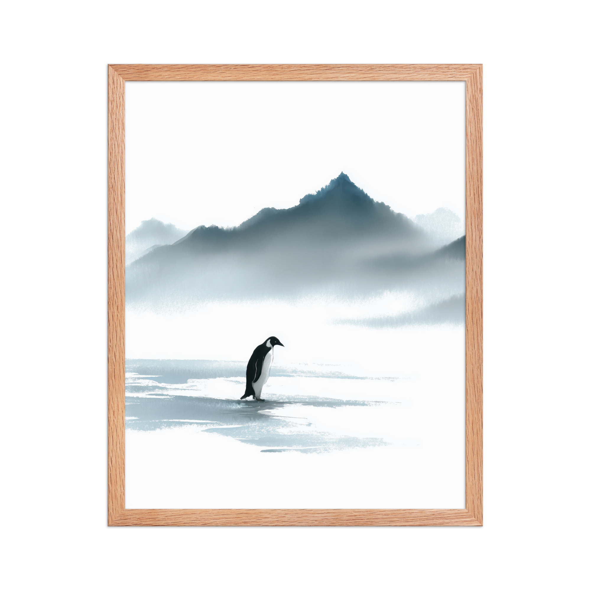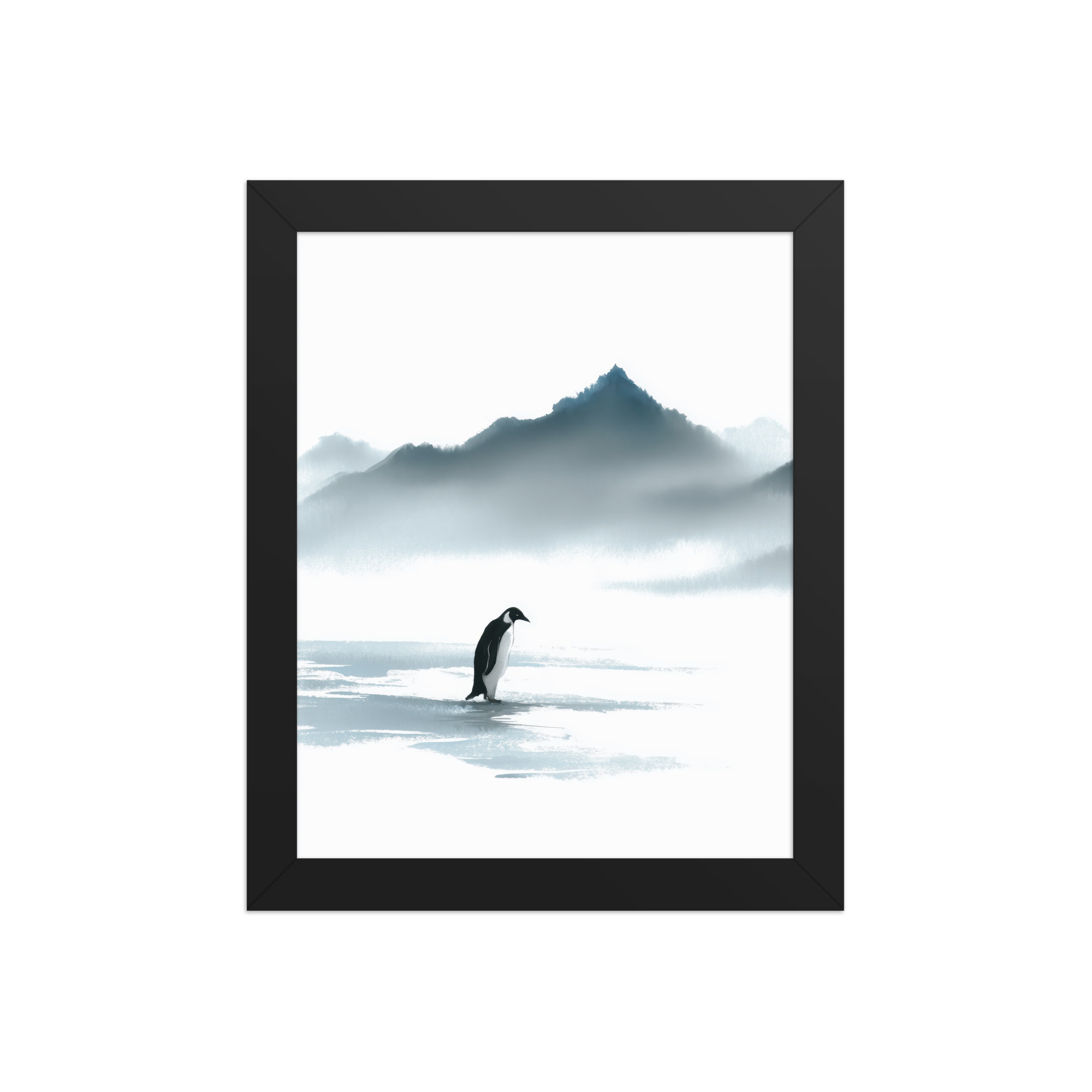 Lone Penguin Mist I captures a quiet pause in the arctic: a single penguin holding still while cool light washes over fog-softened peaks. The generous negative space and restrained palette create an atmosphere of clarity and calm for minimalist and Japandi interiors.