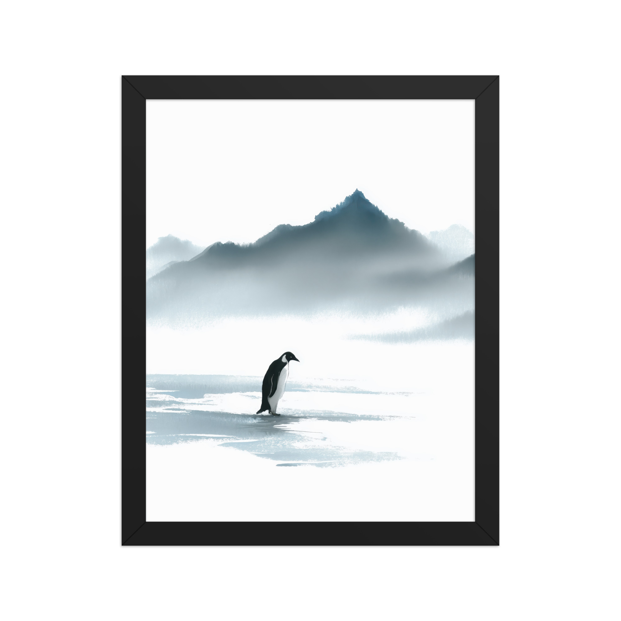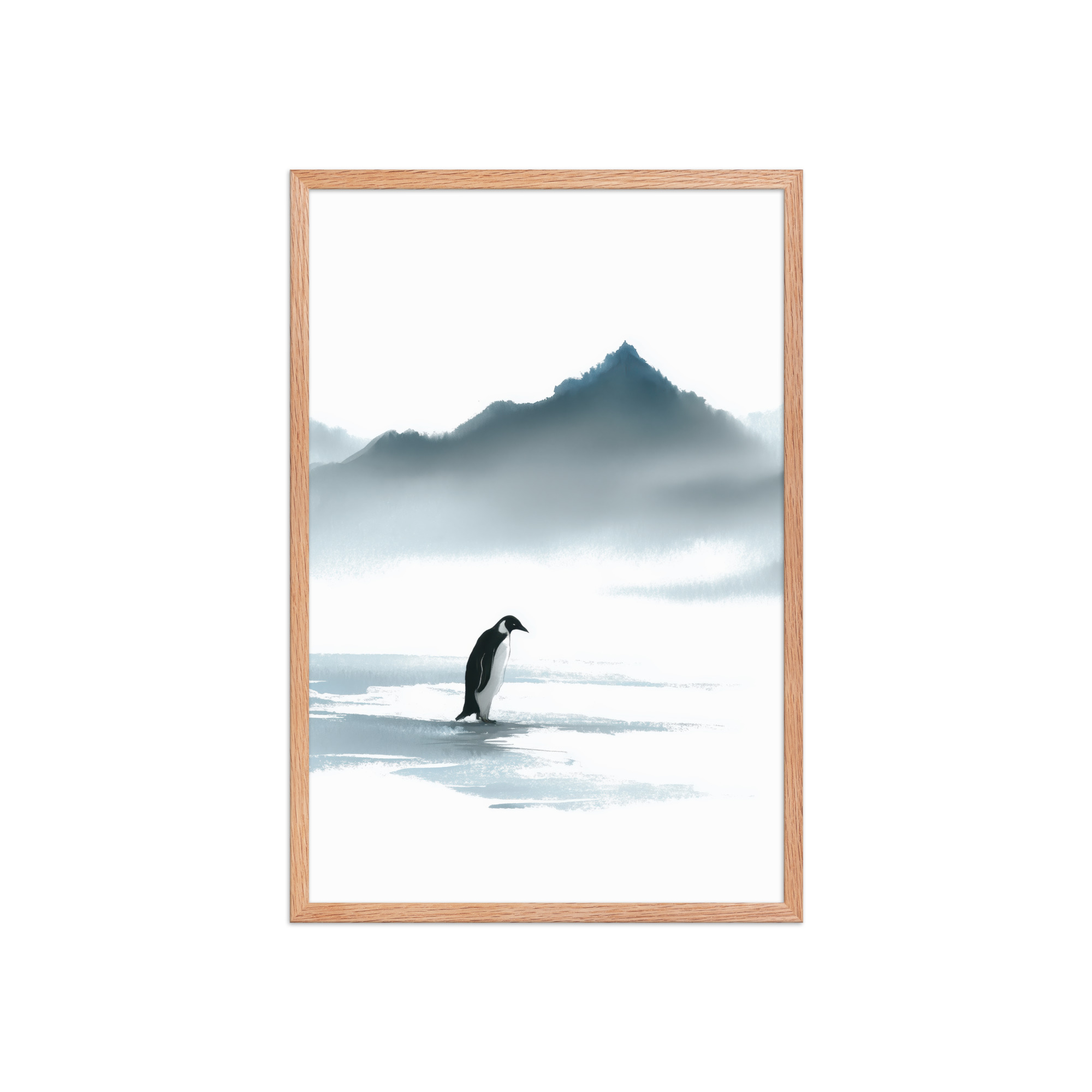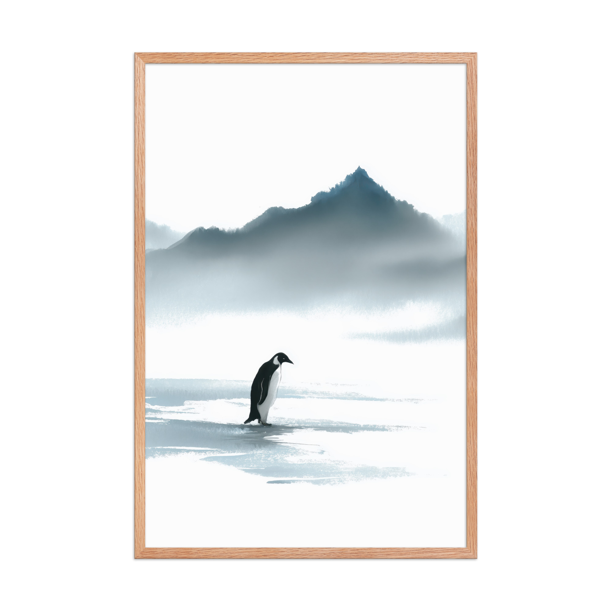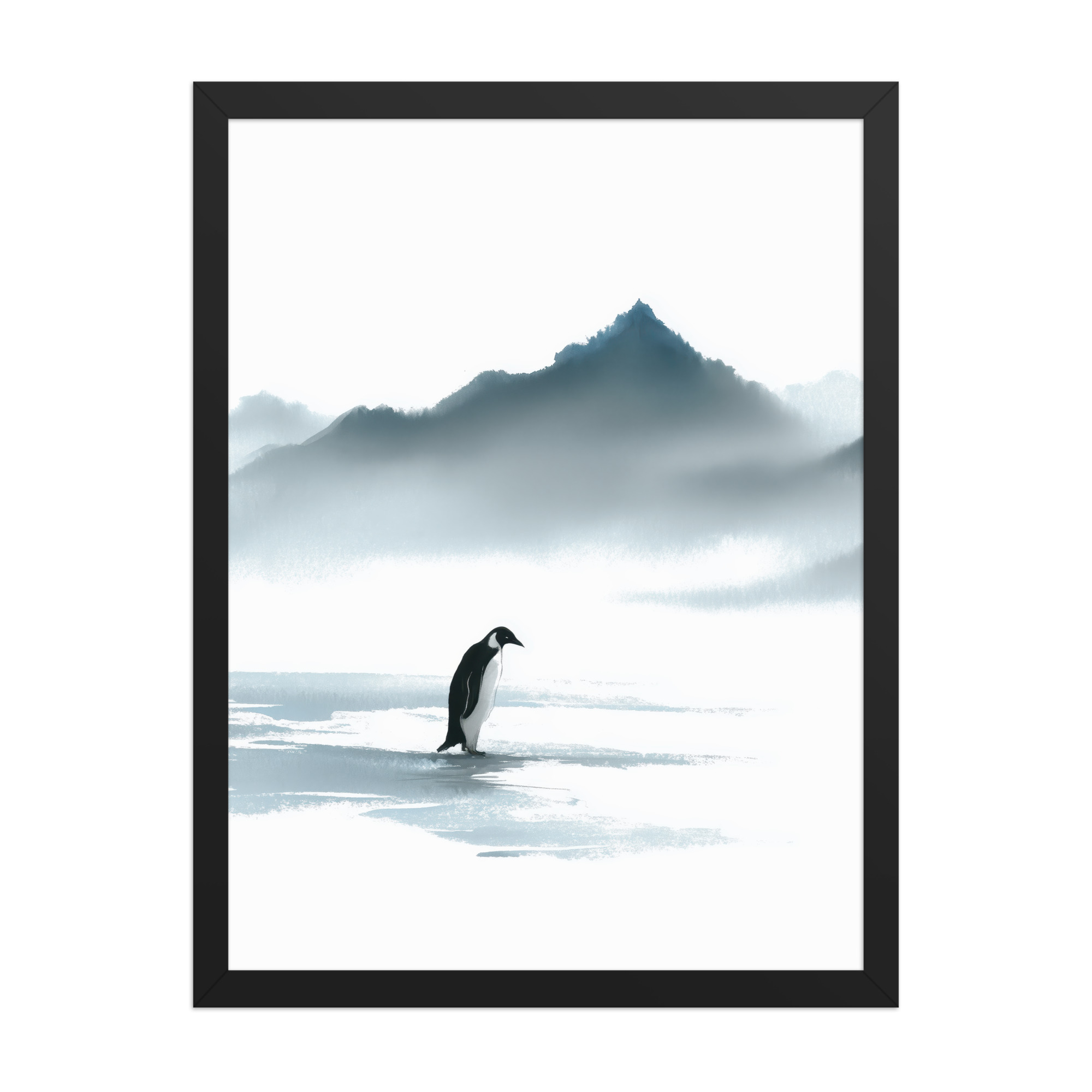 Lone Penguin Mist I captures a quiet pause in the arctic: a single penguin holding still while cool light washes over fog-softened peaks. The generous negative space and restrained palette create an atmosphere of clarity and calm for minimalist and Japandi interiors.