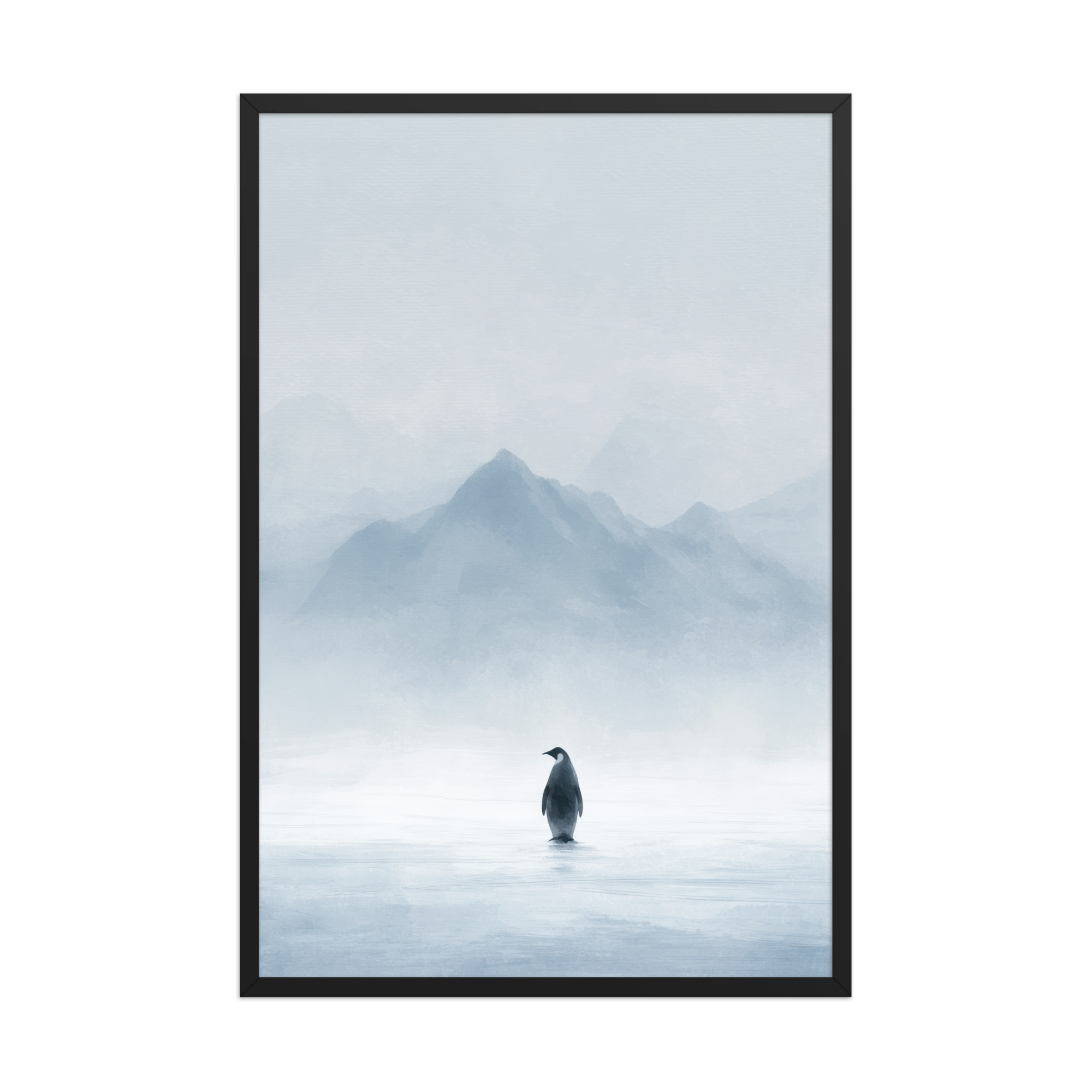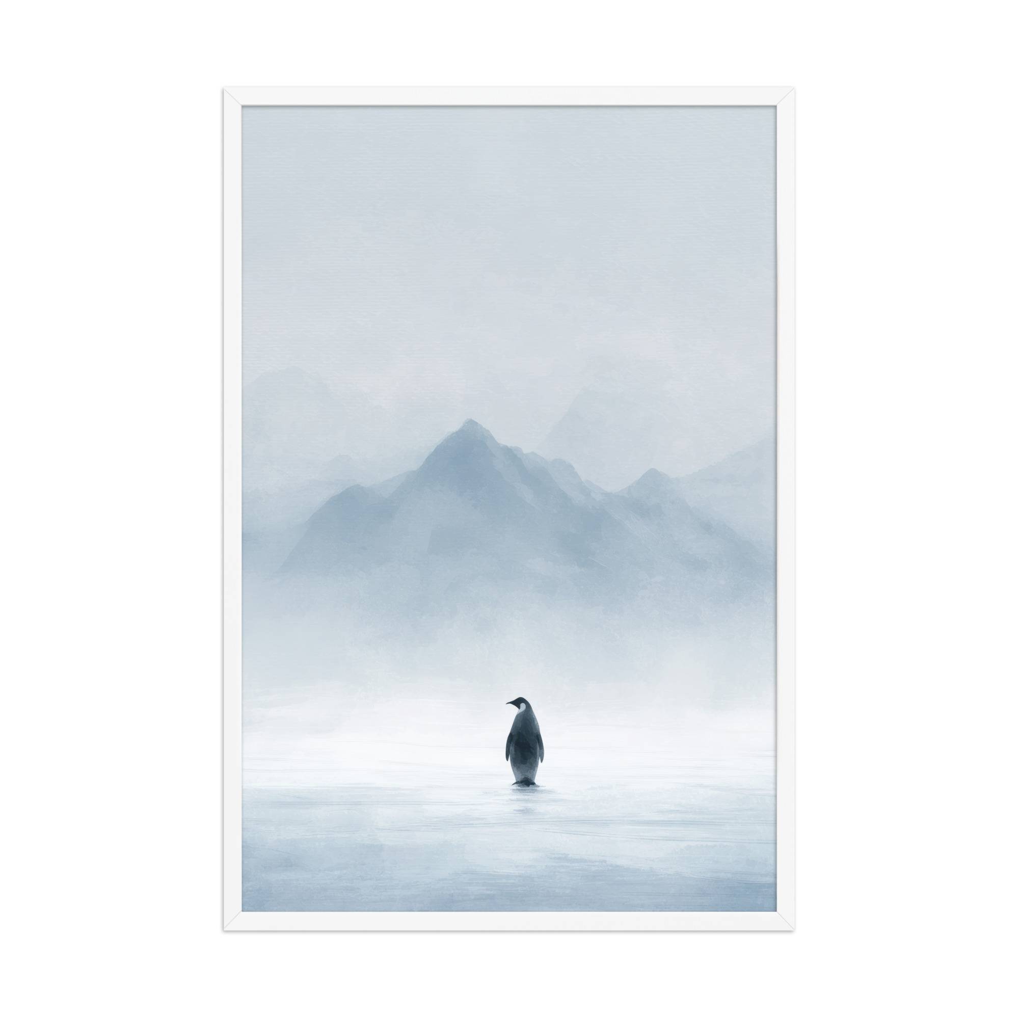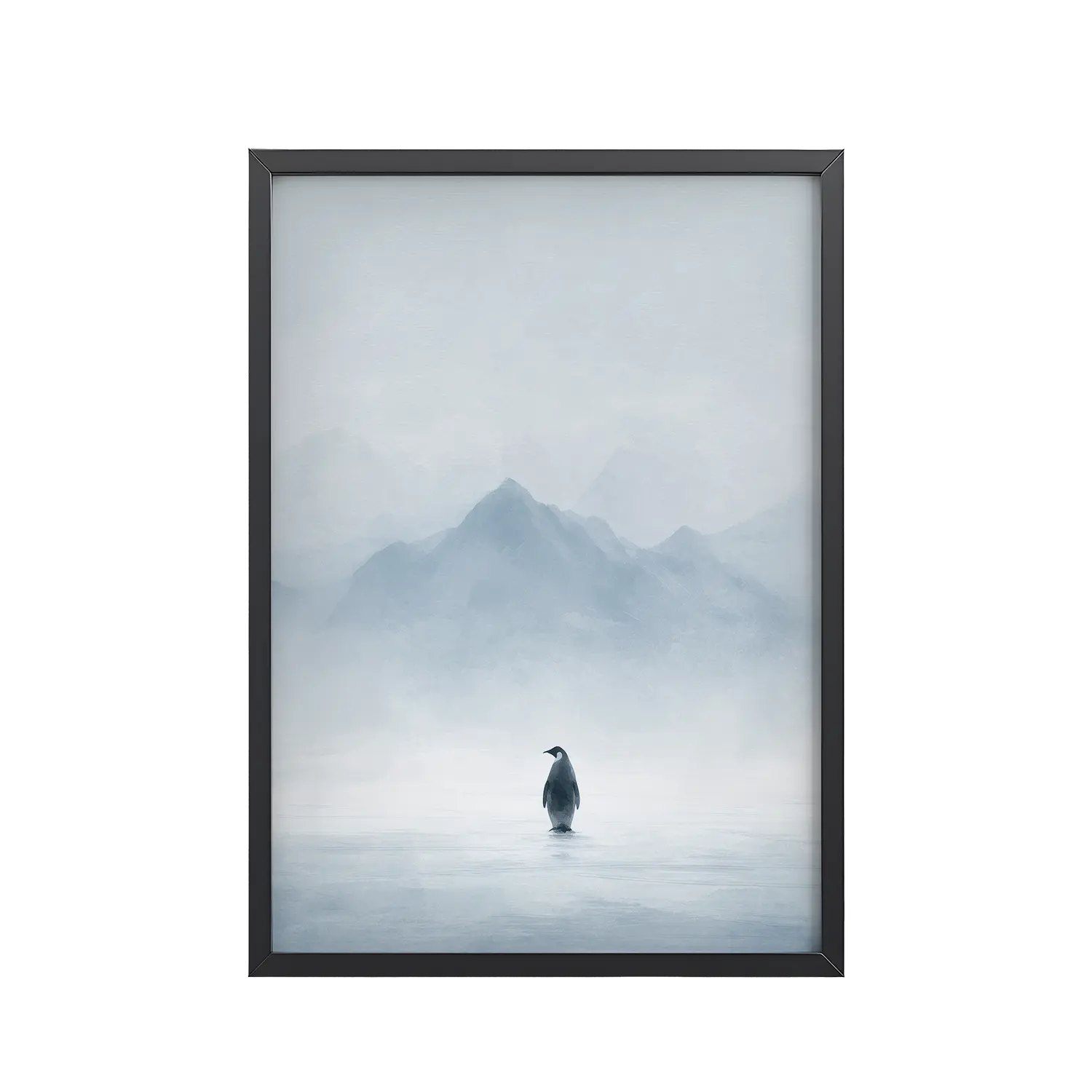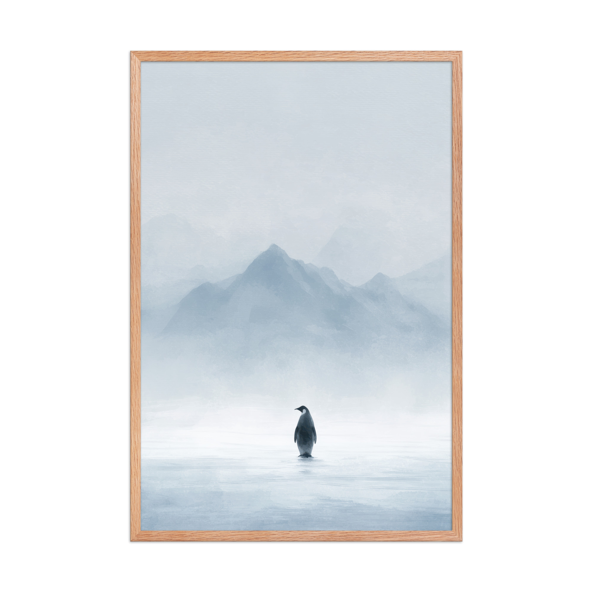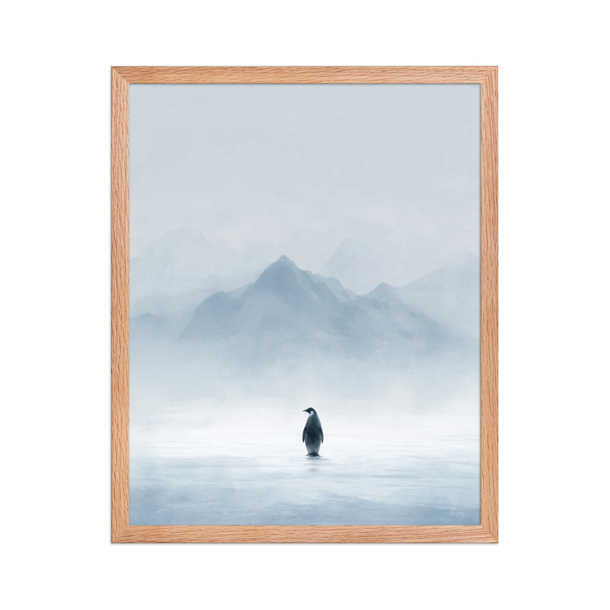 Lone Penguin Mist II distills the quiet of the polar wilderness into a single moment: one penguin, a horizon of fog, and distant, veil-like peaks. The restrained palette and open negative space create a meditative atmosphere that suits Japandi, Scandinavian, and minimalist interiors.