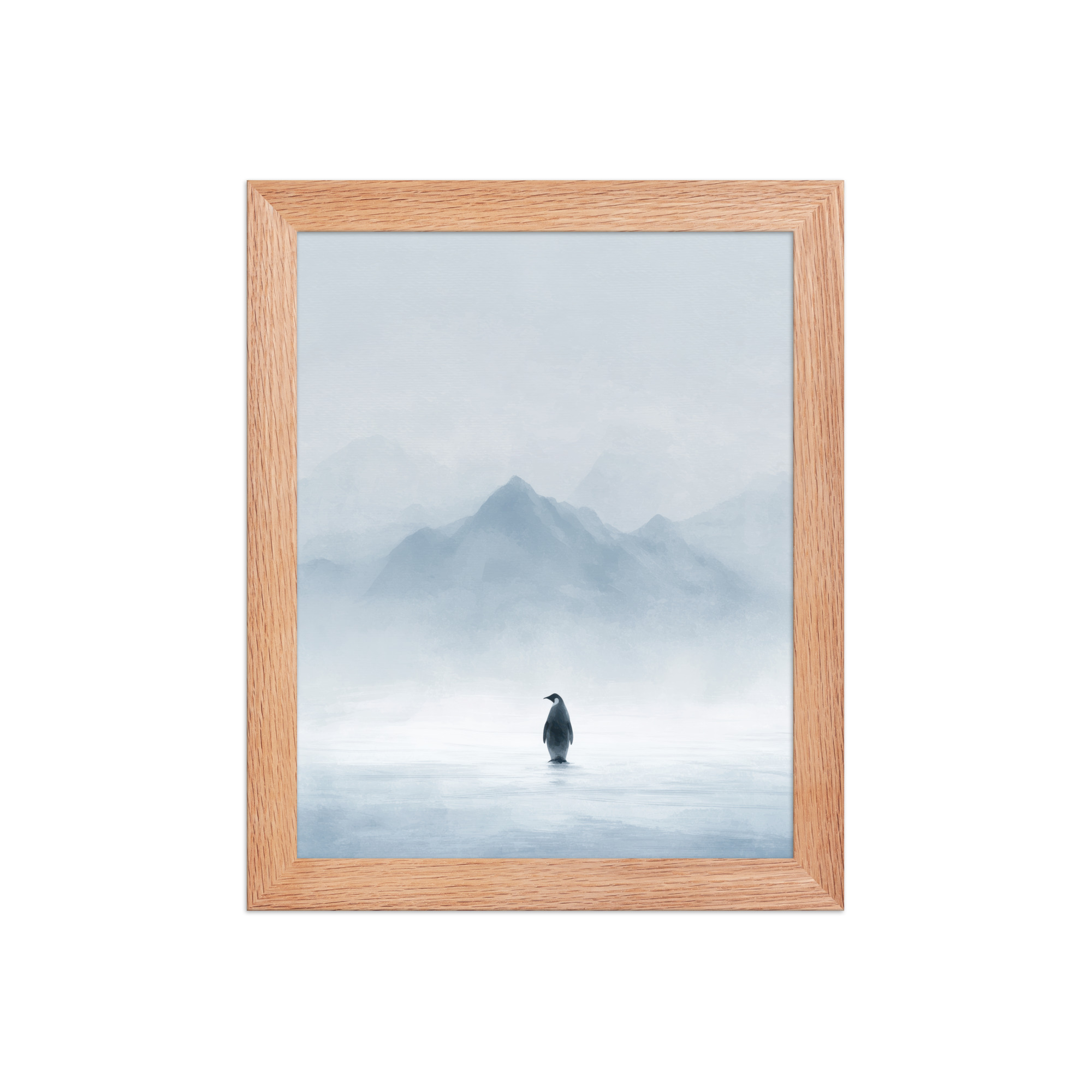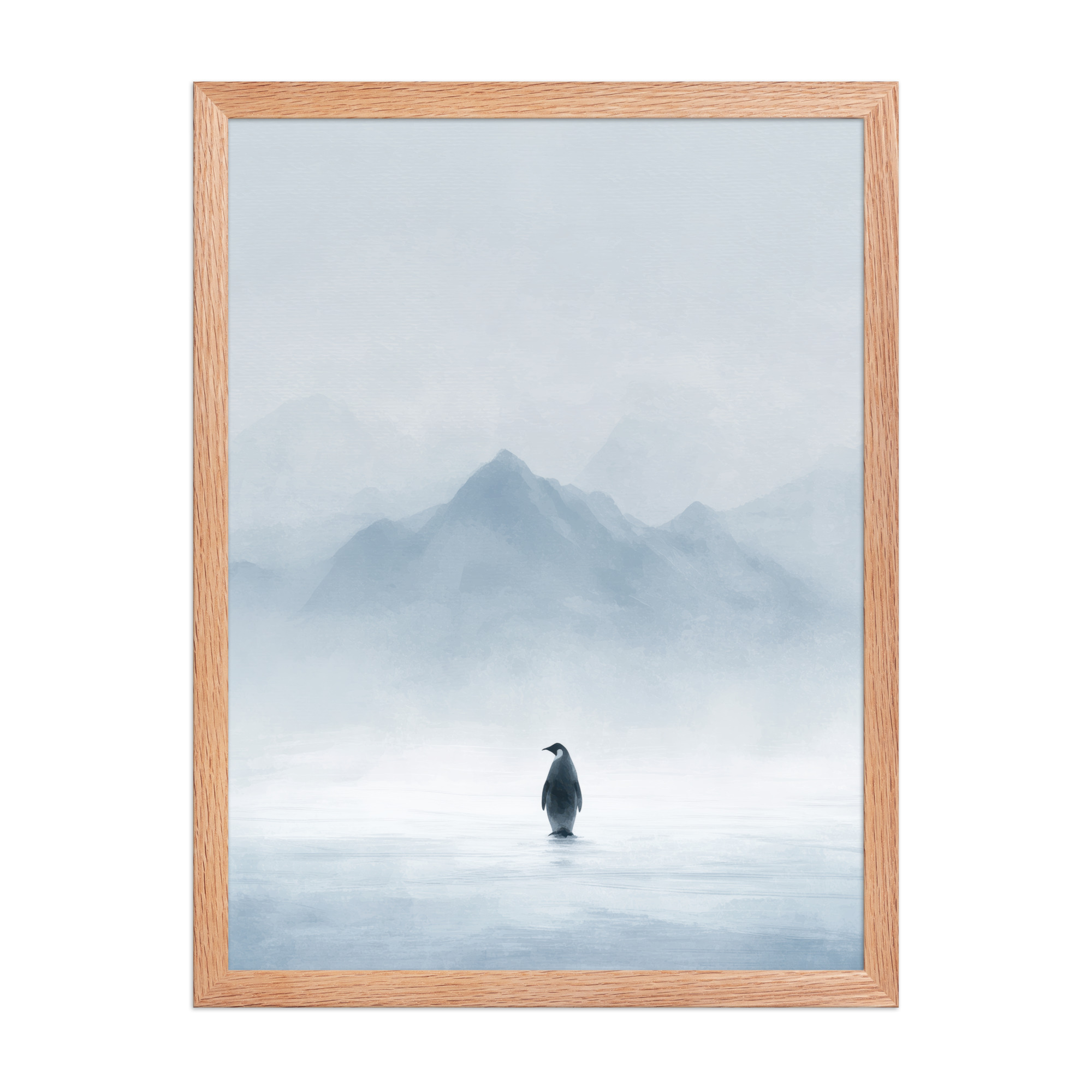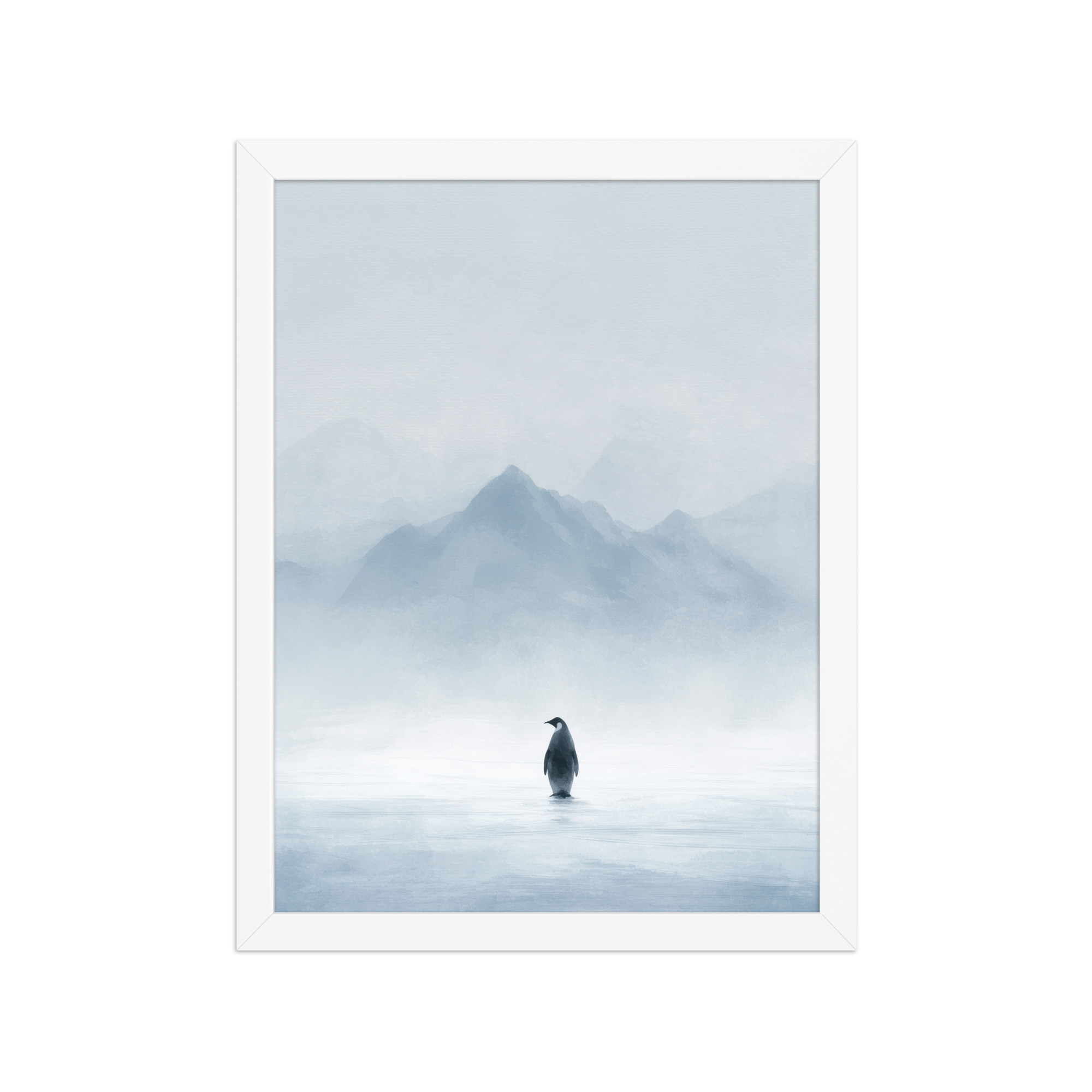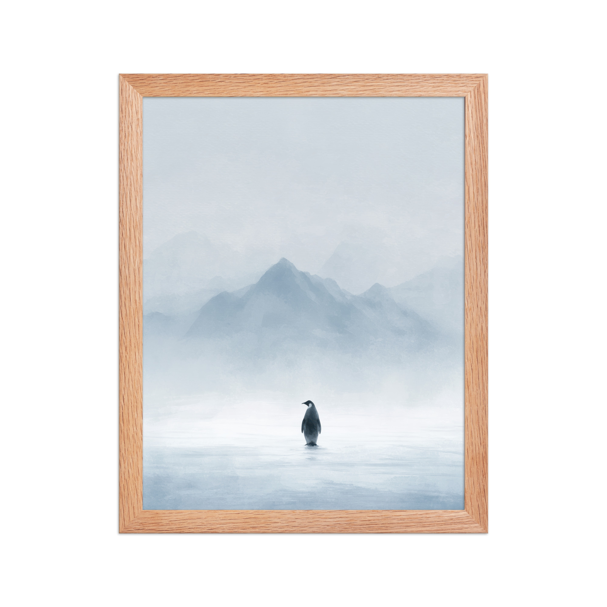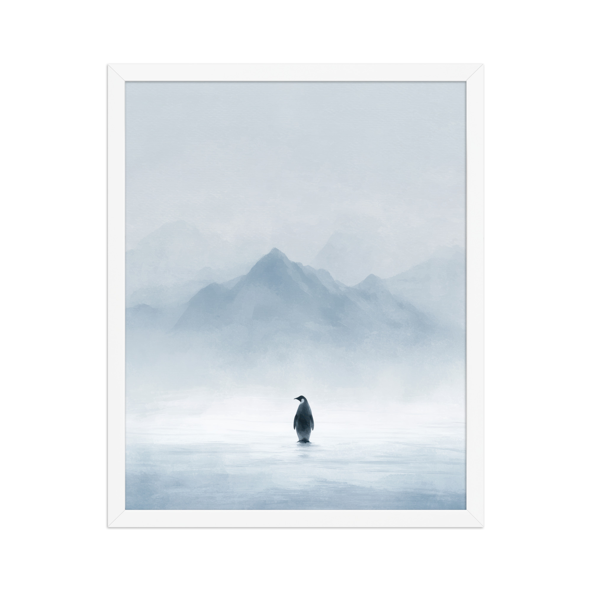 Lone Penguin Mist II distills the quiet of the polar wilderness into a single moment: one penguin, a horizon of fog, and distant, veil-like peaks. The restrained palette and open negative space create a meditative atmosphere that suits Japandi, Scandinavian, and minimalist interiors.