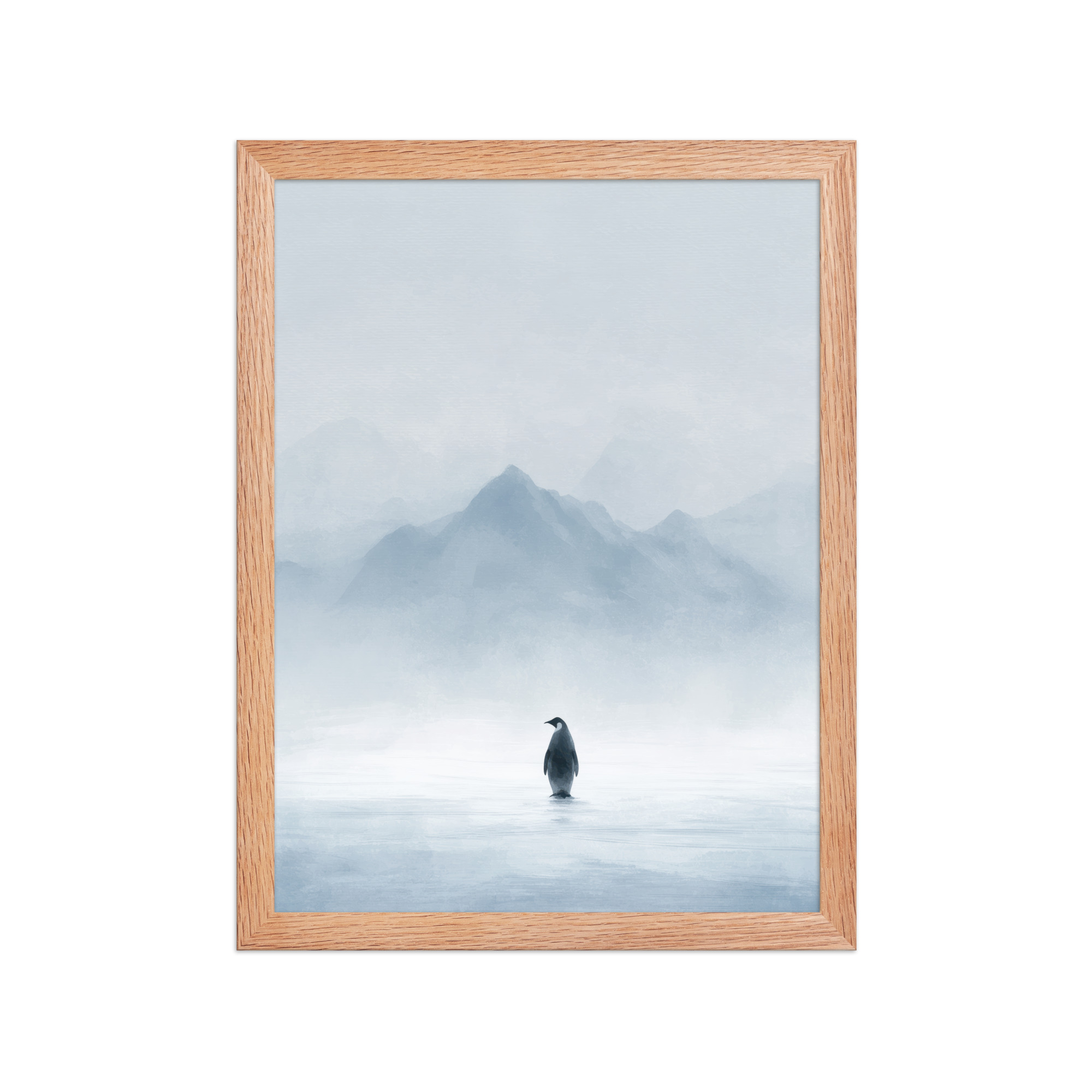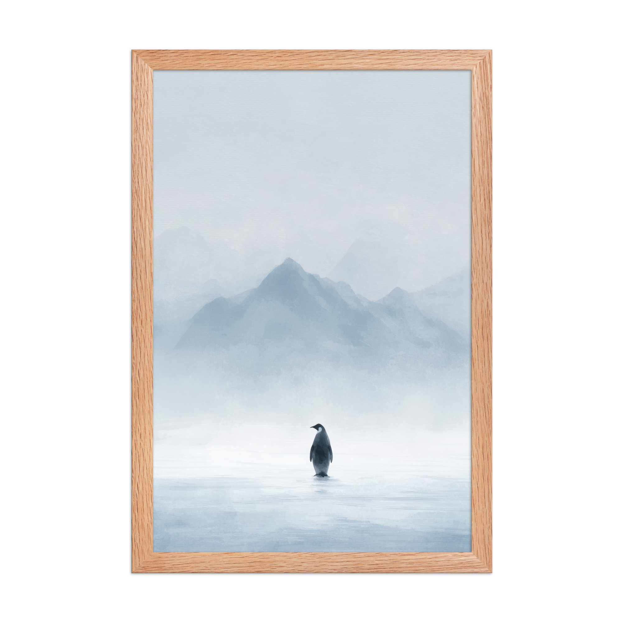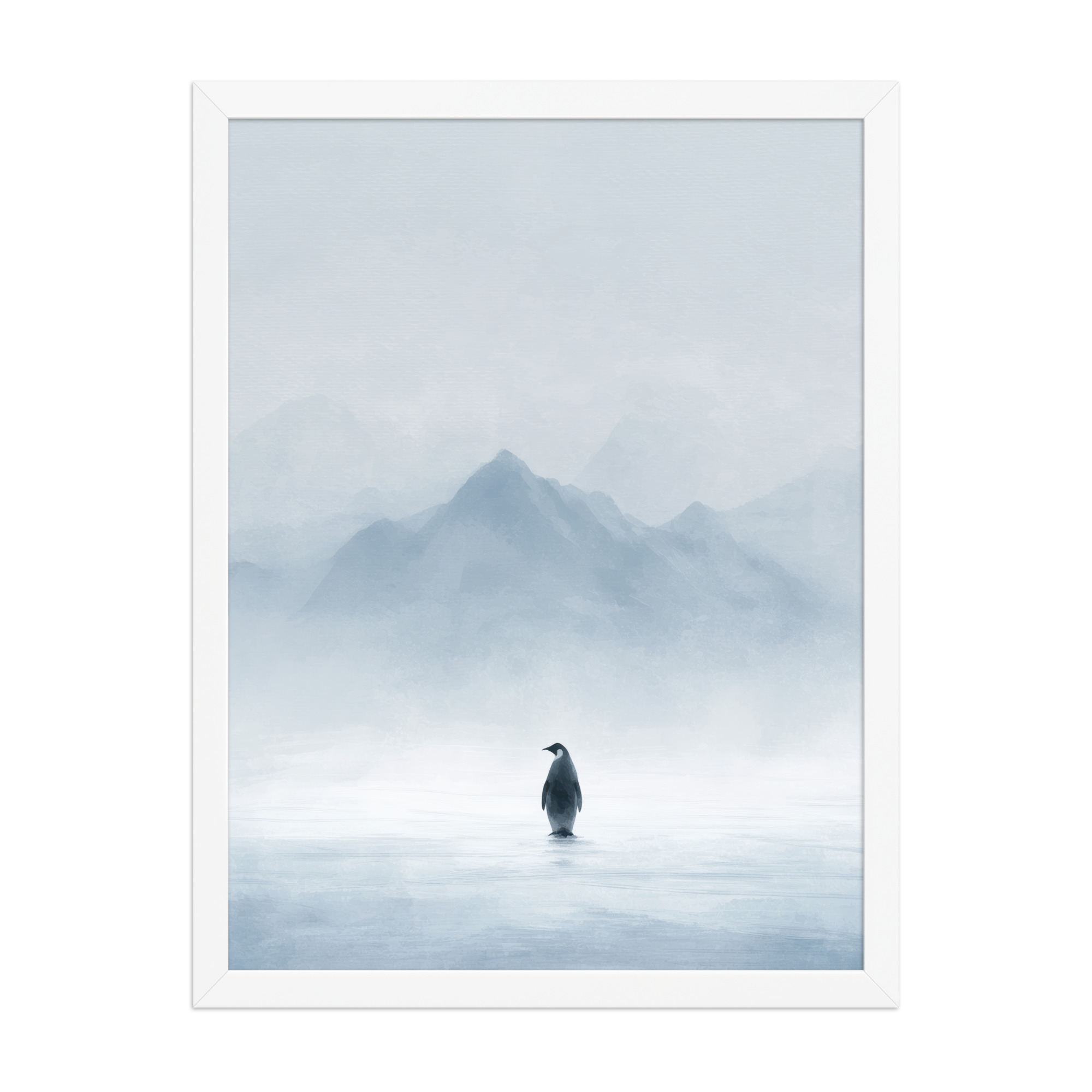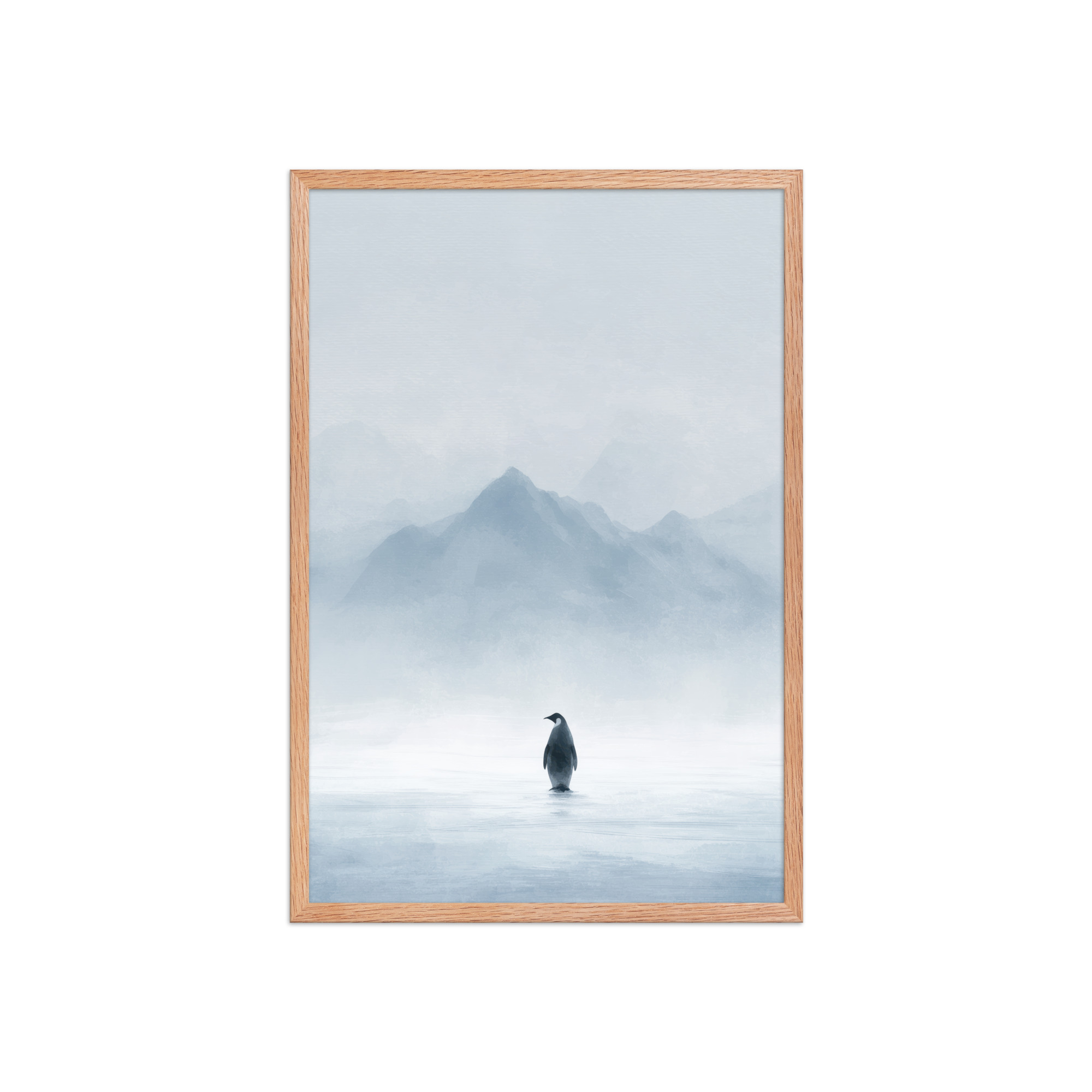 Lone Penguin Mist II distills the quiet of the polar wilderness into a single moment: one penguin, a horizon of fog, and distant, veil-like peaks. The restrained palette and open negative space create a meditative atmosphere that suits Japandi, Scandinavian, and minimalist interiors.