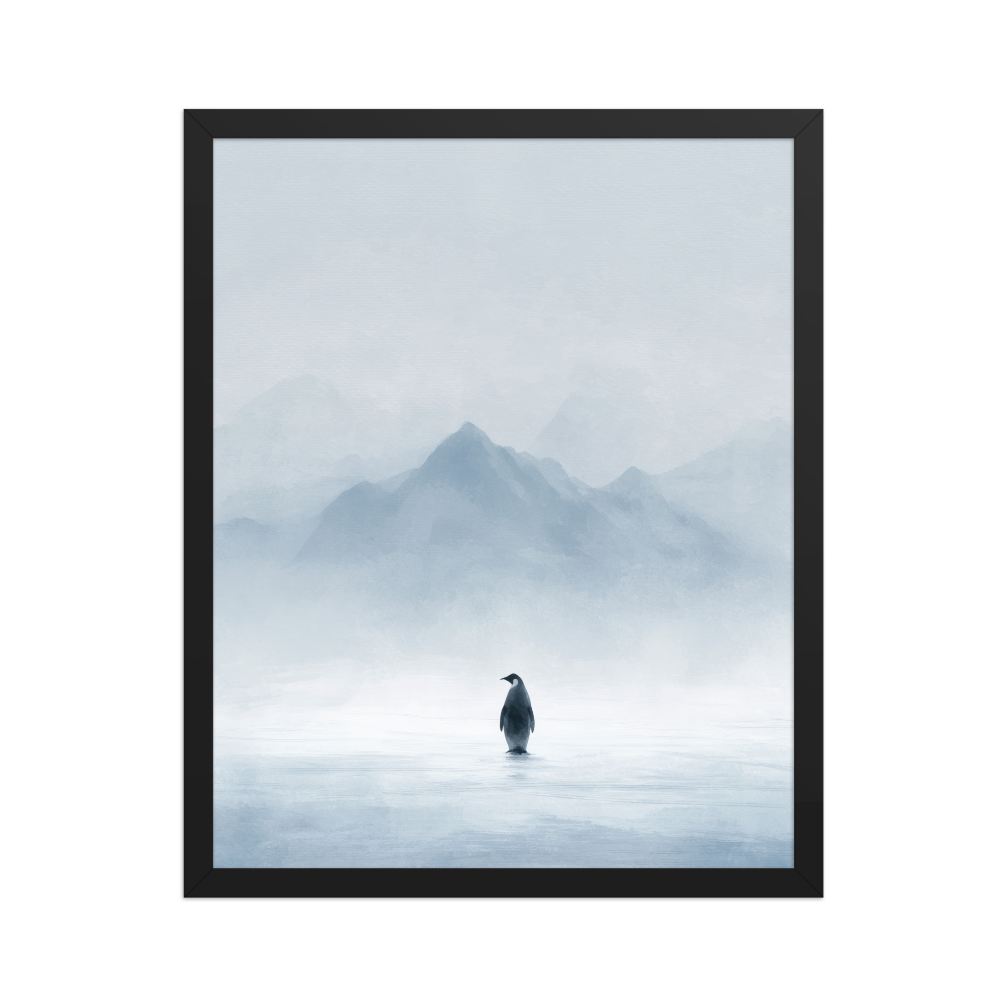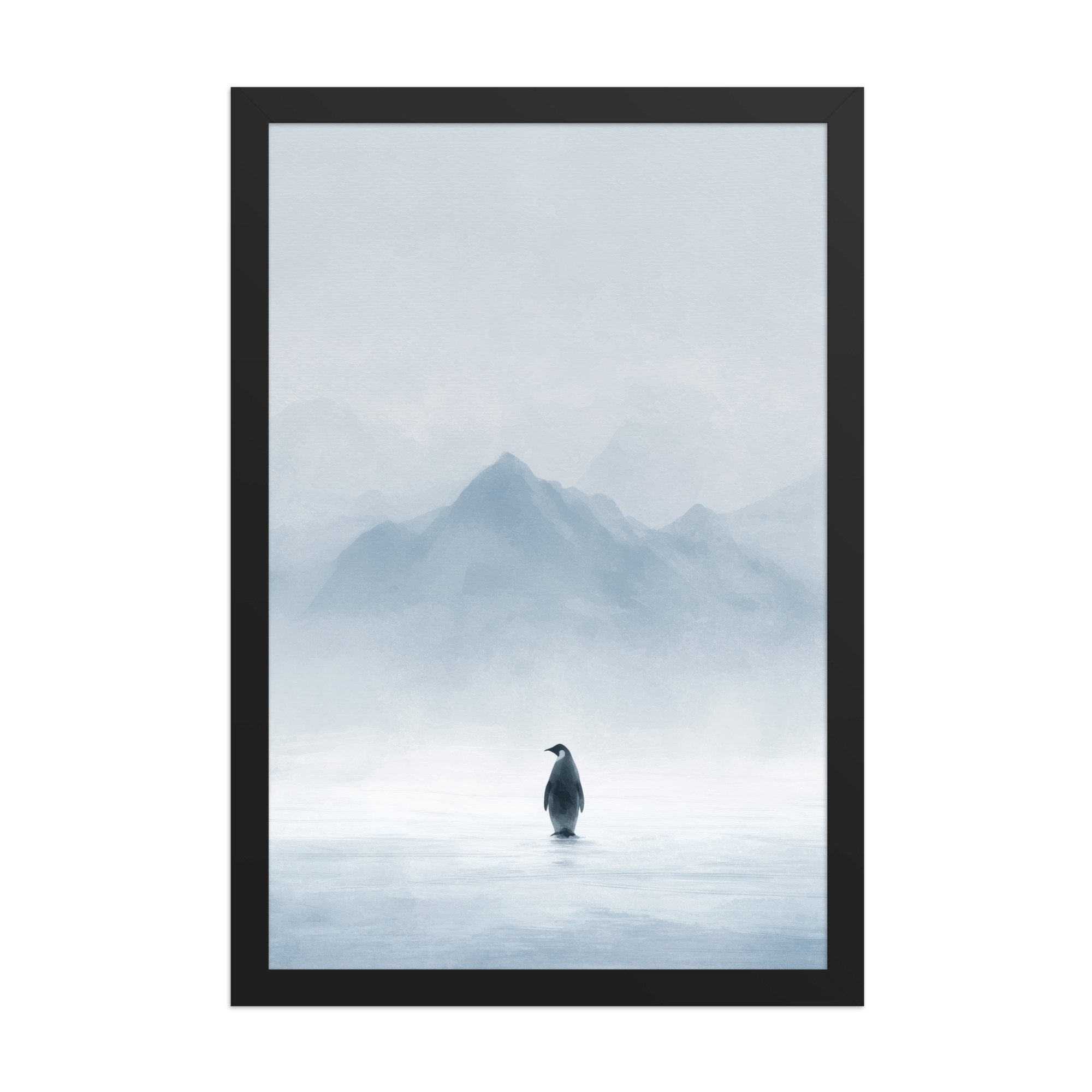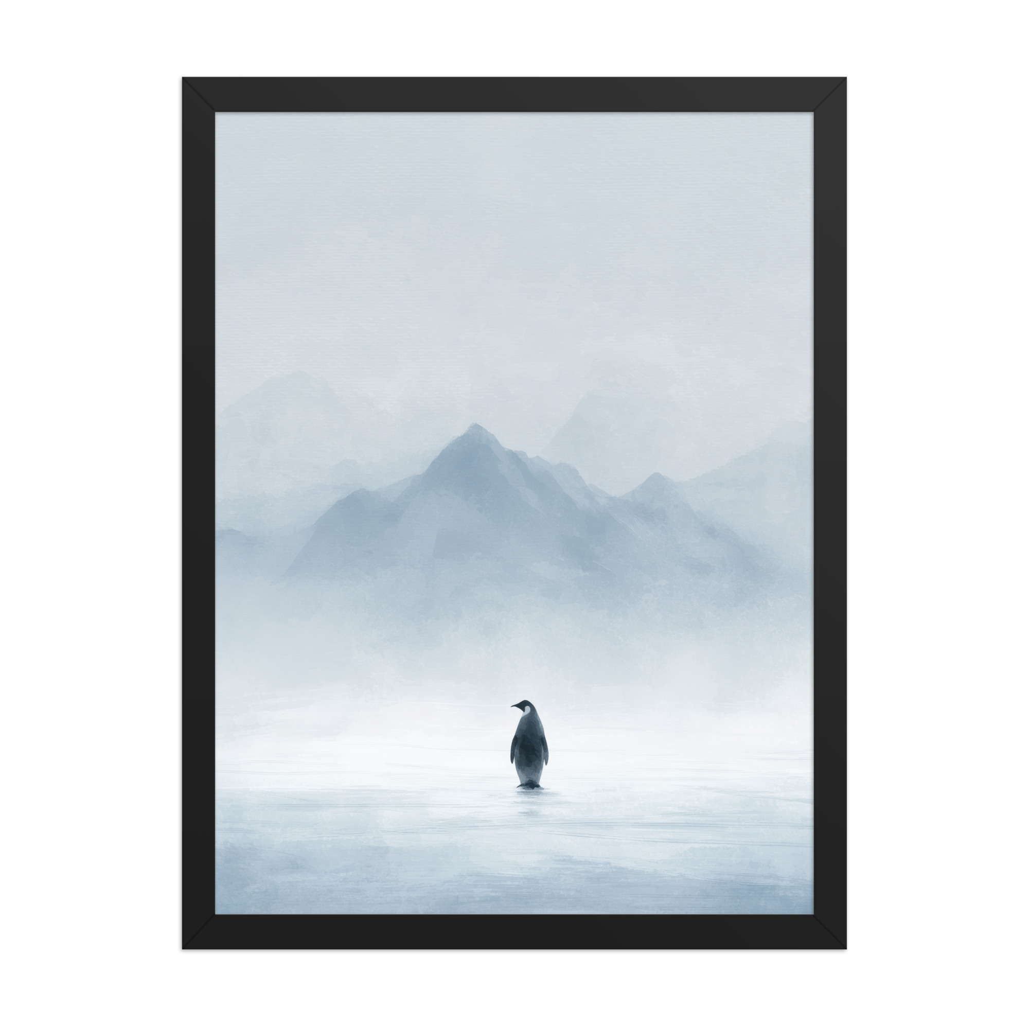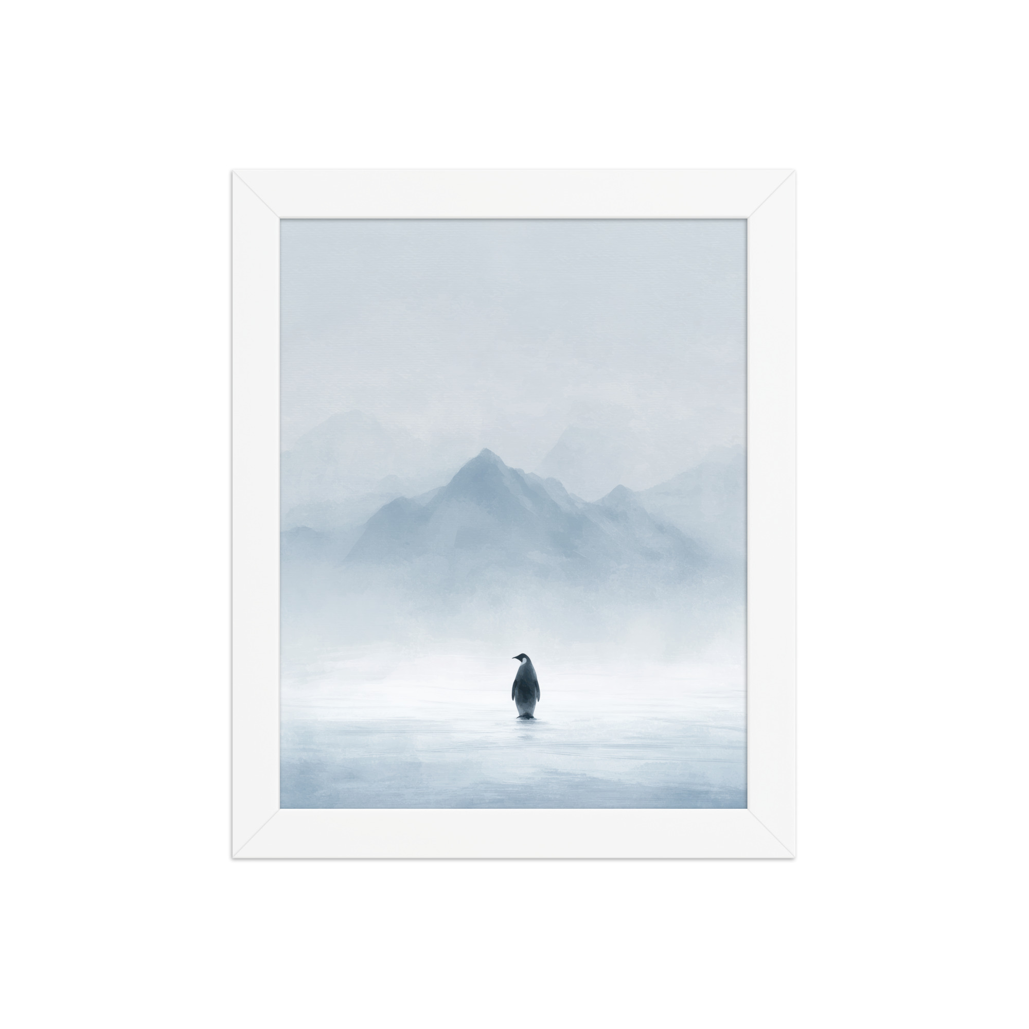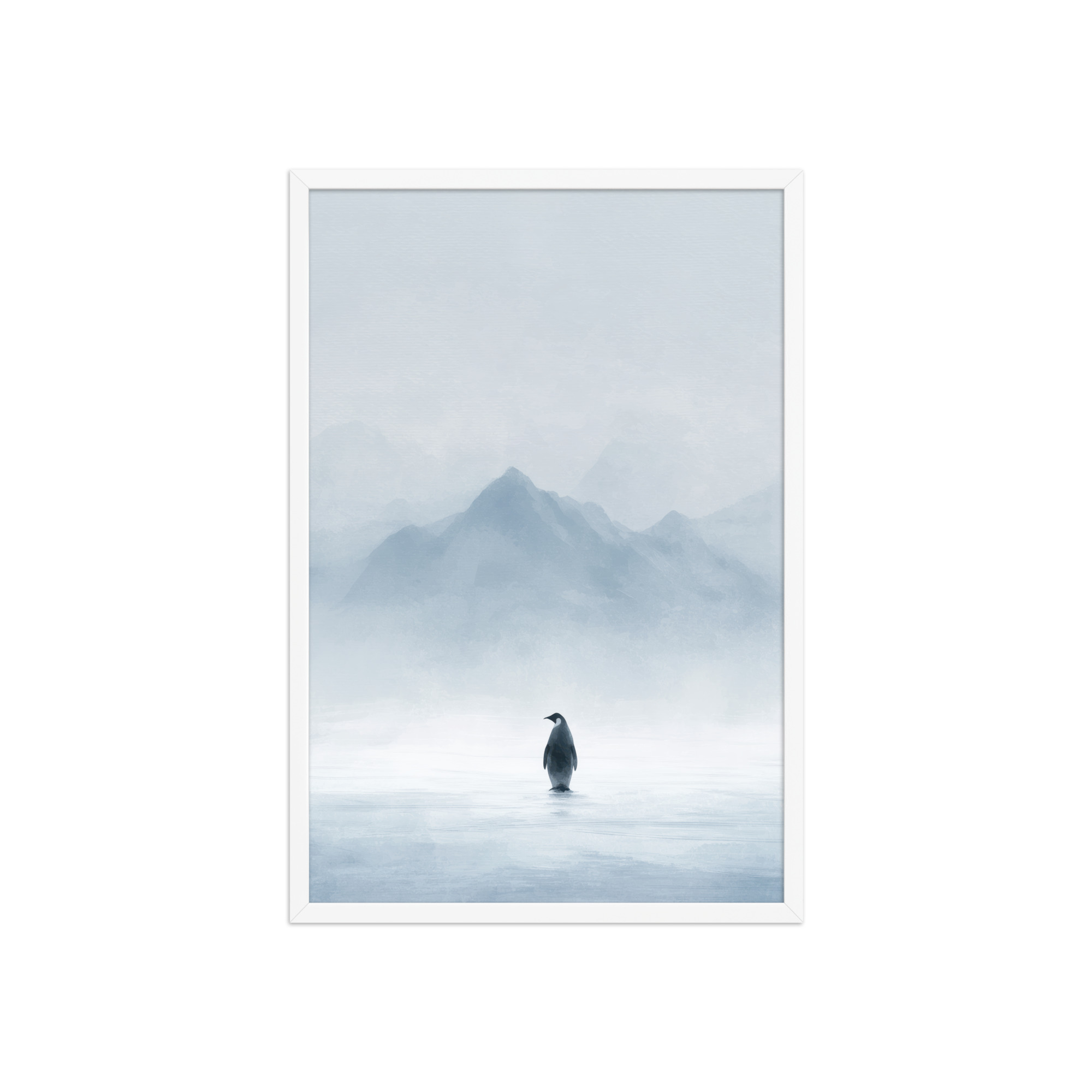 Lone Penguin Mist II distills the quiet of the polar wilderness into a single moment: one penguin, a horizon of fog, and distant, veil-like peaks. The restrained palette and open negative space create a meditative atmosphere that suits Japandi, Scandinavian, and minimalist interiors.