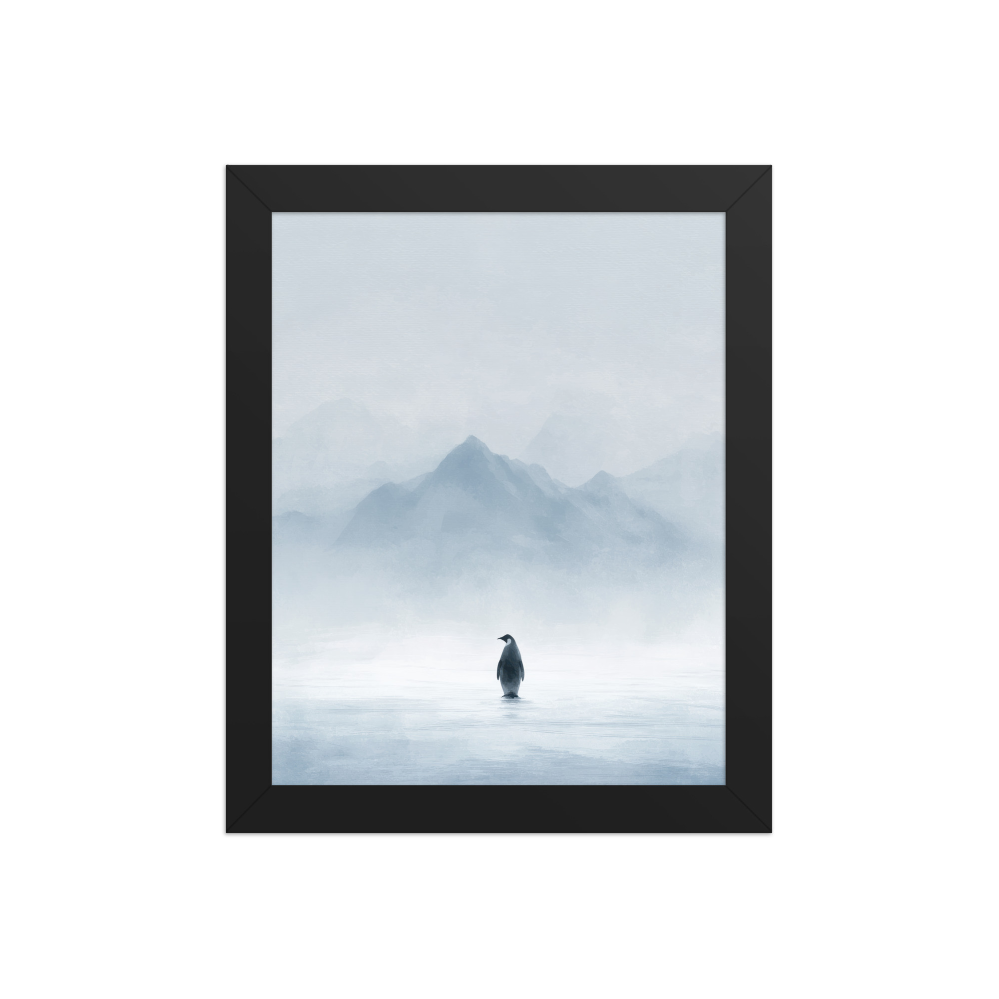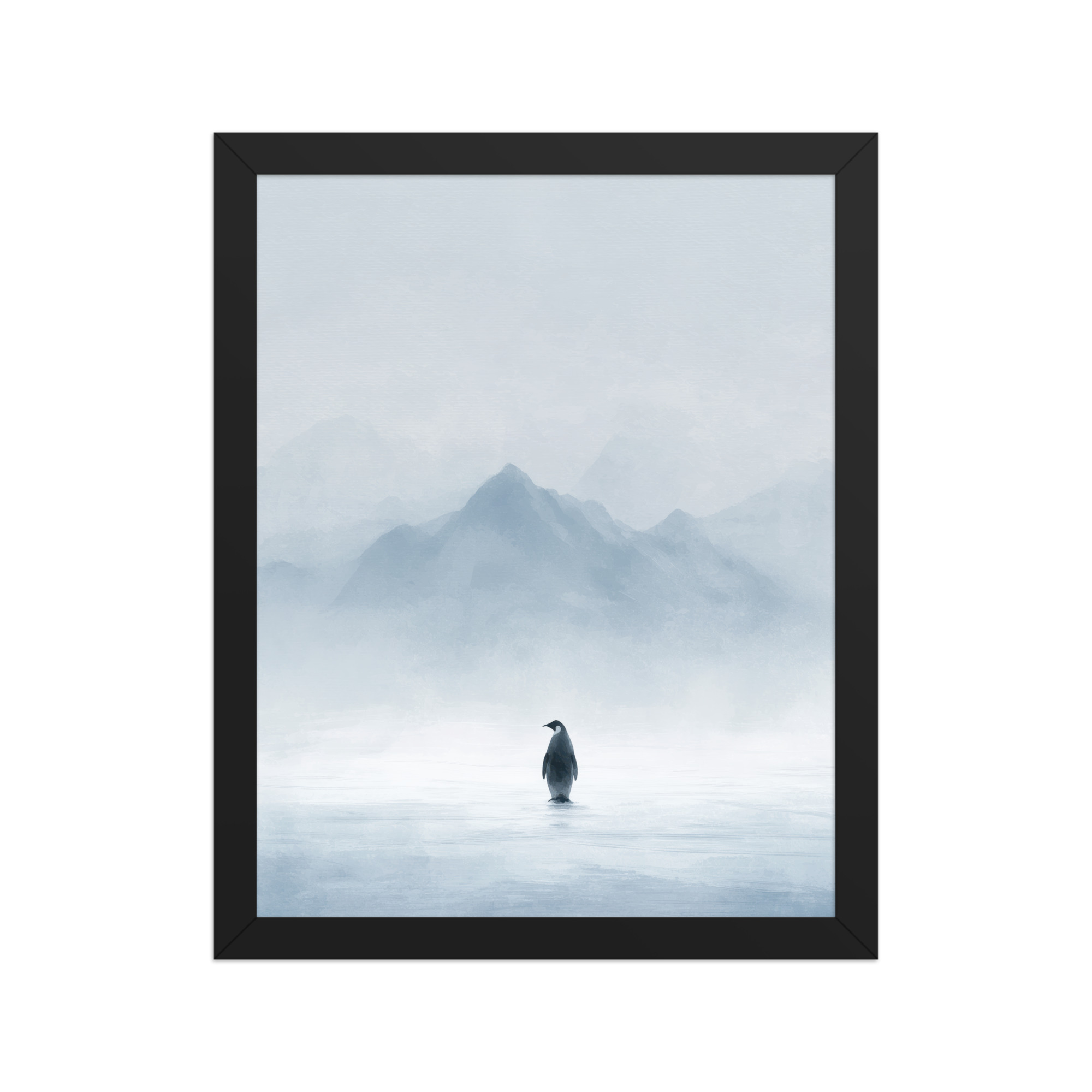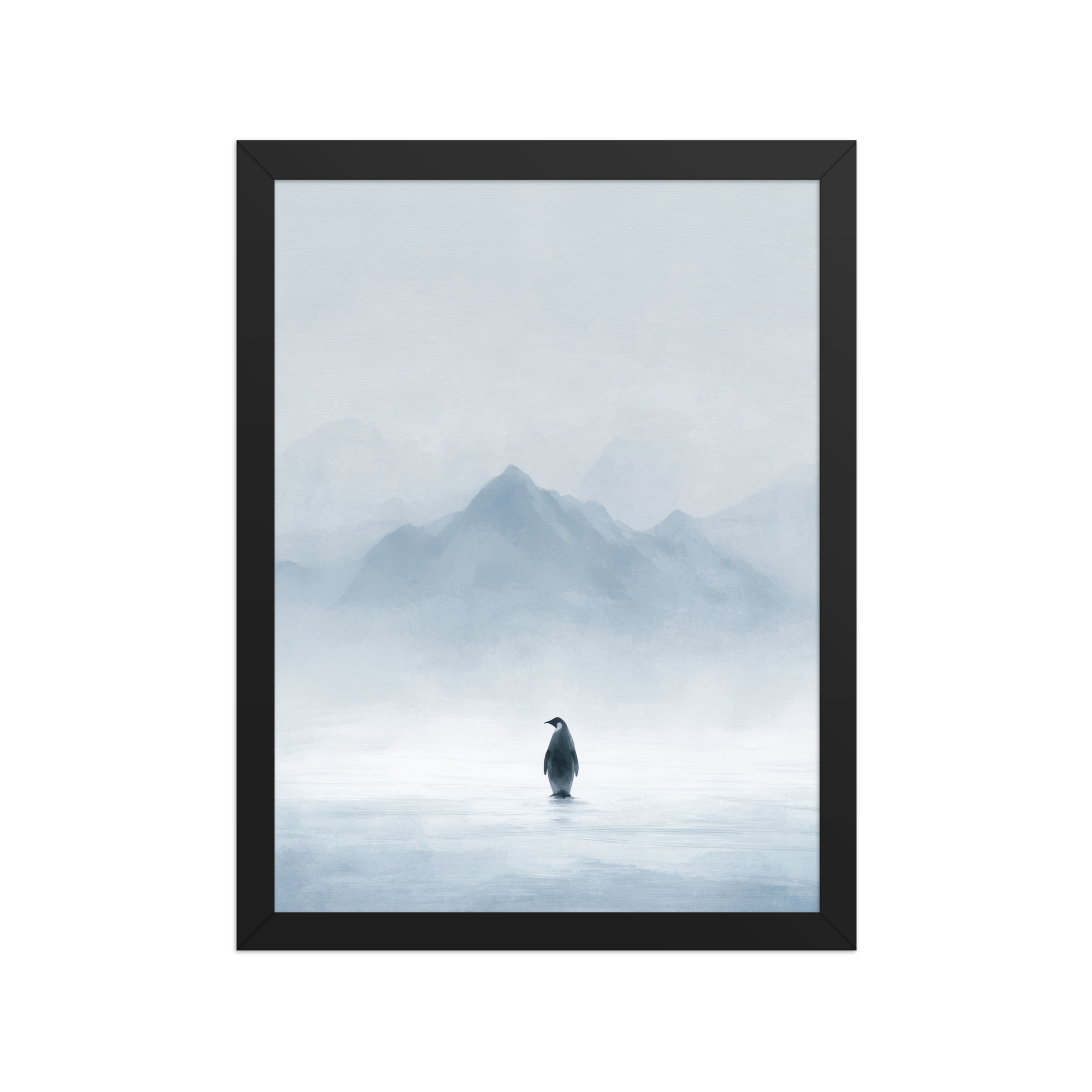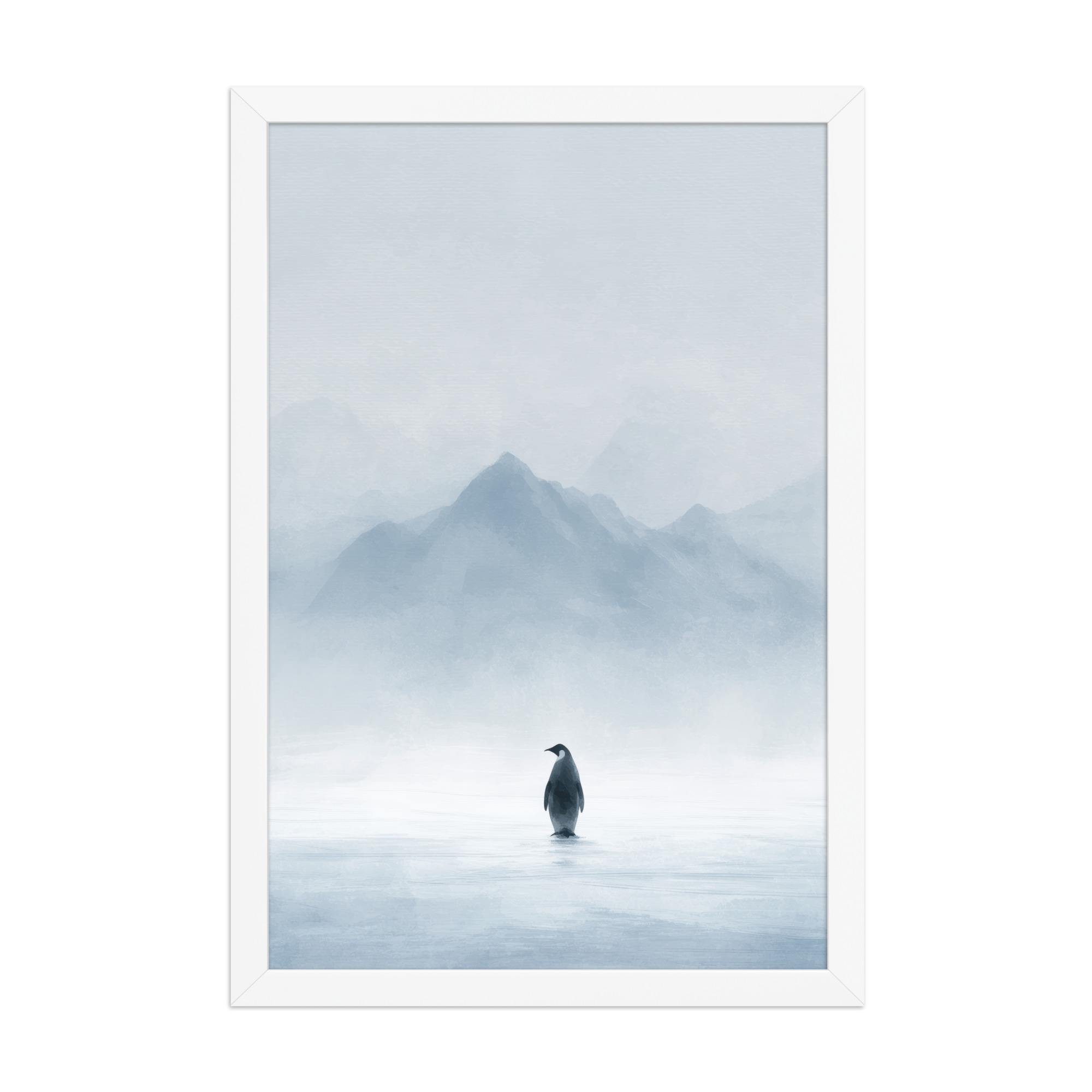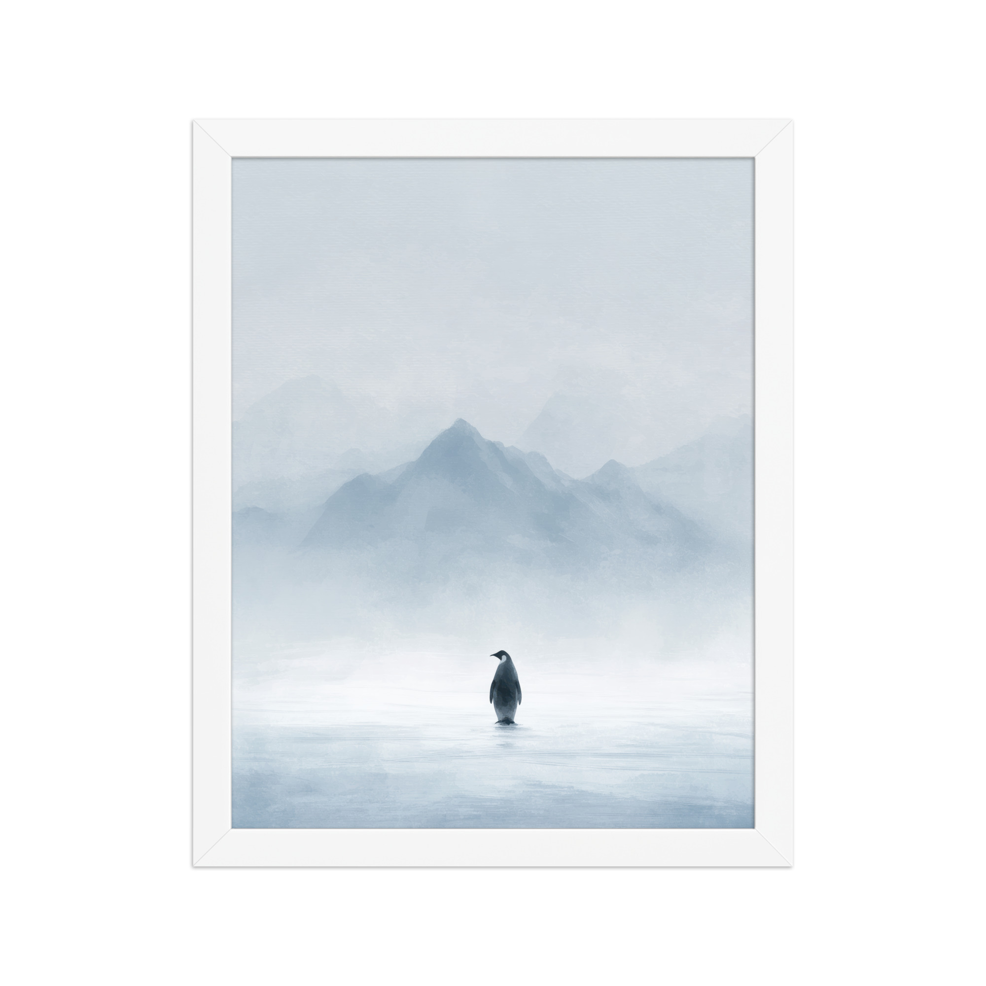 Lone Penguin Mist II distills the quiet of the polar wilderness into a single moment: one penguin, a horizon of fog, and distant, veil-like peaks. The restrained palette and open negative space create a meditative atmosphere that suits Japandi, Scandinavian, and minimalist interiors.