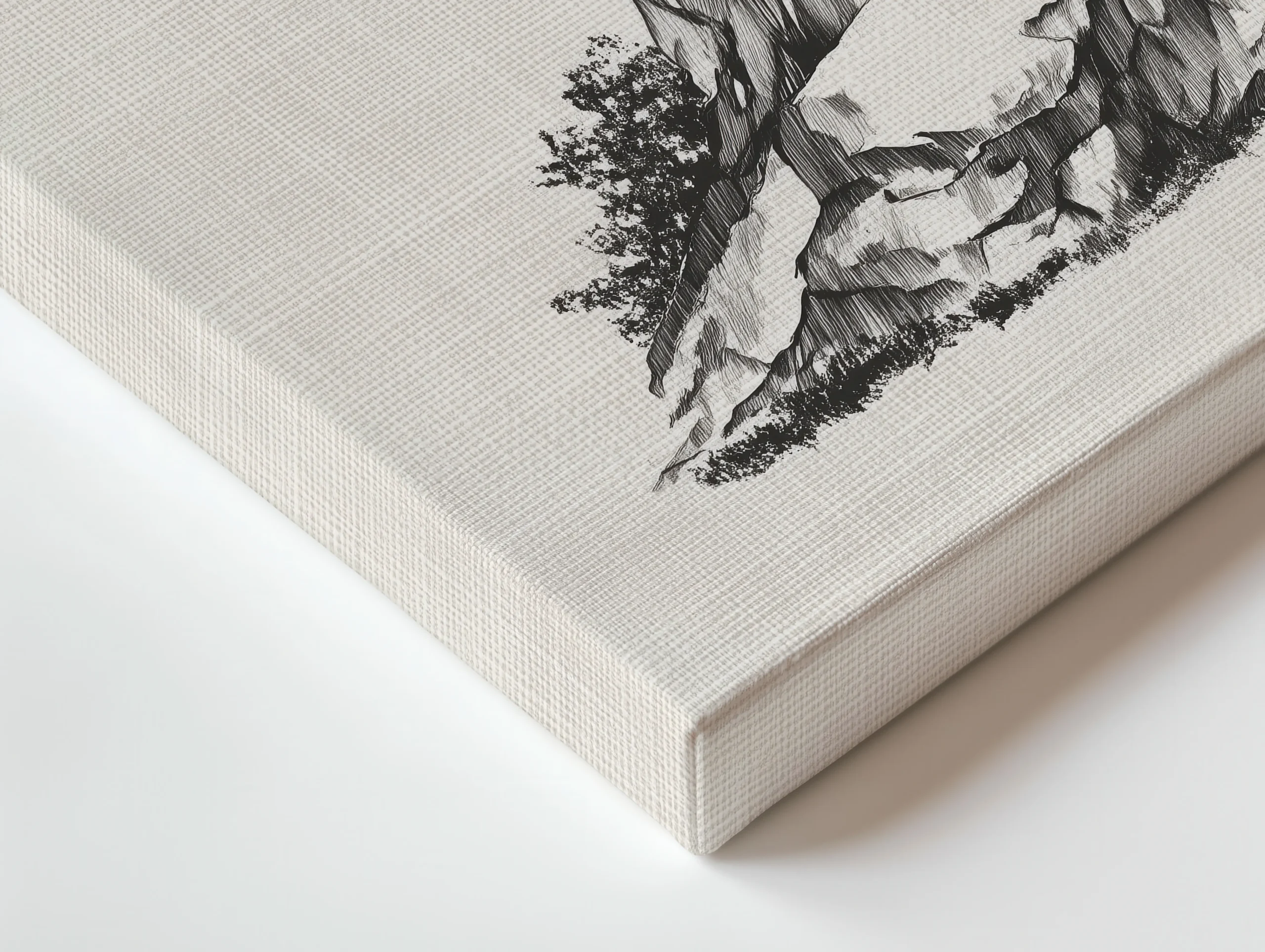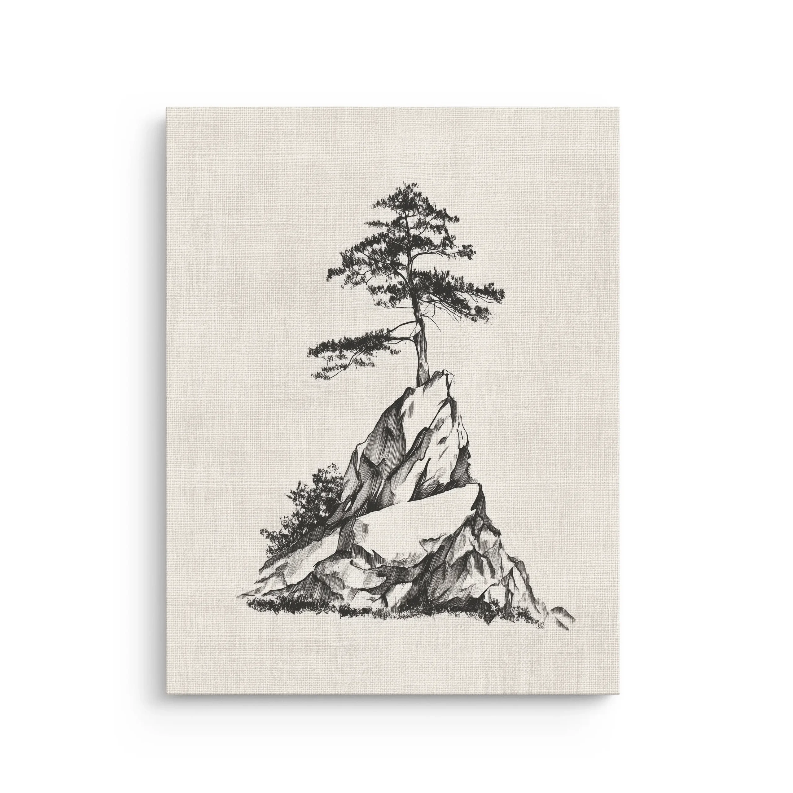 A minimalist sumi-e style ink drawing of a lone pine tree perched on rugged stone, printed on a premium thin canvas and ready to hang.