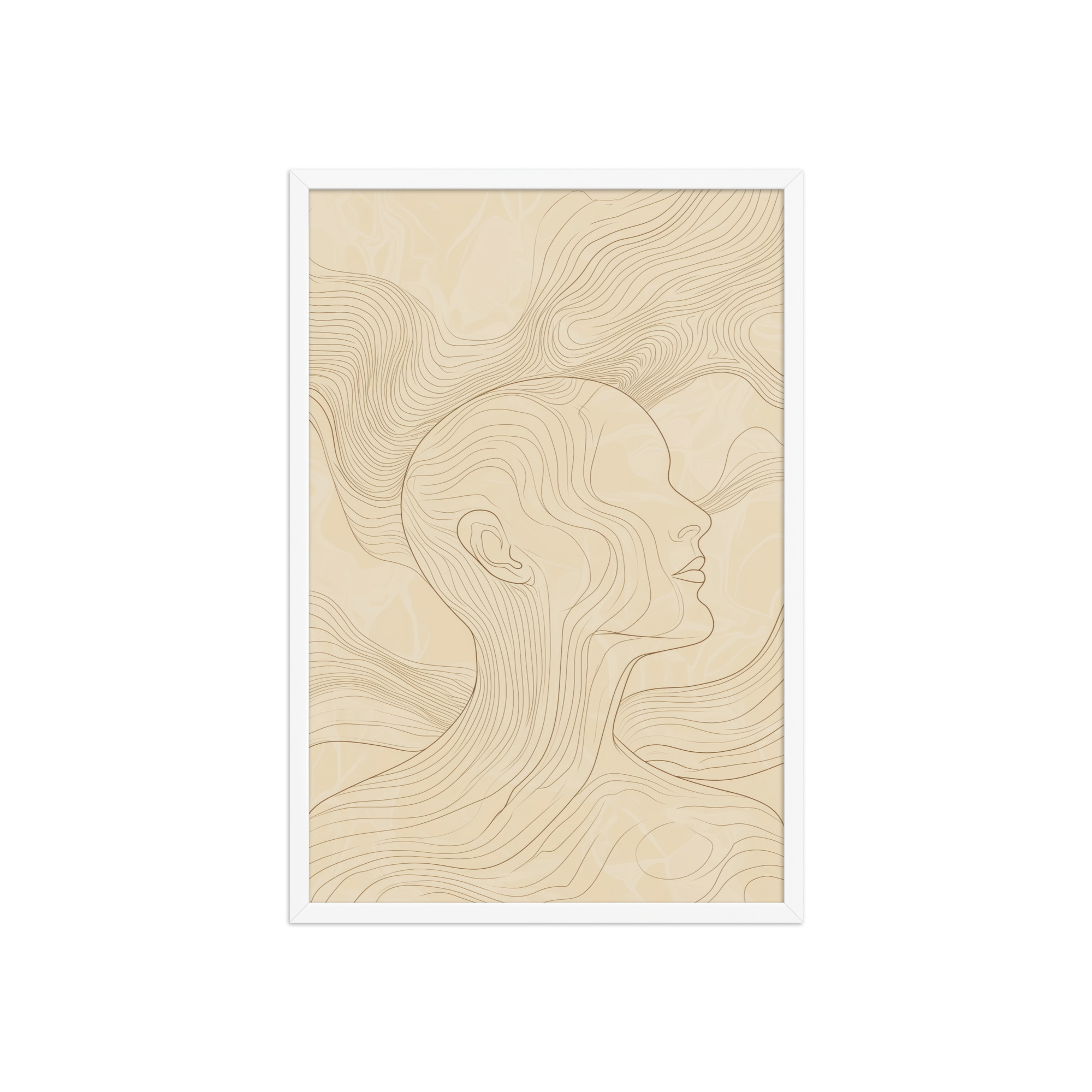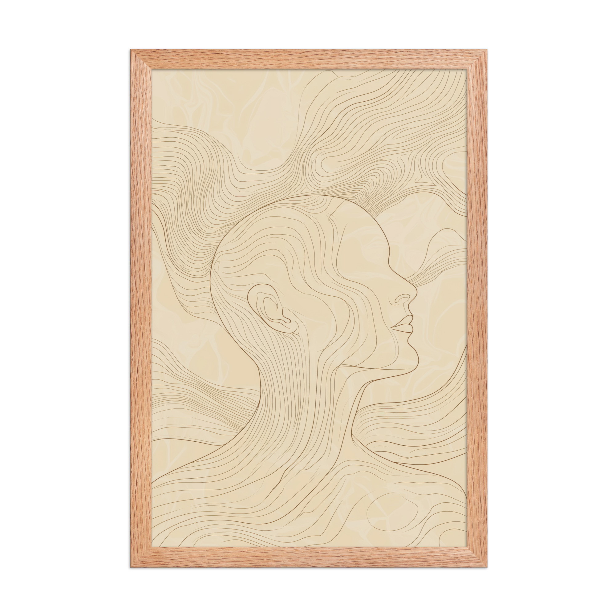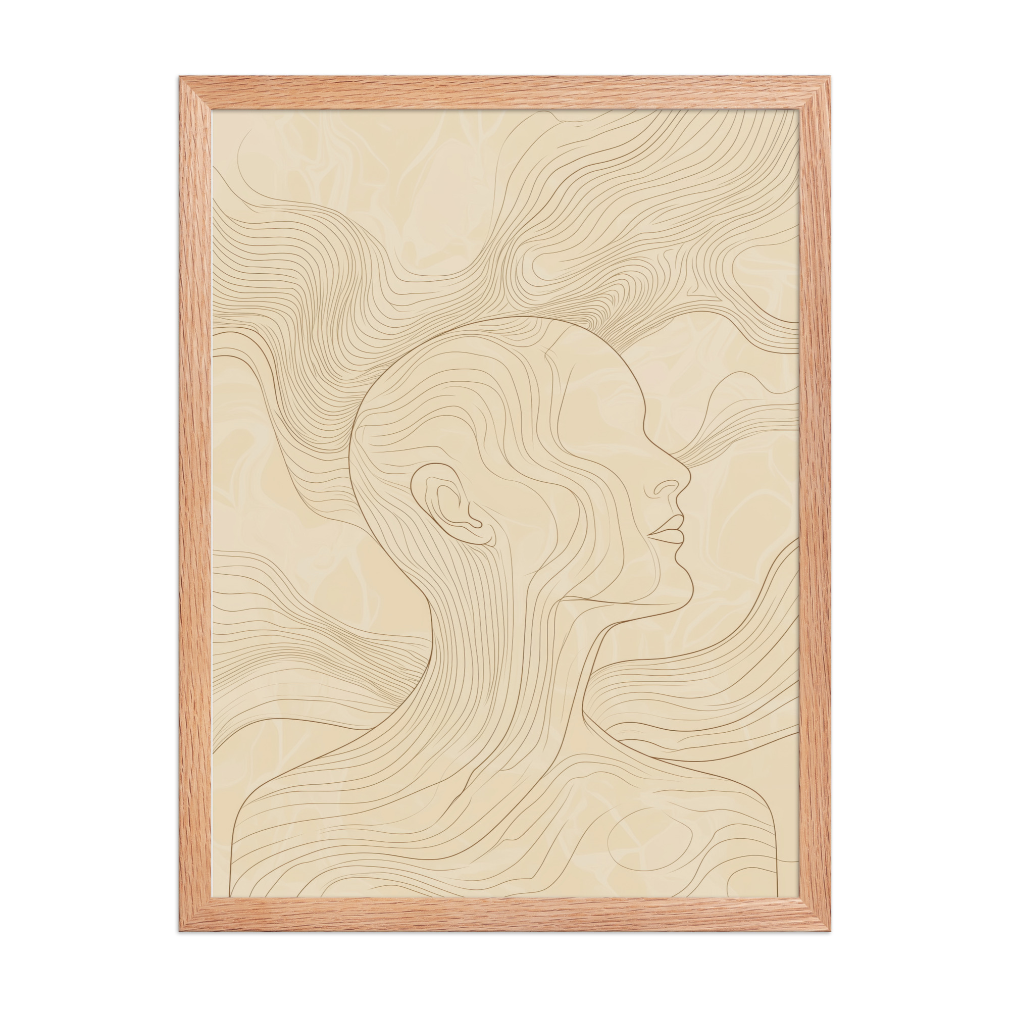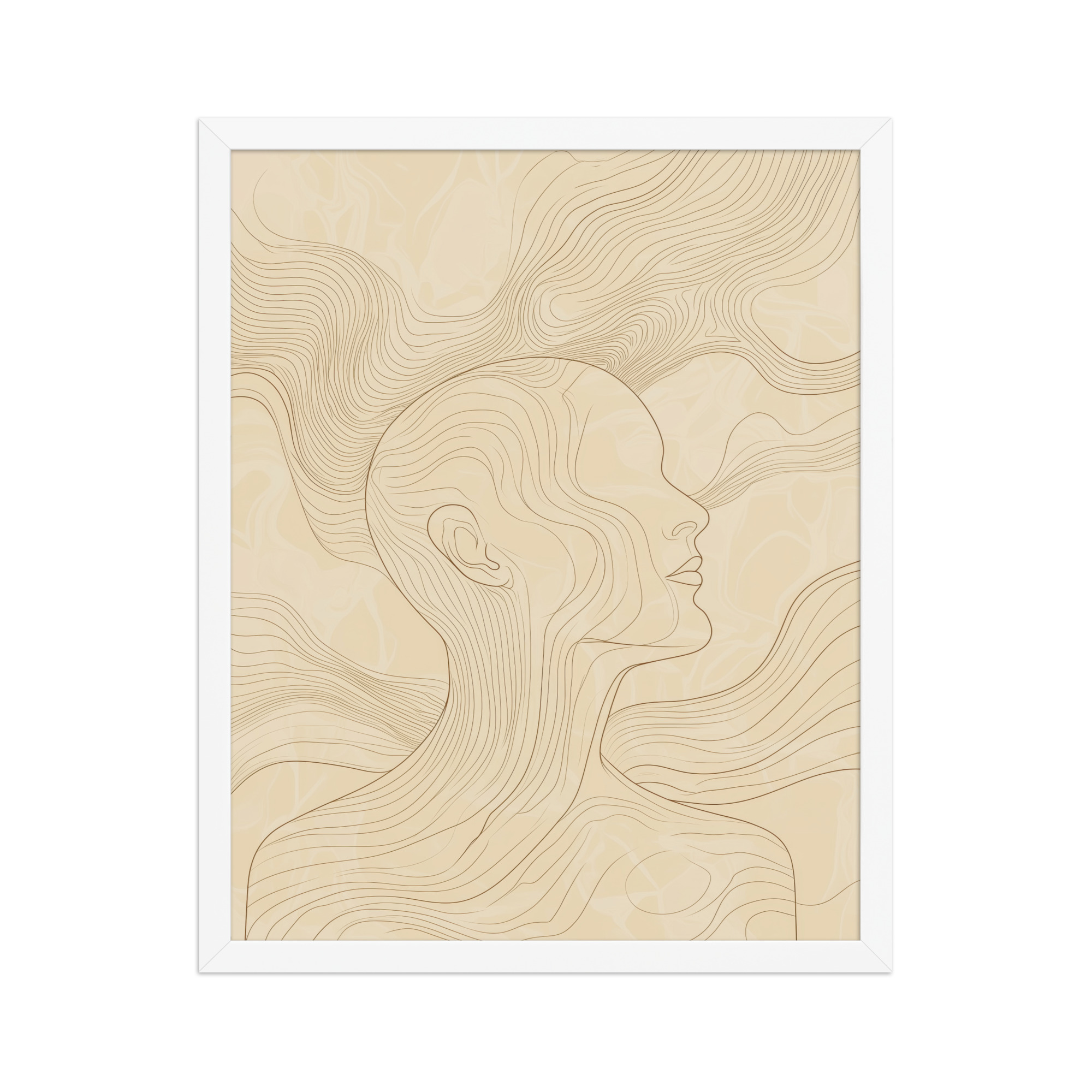 River-like contour lines form a tranquil face in profile while soft currents drift above, evoking mindfulness and quiet flow. The minimal palette keeps the mood calm and contemporary.
