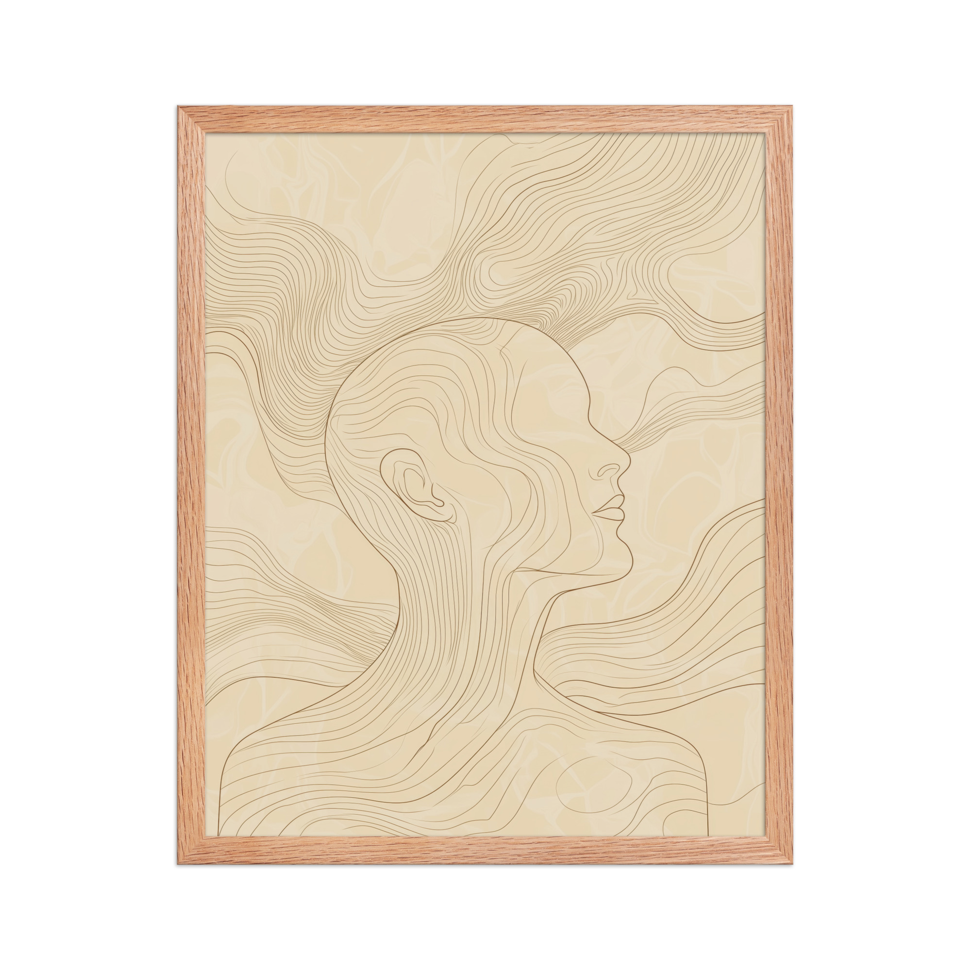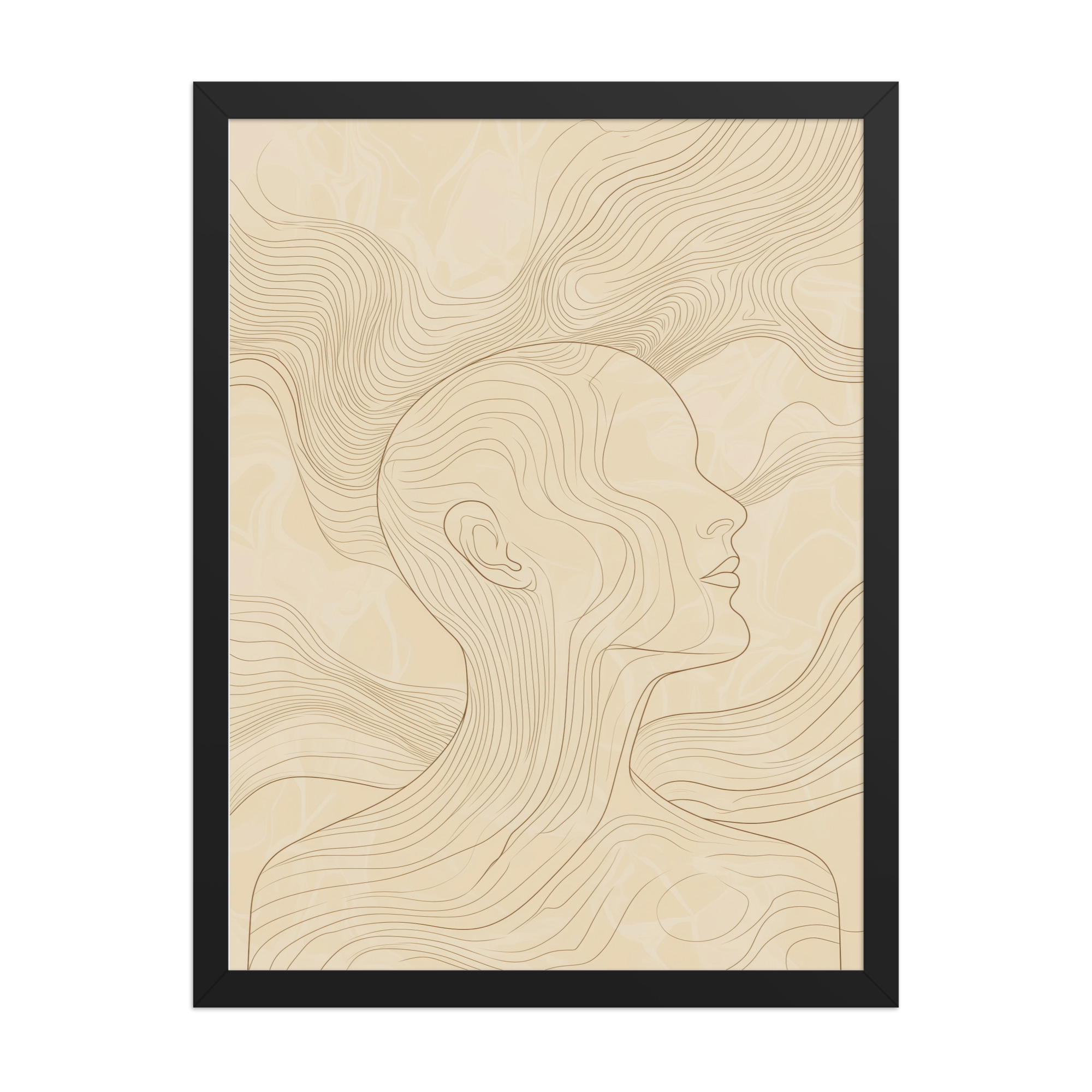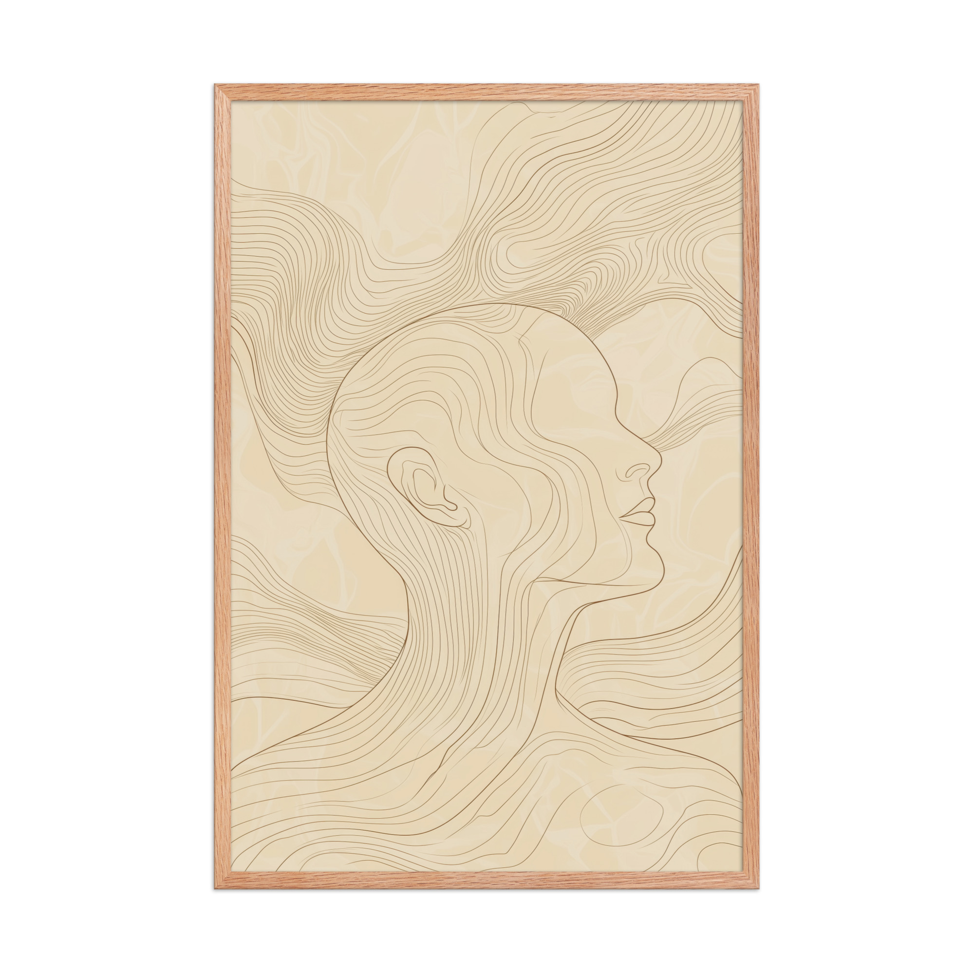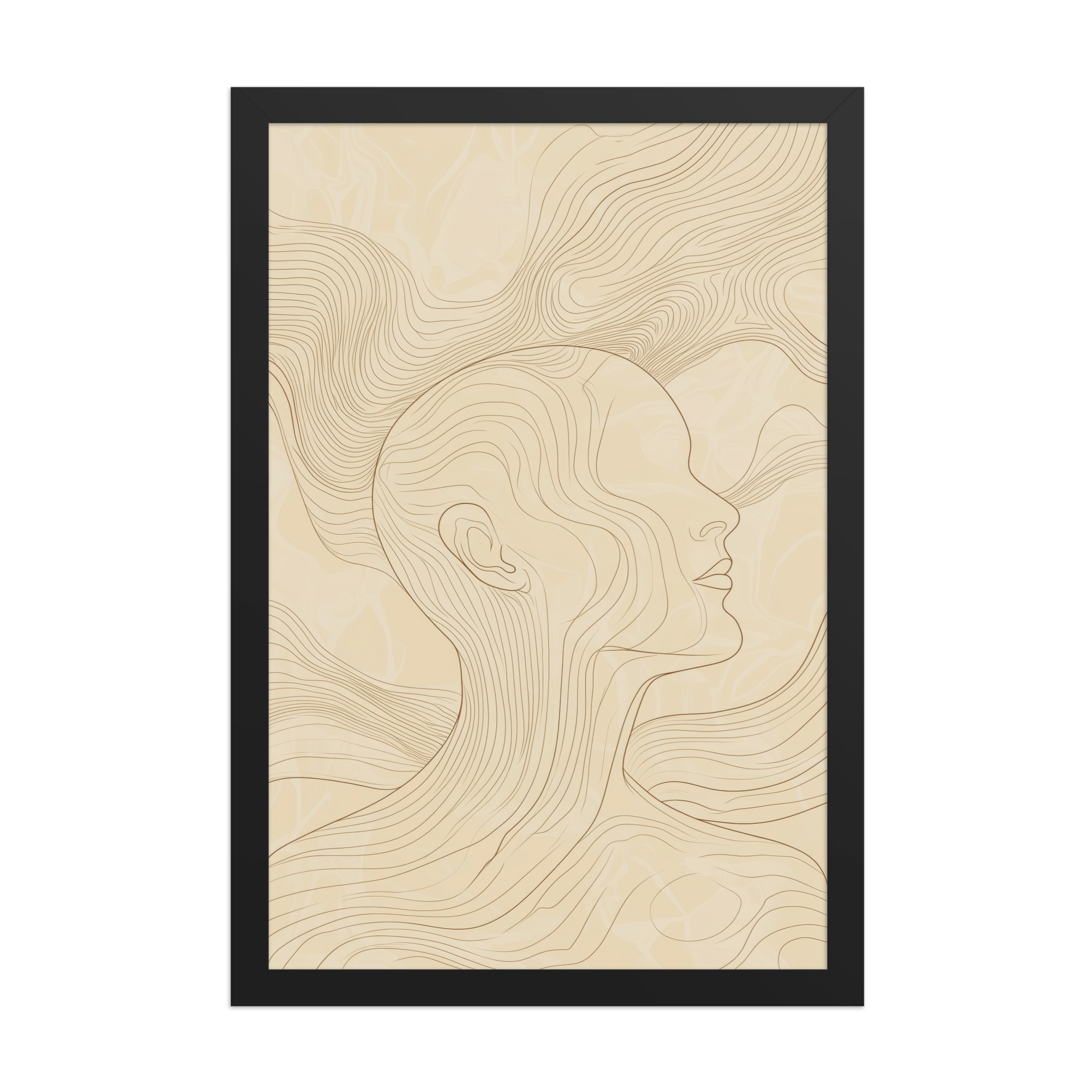 River-like contour lines form a tranquil face in profile while soft currents drift above, evoking mindfulness and quiet flow. The minimal palette keeps the mood calm and contemporary.
