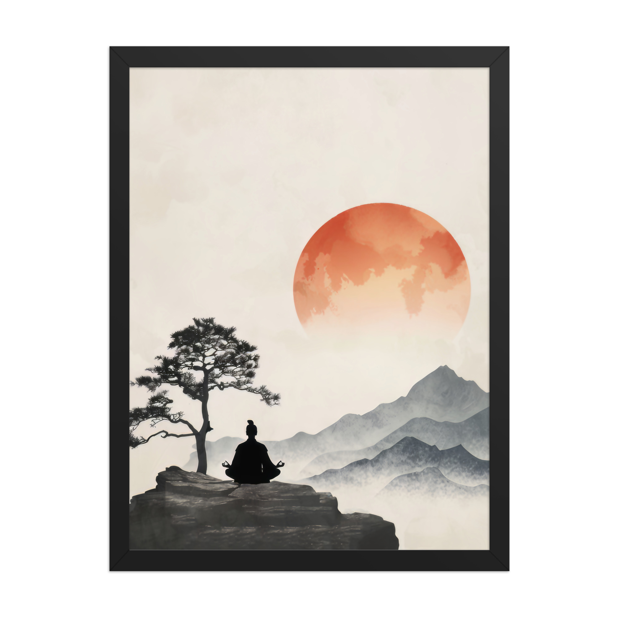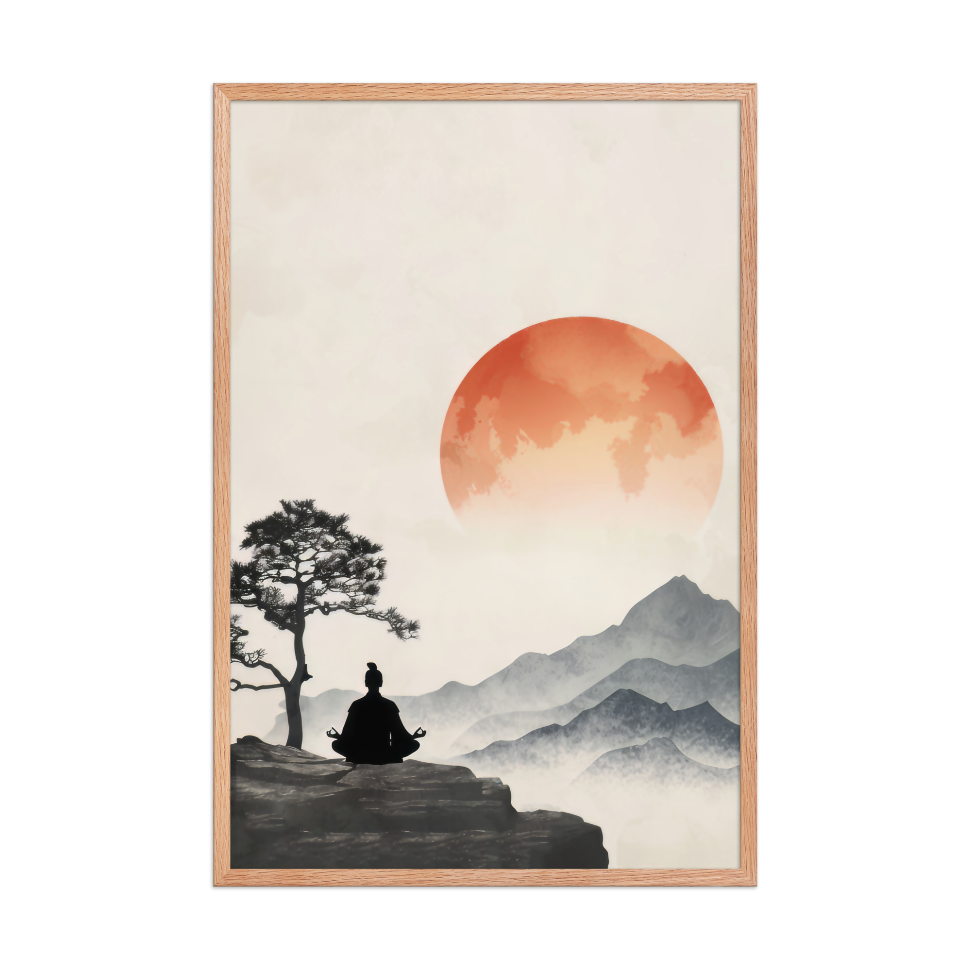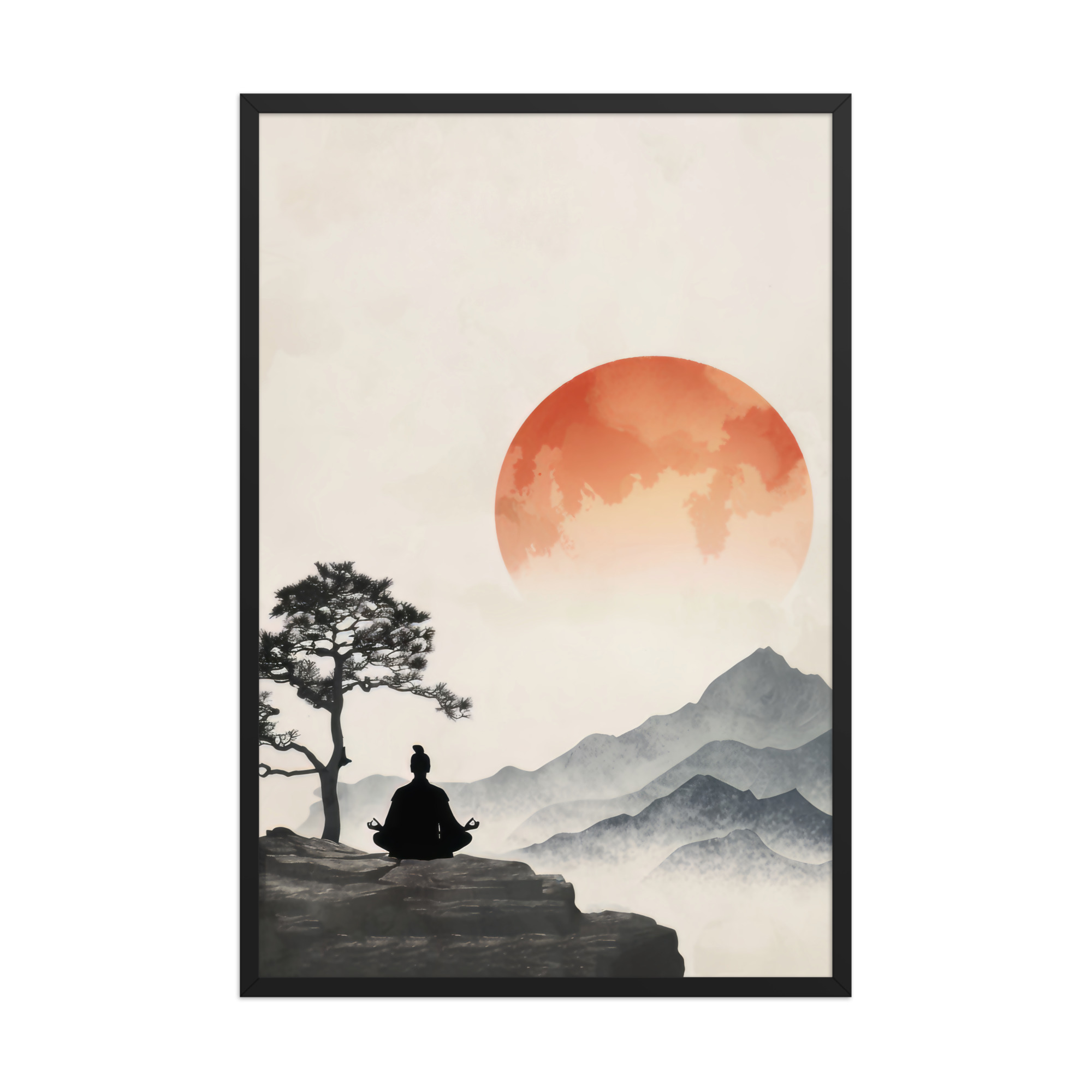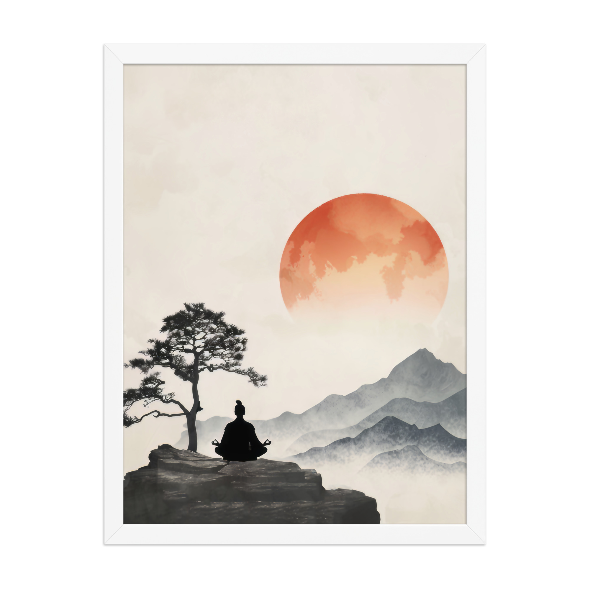 A lone figure meditates on a cliff beside a wind-shaped pine as dawn blooms into a soft red sun. Layered blue-grey mountains fade into mist, creating a serene Japanese mood that settles any modern, Japandi-inspired space.