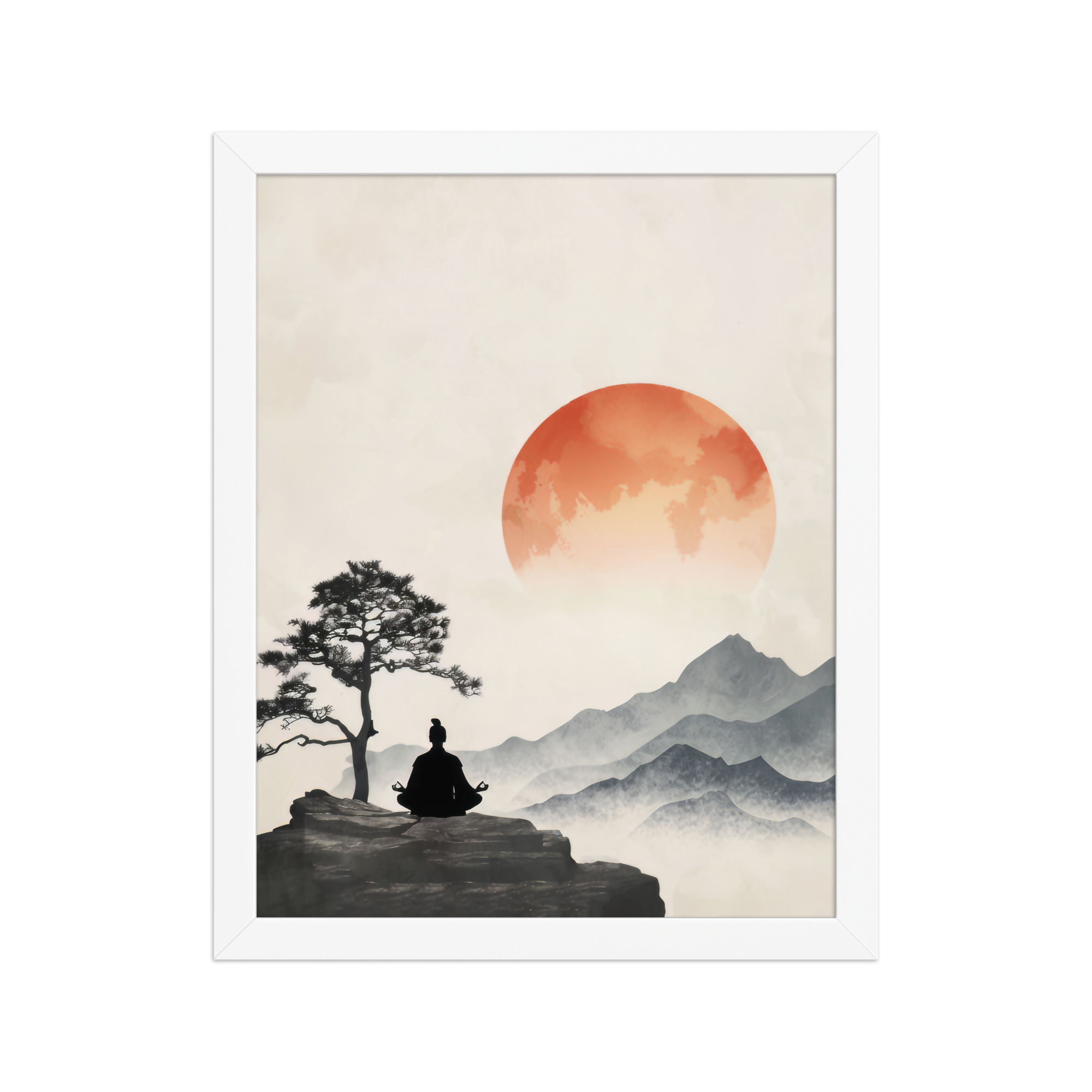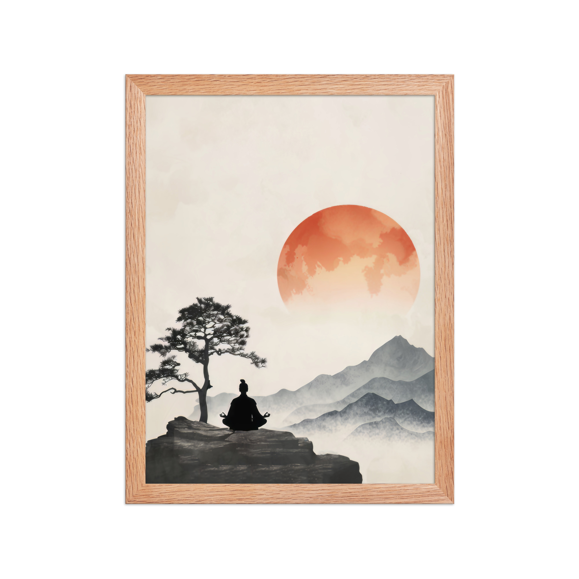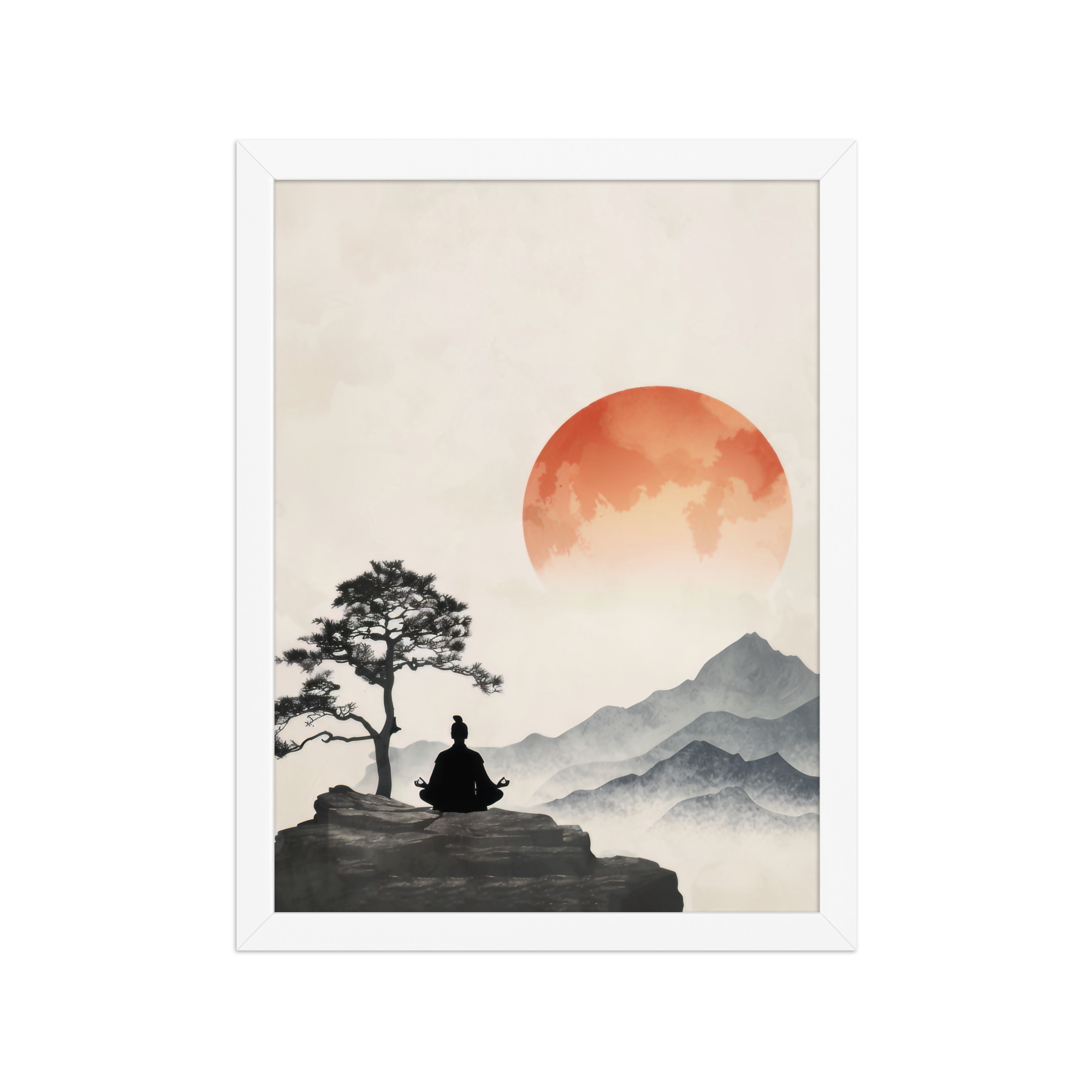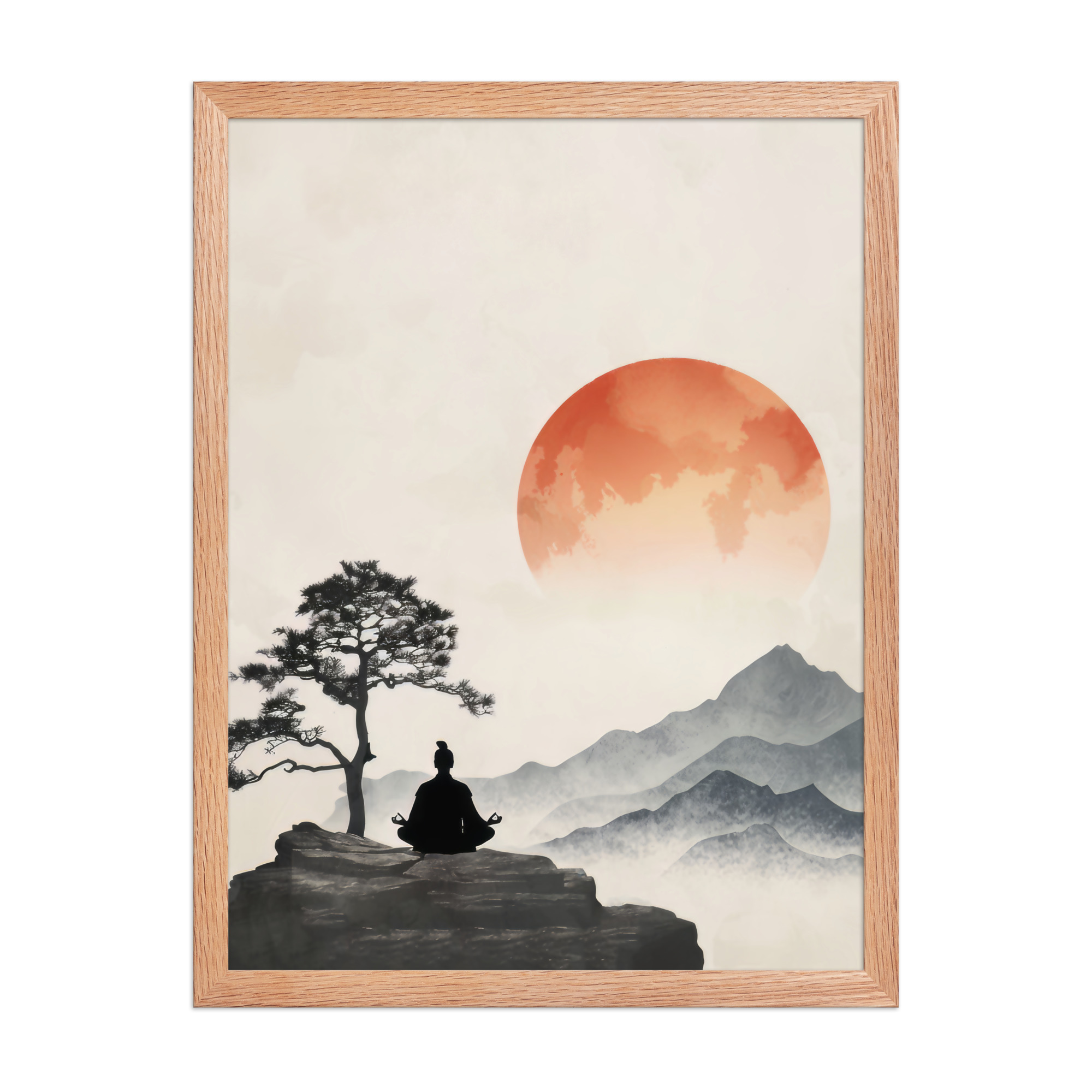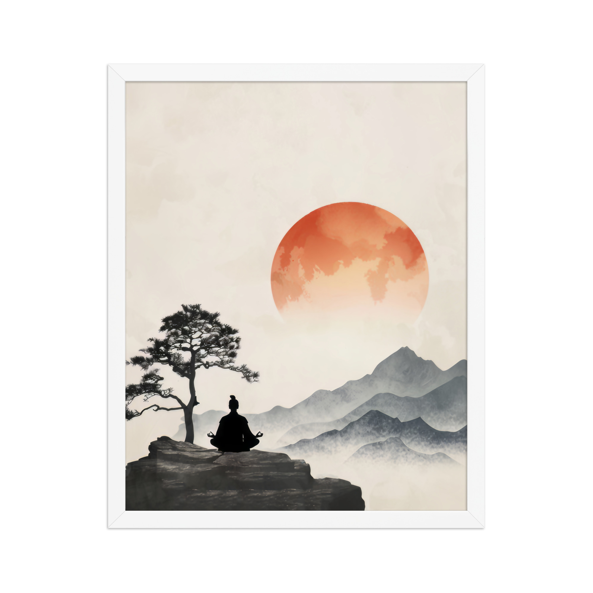 A lone figure meditates on a cliff beside a wind-shaped pine as dawn blooms into a soft red sun. Layered blue-grey mountains fade into mist, creating a serene Japanese mood that settles any modern, Japandi-inspired space.