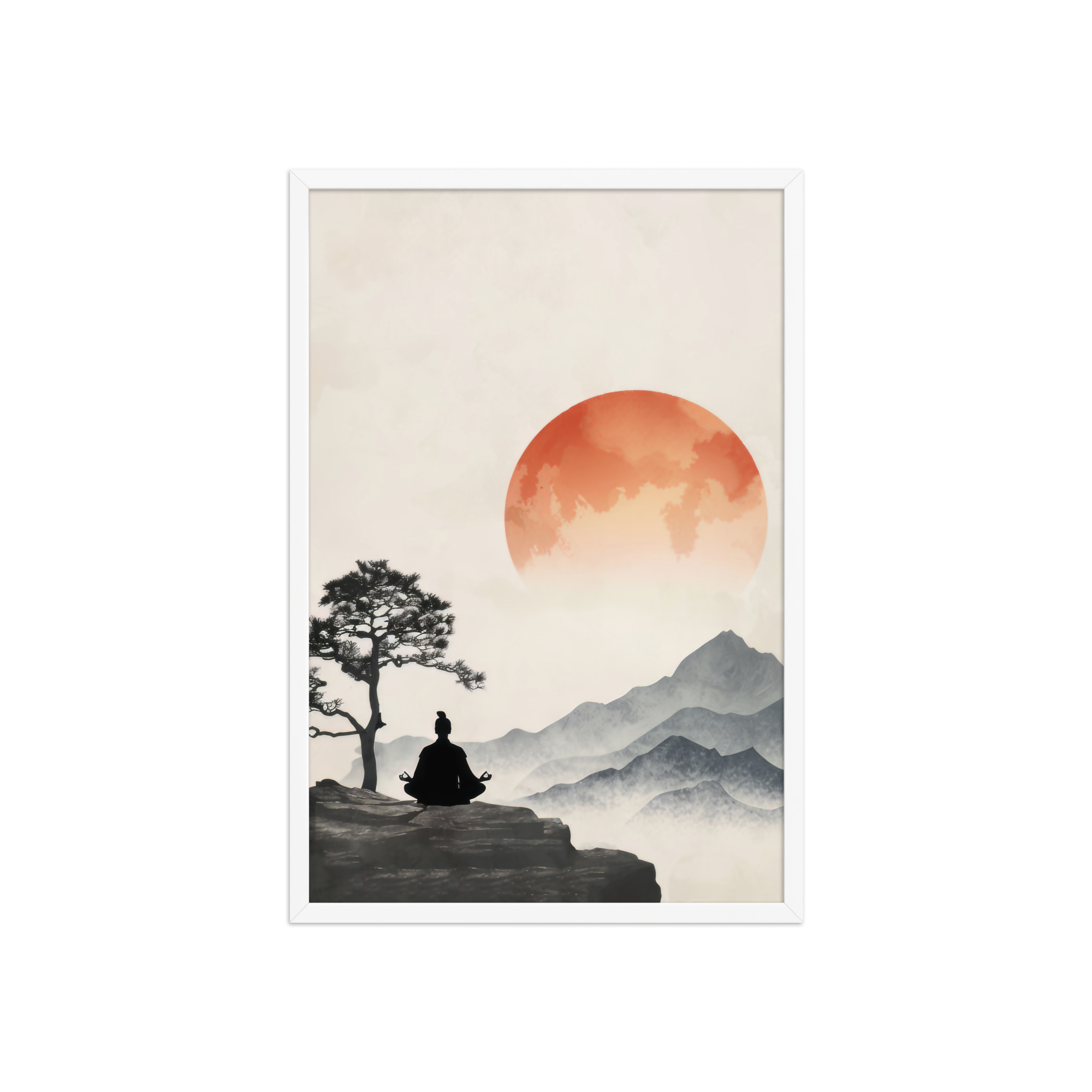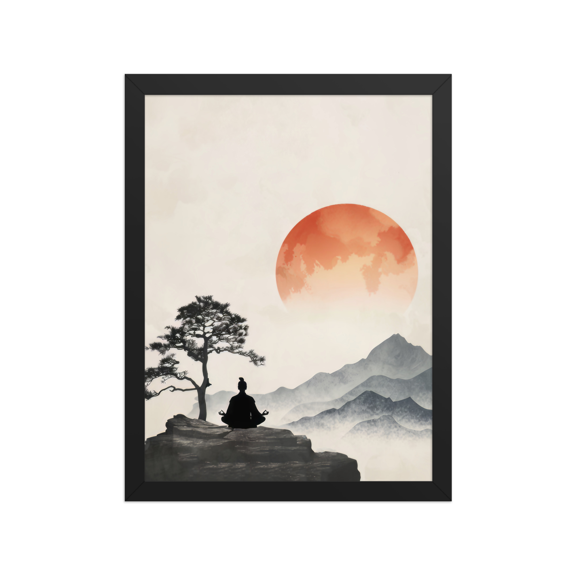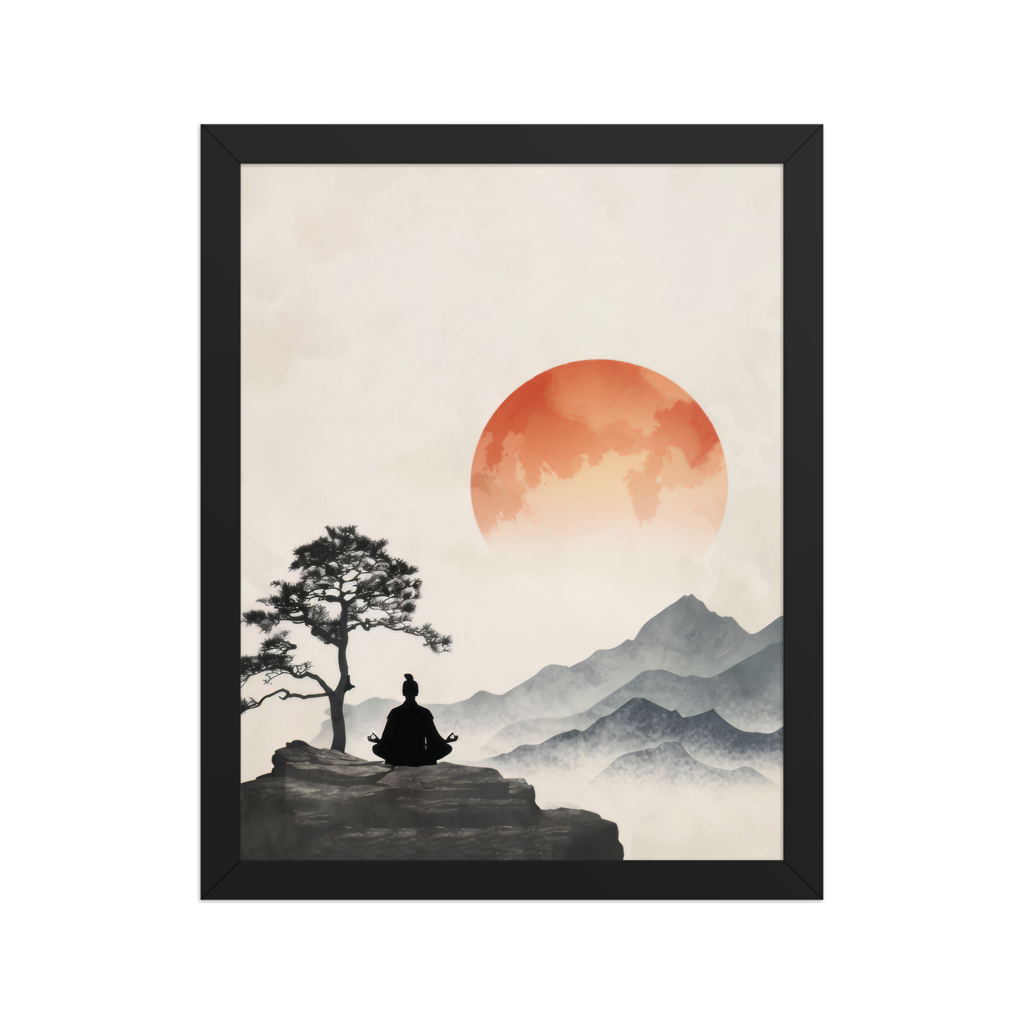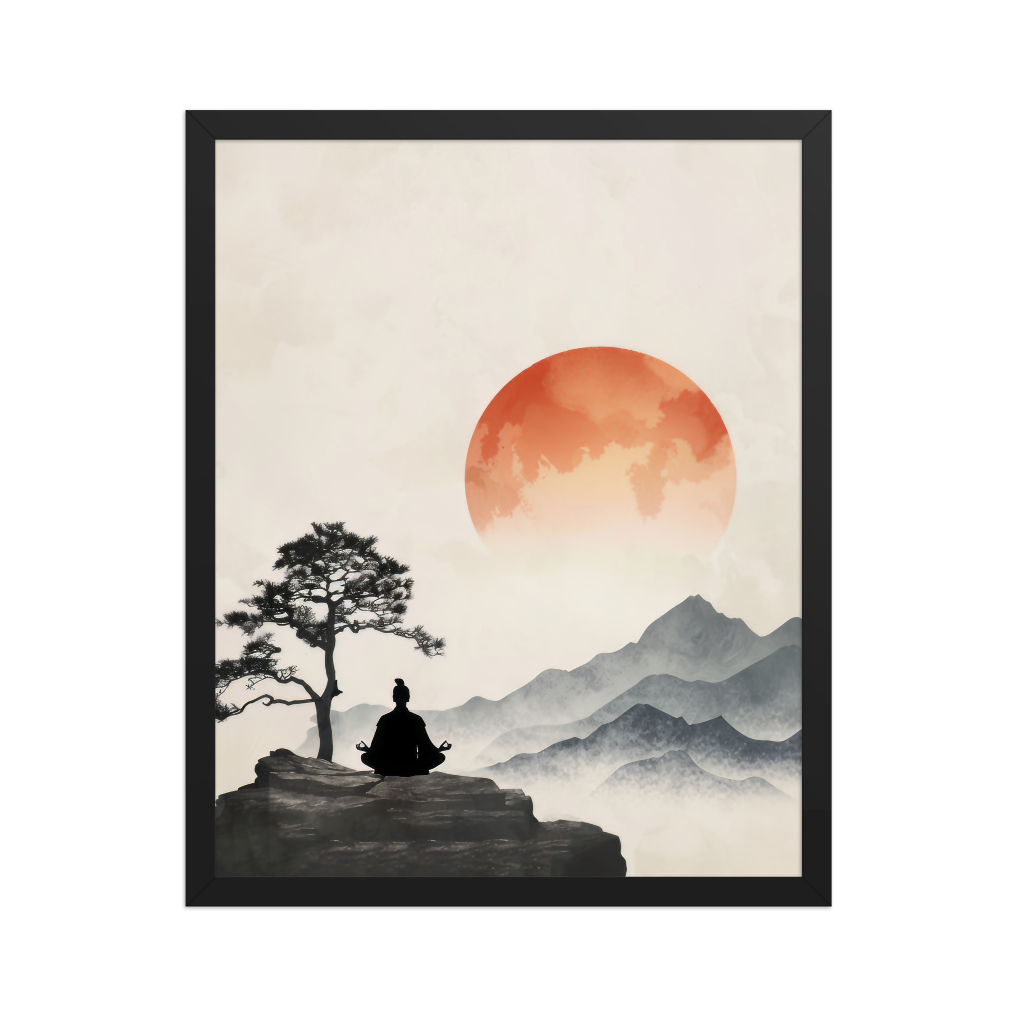 A lone figure meditates on a cliff beside a wind-shaped pine as dawn blooms into a soft red sun. Layered blue-grey mountains fade into mist, creating a serene Japanese mood that settles any modern, Japandi-inspired space.