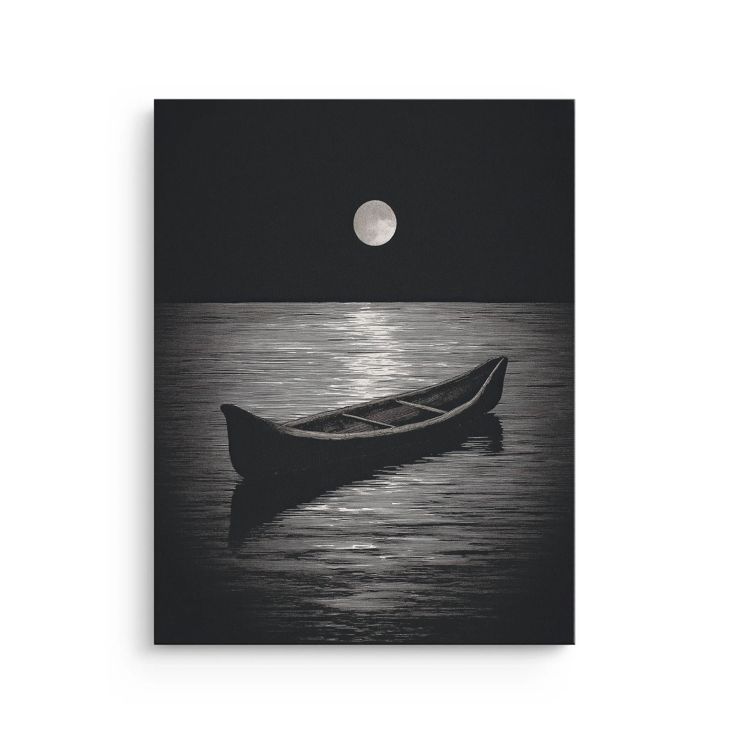 A quiet canoe rests beneath a luminous moon, with soft ripples catching the light like silver threads. The minimal night scene brings a calm, reflective mood to any room.
