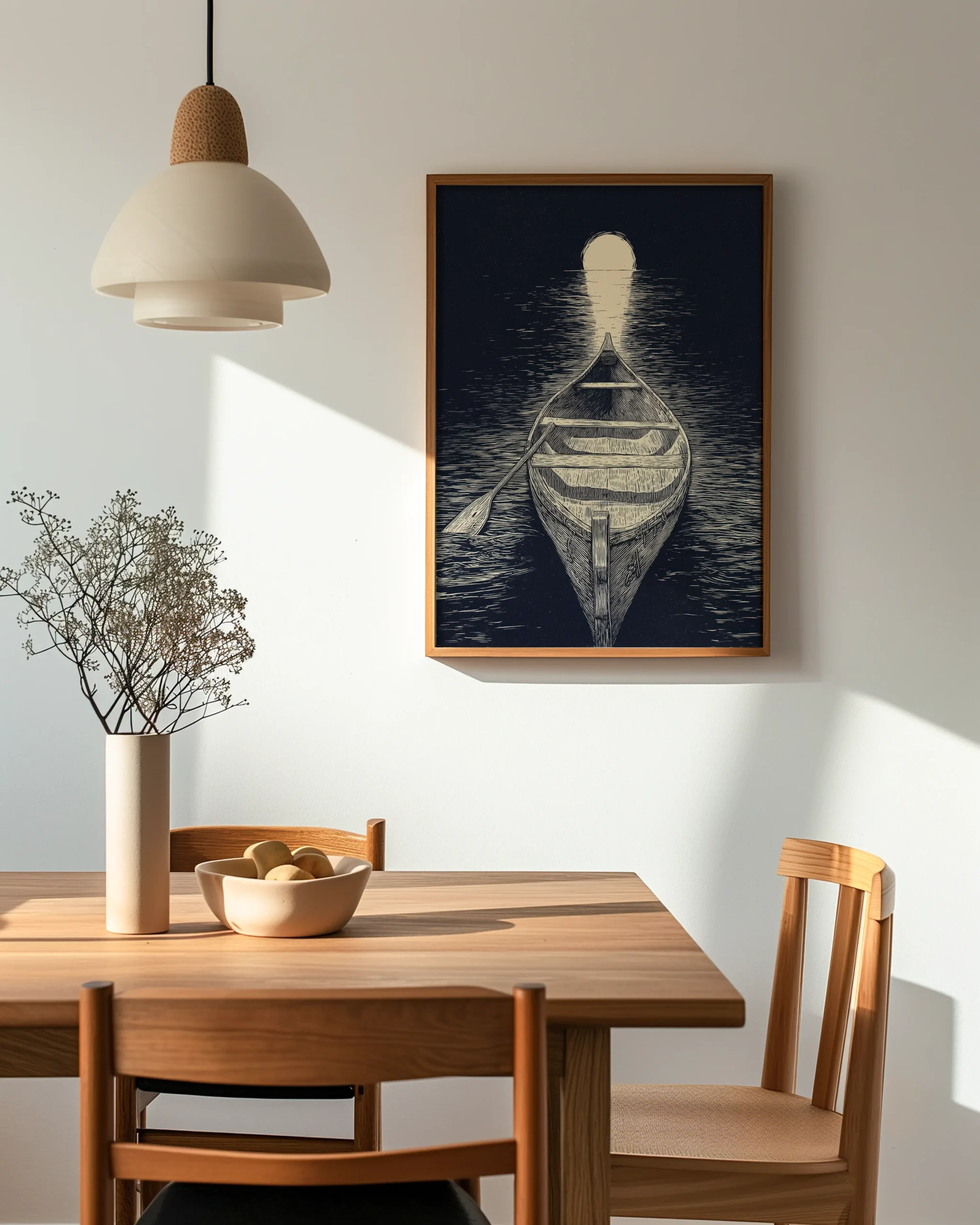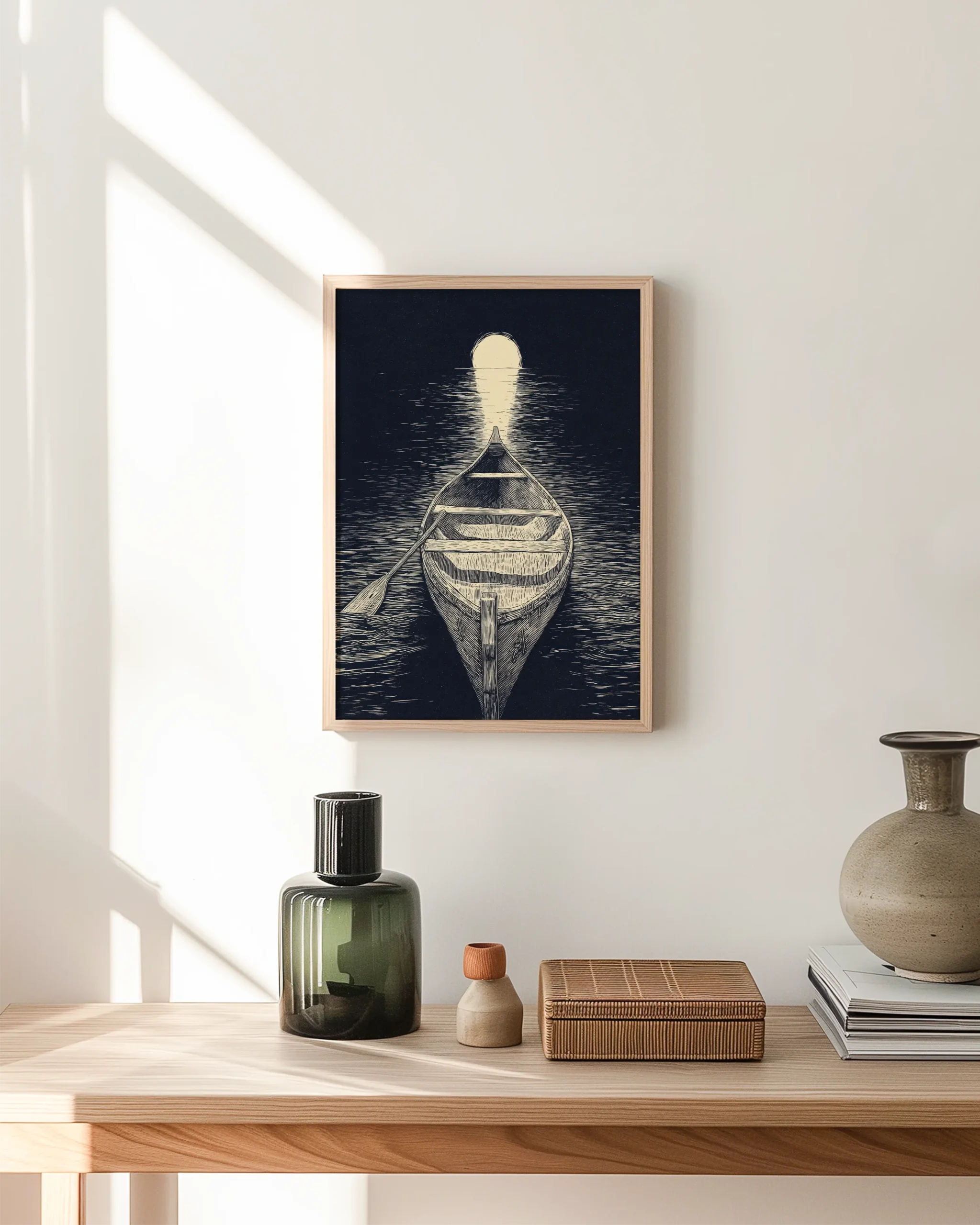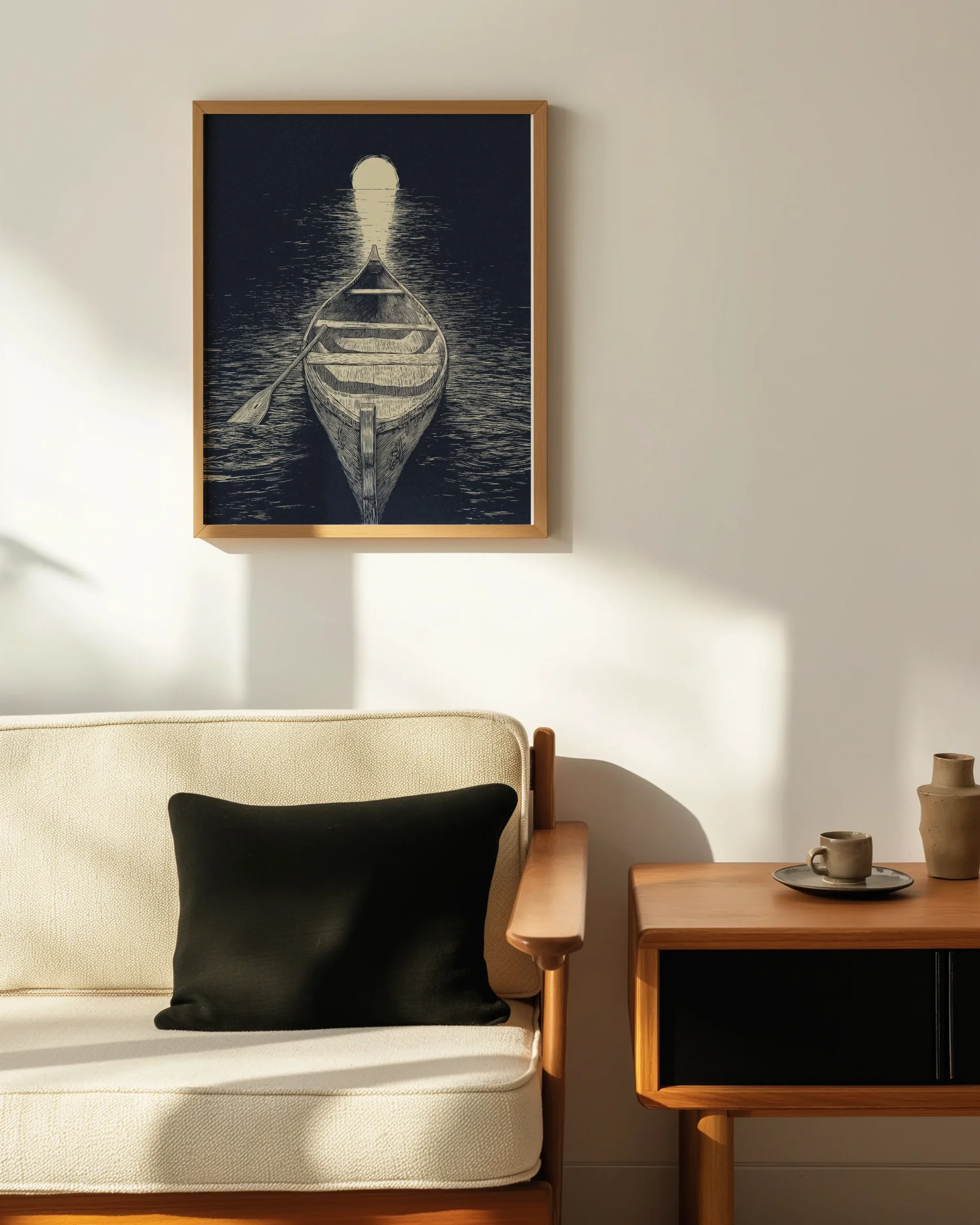Woodcut-style canoe gliding toward a glowing moon on a still night lake—printed on museum-quality enhanced matte paper. Framed and ready to hang with your preferred frame (Black, White, or Red Oak).