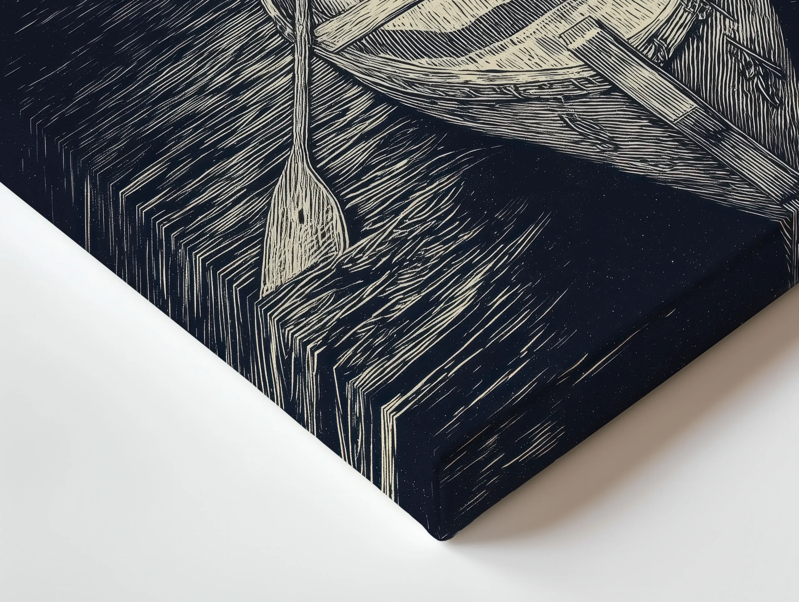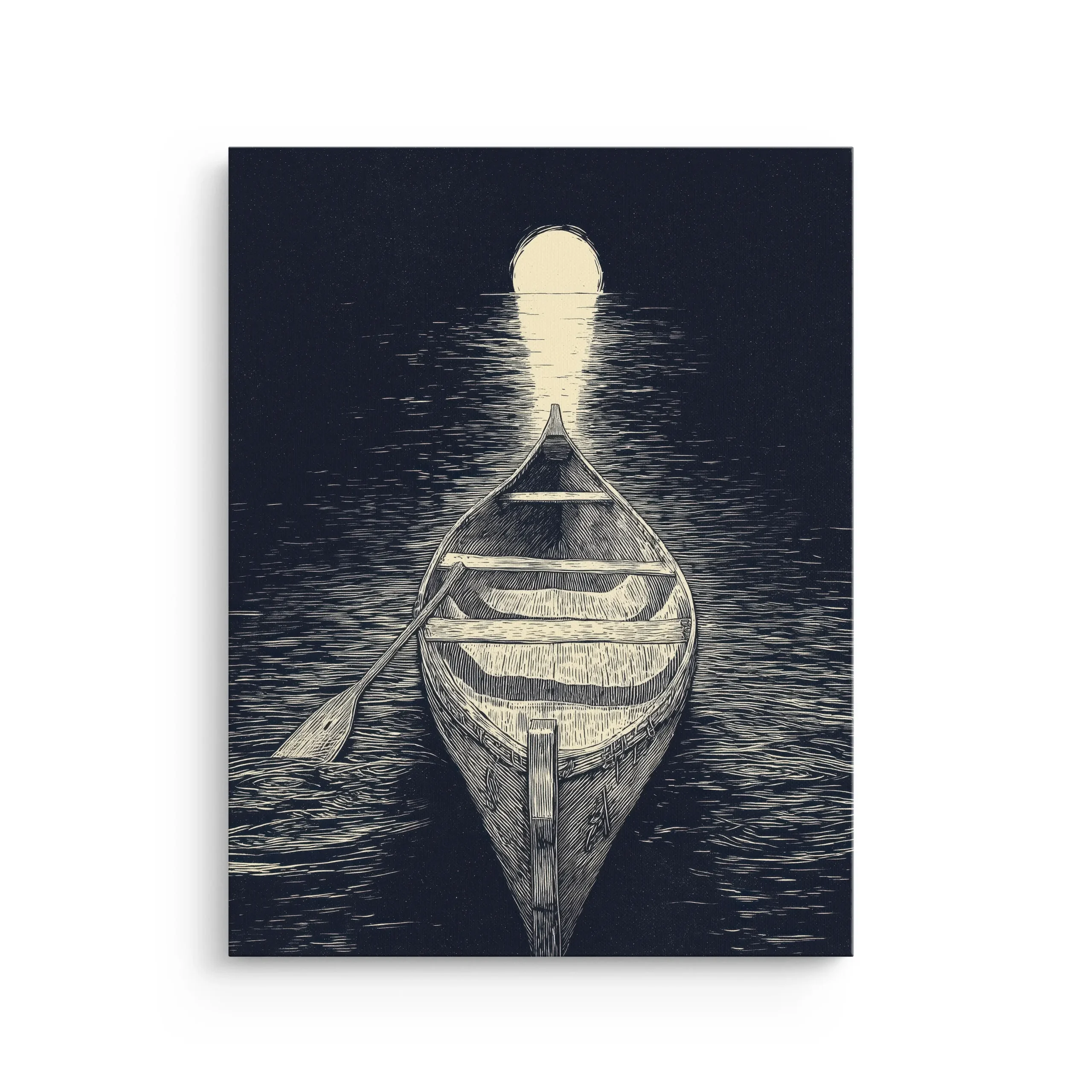 A solitary canoe drifts beneath a bright moon, rendered in fine engraved lines that turn the water into a quiet, rhythmic texture.