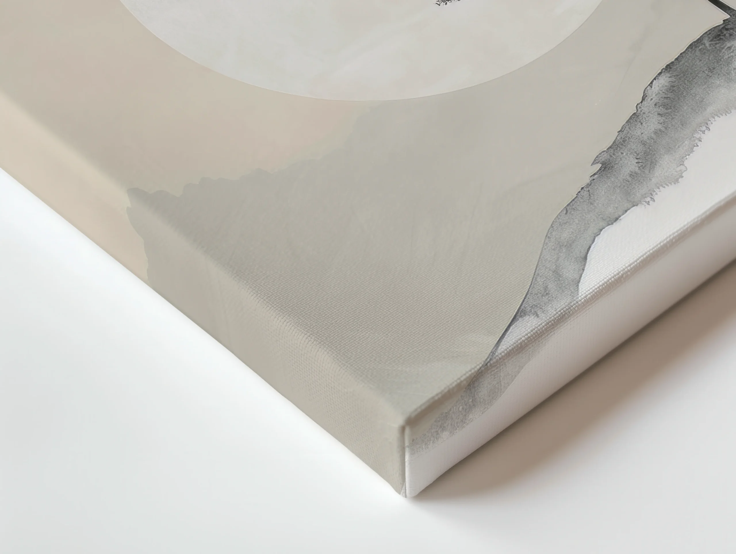A quiet moon rises over a foggy ridge, where a single tree stands in stillness. The soft neutrals and open space create a calm, meditative mood.