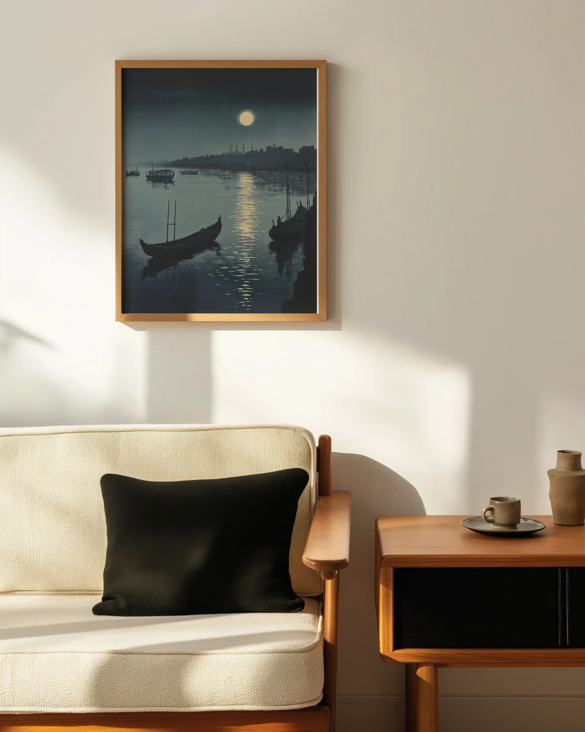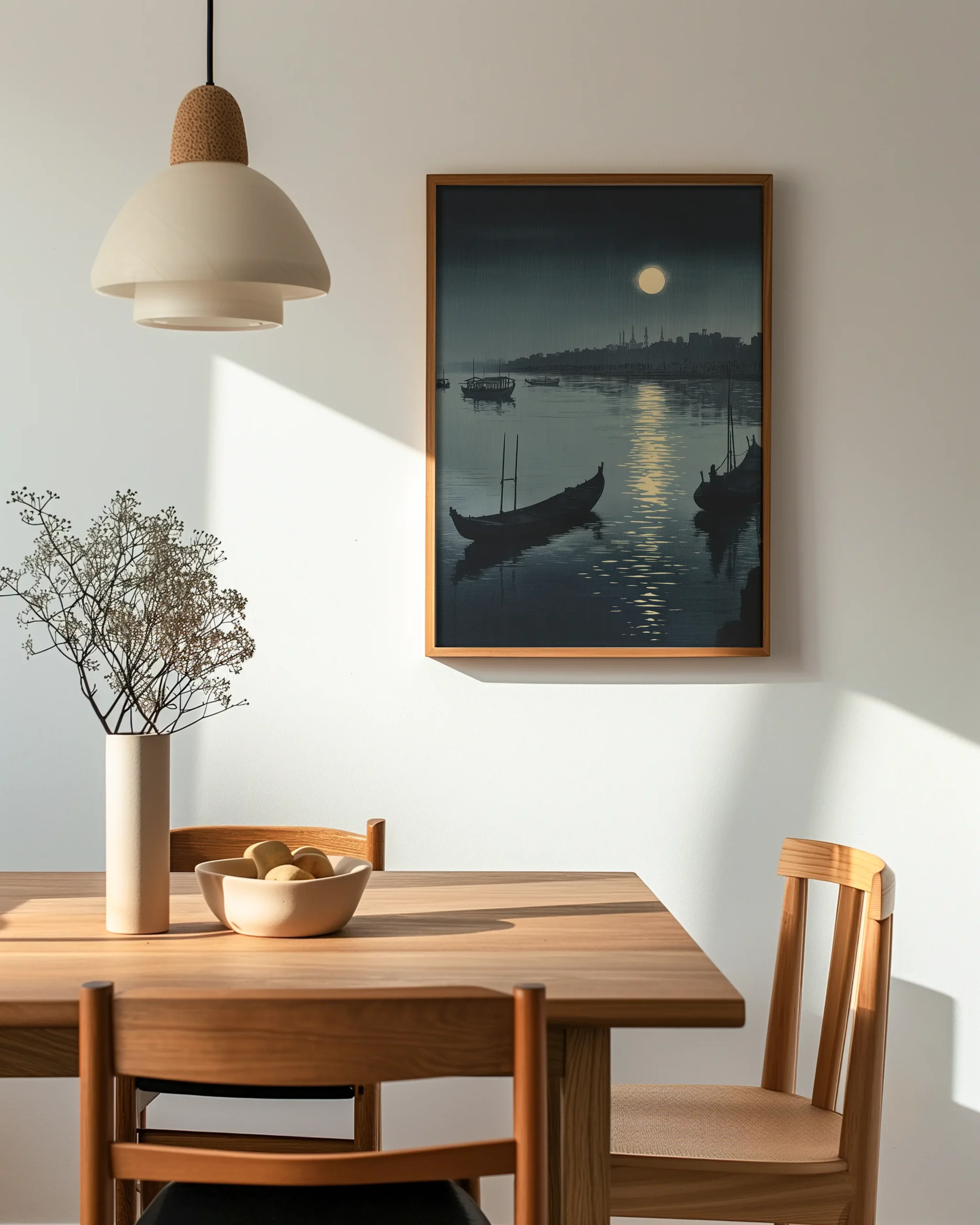 Under a luminous full moon, boats drift along a still river as city silhouettes fade into blue night. The gentle reflection line guides the eye and sets a tranquil, contemplative mood.