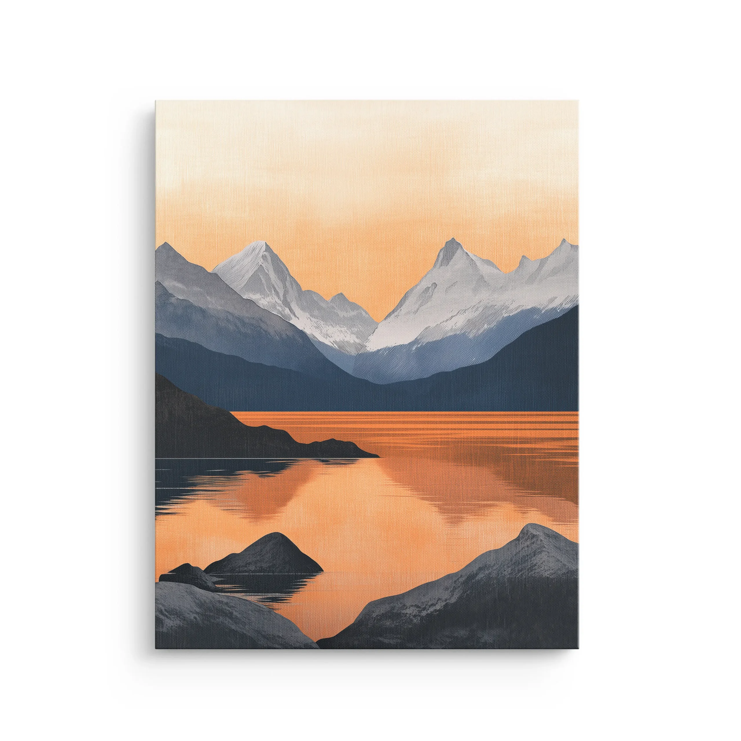 Soft alpine peaks fade into cool blues while a warm sunset glow stretches across still water, creating a quiet reflection that feels both Nordic and Japandi.