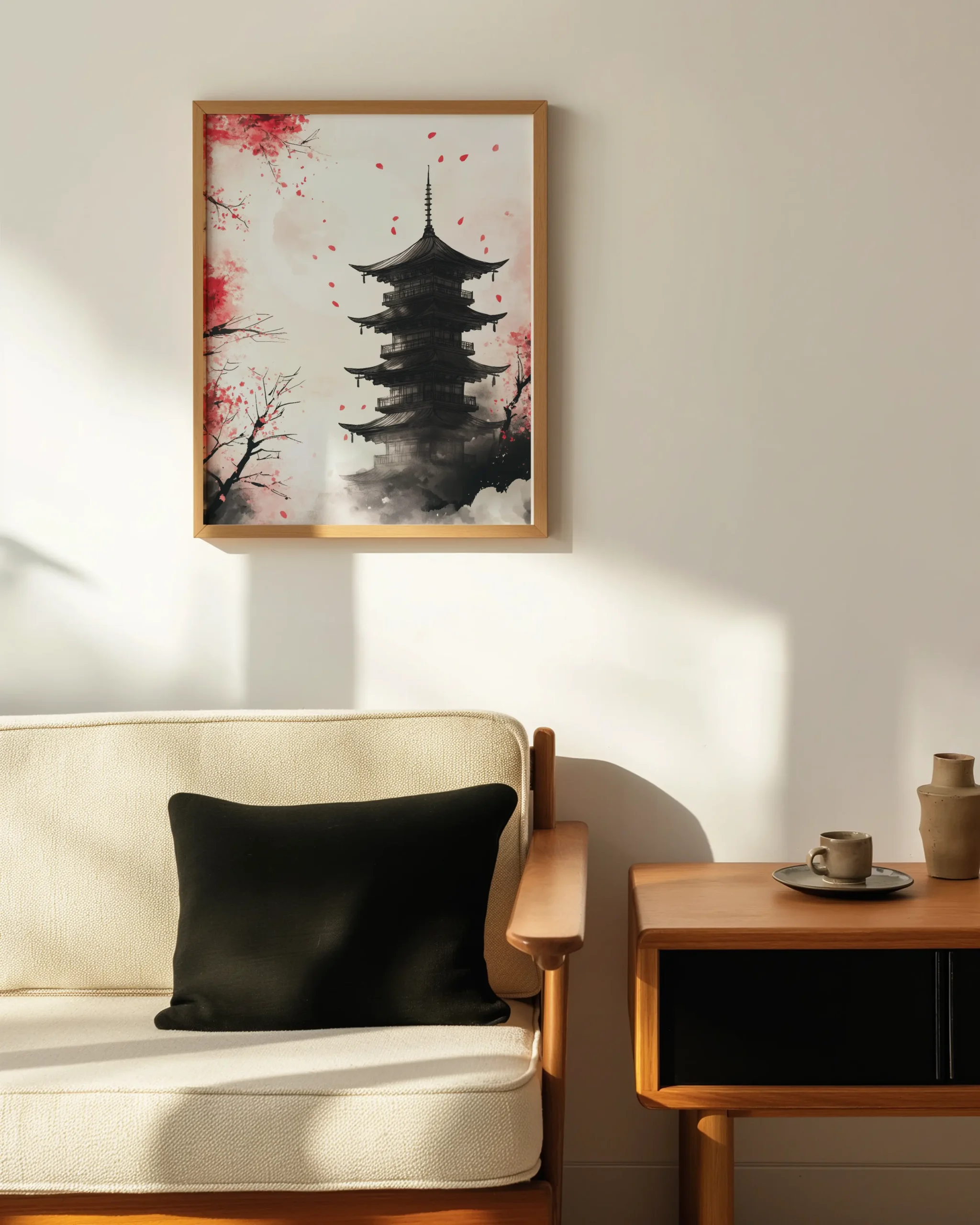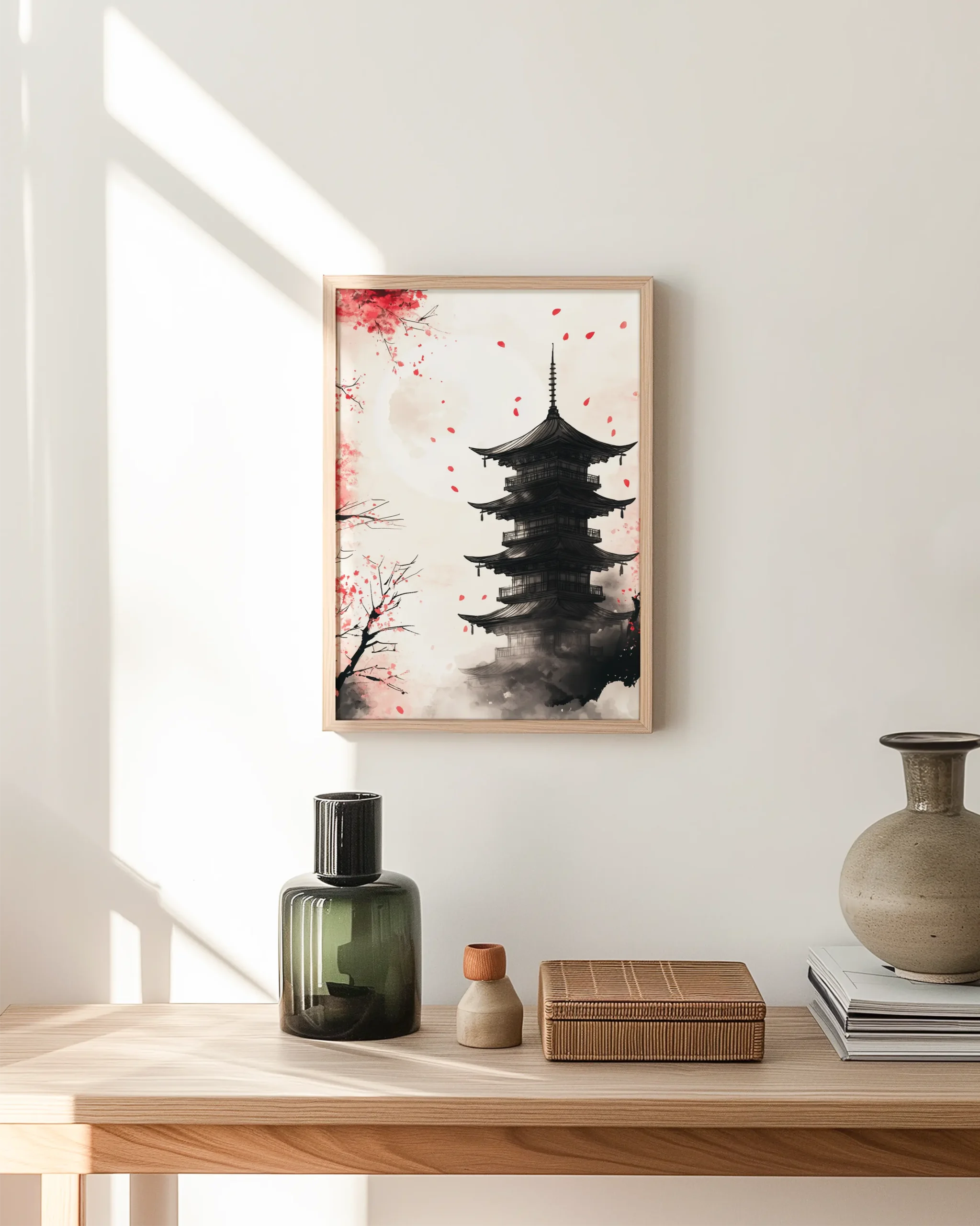 A five-tier pagoda rises through mist as sakura petals fall across a pale moon. The gentle motion and soft washes create a calm, contemplative focal point.