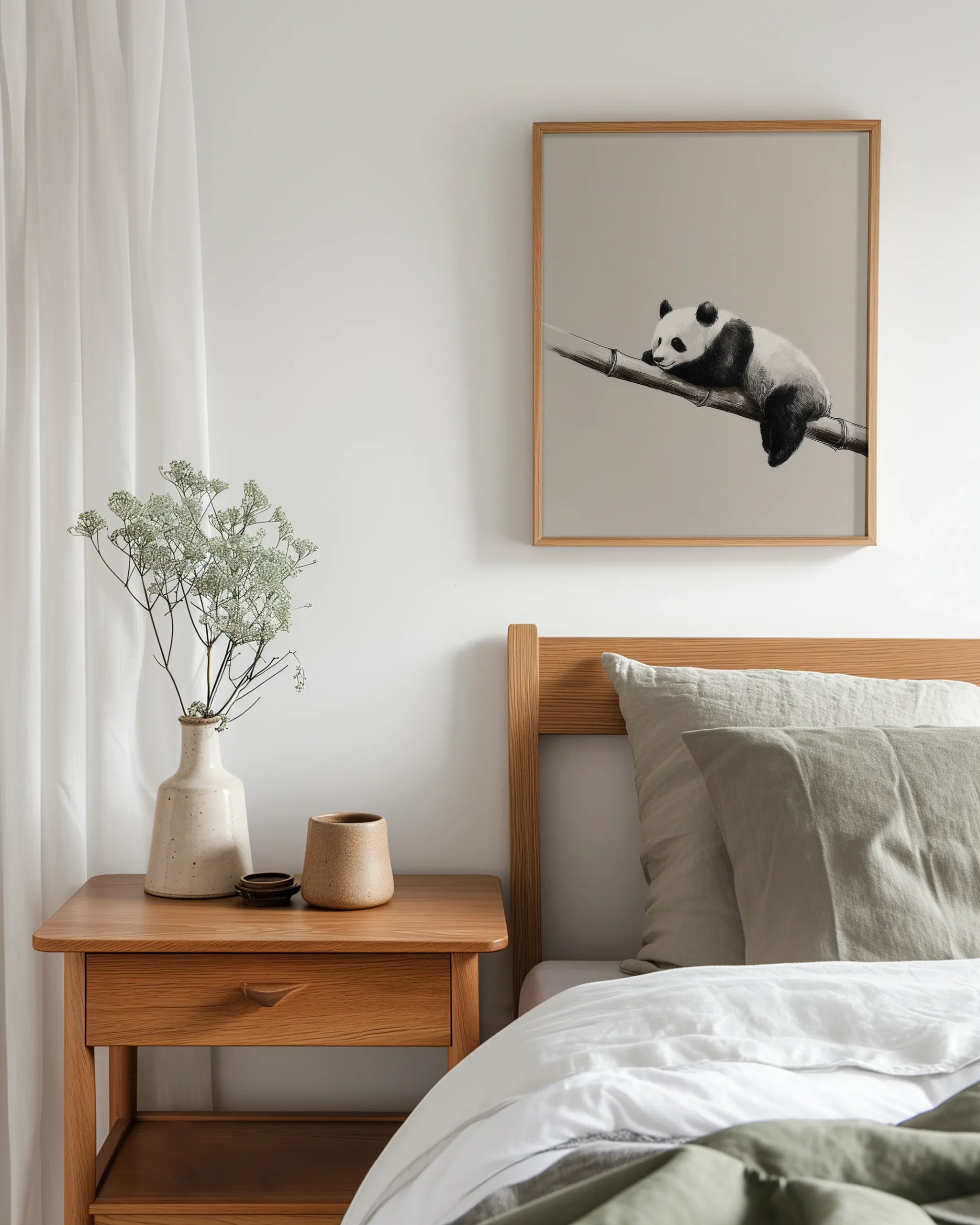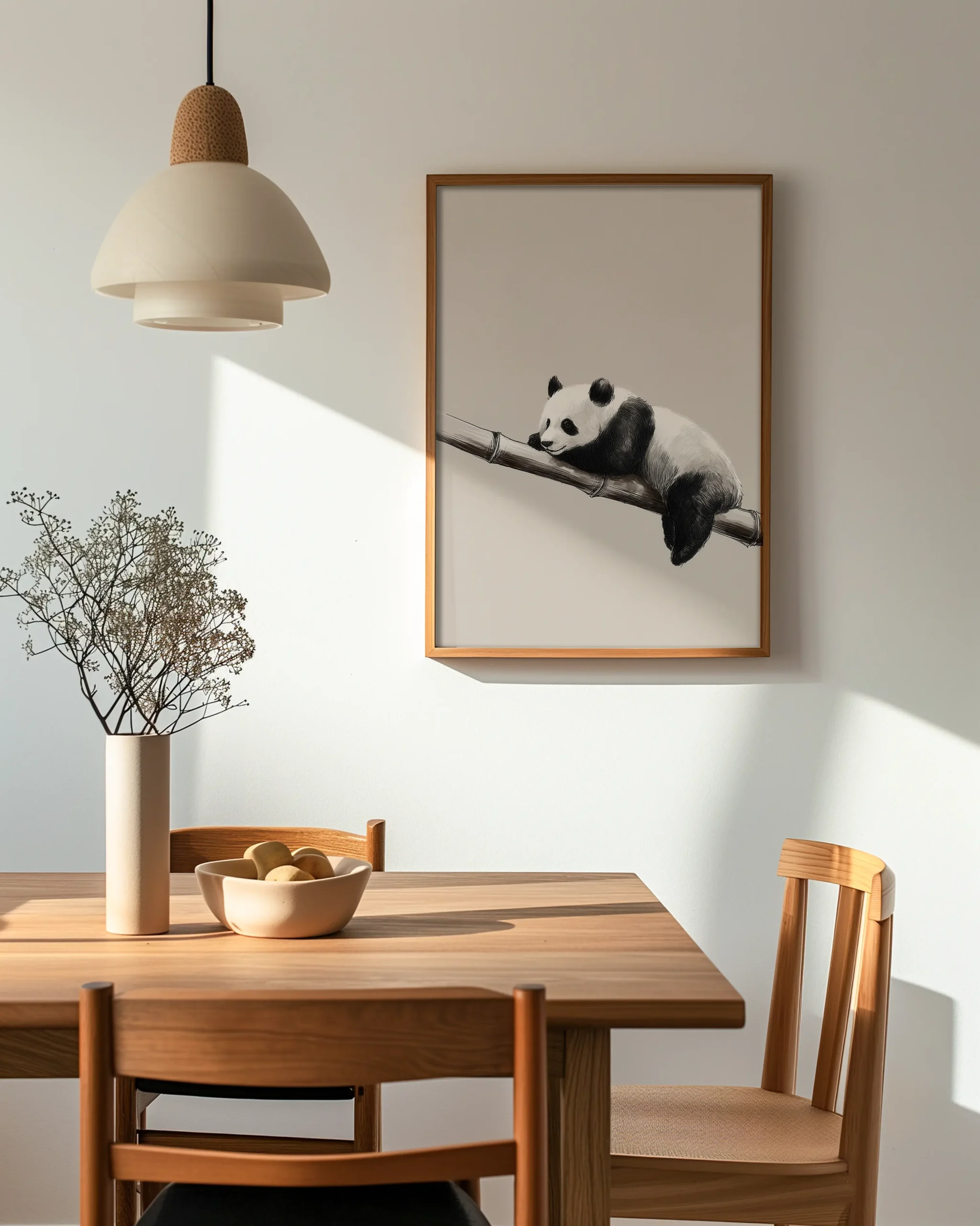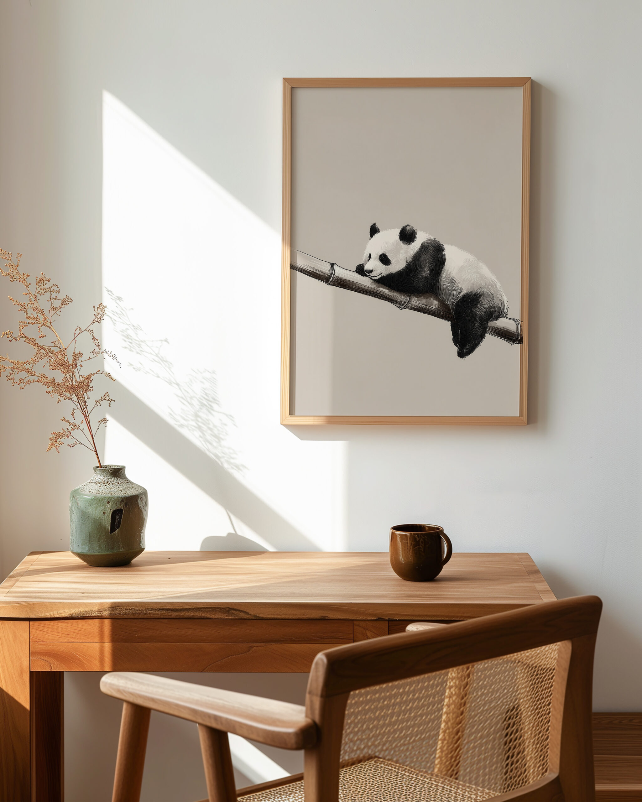 A sleepy panda draped over a bamboo branch on a calm neutral background—minimal Japandi animal wall art for nurseries and modern spaces, printed on museum-quality enhanced matte paper. Framed and ready to hang with your preferred frame (Black, White, or Red Oak).