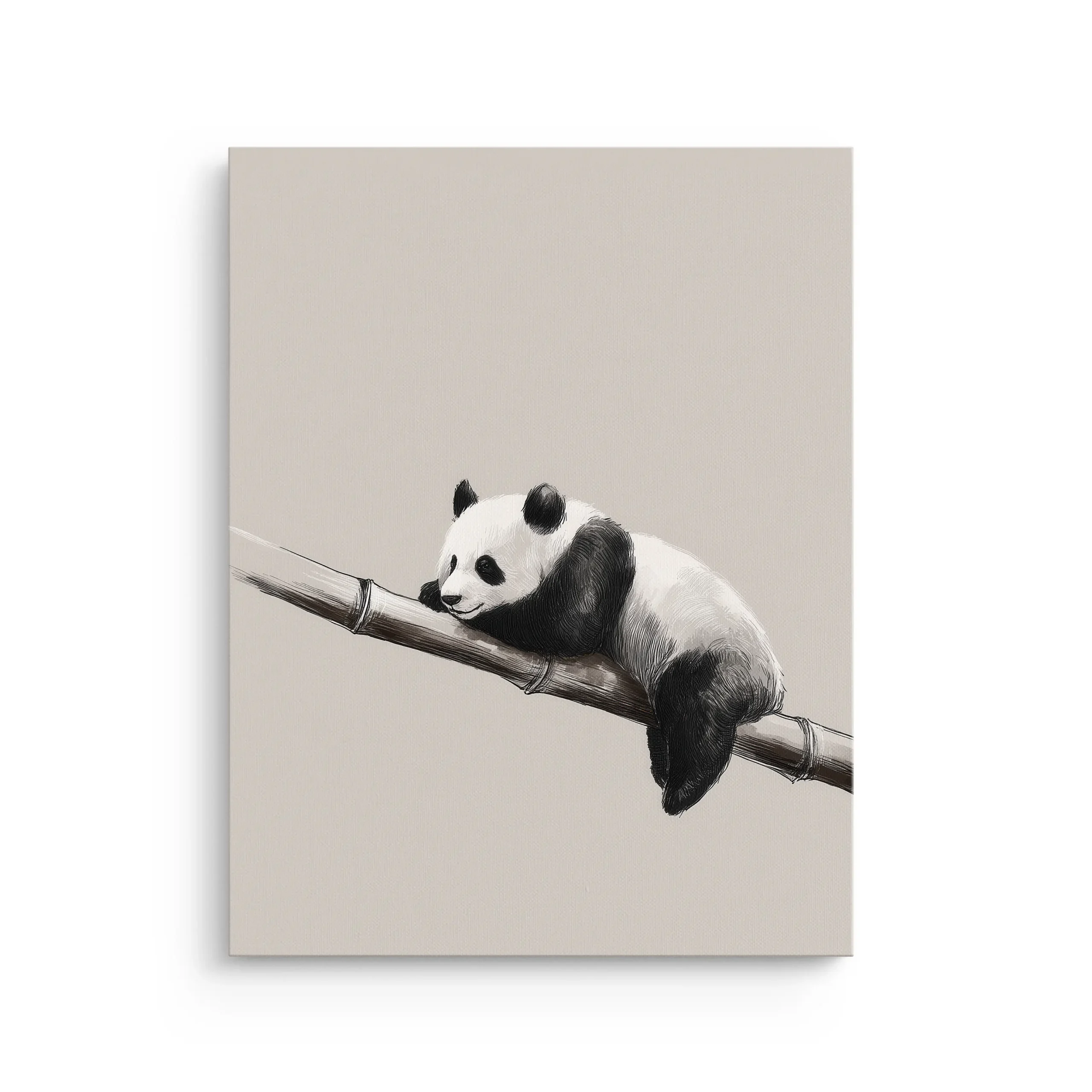 A sleepy panda rests on a bamboo branch in a calm Japandi ink-style scene, printed on a premium thin canvas and ready to hang.