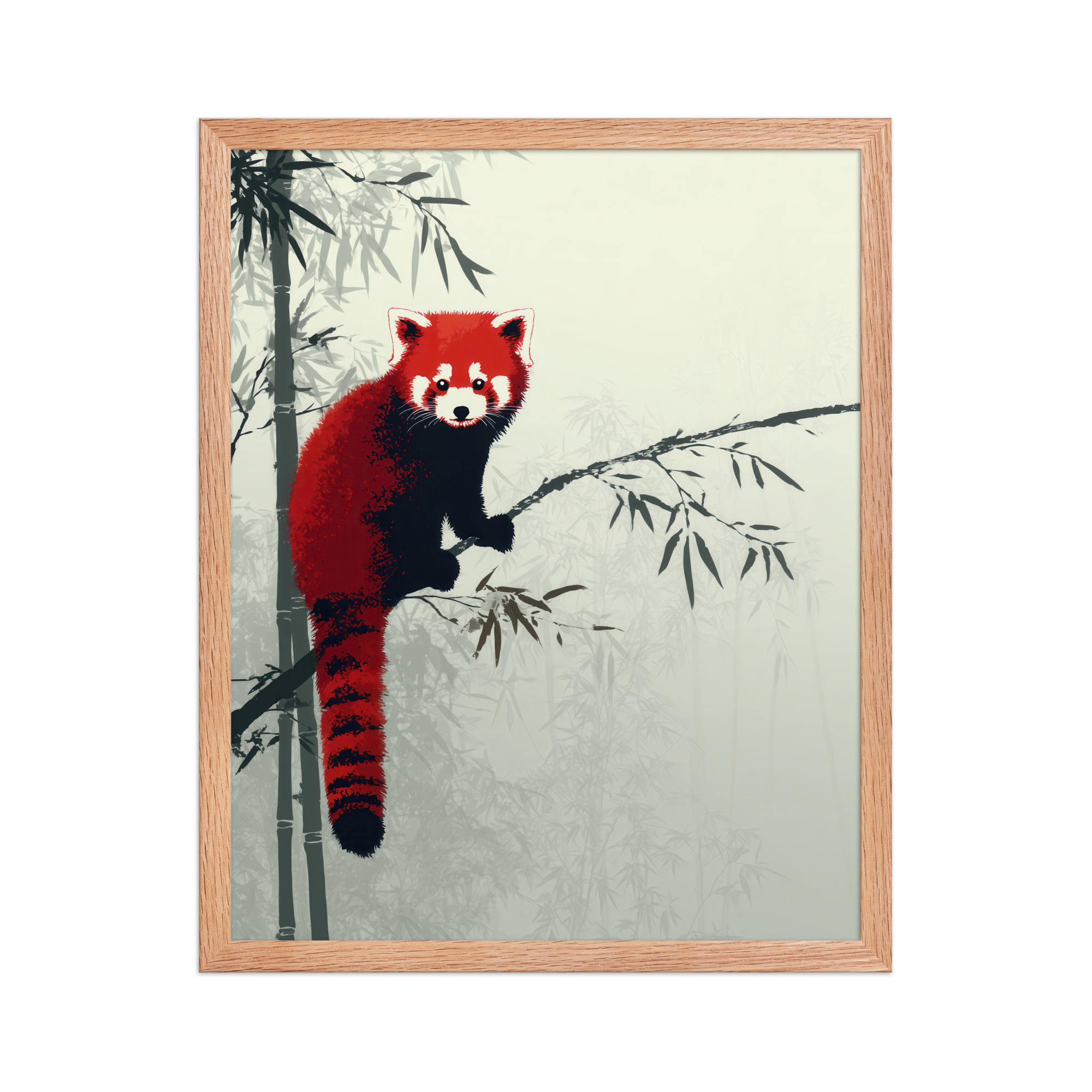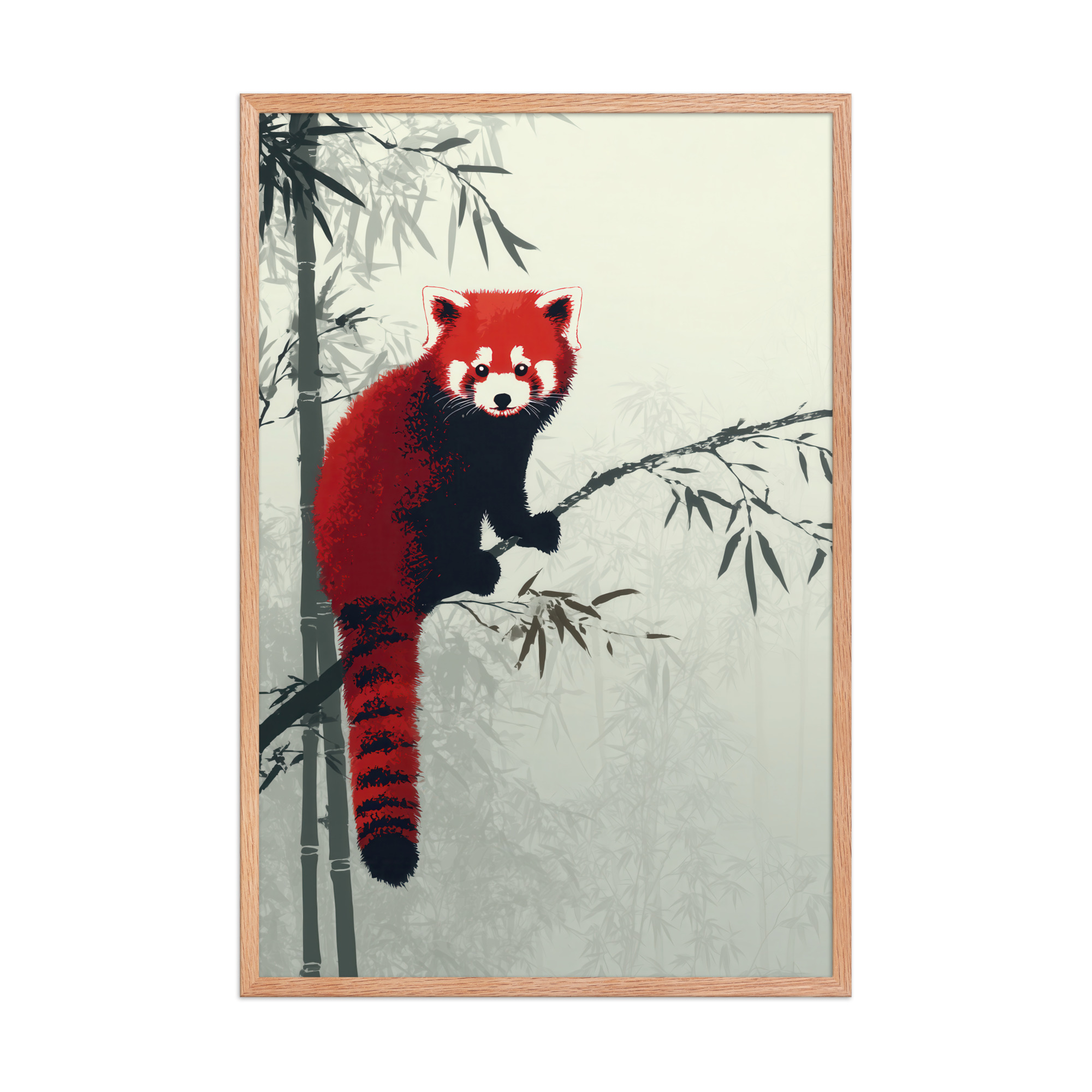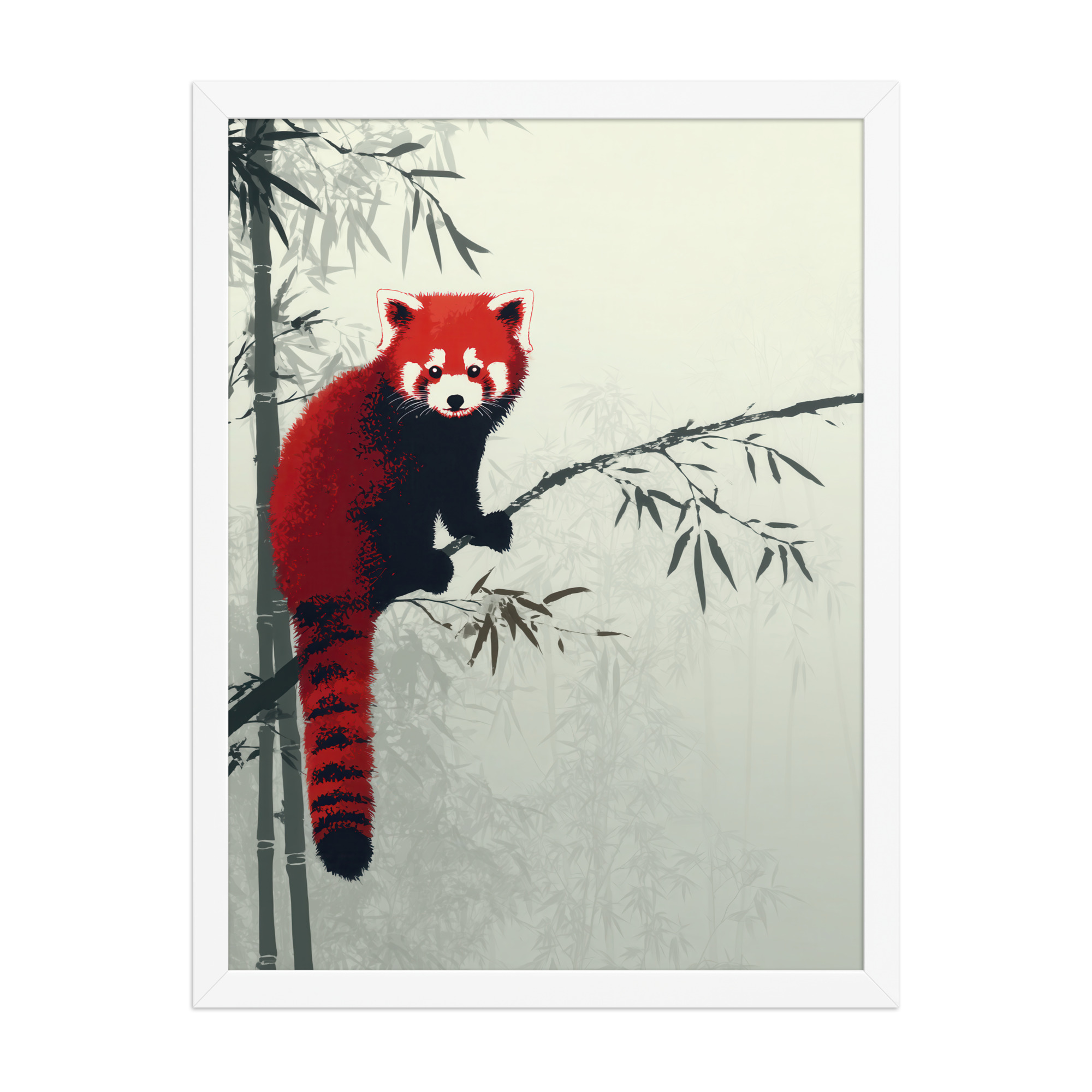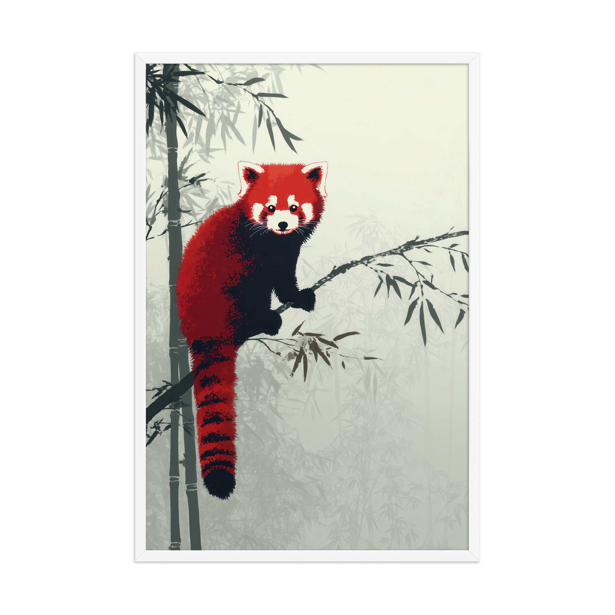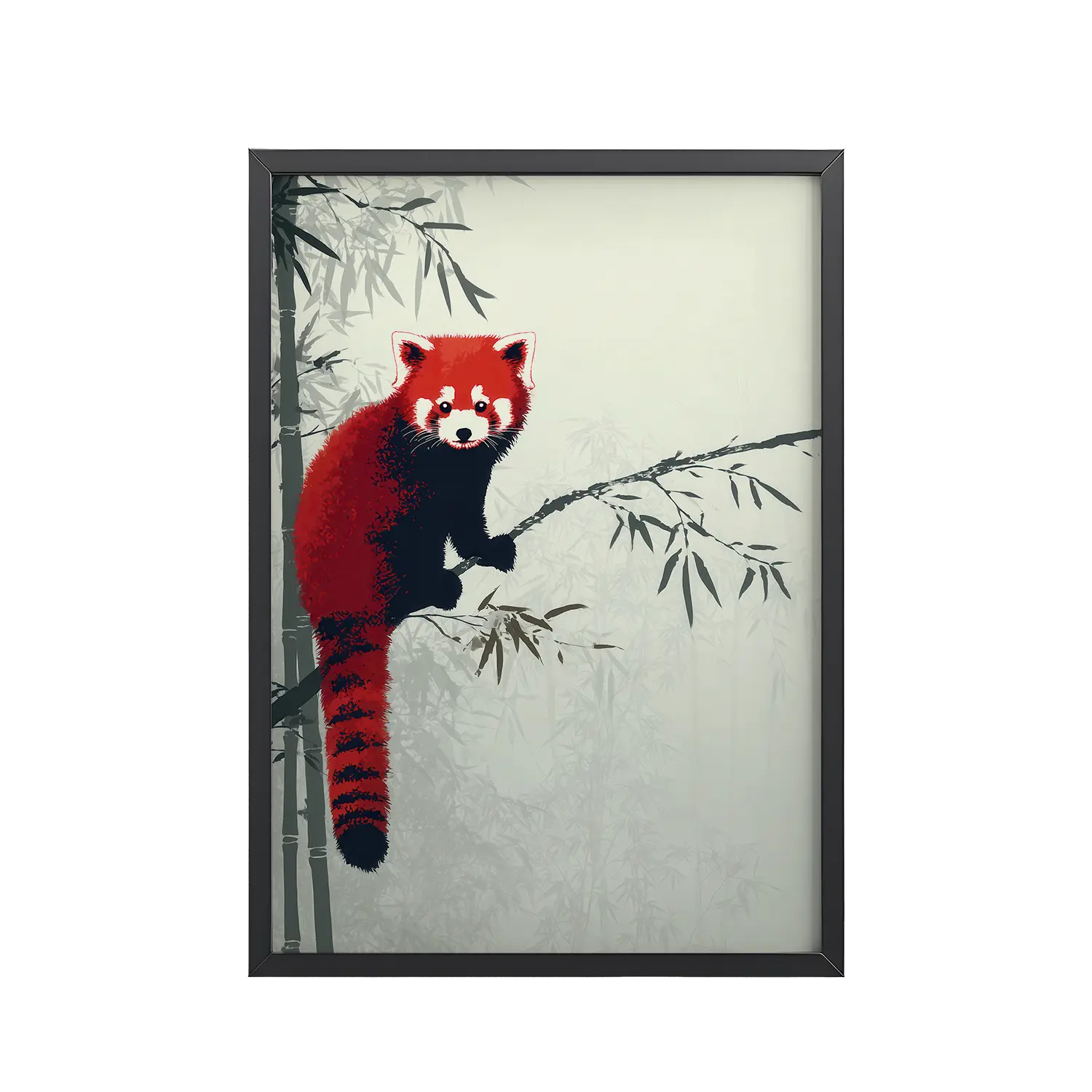 In a tranquil bamboo grove, a red panda pauses on a slender branch. The palette balances deep cinnabar fur with charcoal accents and layered sage washes, delivering Japandi calm with a playful focal point that suits living rooms, nurseries, and reading nooks.