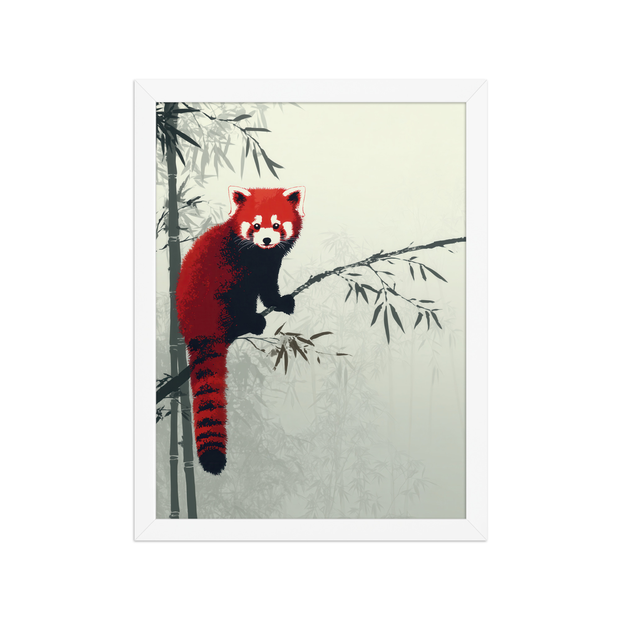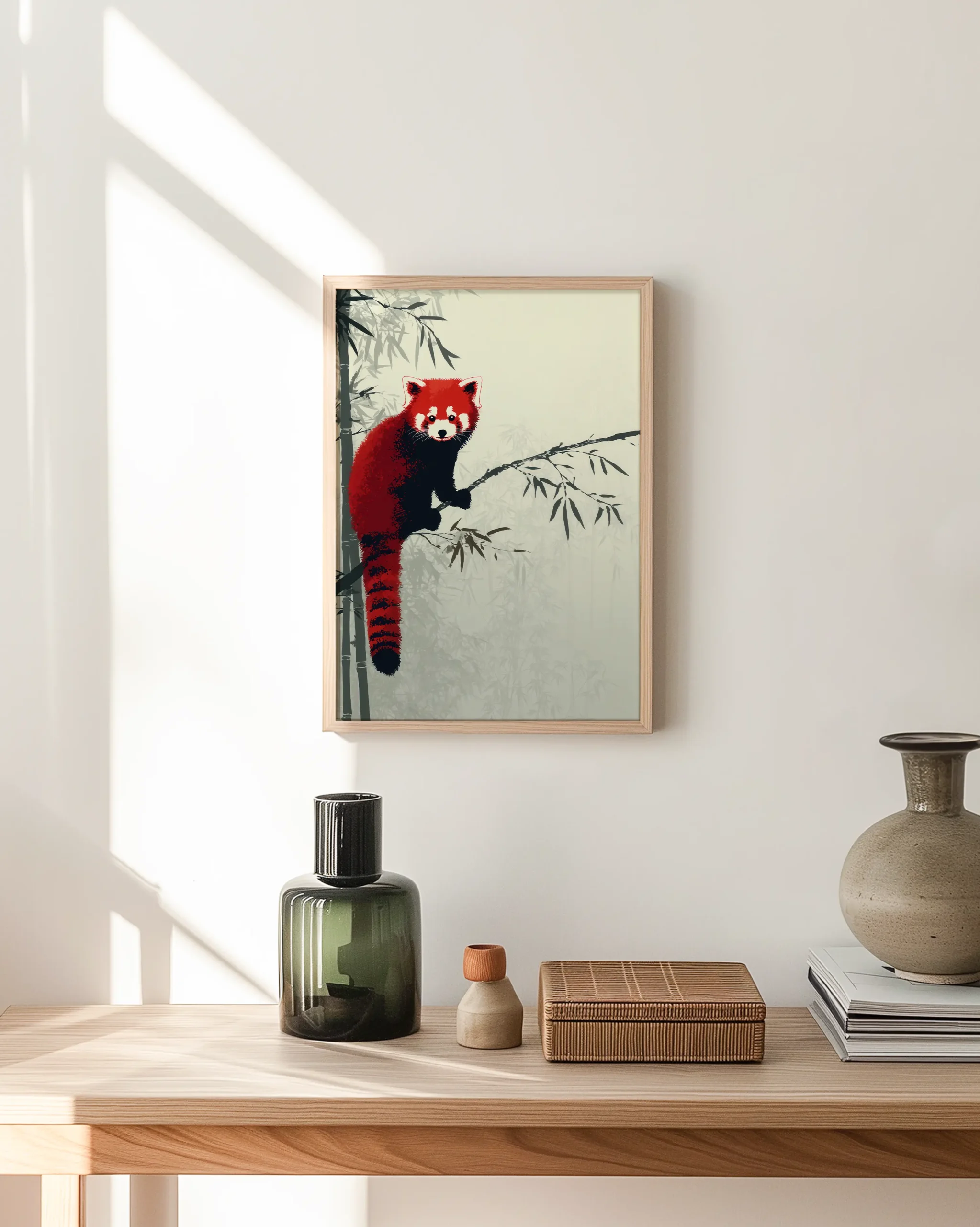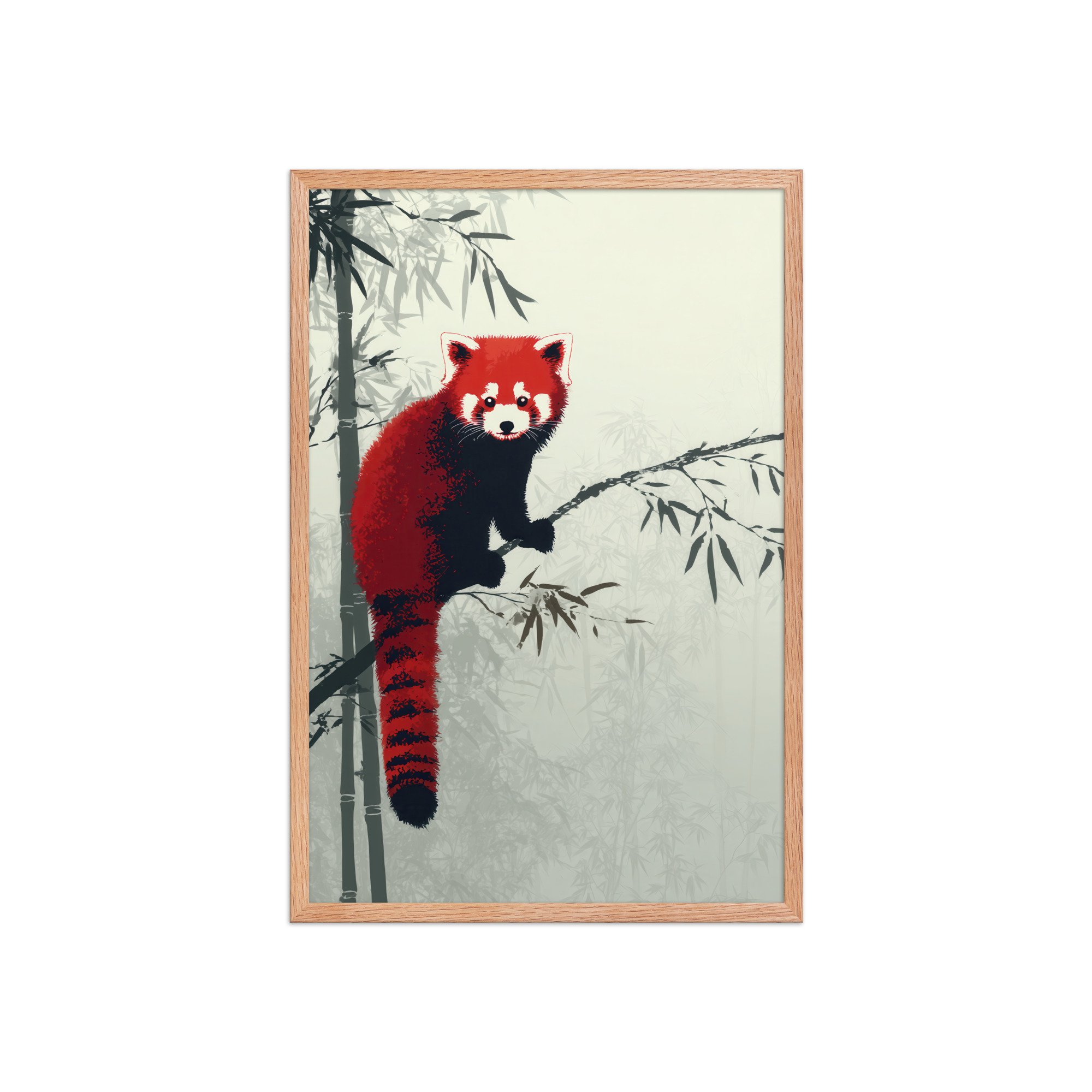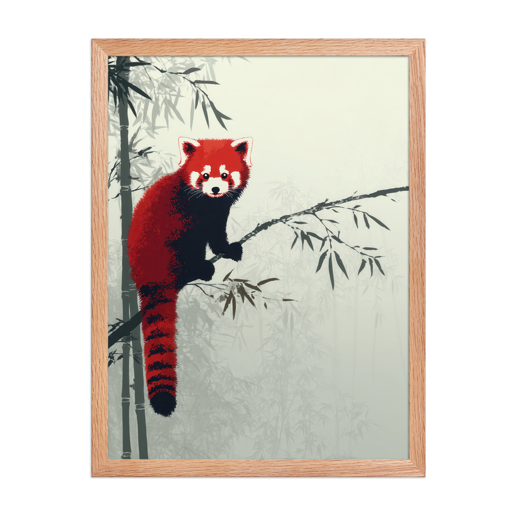 In a tranquil bamboo grove, a red panda pauses on a slender branch. The palette balances deep cinnabar fur with charcoal accents and layered sage washes, delivering Japandi calm with a playful focal point that suits living rooms, nurseries, and reading nooks.