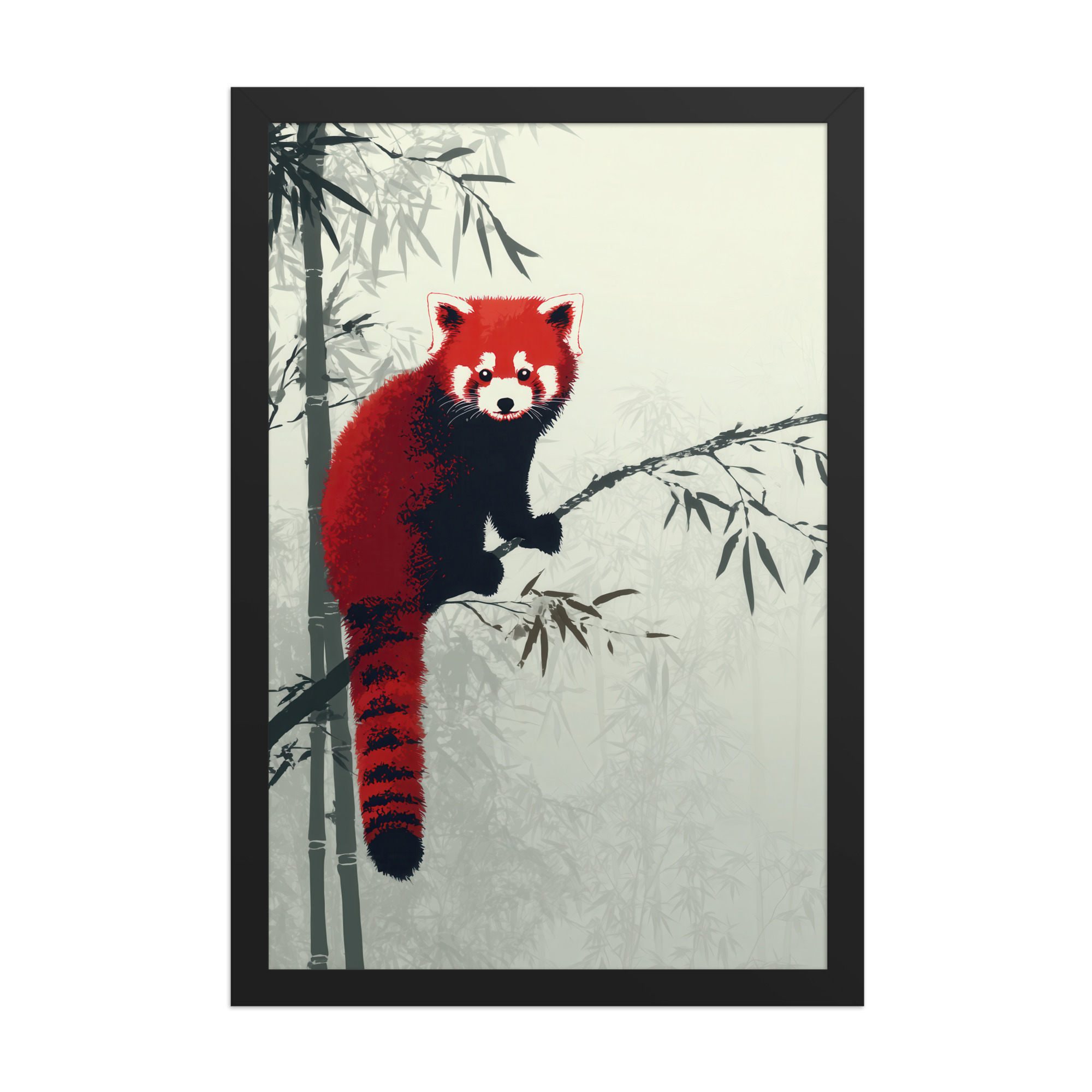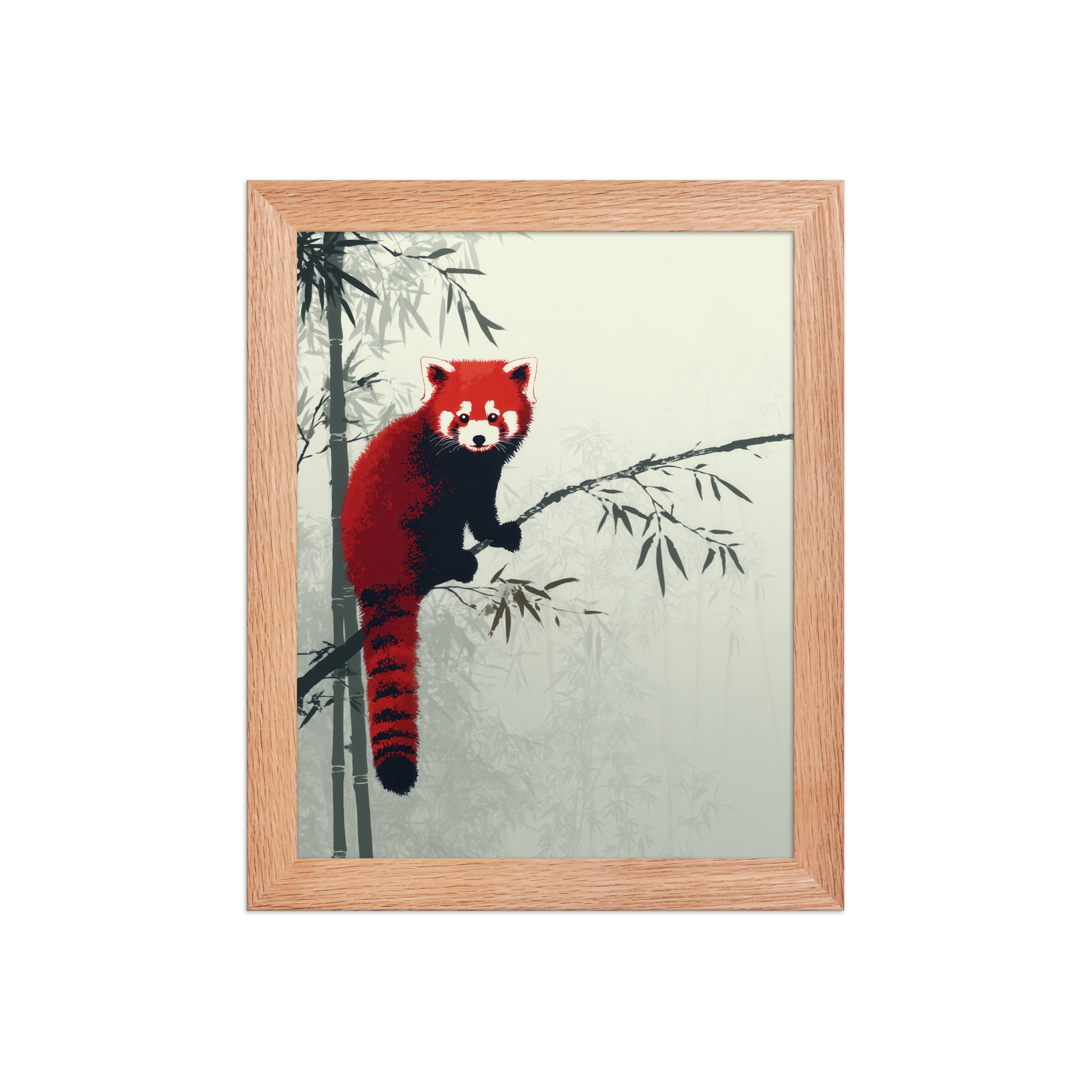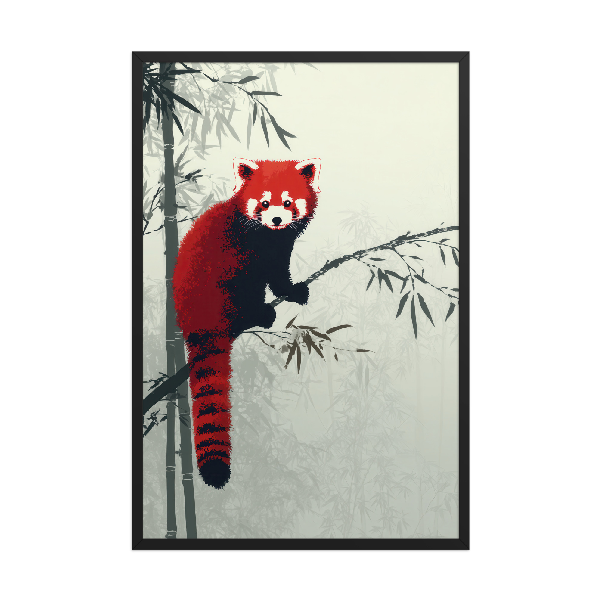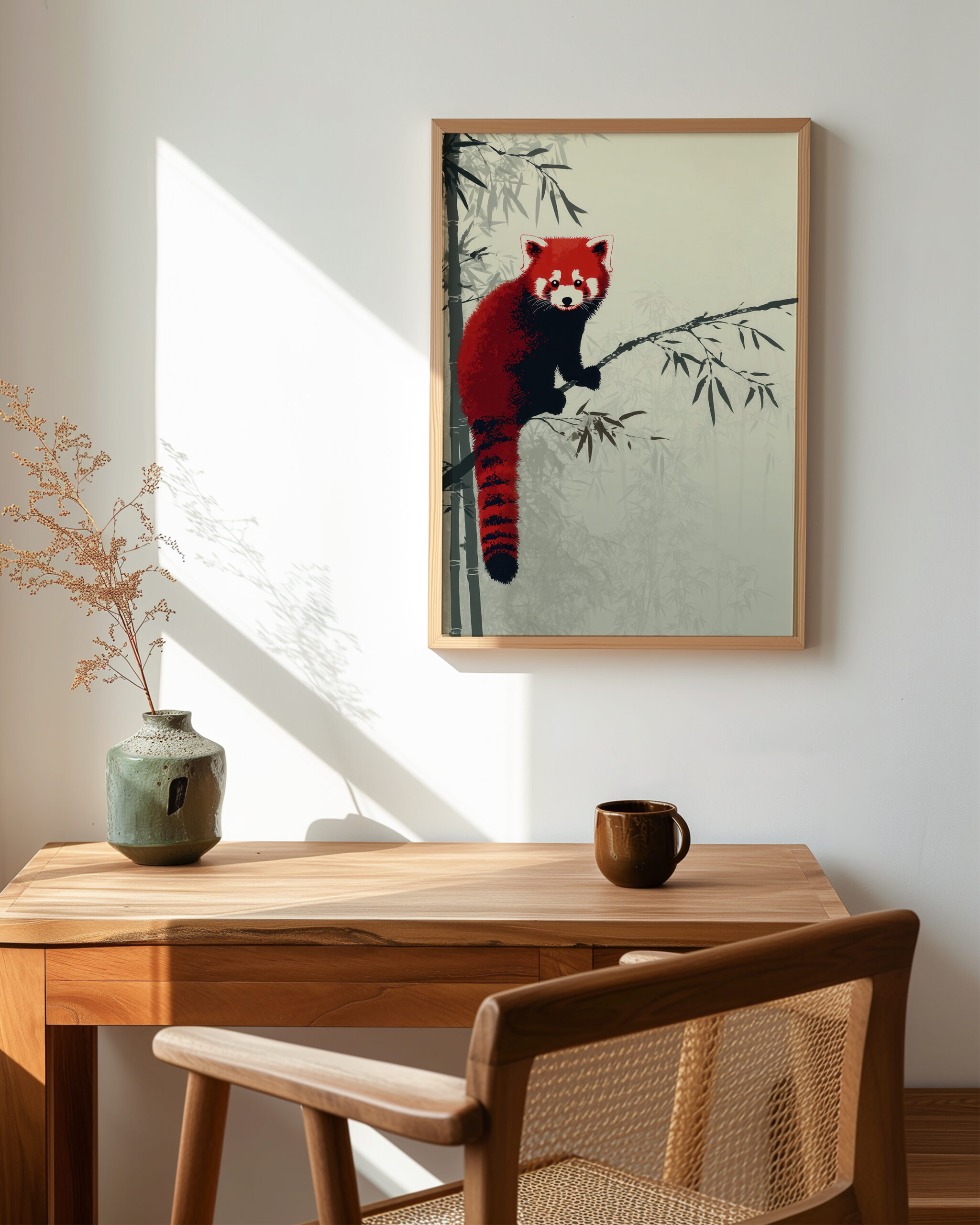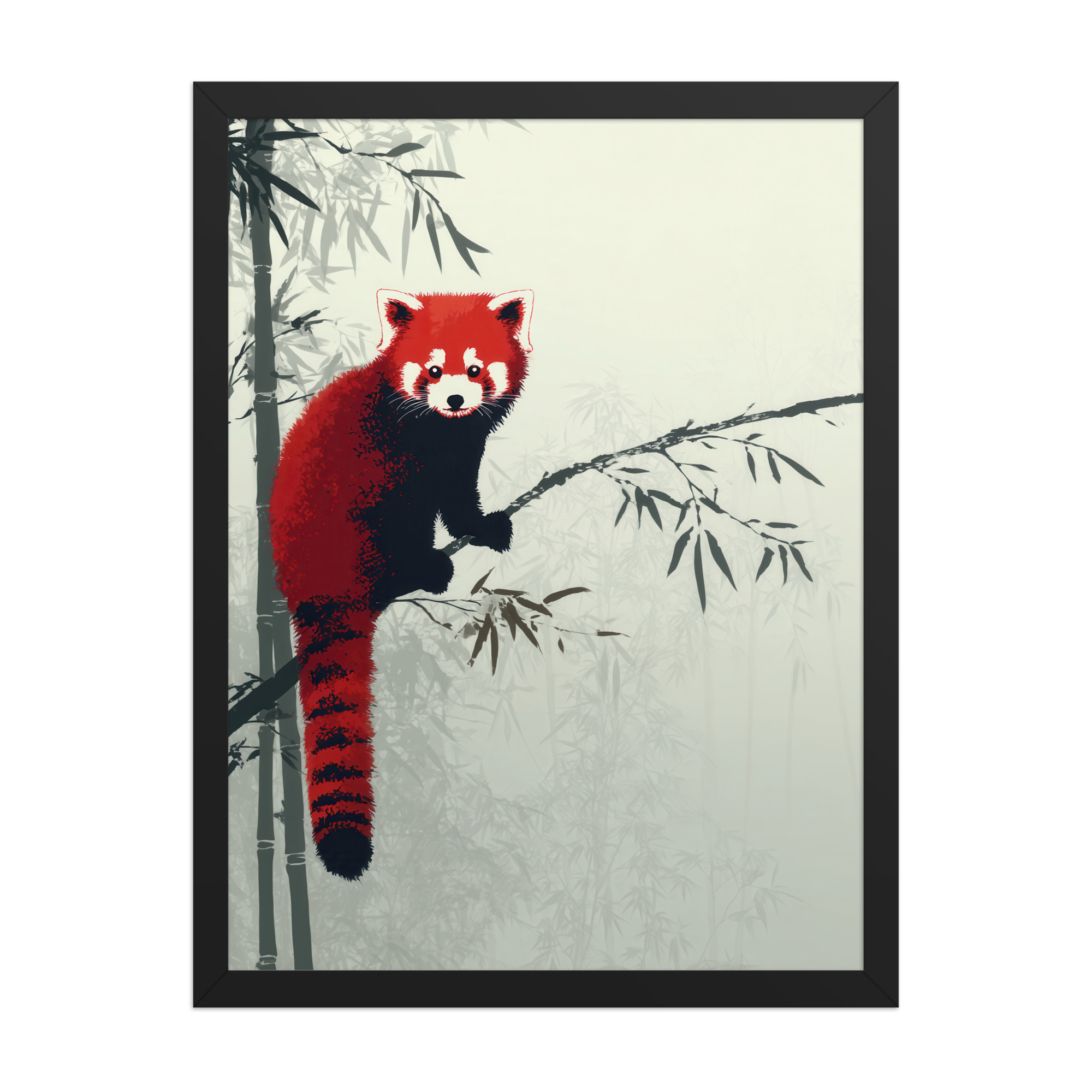 In a tranquil bamboo grove, a red panda pauses on a slender branch. The palette balances deep cinnabar fur with charcoal accents and layered sage washes, delivering Japandi calm with a playful focal point that suits living rooms, nurseries, and reading nooks.