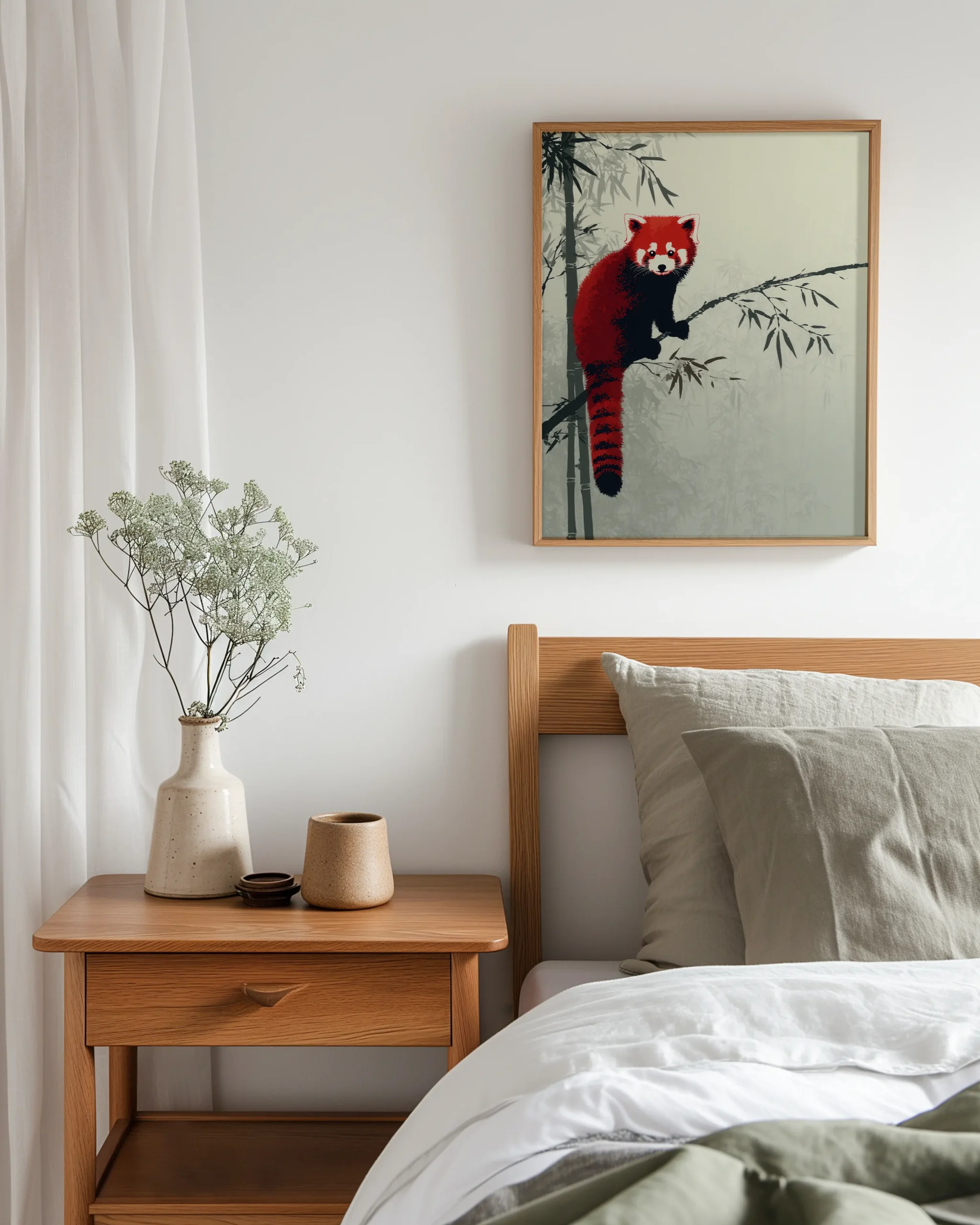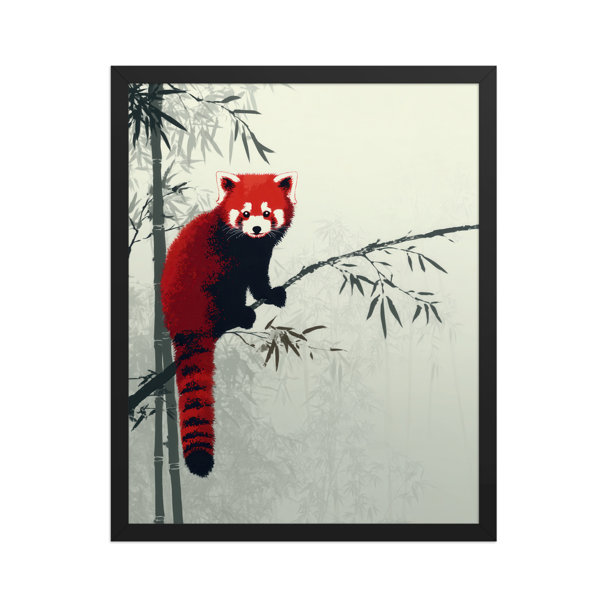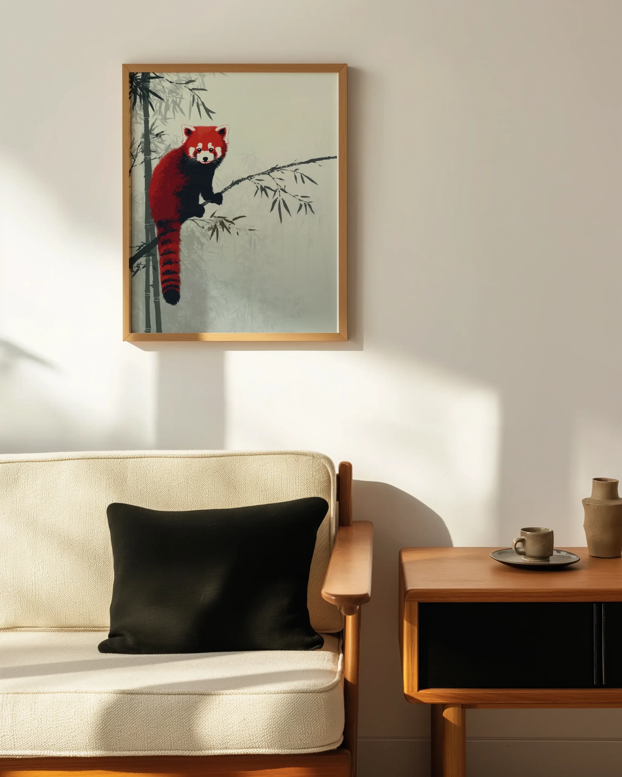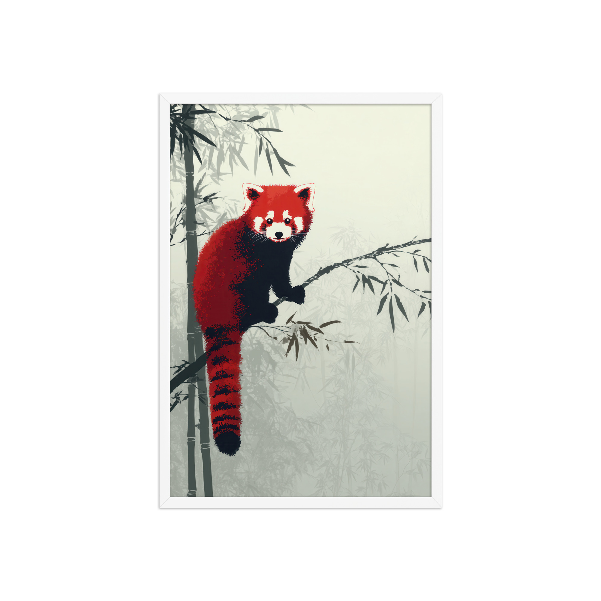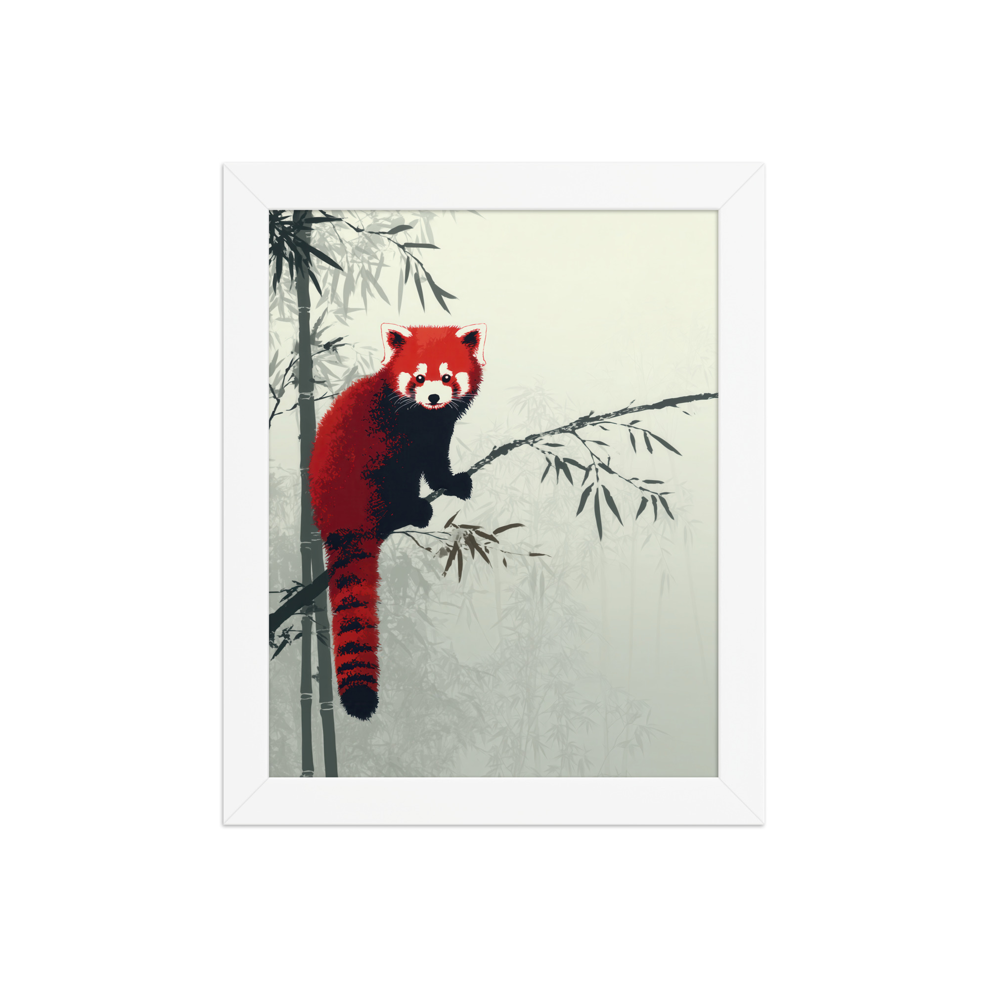 In a tranquil bamboo grove, a red panda pauses on a slender branch. The palette balances deep cinnabar fur with charcoal accents and layered sage washes, delivering Japandi calm with a playful focal point that suits living rooms, nurseries, and reading nooks.