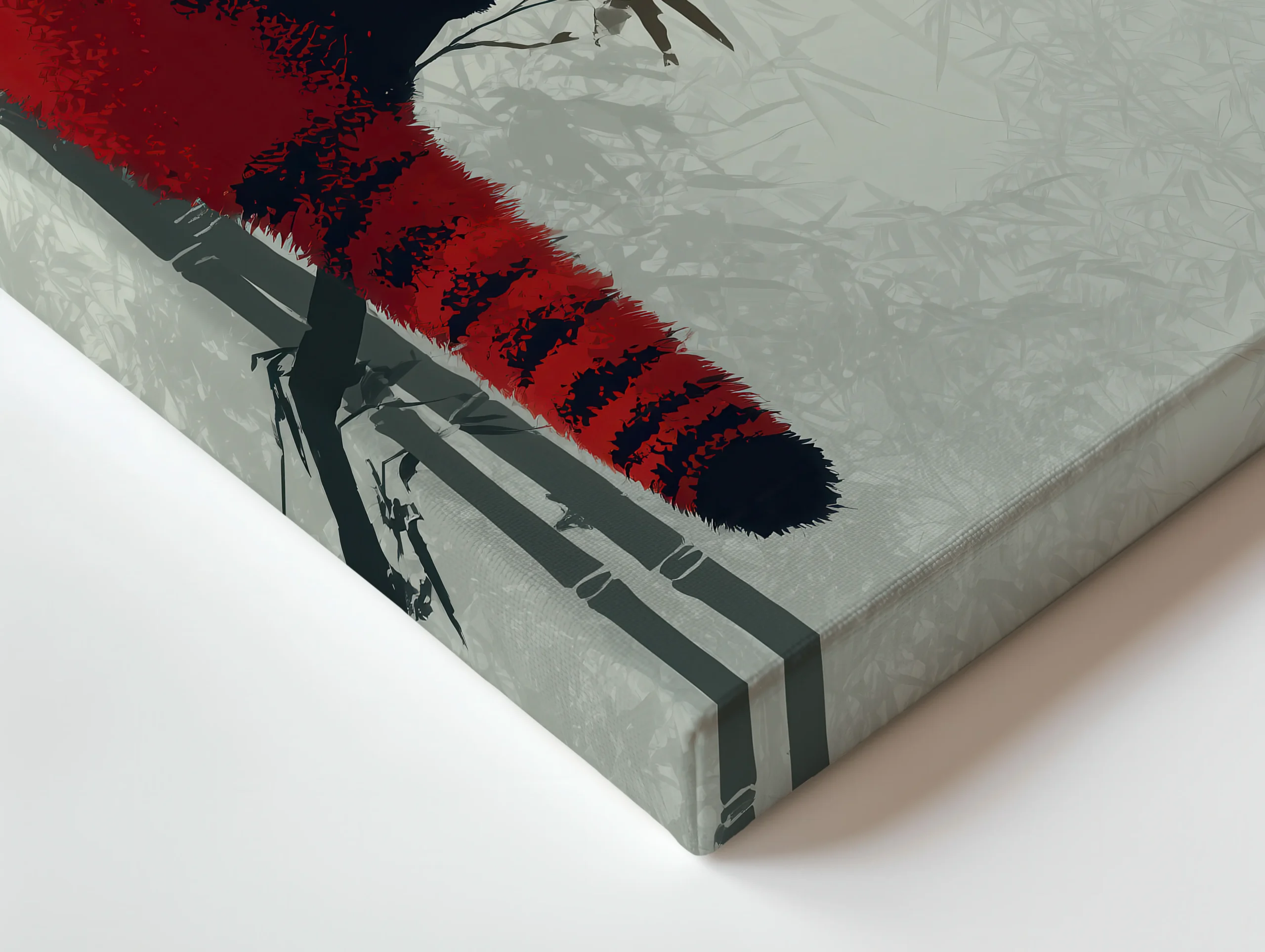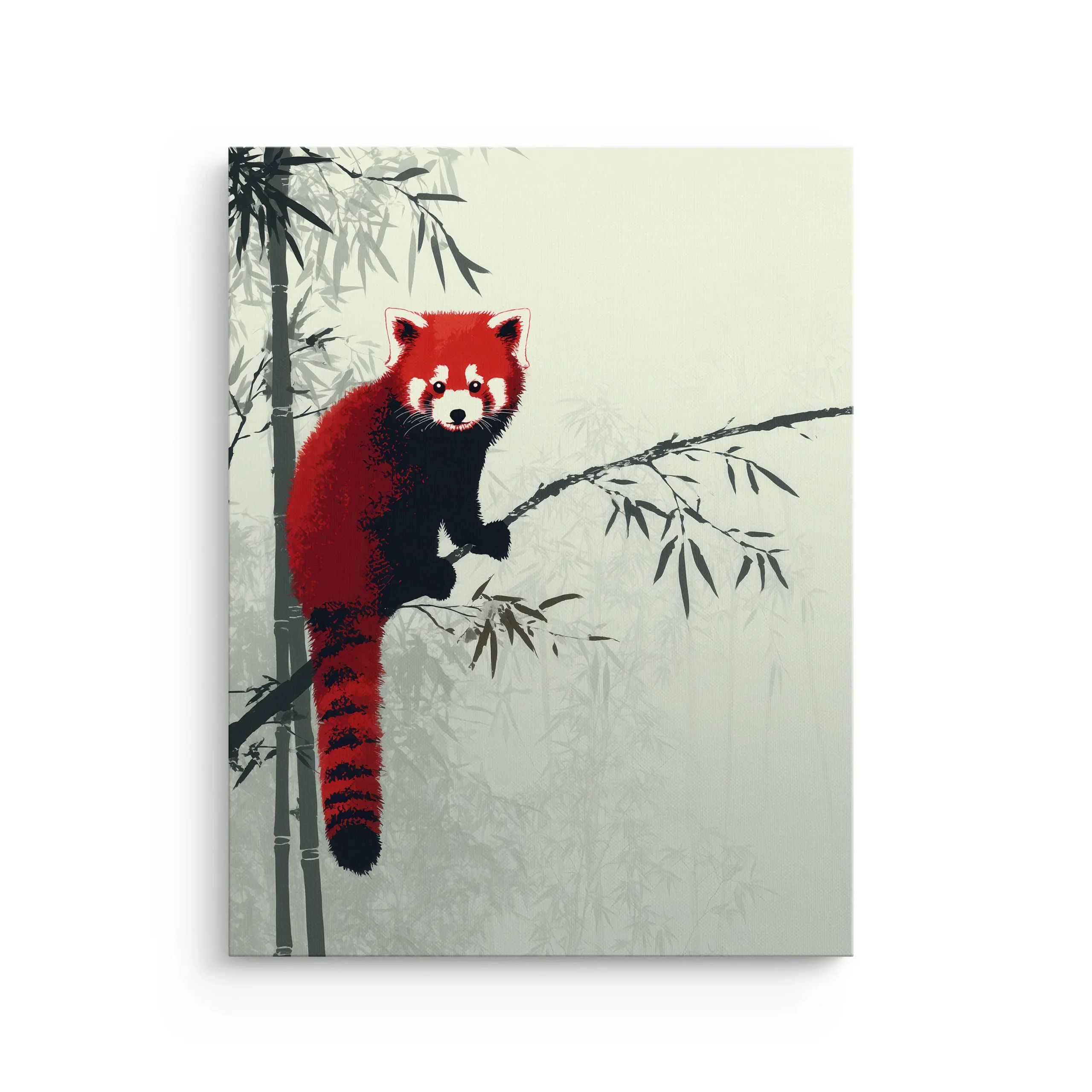 A bright red panda perches quietly on a bamboo branch as soft fog and layered silhouettes fade into the background. The contrast of bold color and Japanese ink-wash simplicity creates a calm, modern focal point.