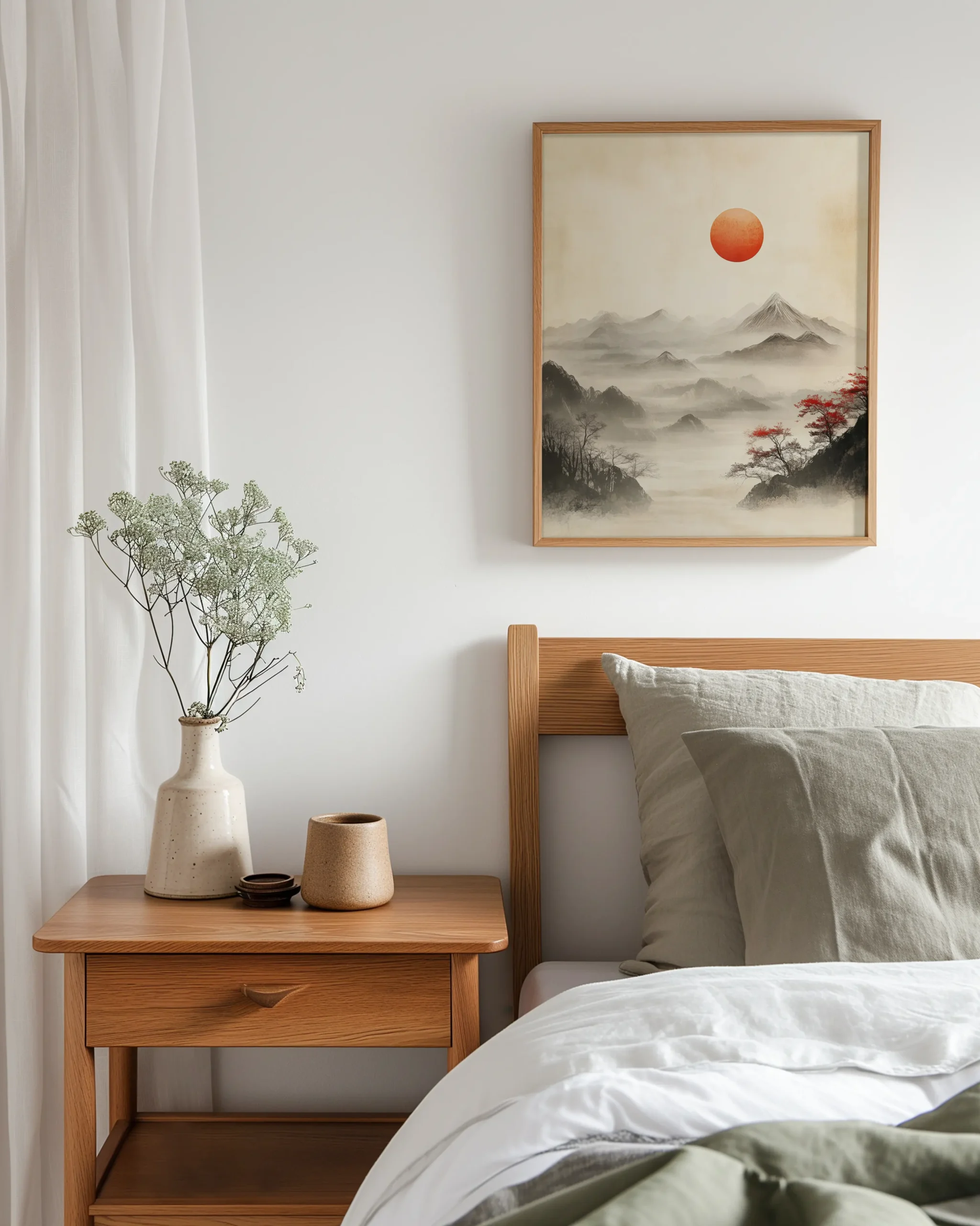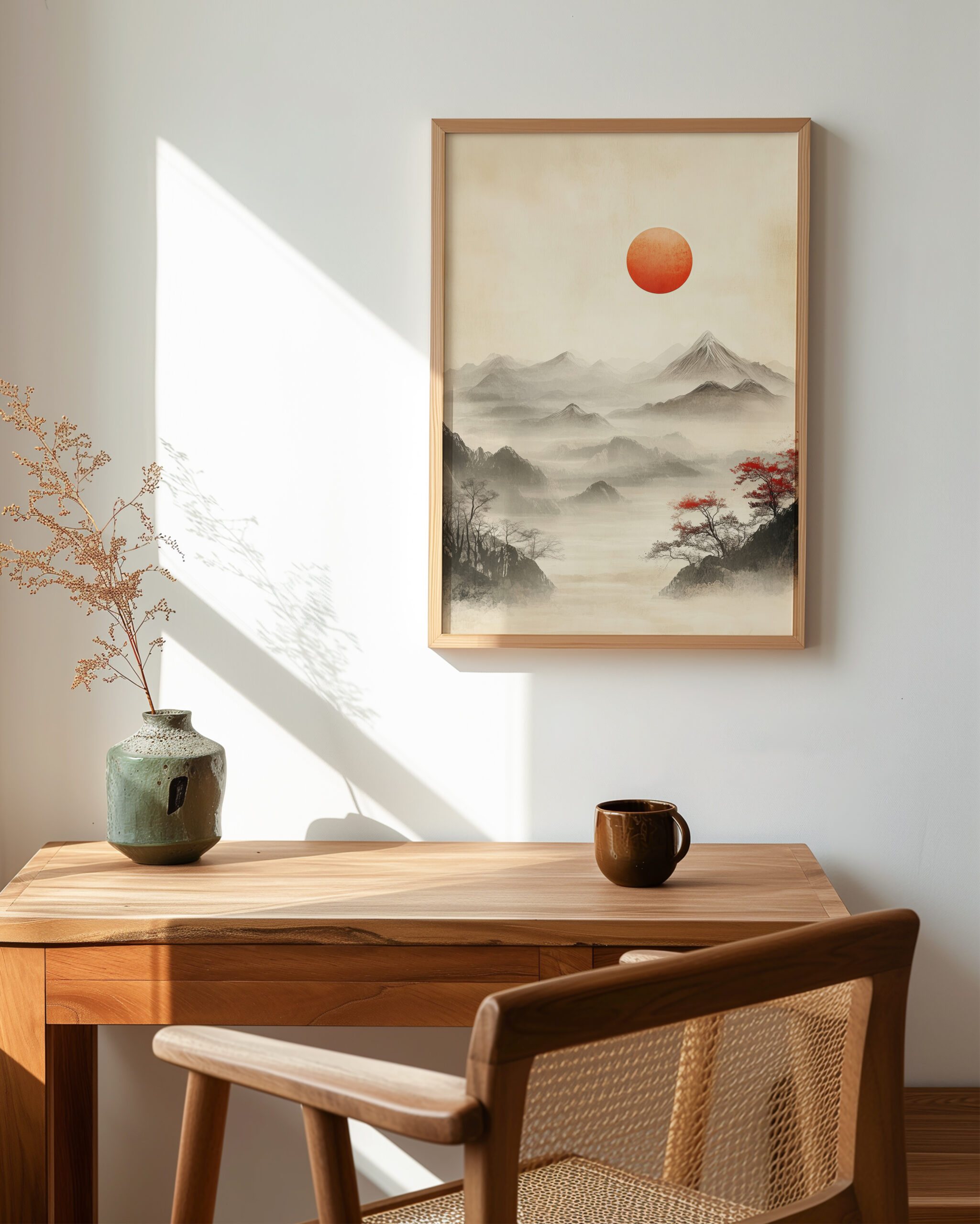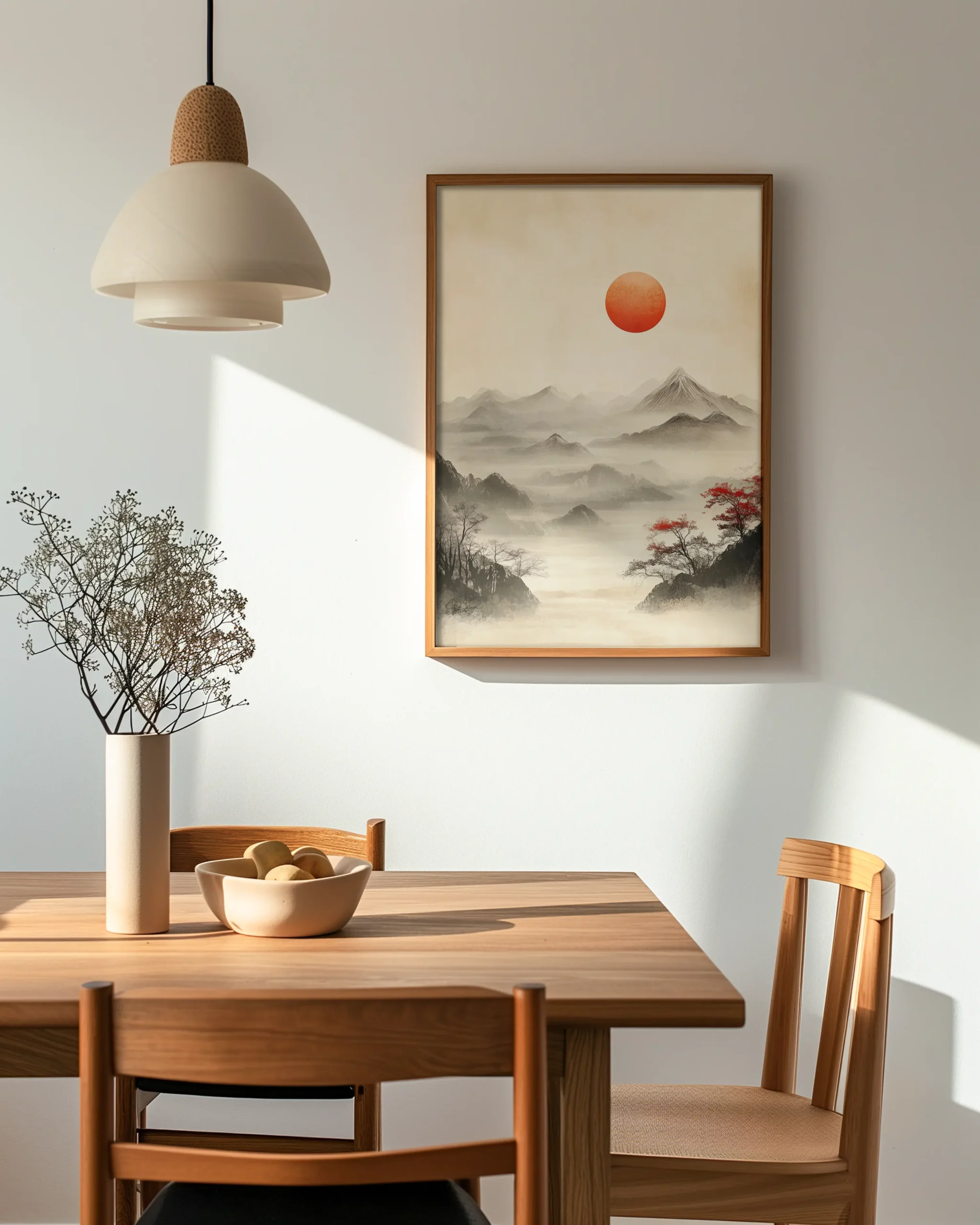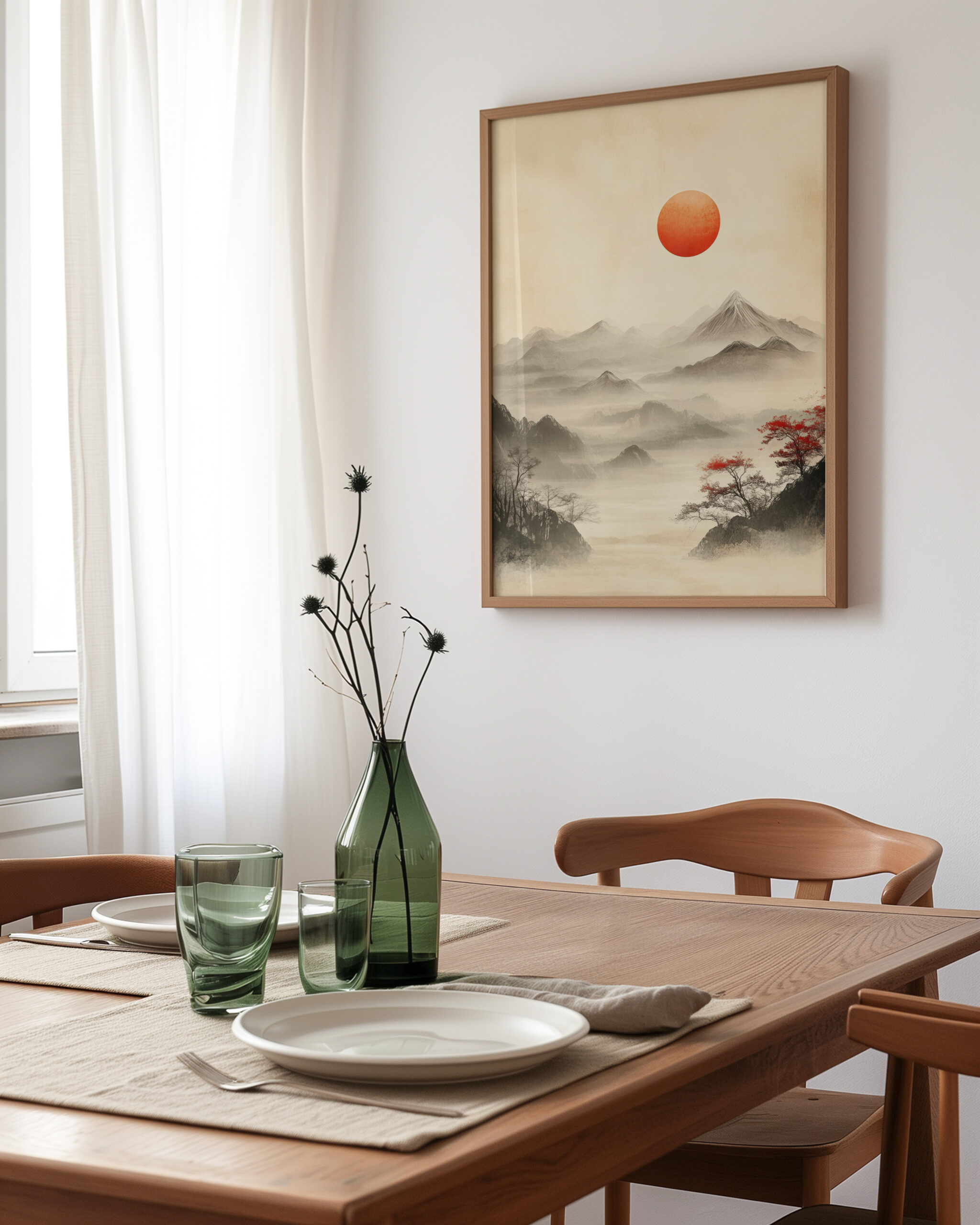 Soft ink washes layer silent peaks while a vermilion sun anchors the sky. Sparse trees and drifting fog create a contemplative Japanese mood that brings calm presence to modern Japandi interiors.