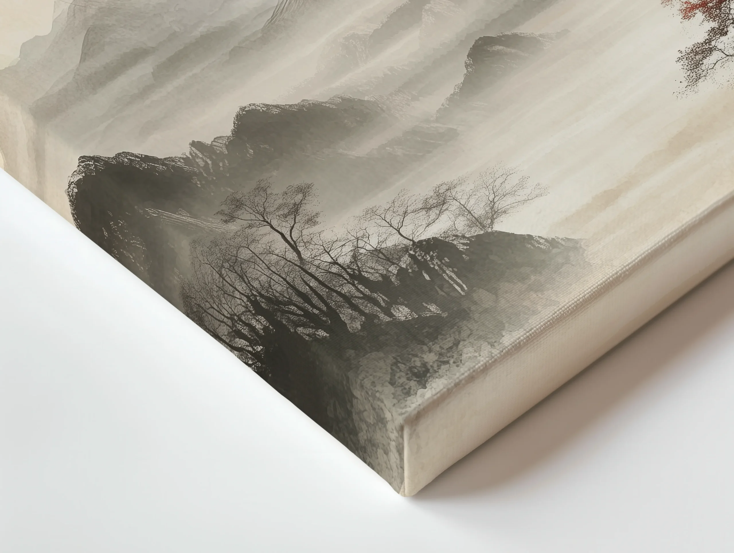 Misty ink-wash mountains fade into soft fog beneath a bold red sun, creating a calm Japandi statement on premium thin canvas for modern minimal spaces.