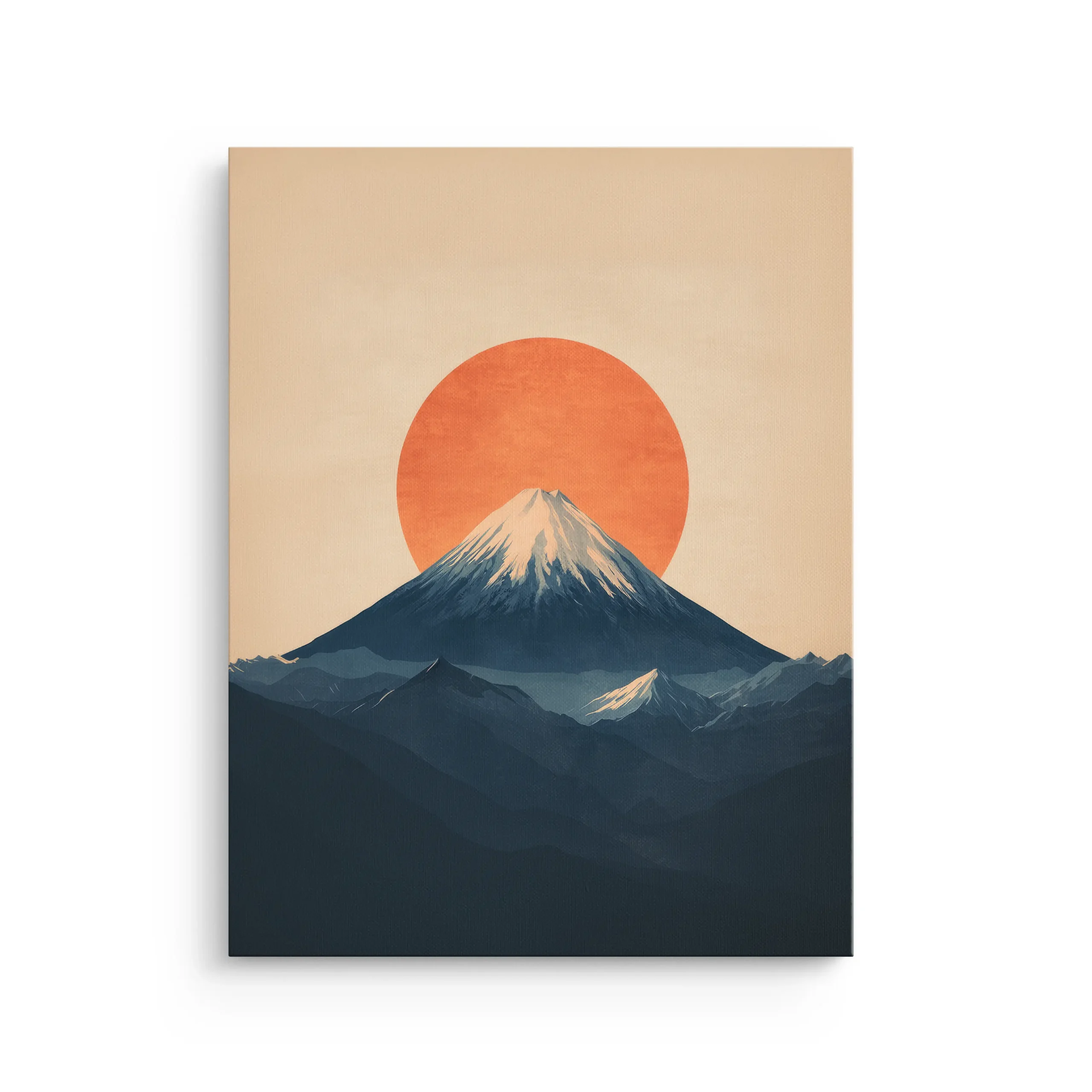 A calm Mount Fuji silhouette sits beneath a glowing red sun, blending warm sky tones with deep blue mountain layers for a modern Japandi statement.
