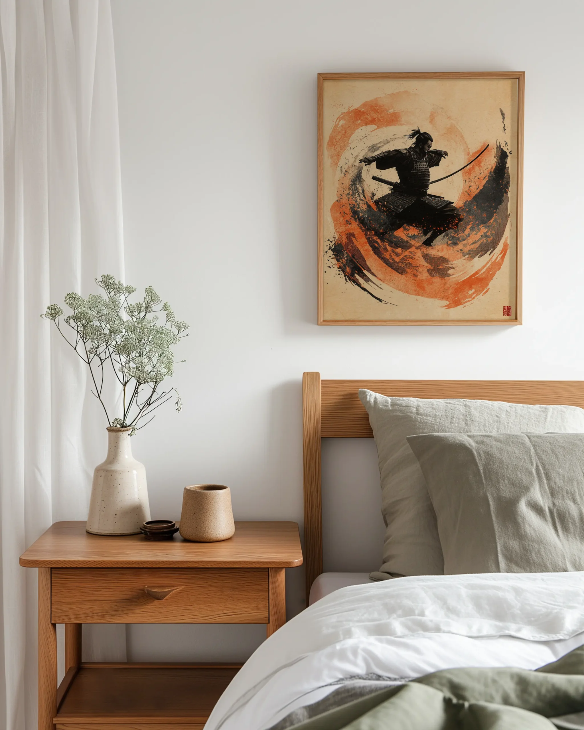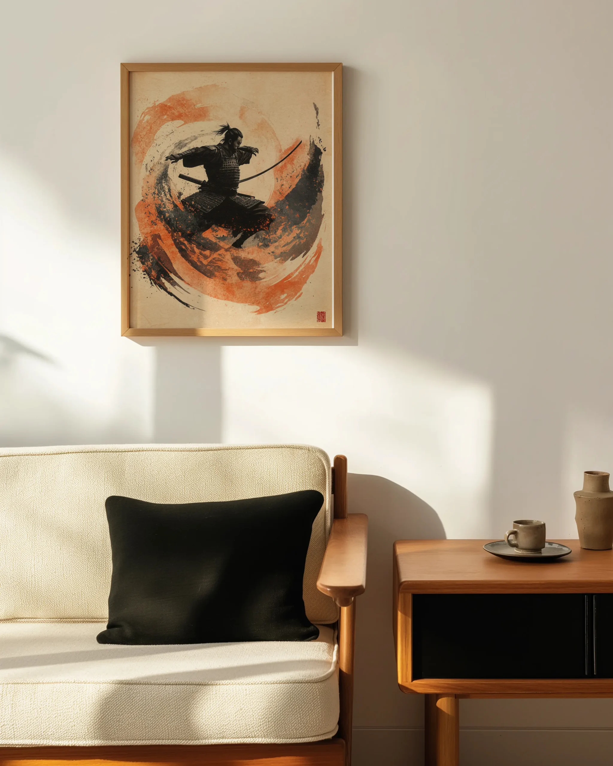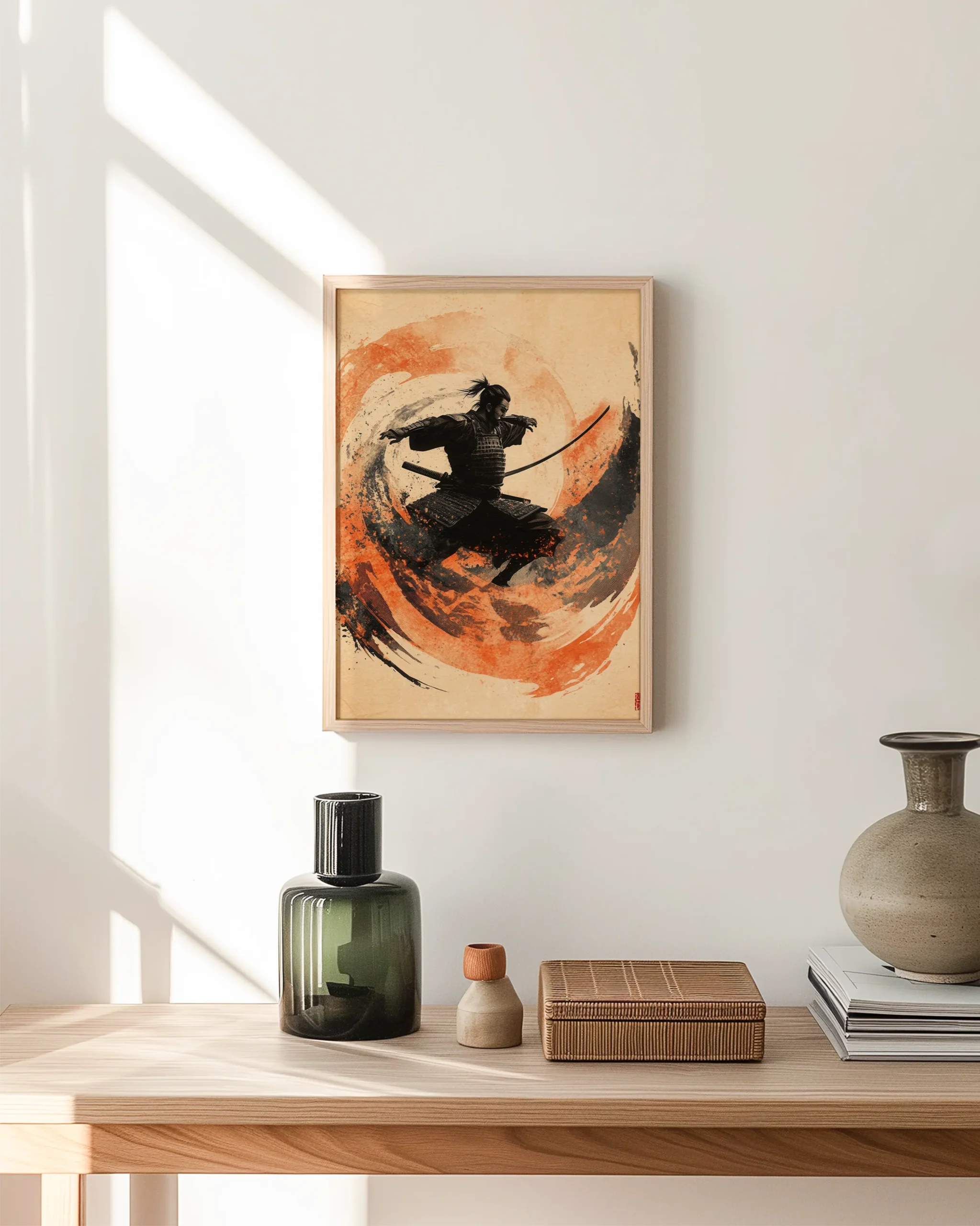 Dynamic sumi-e composition of a leaping samurai carved from bold black ink and vermilion brush-stroke motion—an energizing Japandi statement for living rooms, studios, and entryways; printed on museum-quality enhanced matte paper. Framed and ready to hang with your preferred frame (Black, White, or Red Oak).