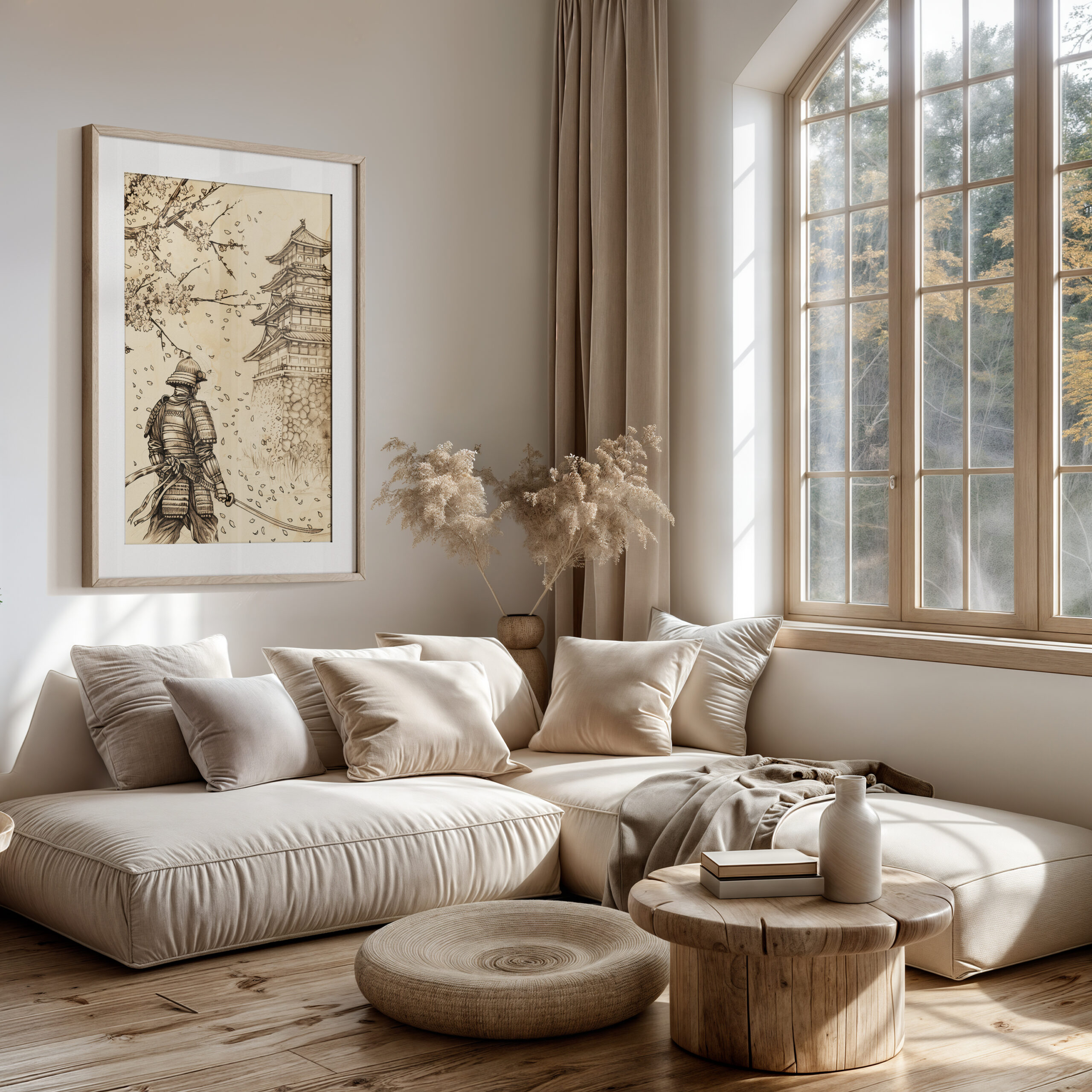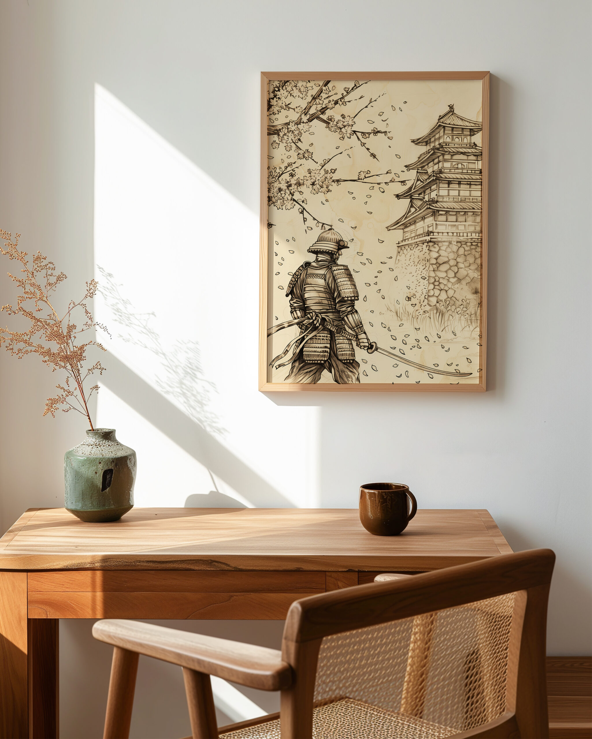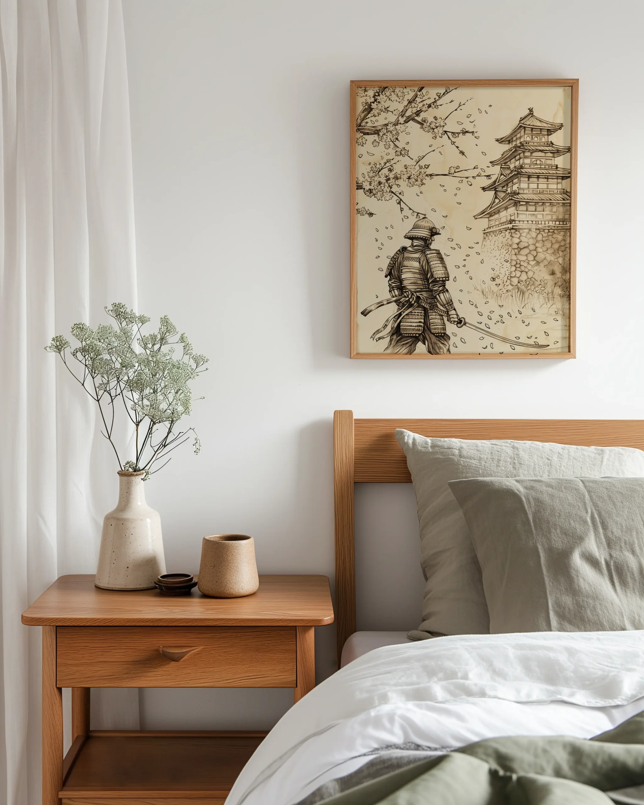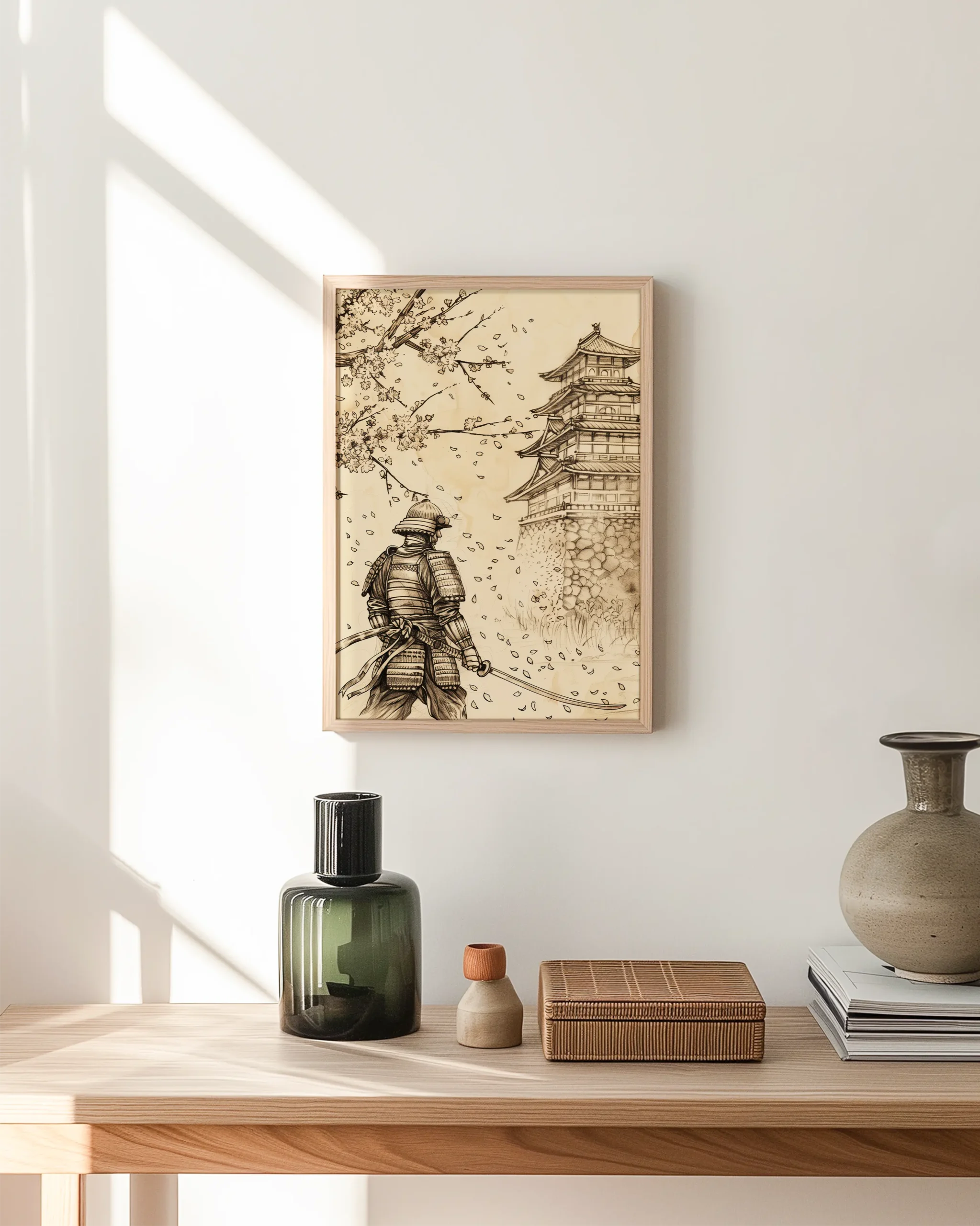 - Delicate blossom details balanced by bold samurai silhouette for a gallery-worthy focal point.