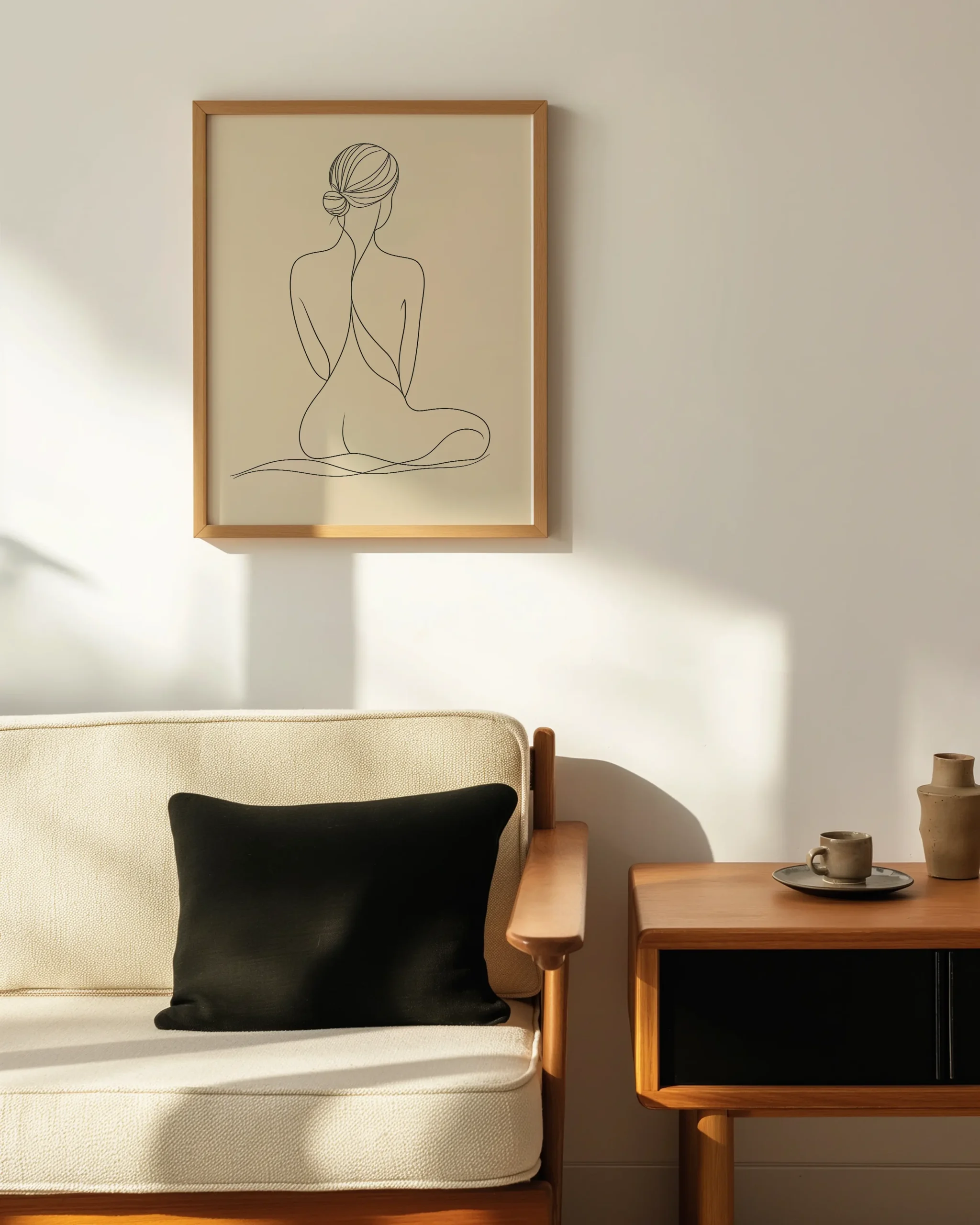 A continuous line sketches a woman seated on her knees, back turned and hair in a simple bun, resting within a tranquil neutral ground. The flowing contours feel like a deep breath—quiet, poised, and soothing.