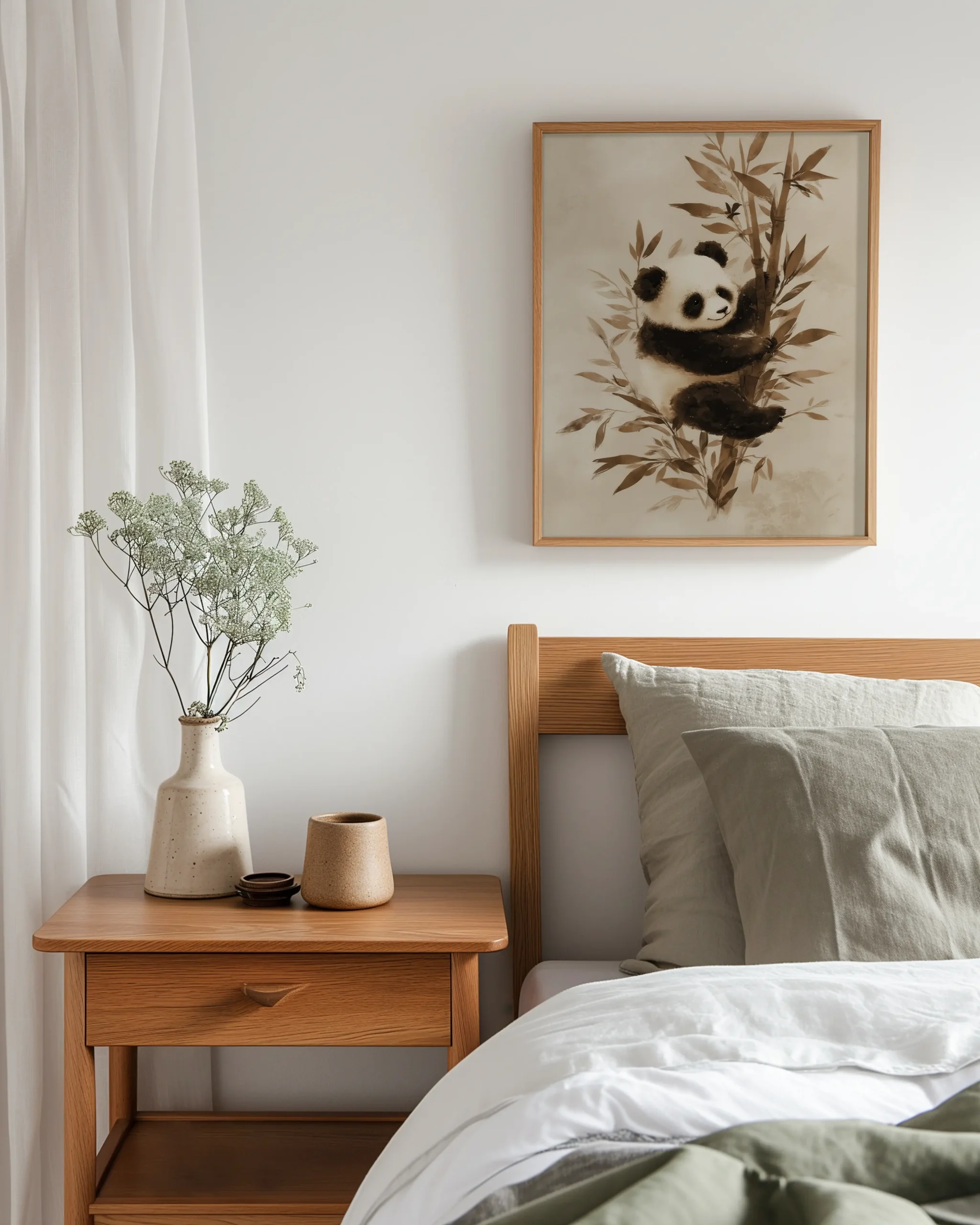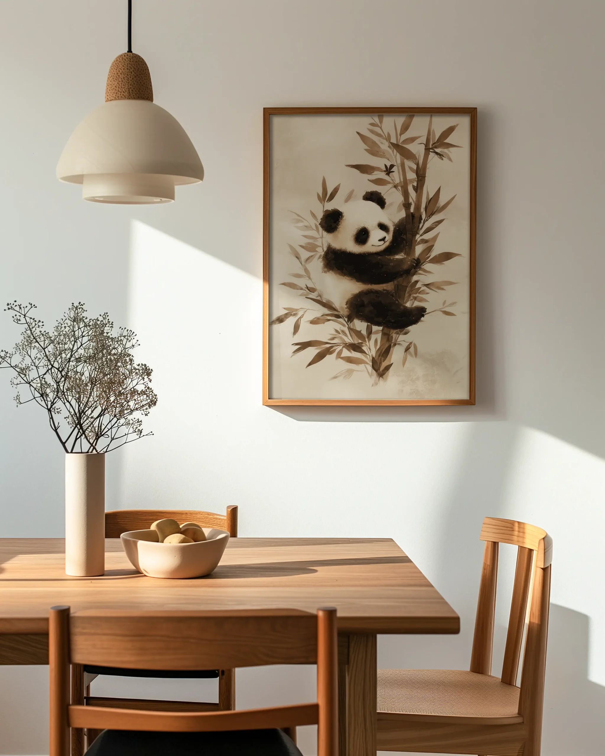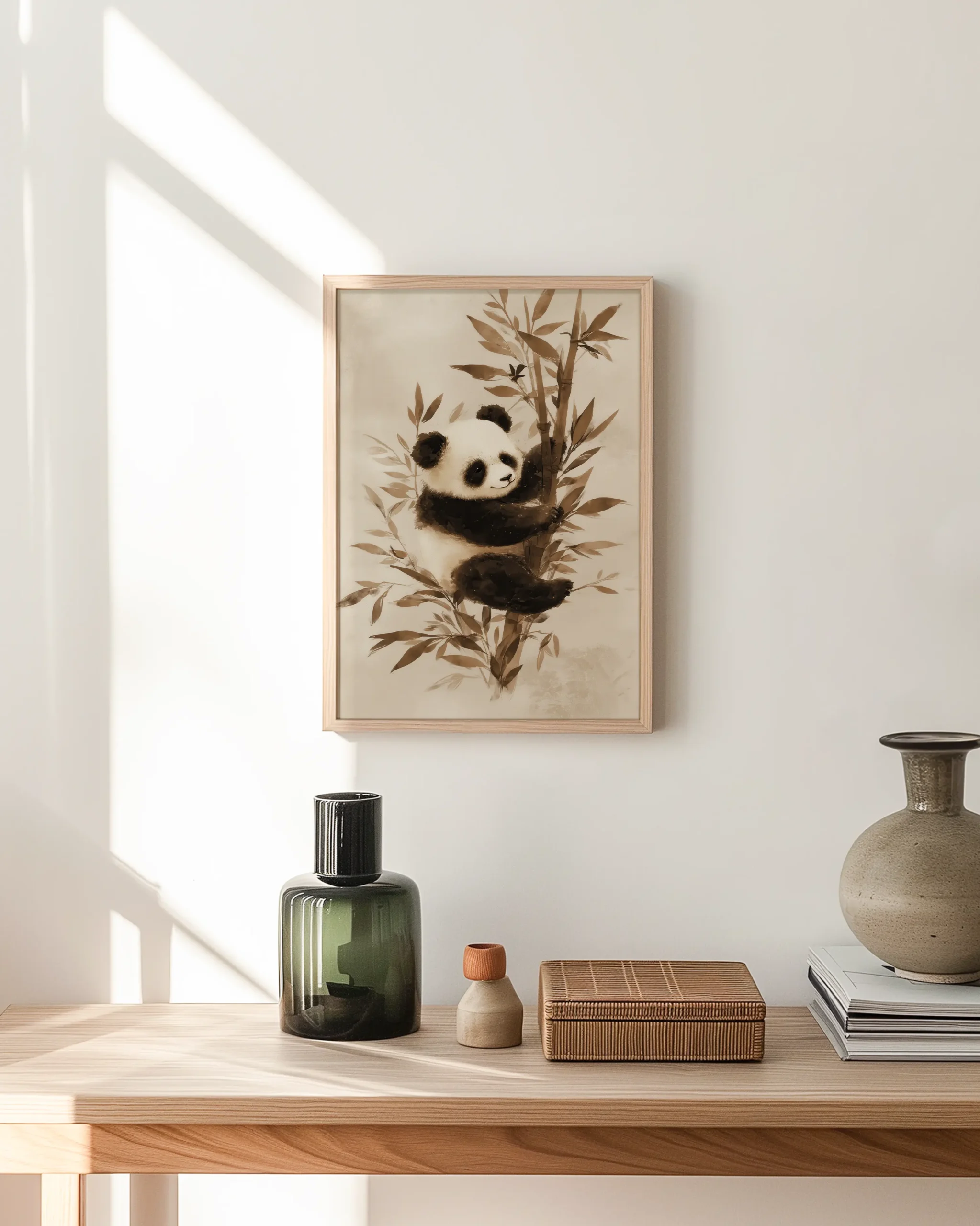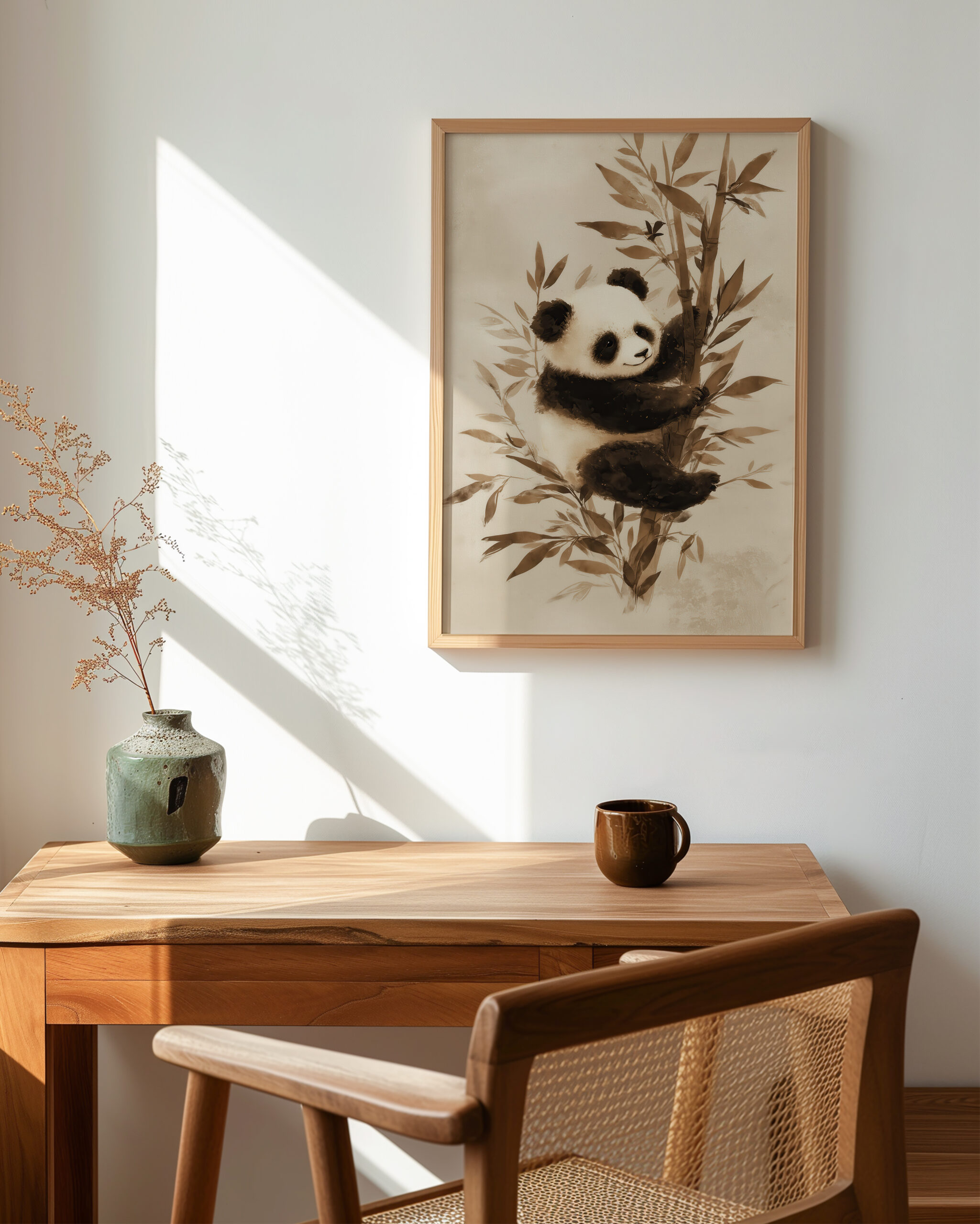 This tranquil portrait captures a panda in a gentle sepia wash, its plush fur and leafy bamboo rendered in soothing neutrals. The minimalist composition brings a warm, serene presence to Japandi and modern interiors alike.