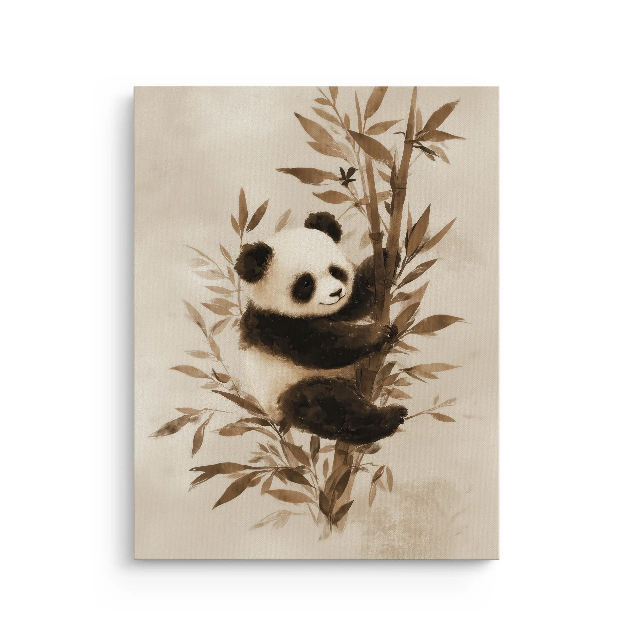 A gentle sepia panda hugs a bamboo stalk in soft ink-wash tones, printed on a premium thin canvas and ready to hang.