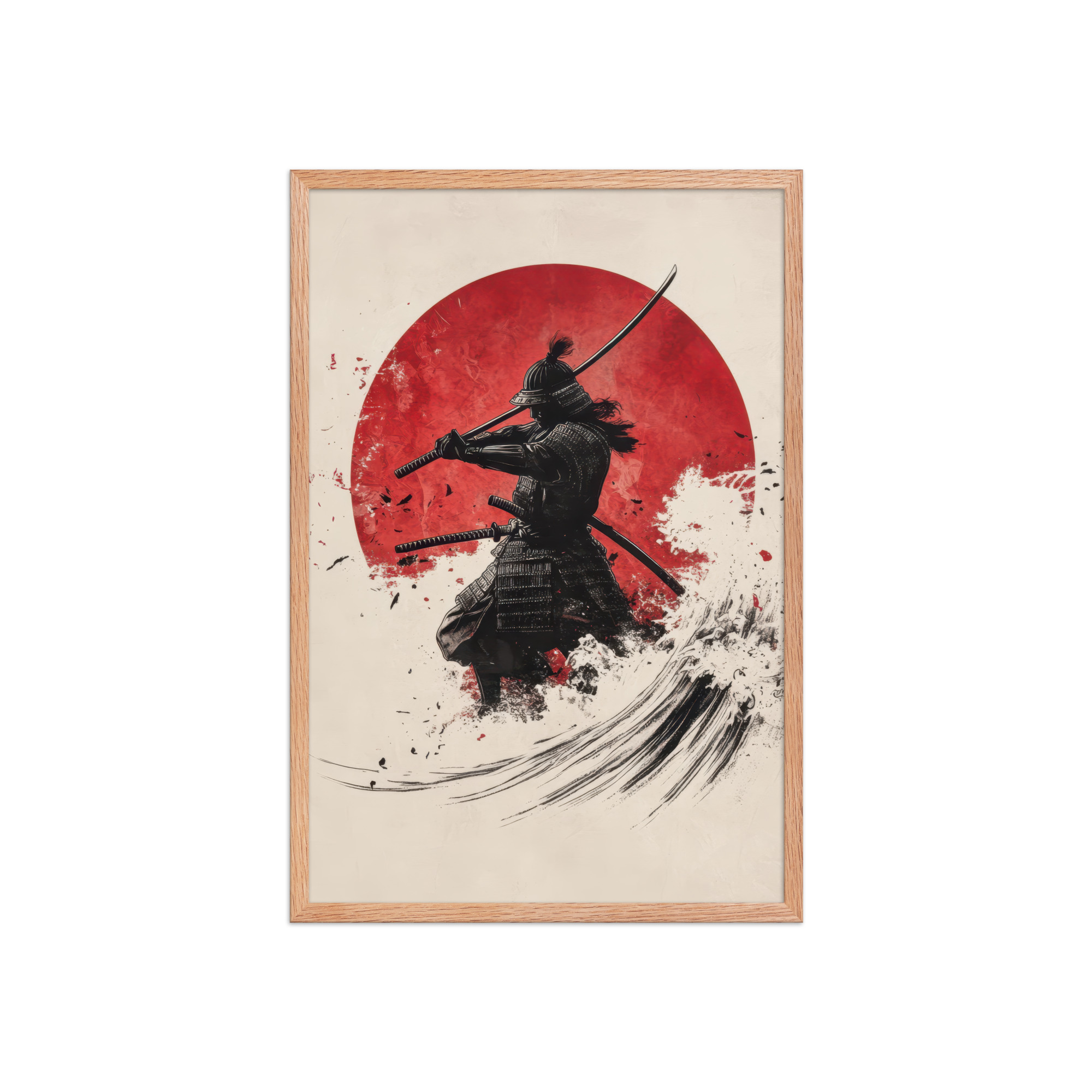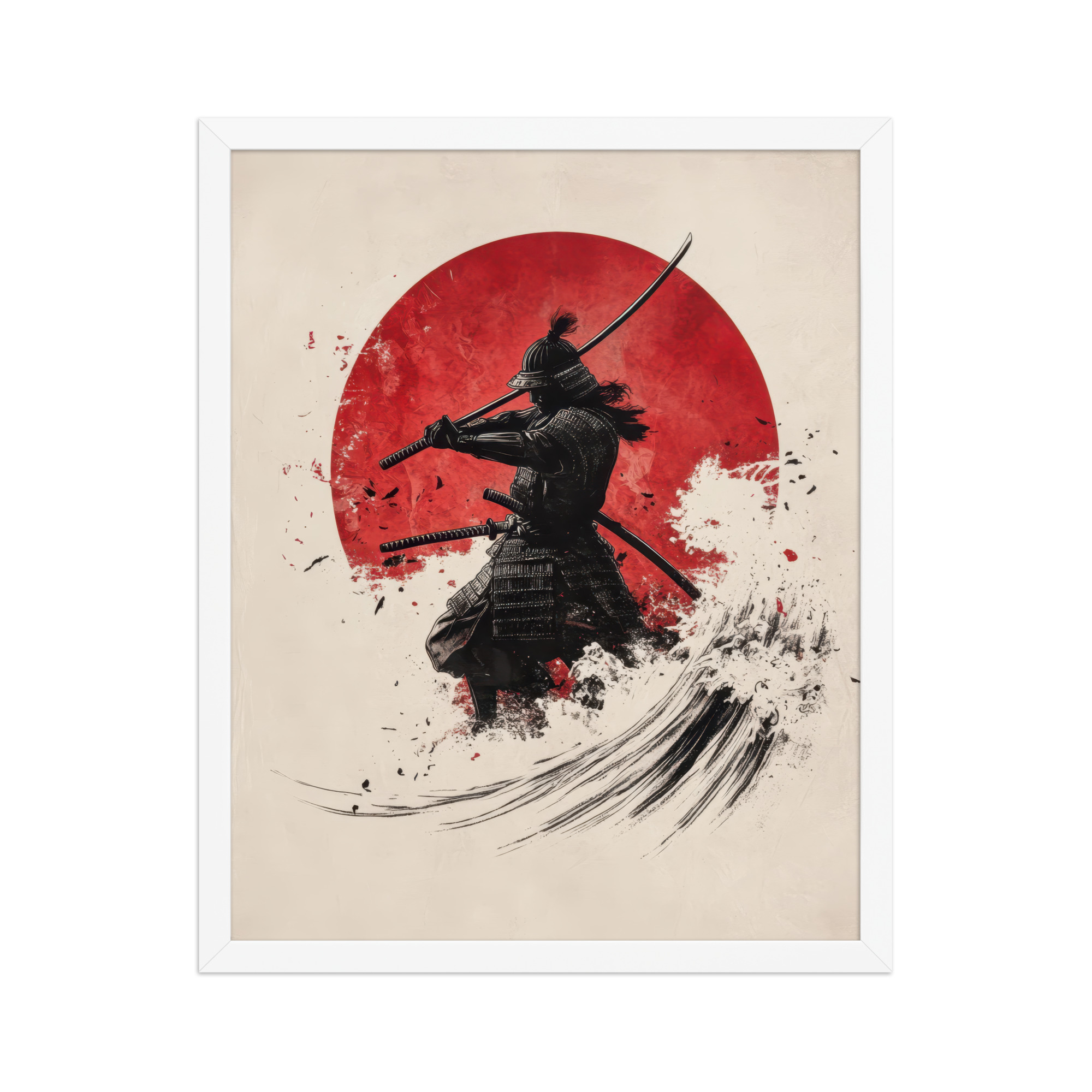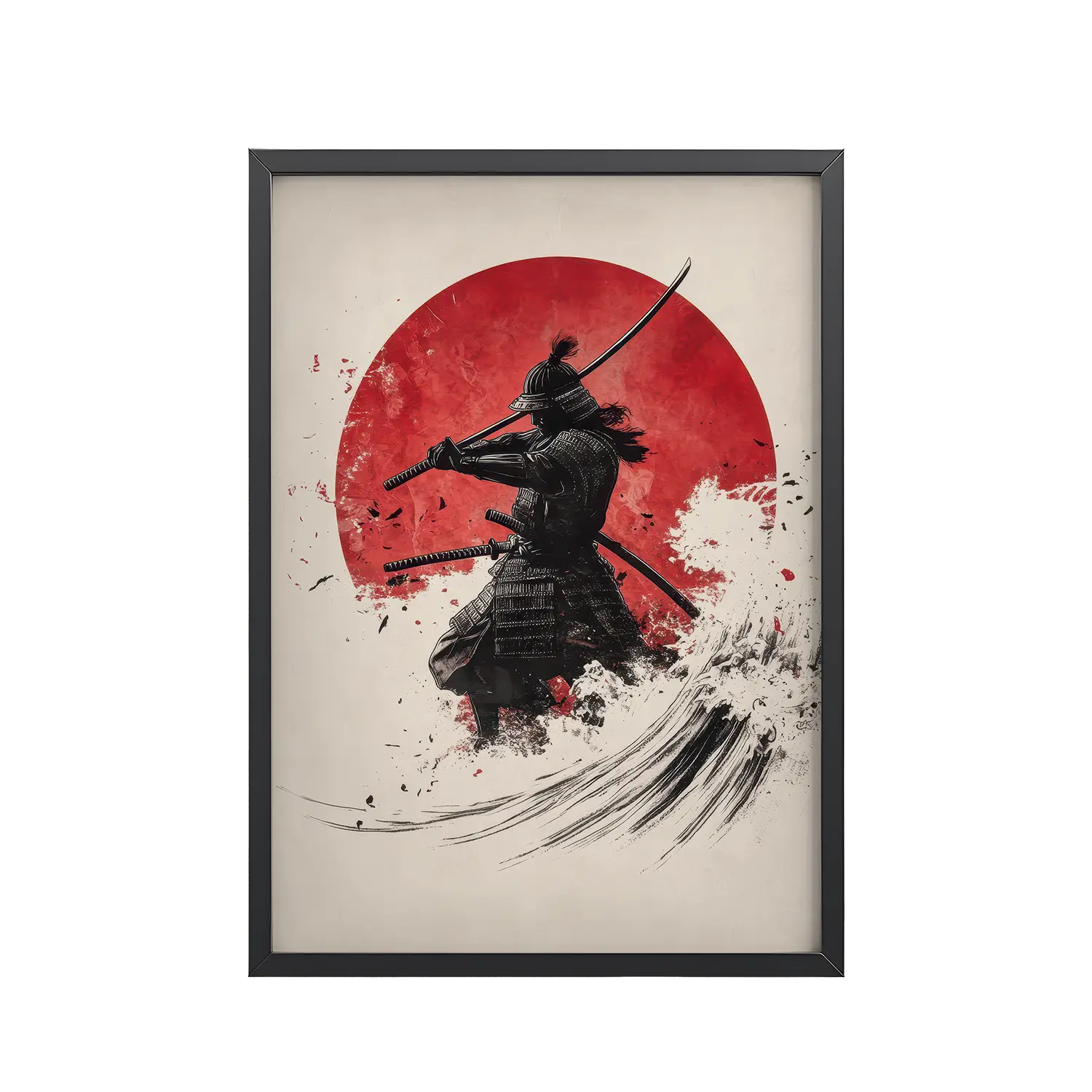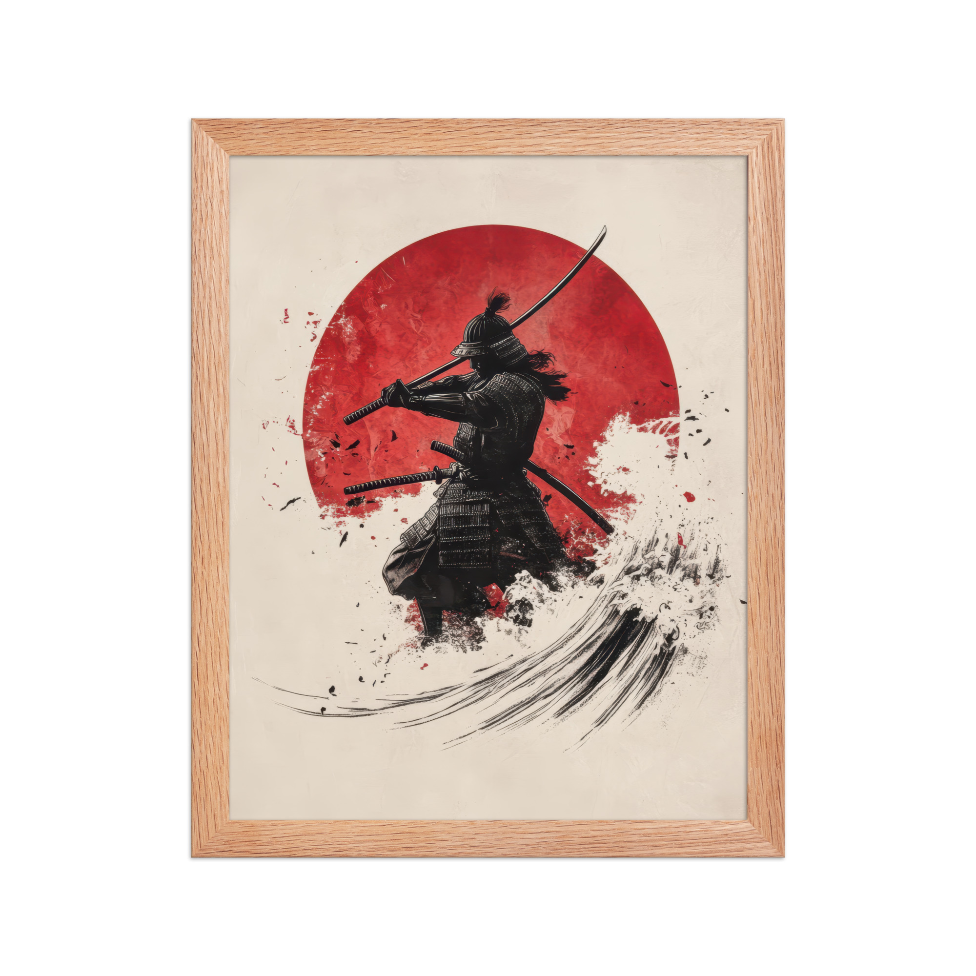 “Silent Watch – Samurai I” captures a warrior in quiet readiness, silhouetted against a rising crimson sun while sumi-e brushwork breaks like spray at his feet. Calm discipline meets raw movement for a timeless statement of strength.