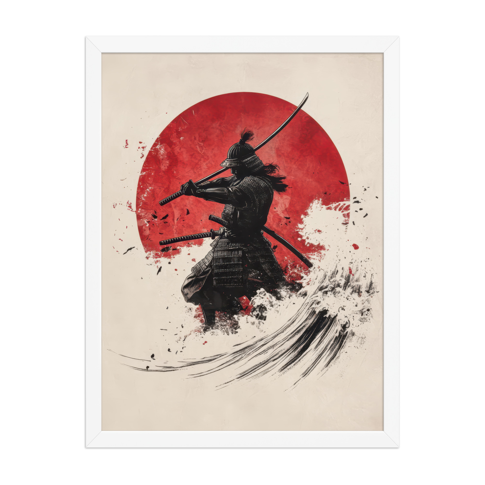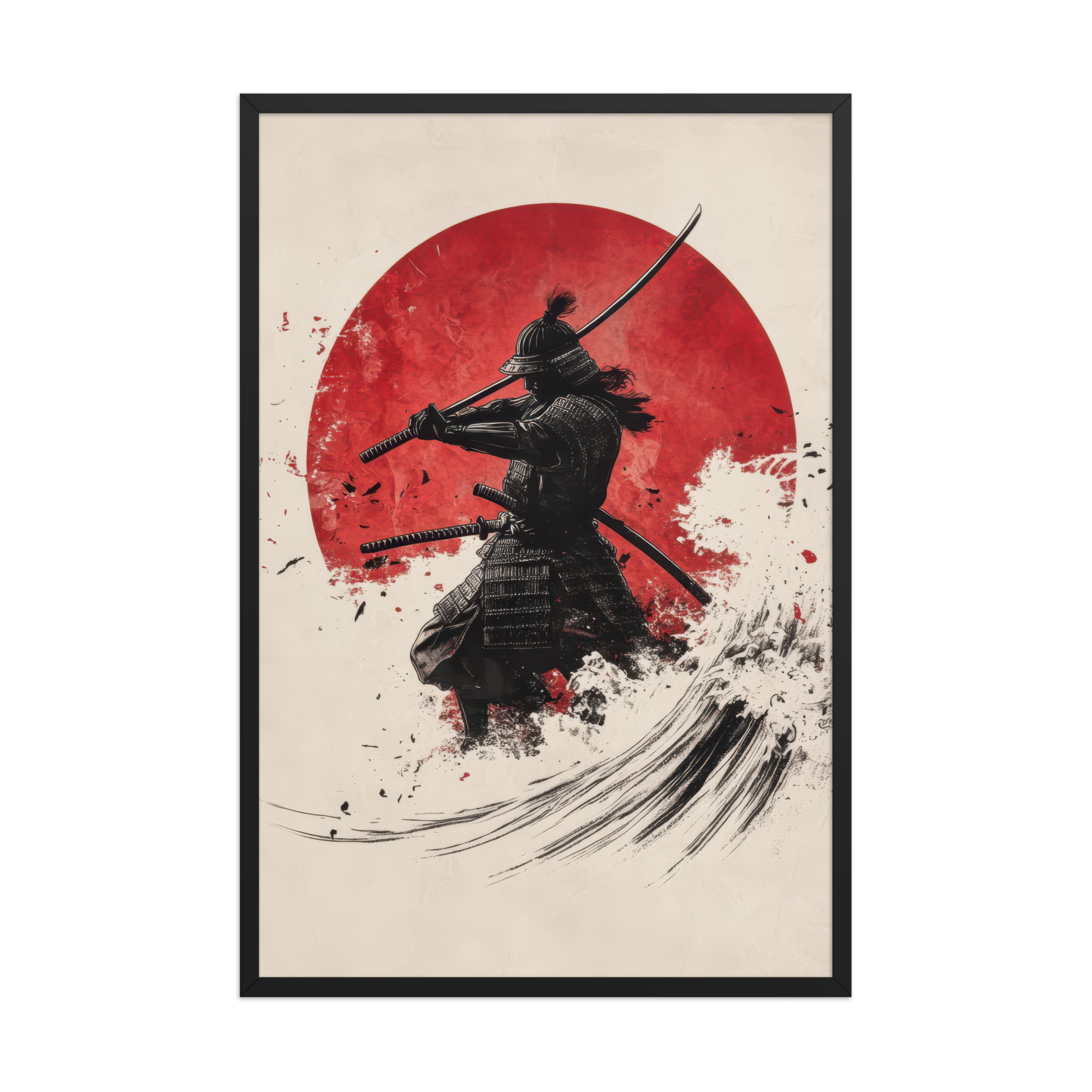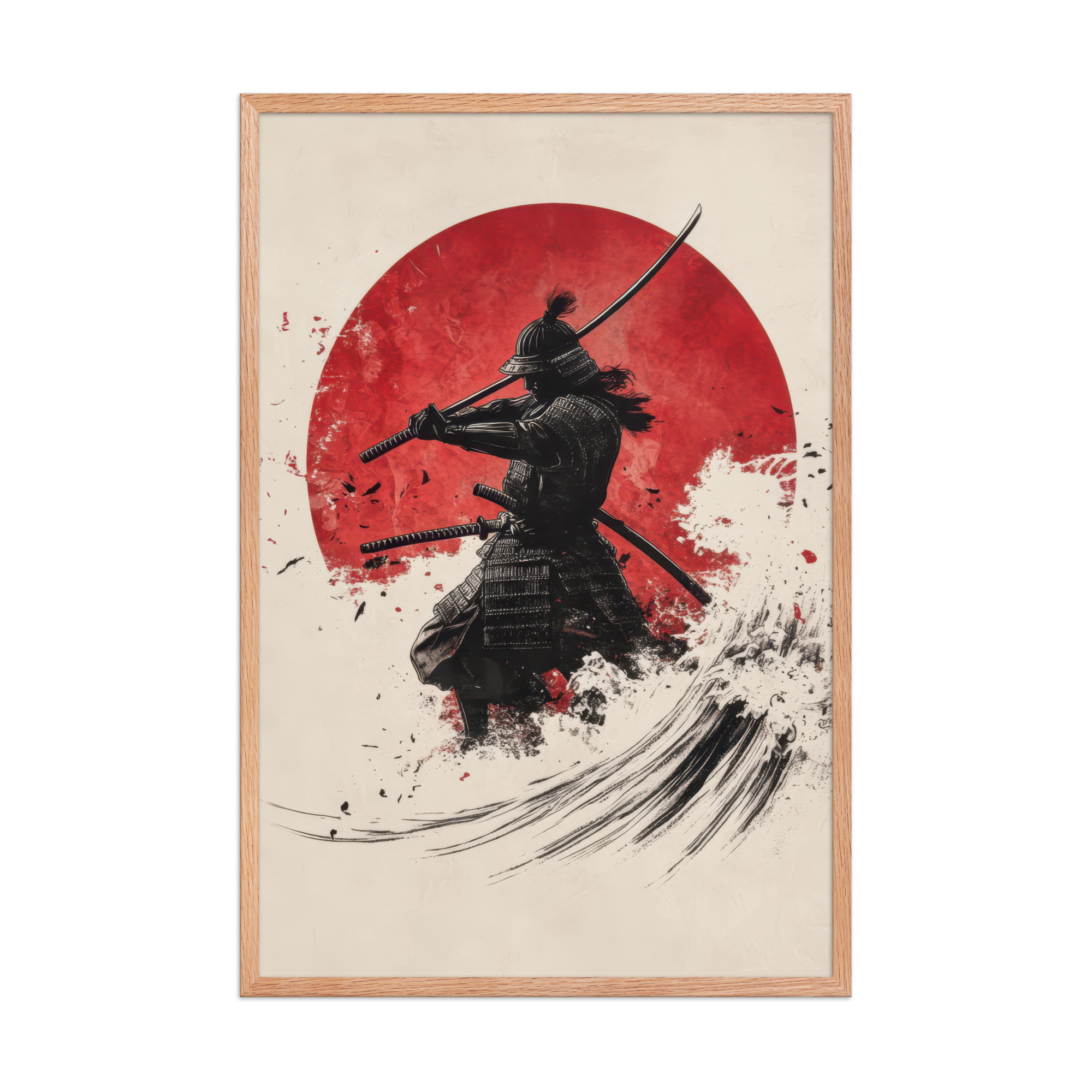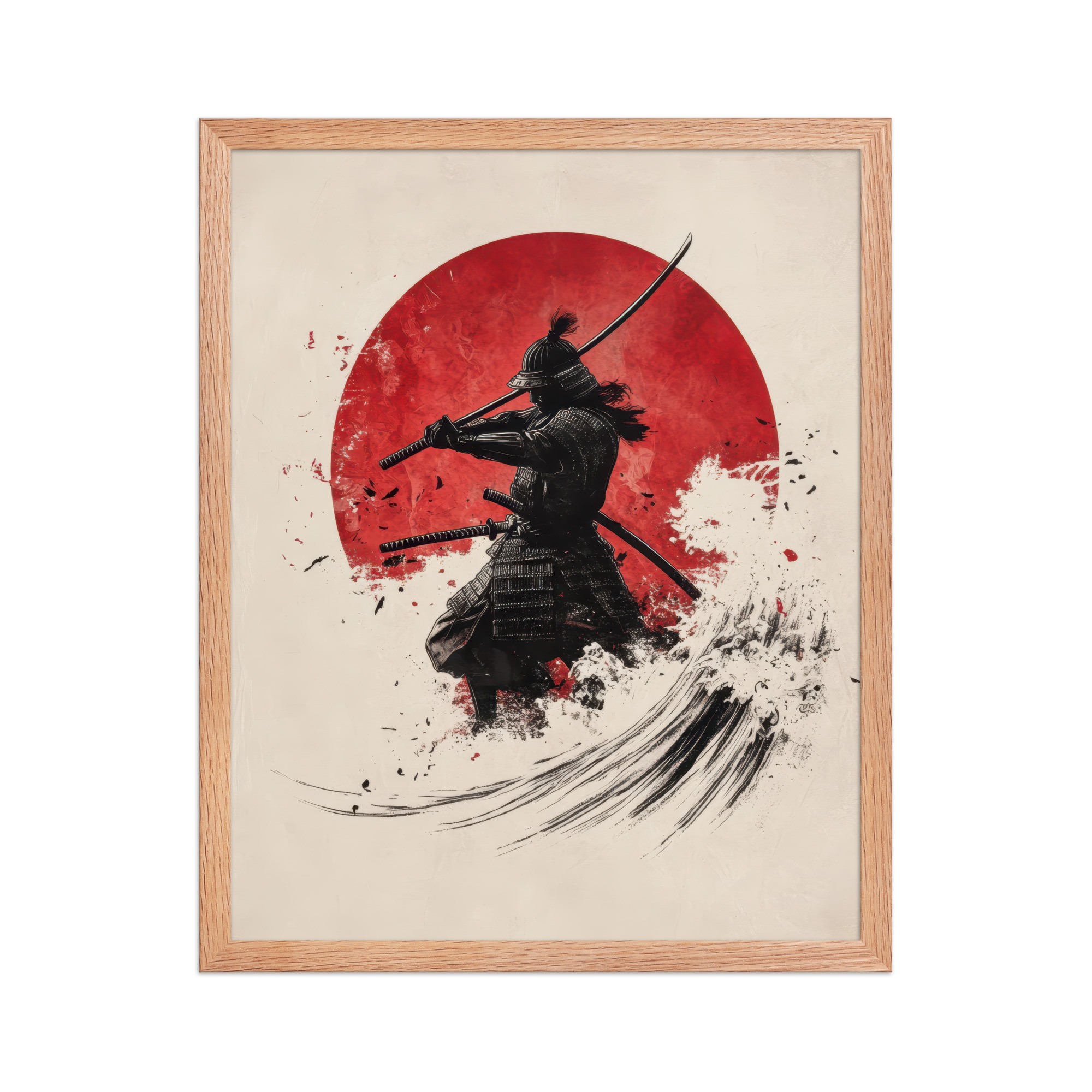 “Silent Watch – Samurai I” captures a warrior in quiet readiness, silhouetted against a rising crimson sun while sumi-e brushwork breaks like spray at his feet. Calm discipline meets raw movement for a timeless statement of strength.