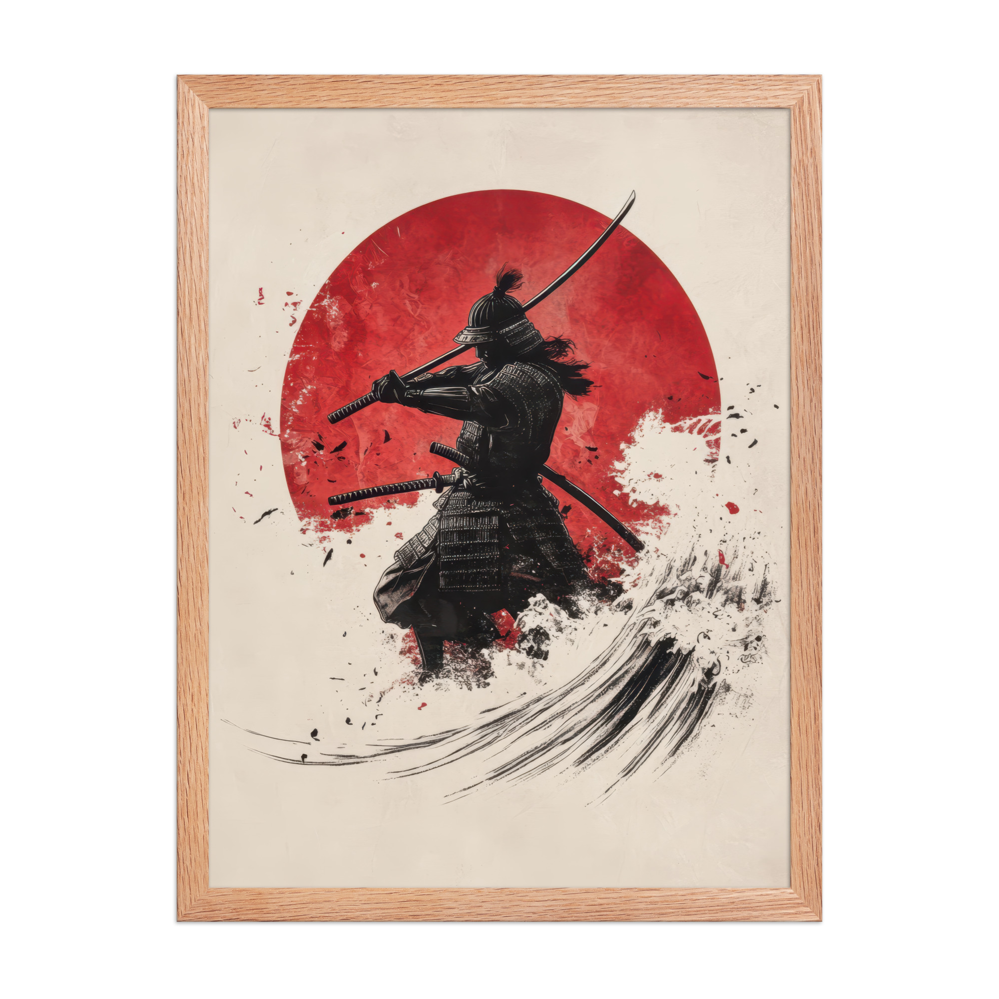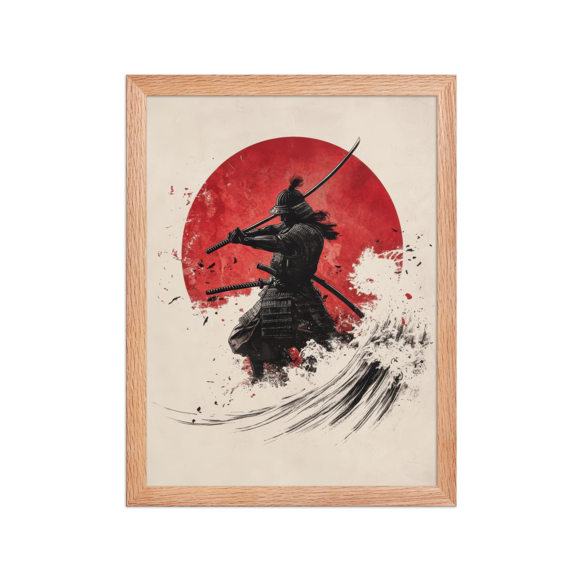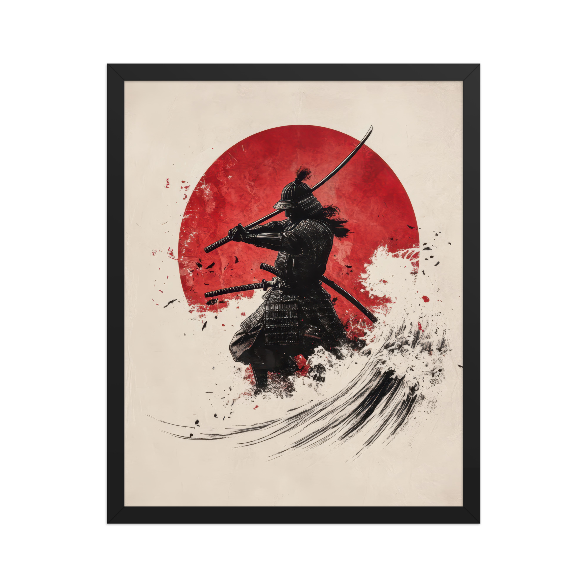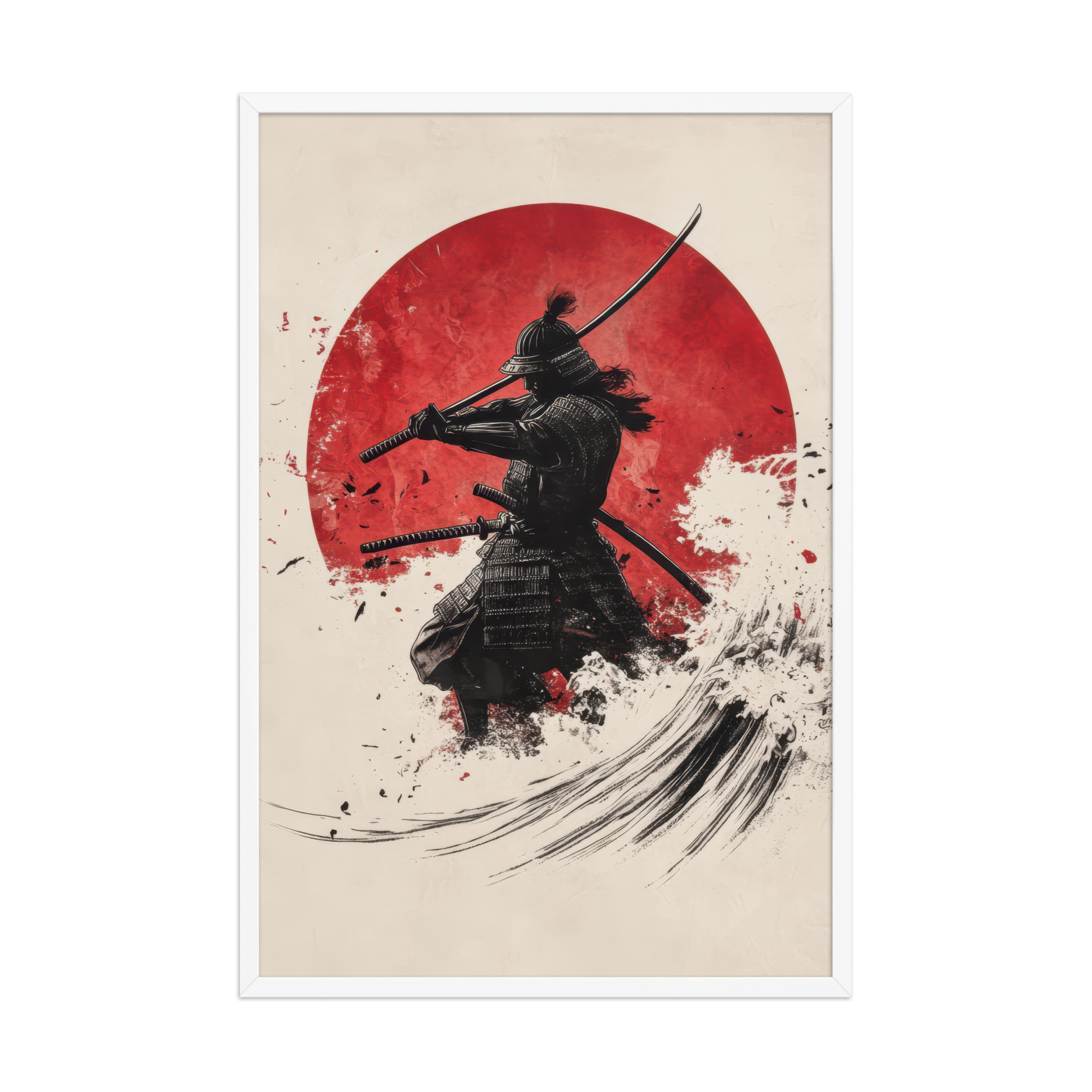 “Silent Watch – Samurai I” captures a warrior in quiet readiness, silhouetted against a rising crimson sun while sumi-e brushwork breaks like spray at his feet. Calm discipline meets raw movement for a timeless statement of strength.