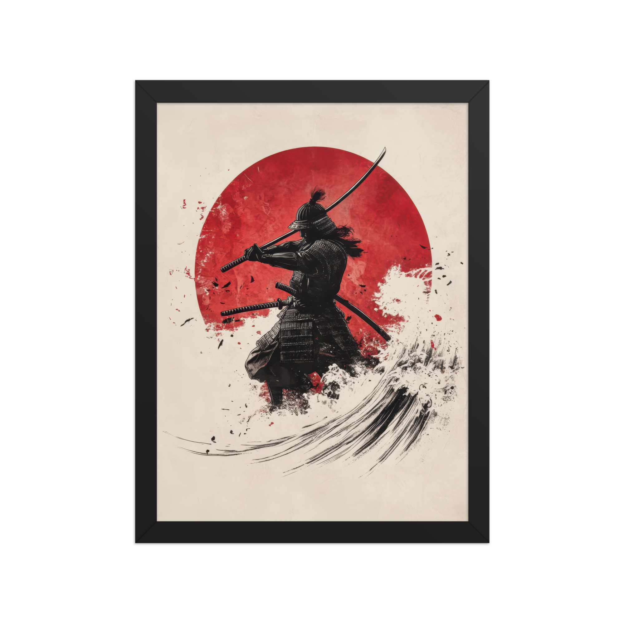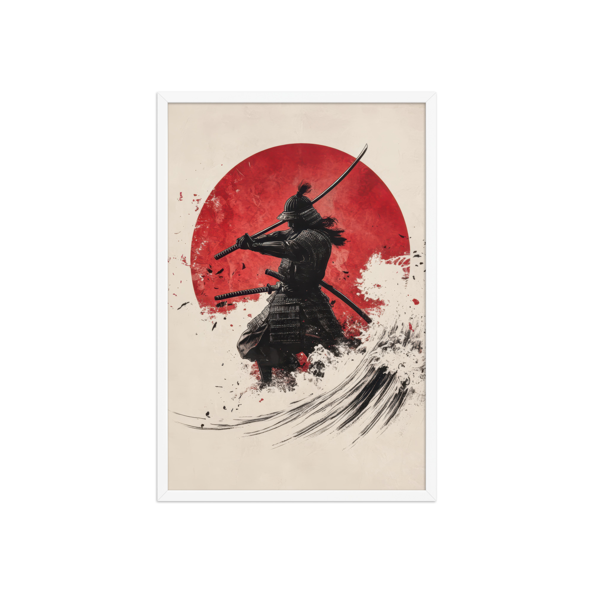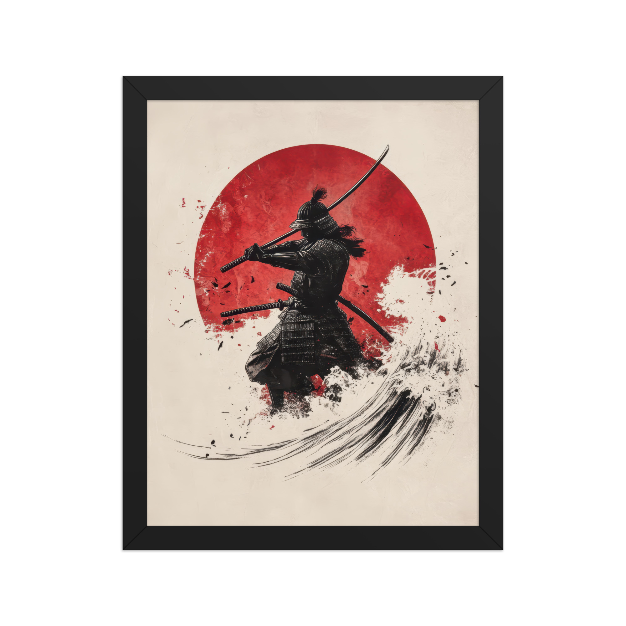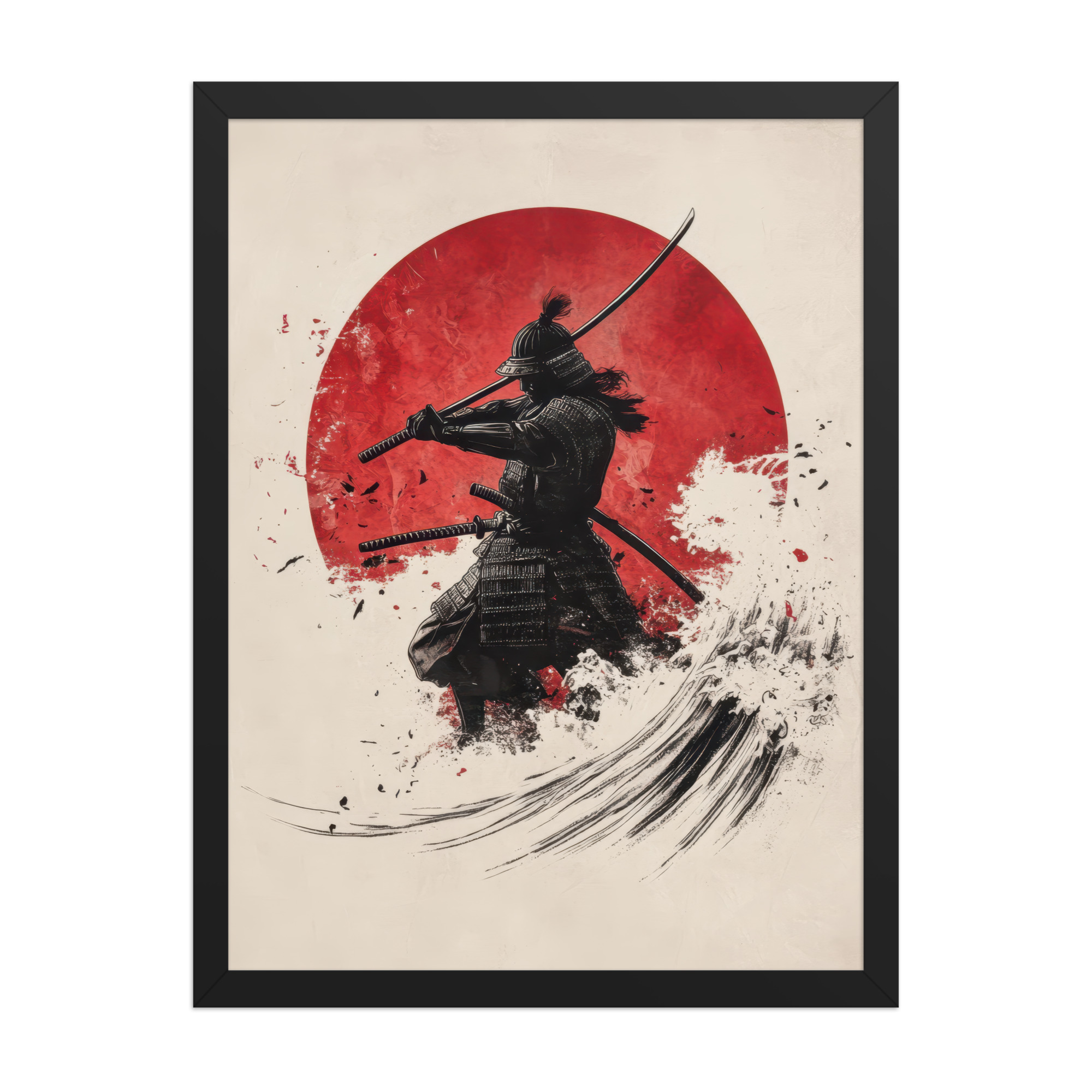 “Silent Watch – Samurai I” captures a warrior in quiet readiness, silhouetted against a rising crimson sun while sumi-e brushwork breaks like spray at his feet. Calm discipline meets raw movement for a timeless statement of strength.