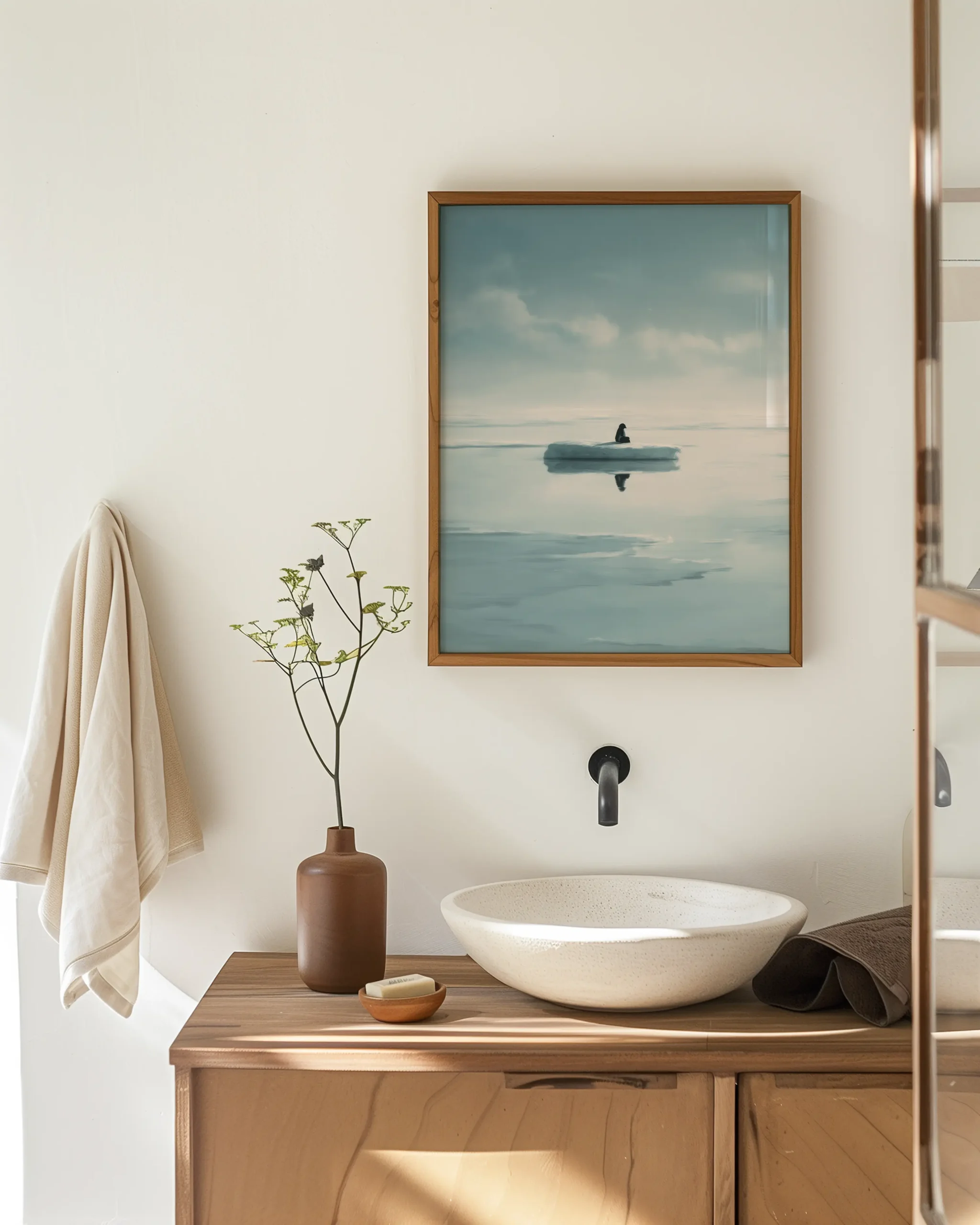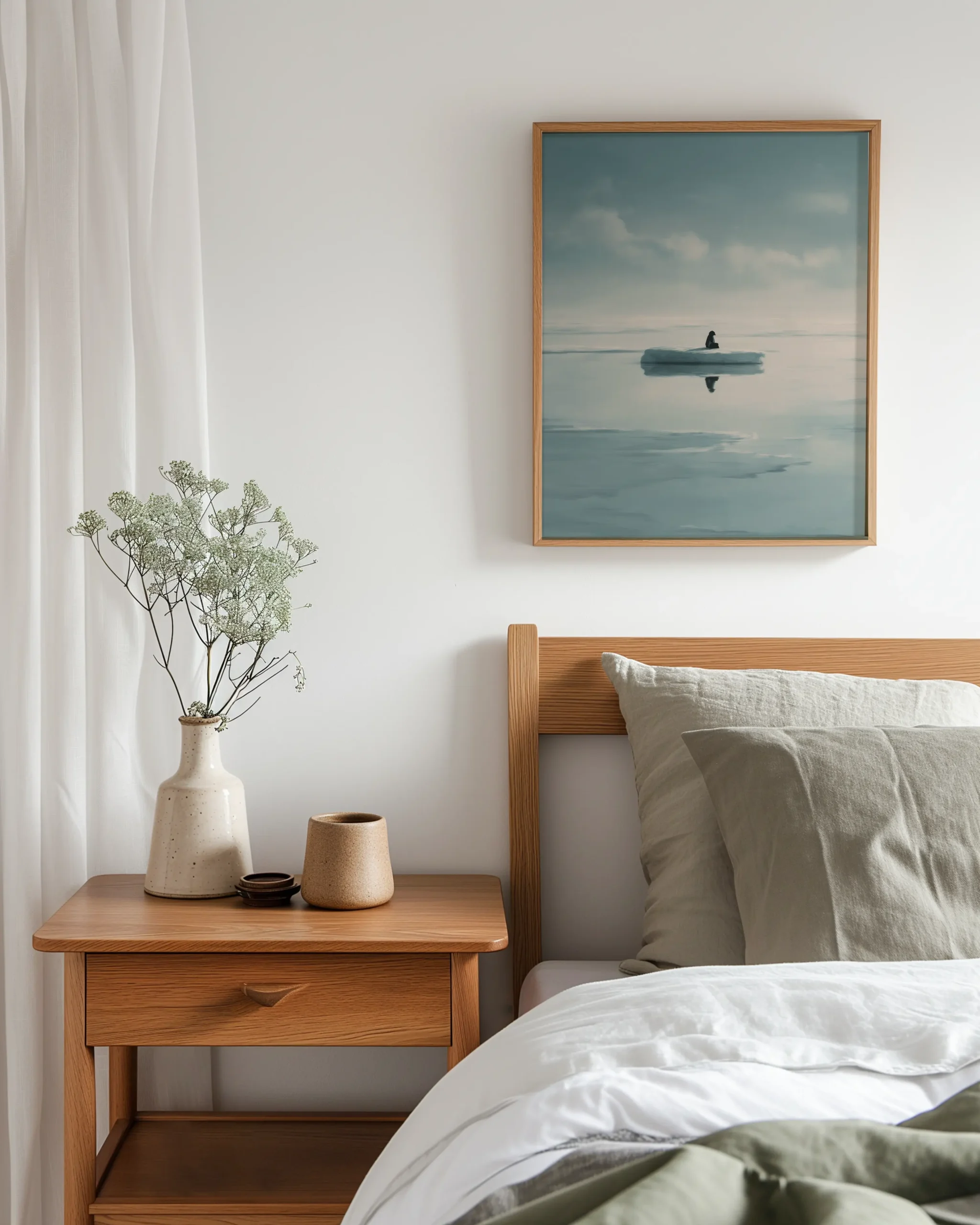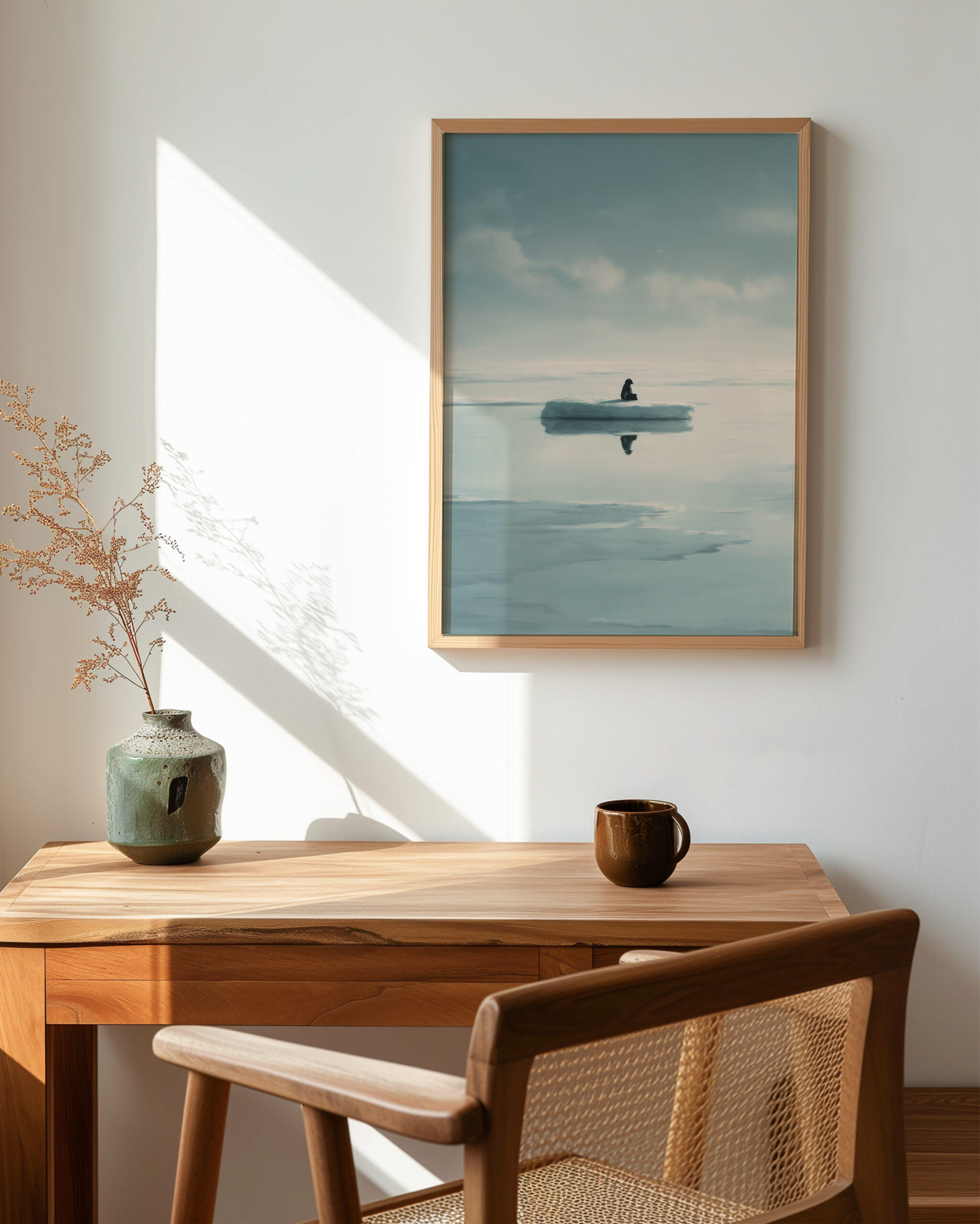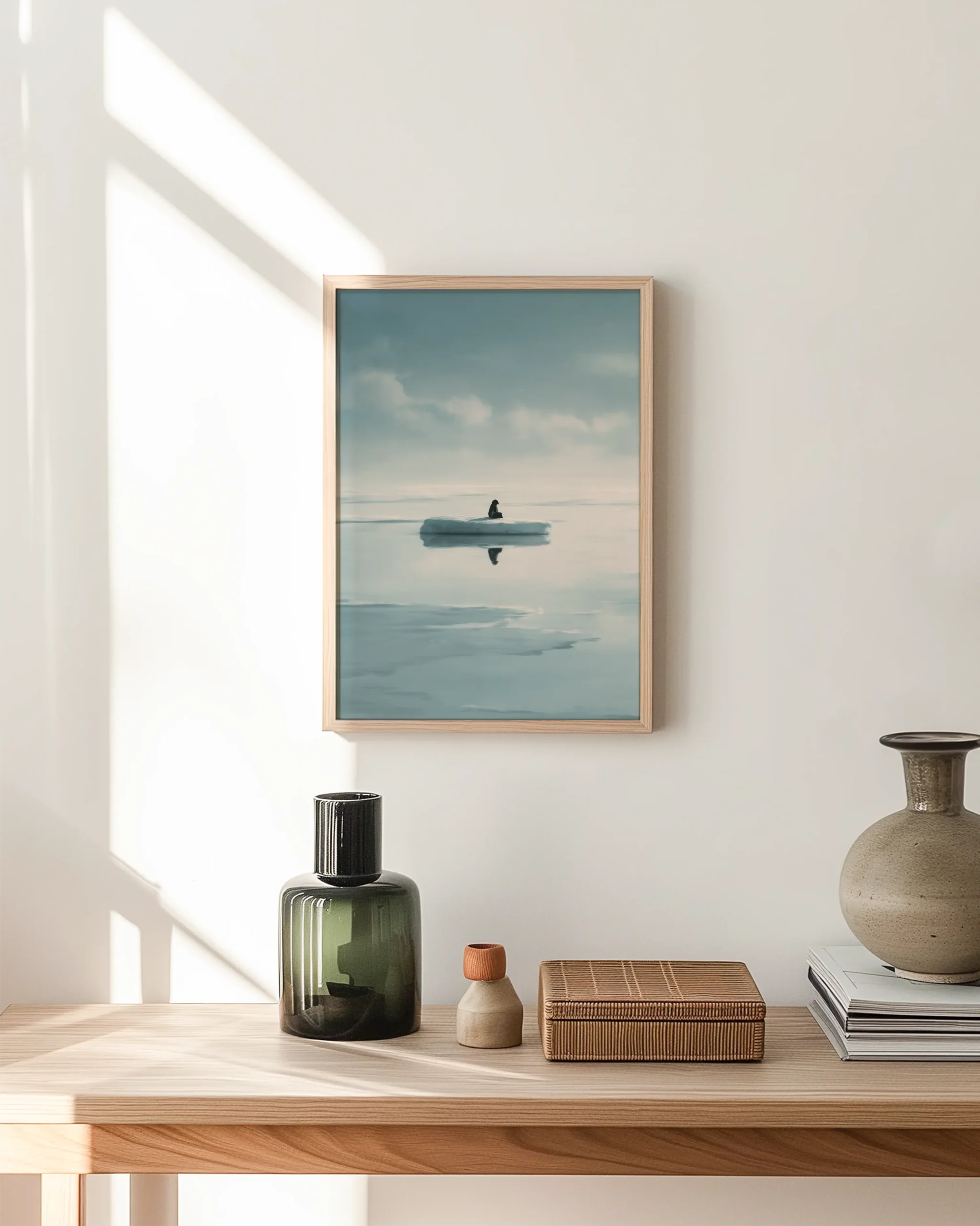A minimal arctic scene unfolds in misty blues: still water, distant clouds, and a solitary penguin mirrored on an ice floe. The spacious composition and cool tonal palette invite calm focus—perfect for Japandi-inspired living rooms, bedrooms, or study nooks.