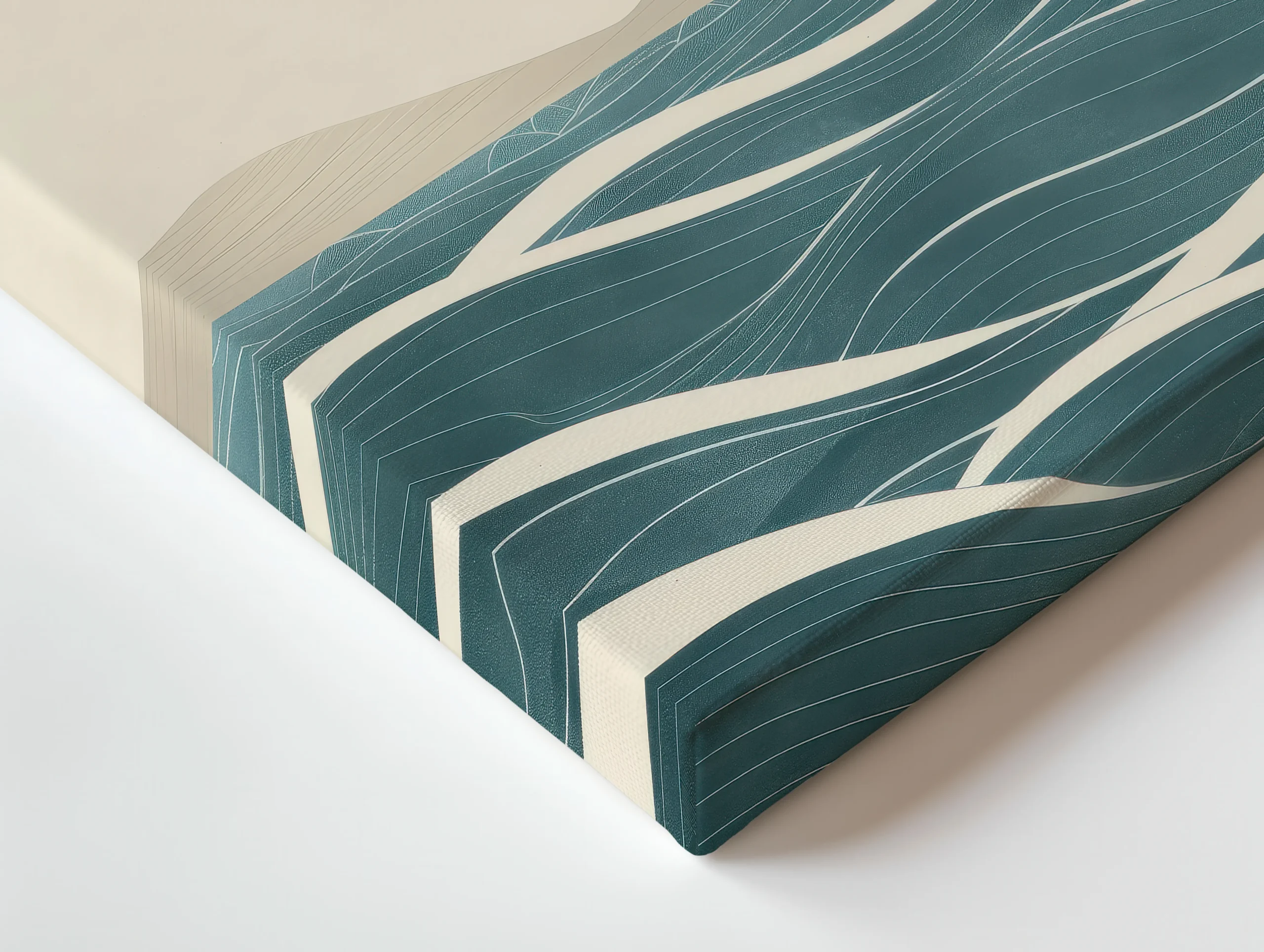 Simple flowing waves move across the foreground while soft dunes fade into the distance, creating a quiet seascape that feels airy and modern.