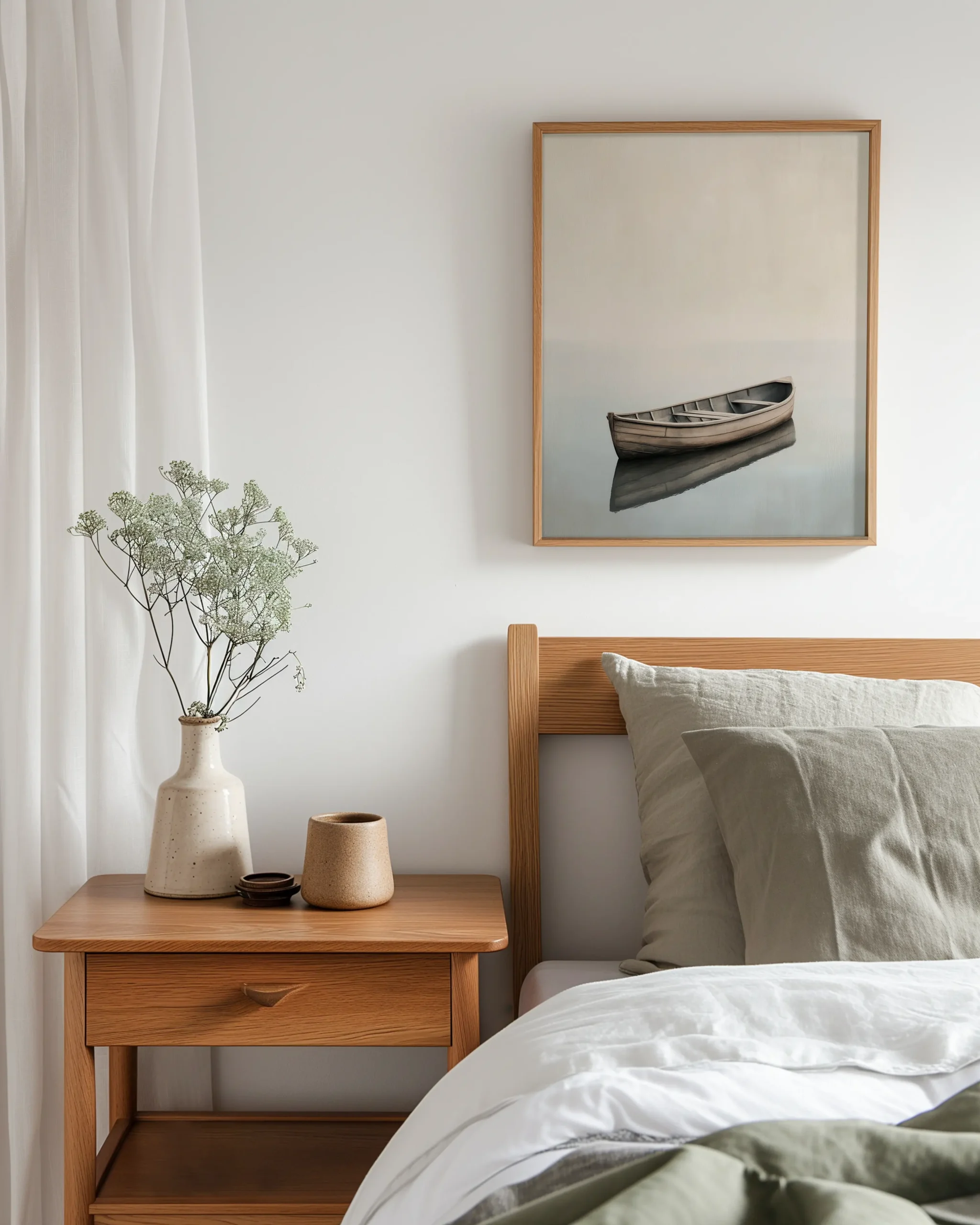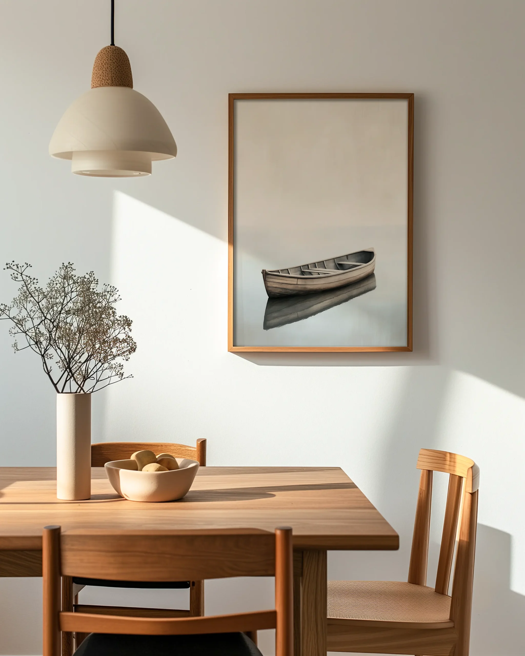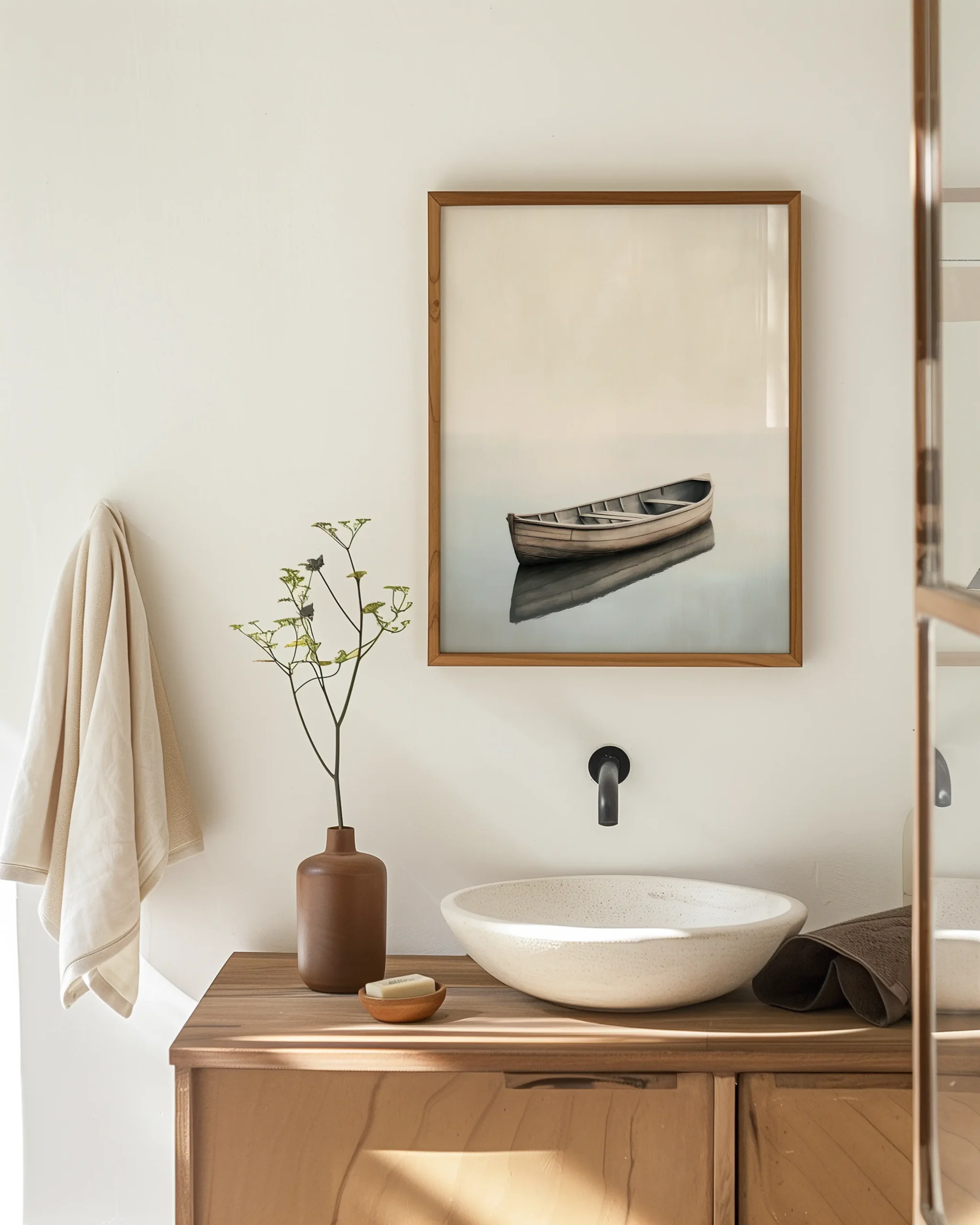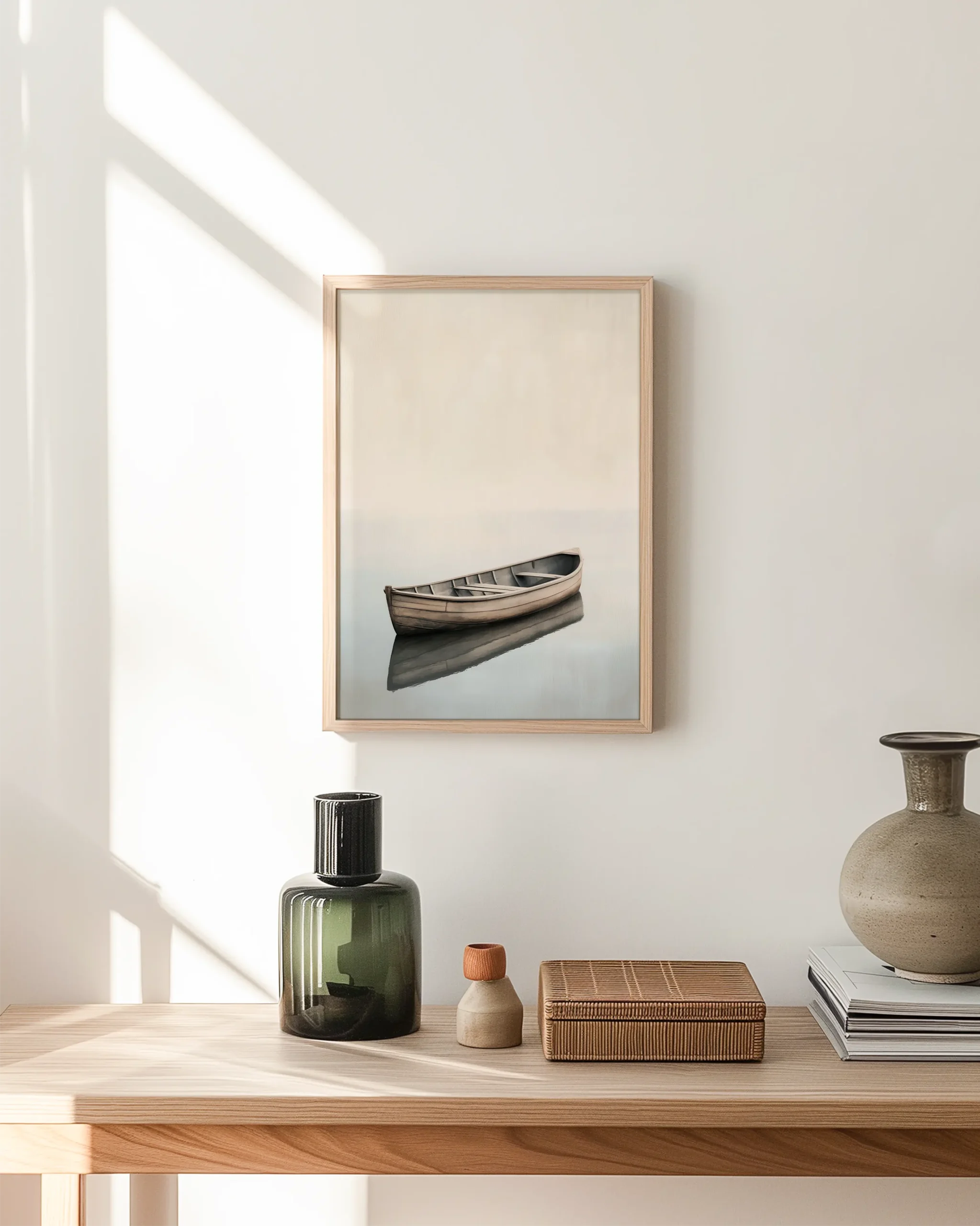 A single wooden rowboat floats on mirror-still water beneath a soft, misty horizon. Quiet negative space and gentle neutrals create a serene Japandi atmosphere.