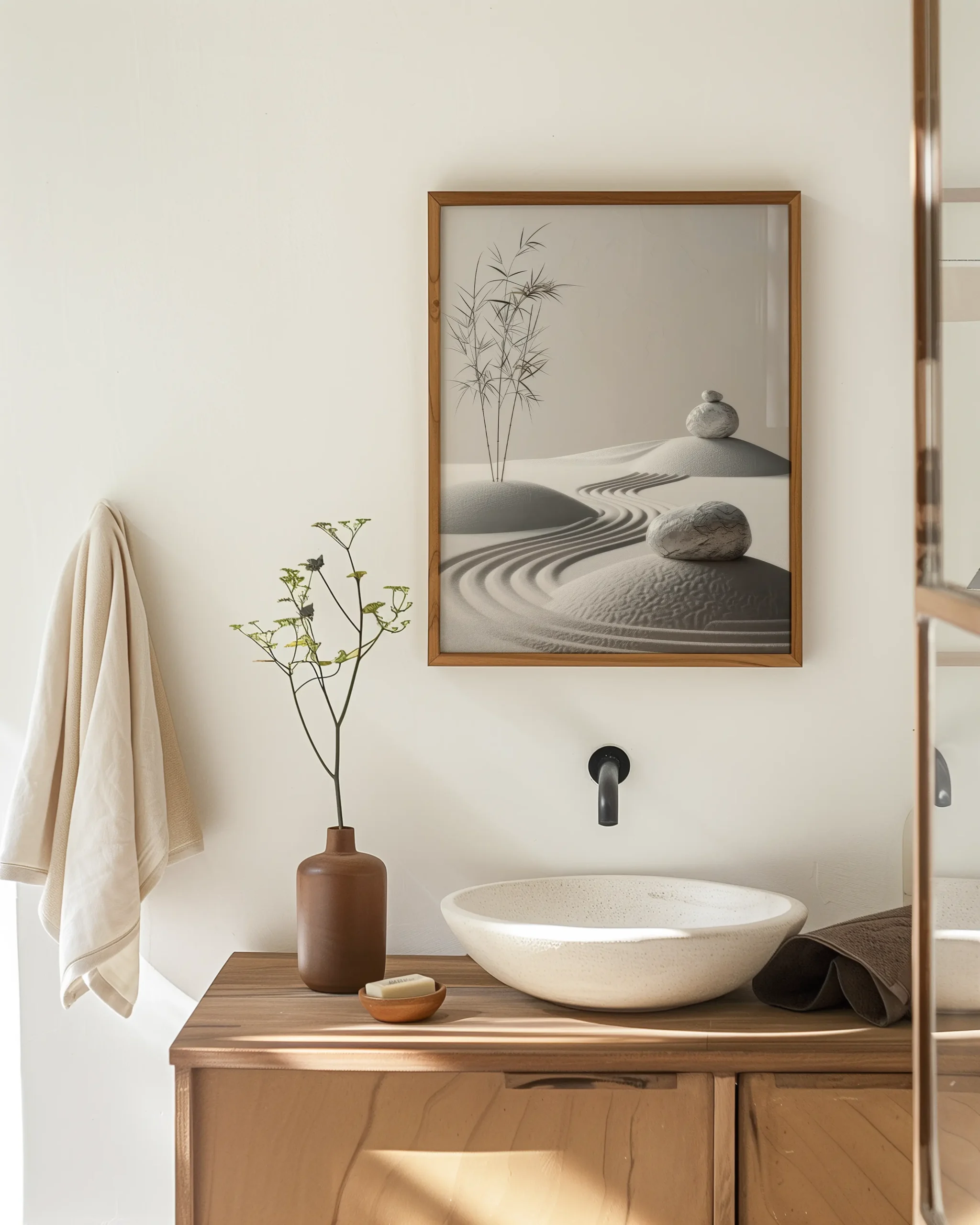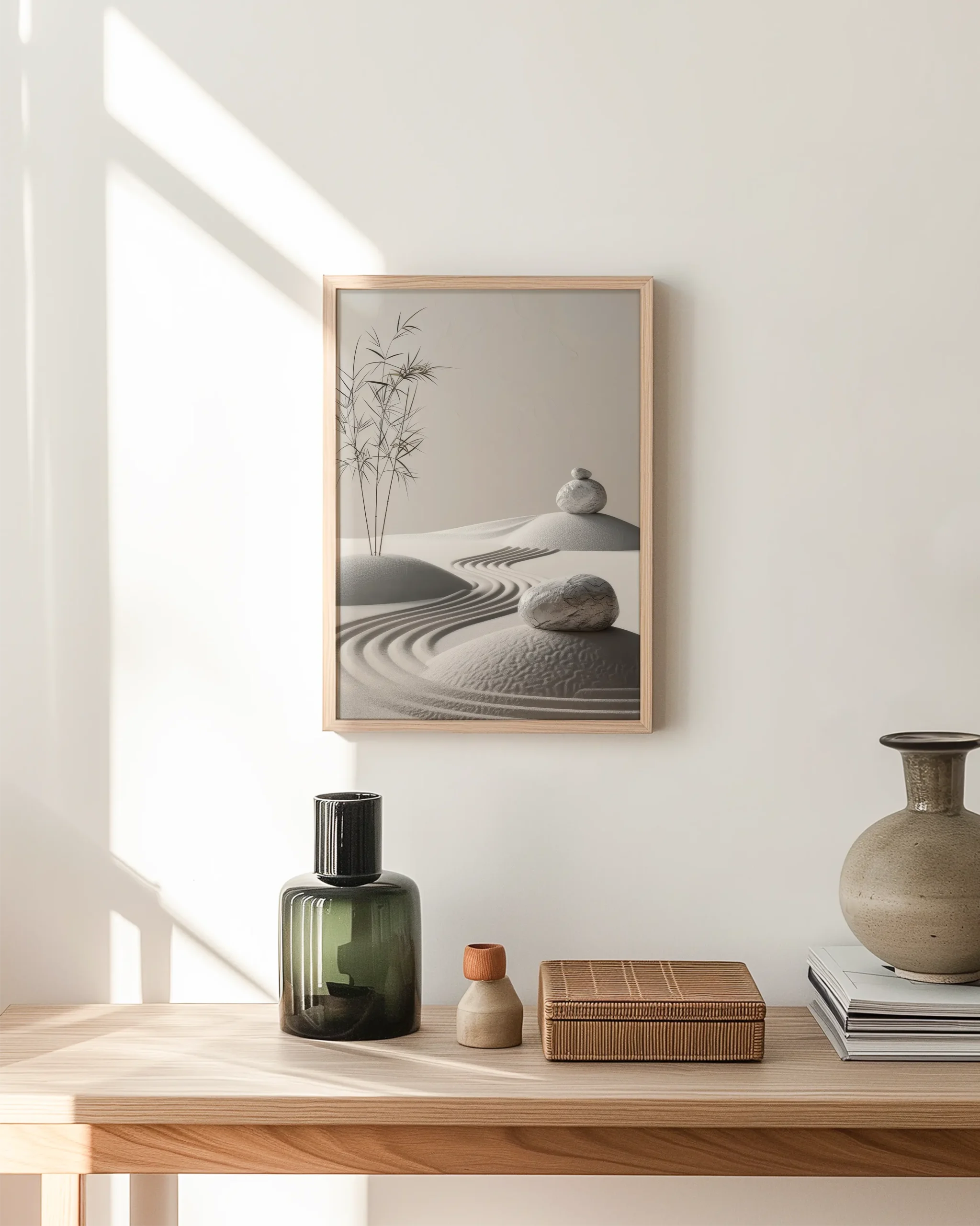 Curved rake lines sweep through pale sand around rounded stones as a single bamboo cluster rises in calm balance. A quiet study in texture, light, and mindful simplicity.