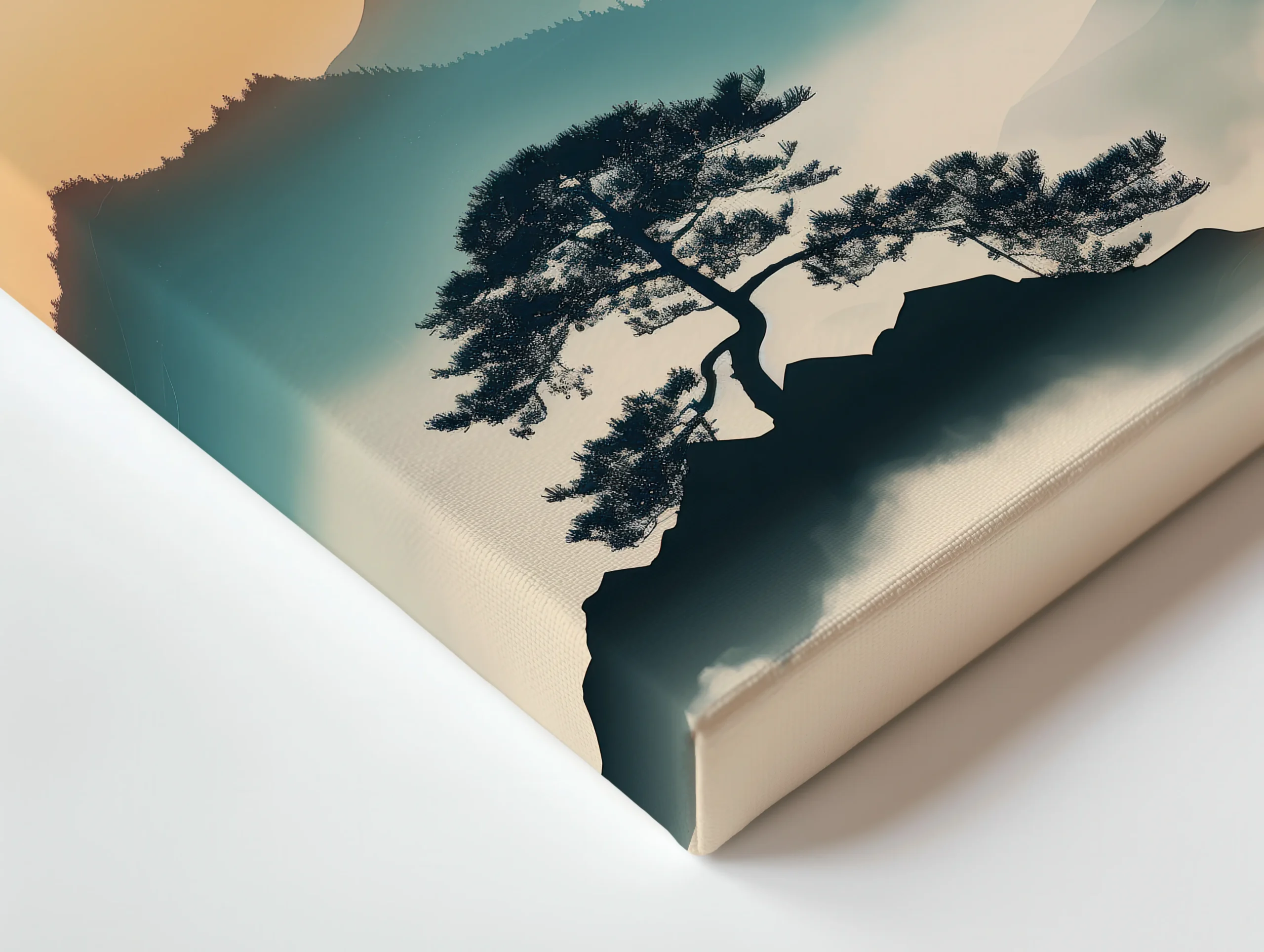 Layered mountain ridges fade into tranquil haze as a glowing sun anchors the sky, while a windswept pine stands in quiet balance. The soft gradients and minimal forms bring a serene Japandi, Sumi-e-inspired feel to modern interiors.
