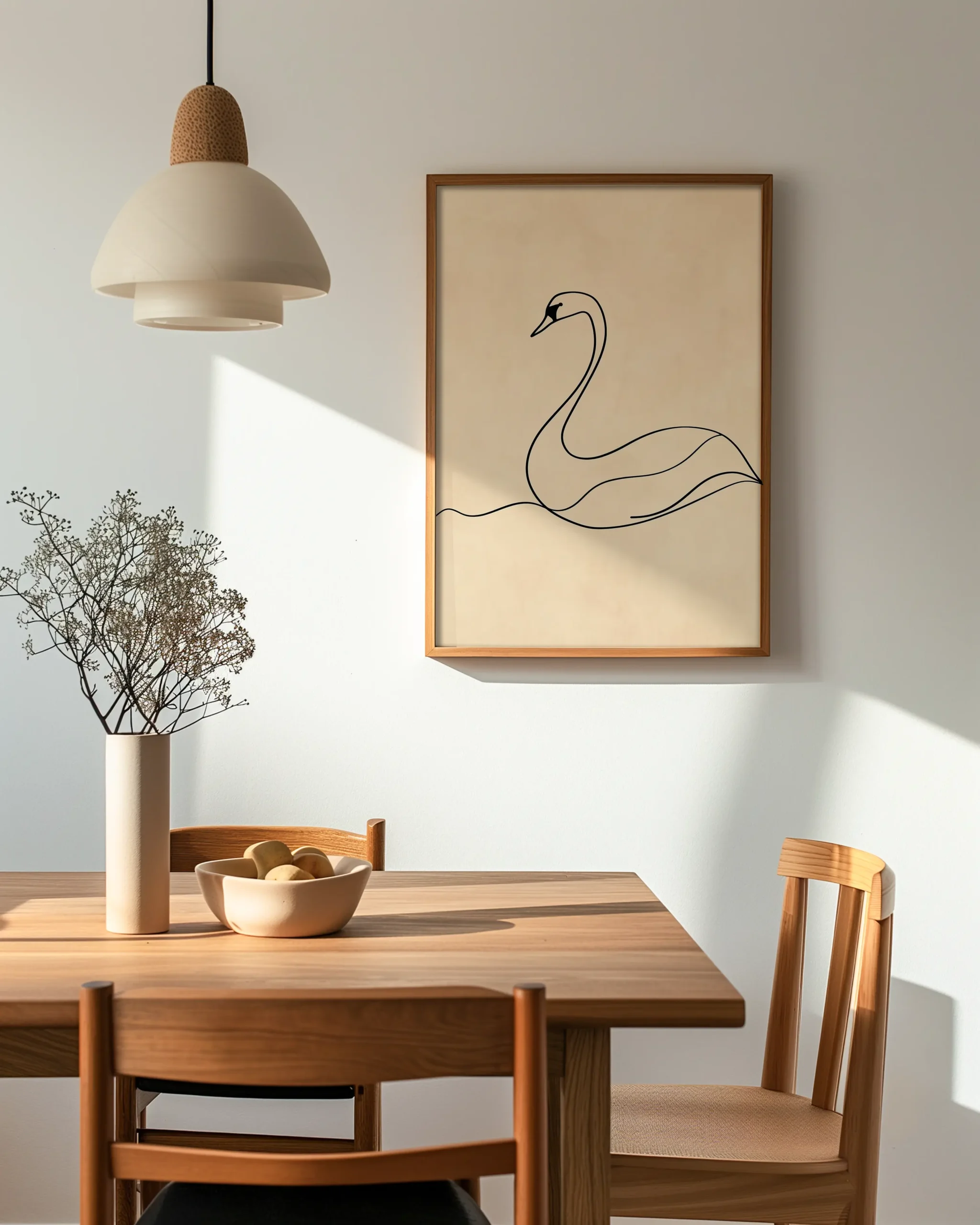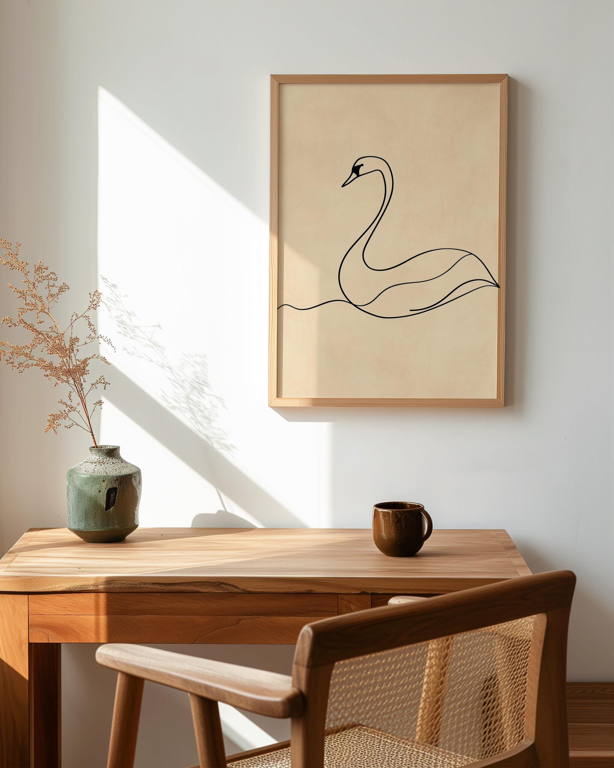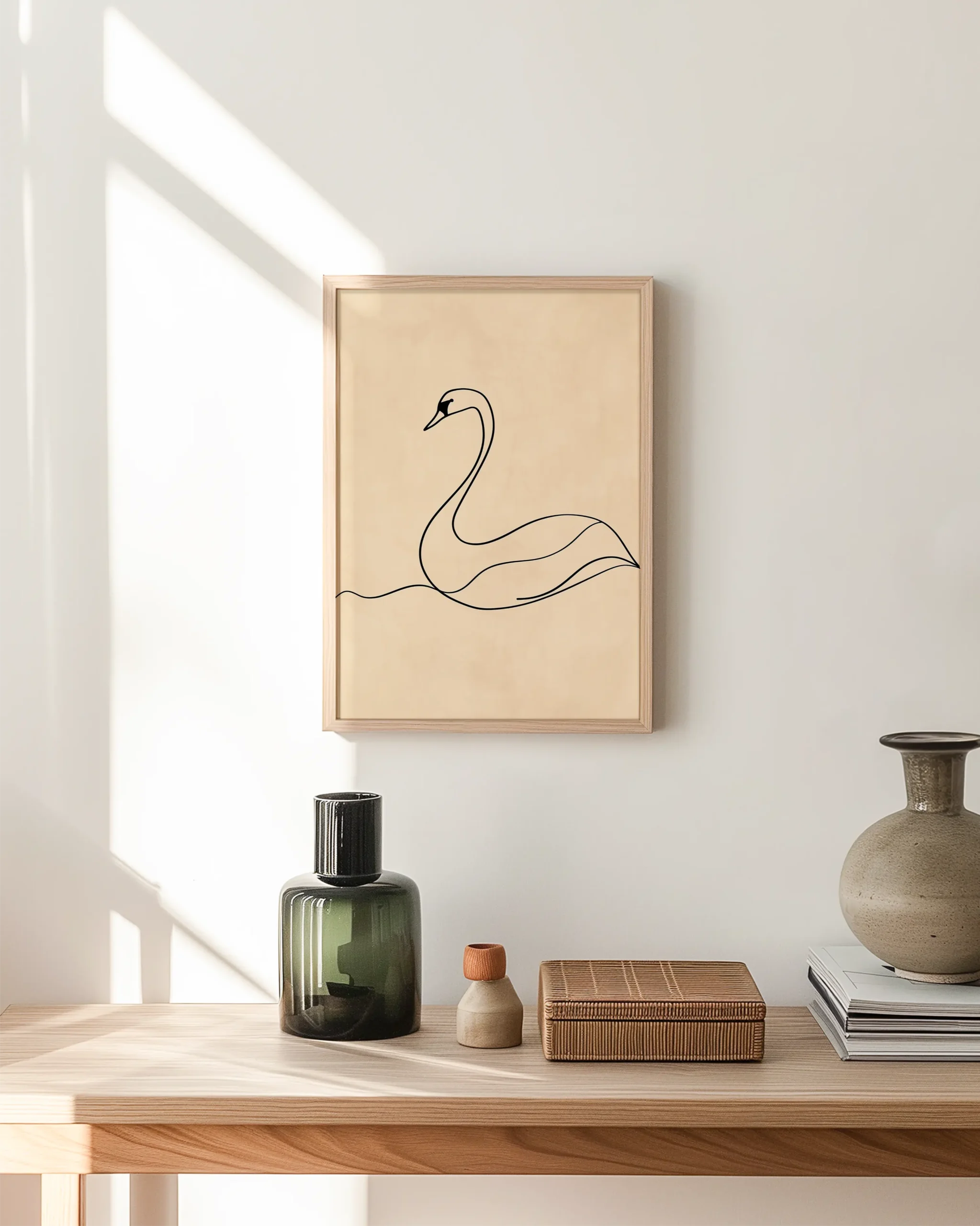 A single-line swan gliding across calm water on a warm beige ground—quiet Japandi minimalism for serene bedrooms, nurseries, and entryways—printed on museum-quality enhanced matte paper. Framed and ready to hang with your preferred frame (Black, White, or Red Oak).
