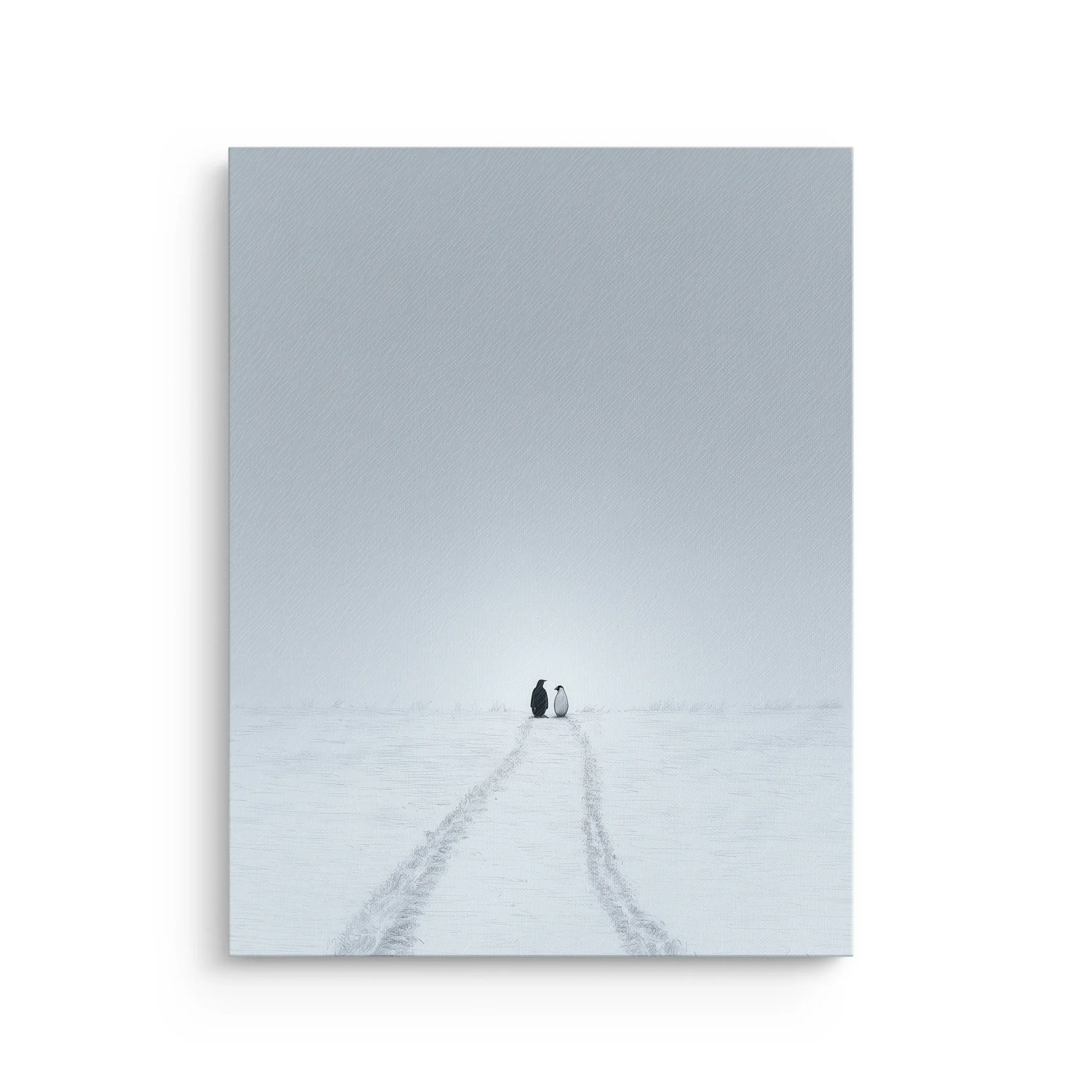 In a quiet winter haze, two penguins stand side by side as a single trail leads them forward across fresh snow. The soft gray-blue gradients and spacious negative space create a calm Japandi mood that feels still, minimal, and comforting.
