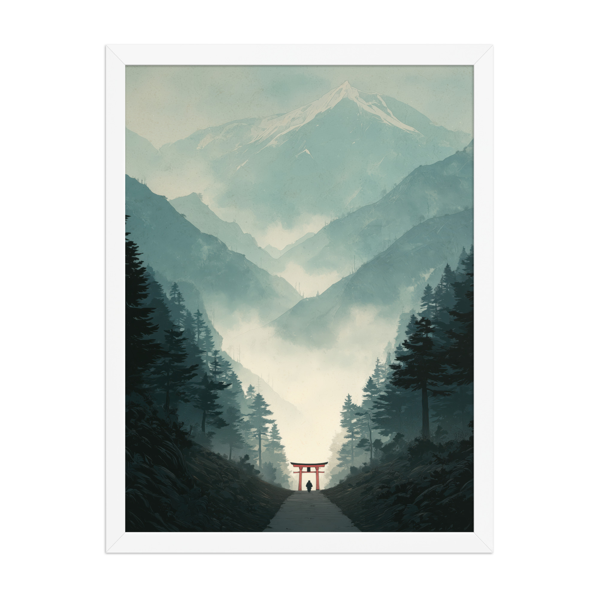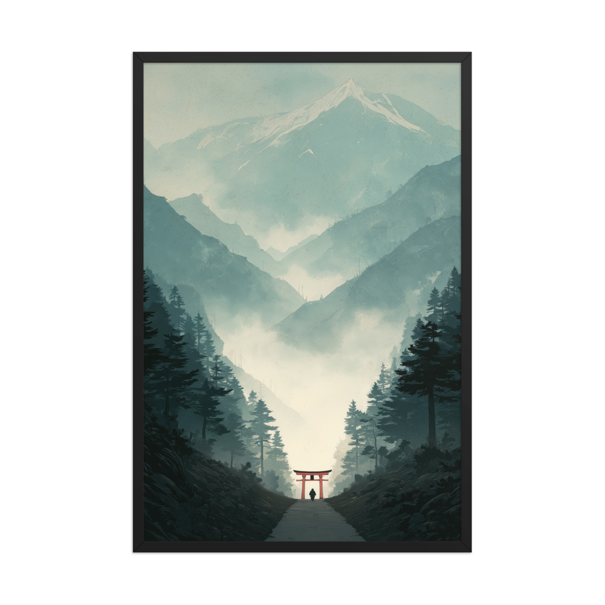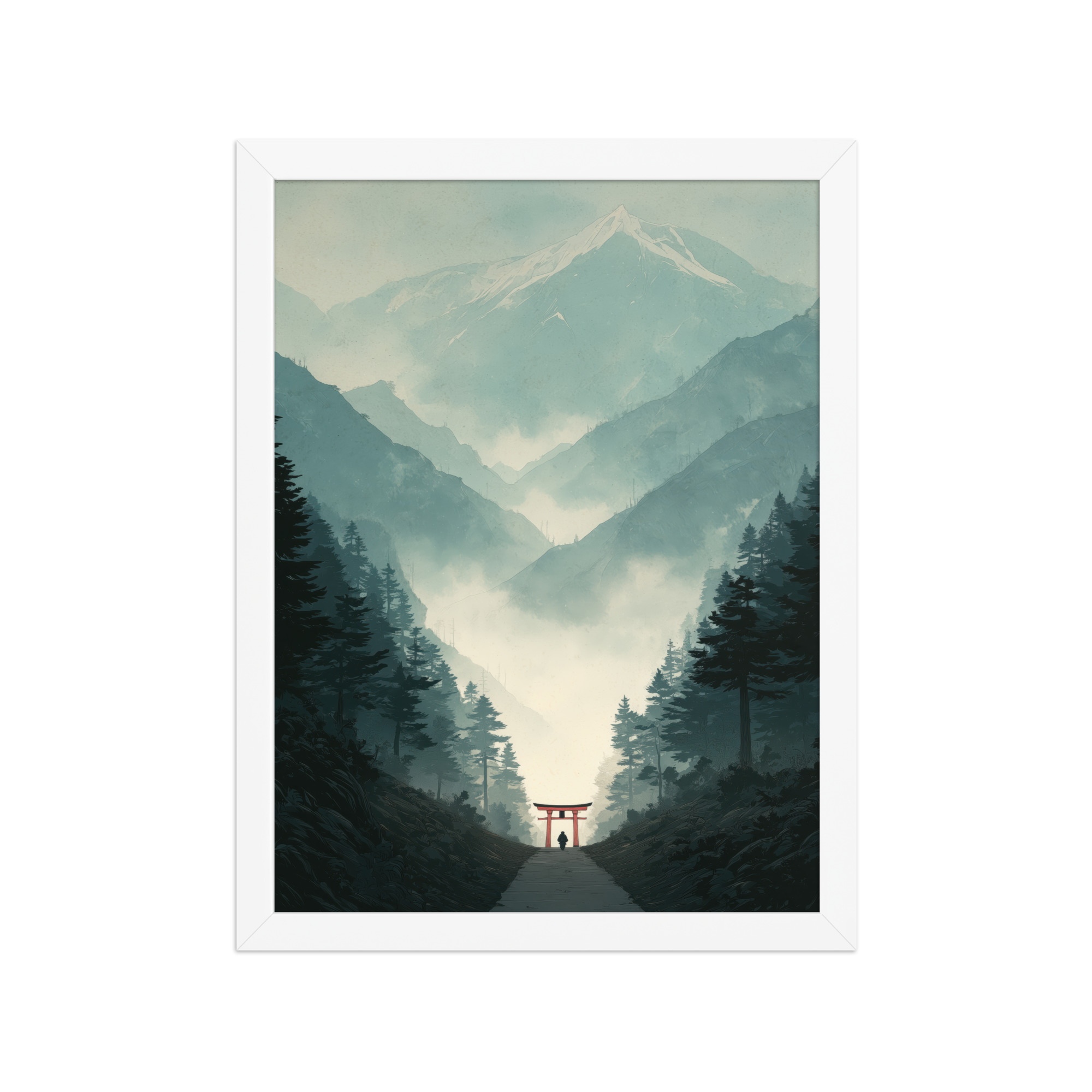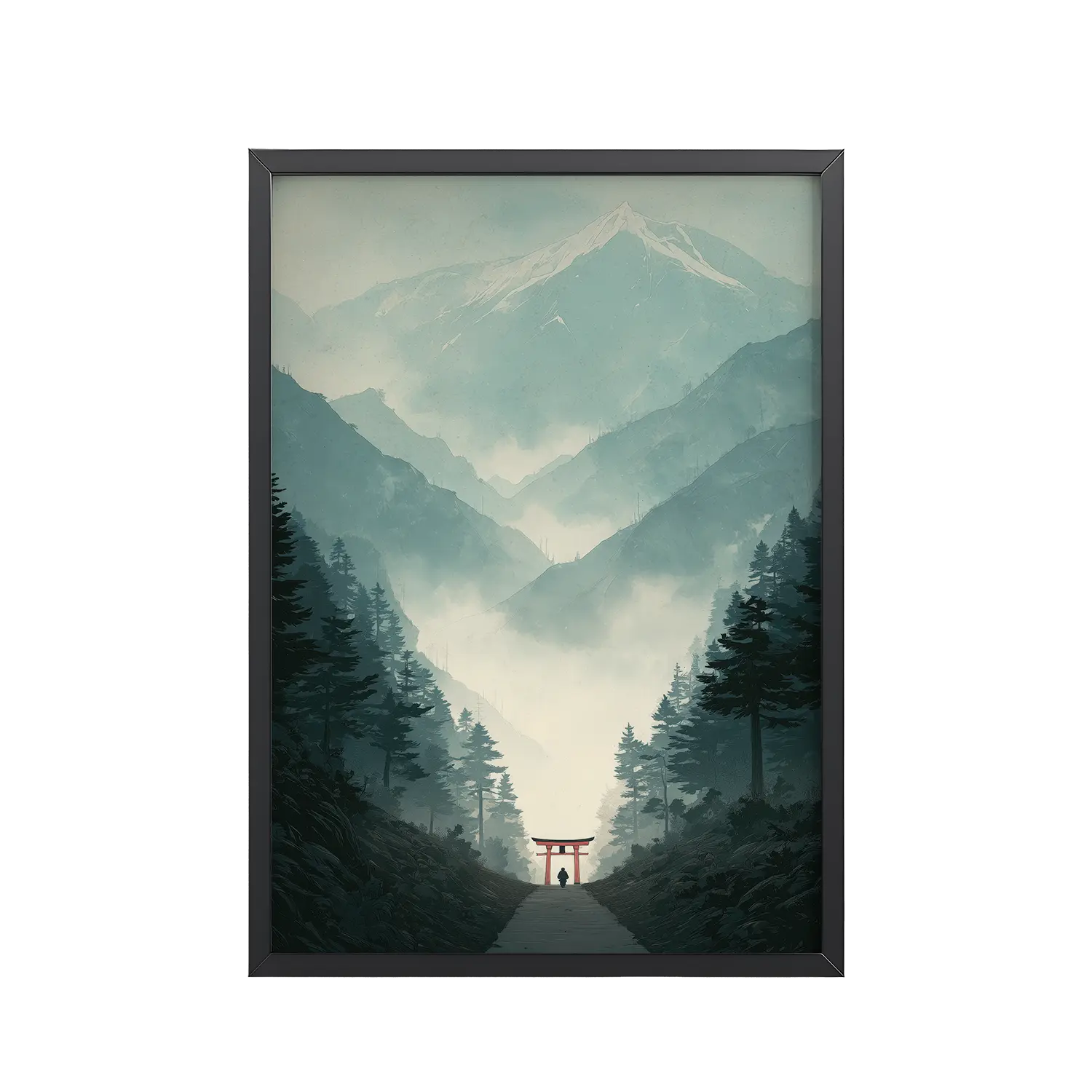 A quiet mountain pass opens toward a lone torii gate, its vermilion silhouette glowing through layered mist. The soft gradients and woodblock-style textures evoke calm passage, reflection, and arrival.