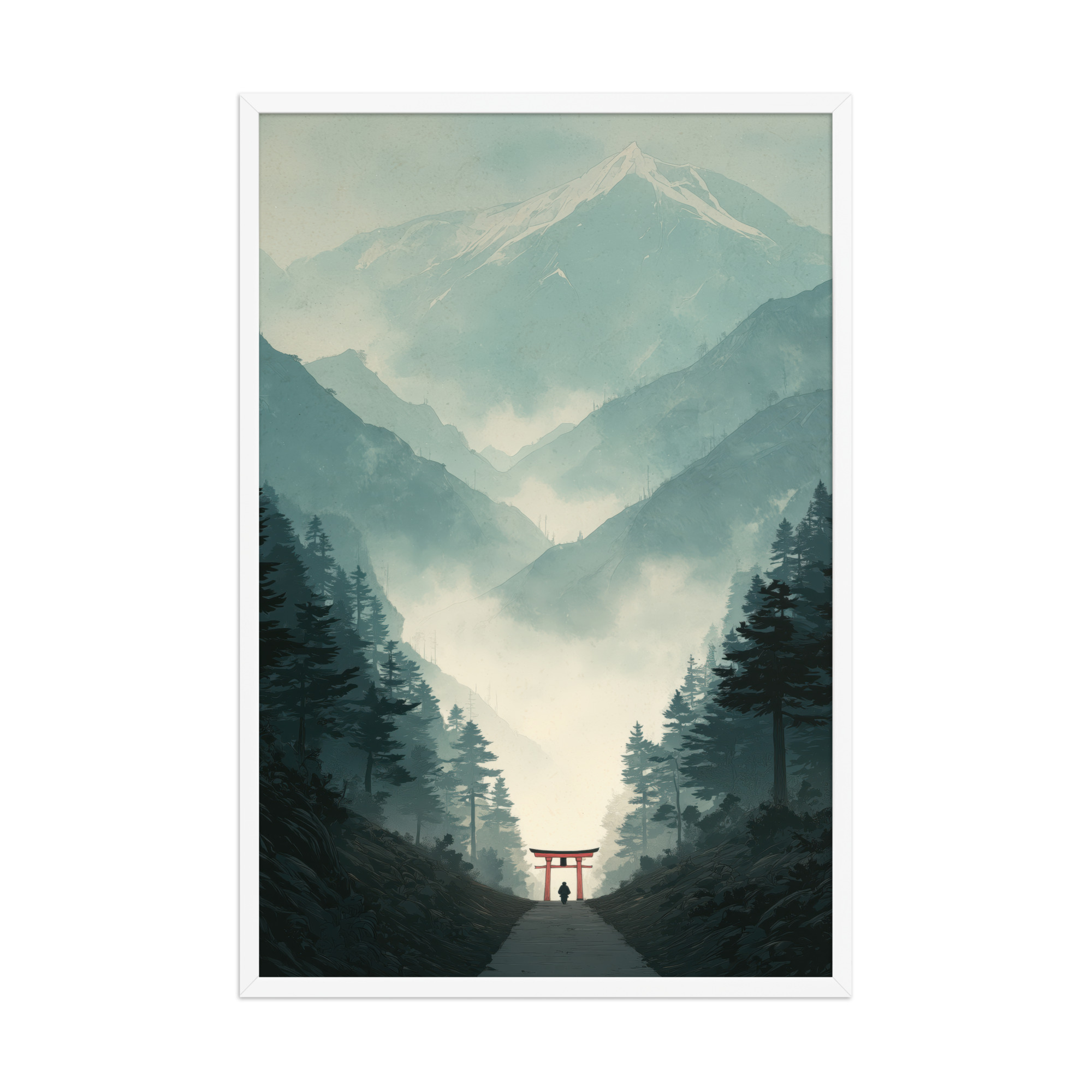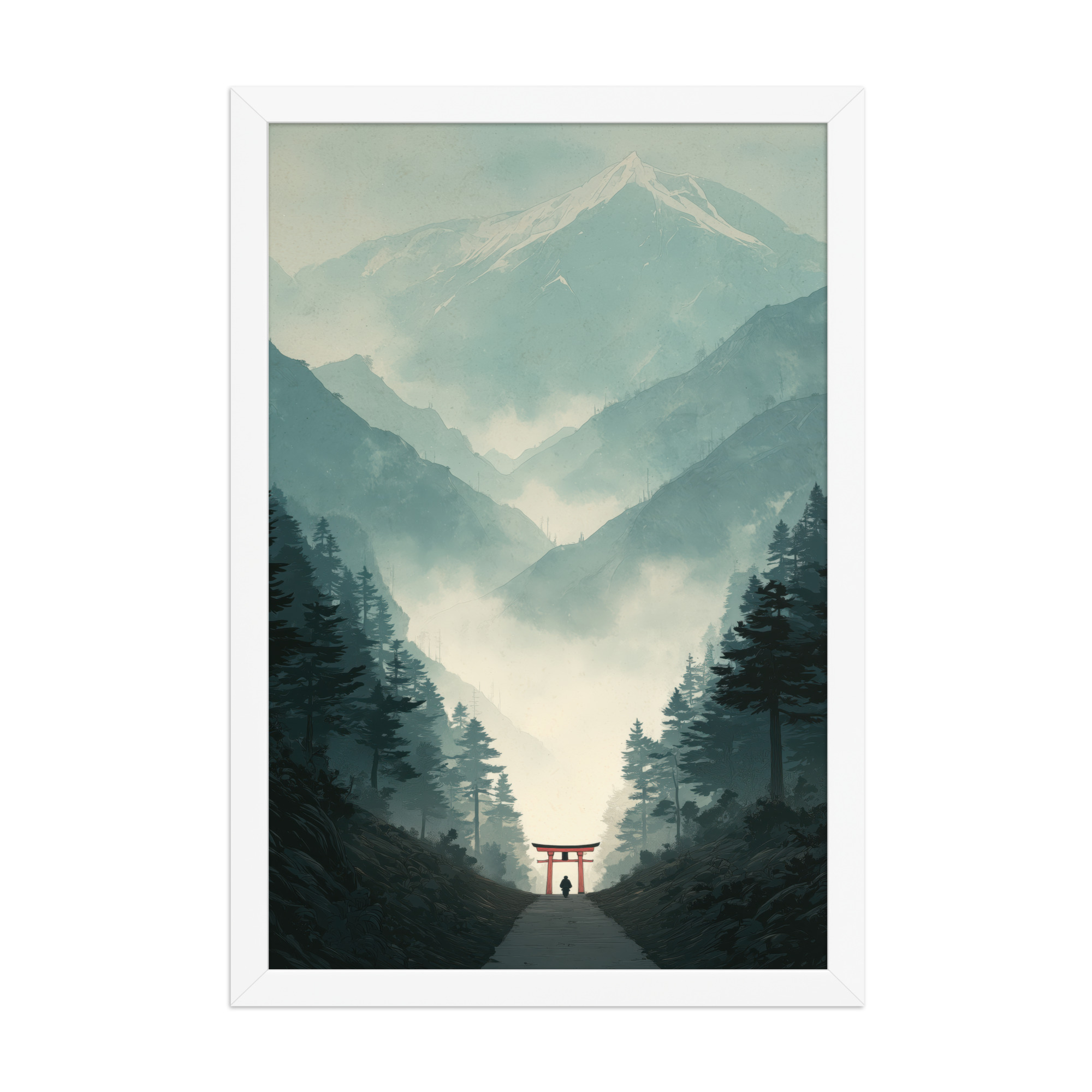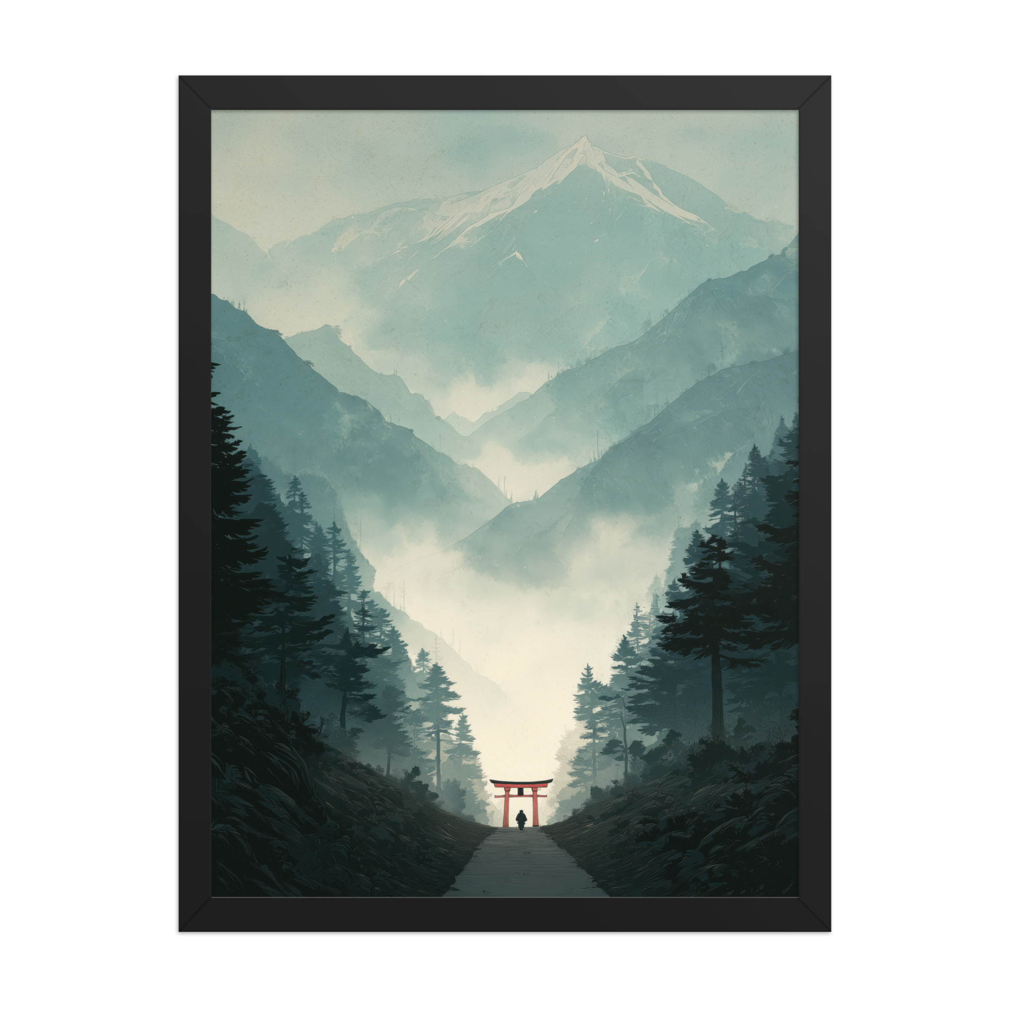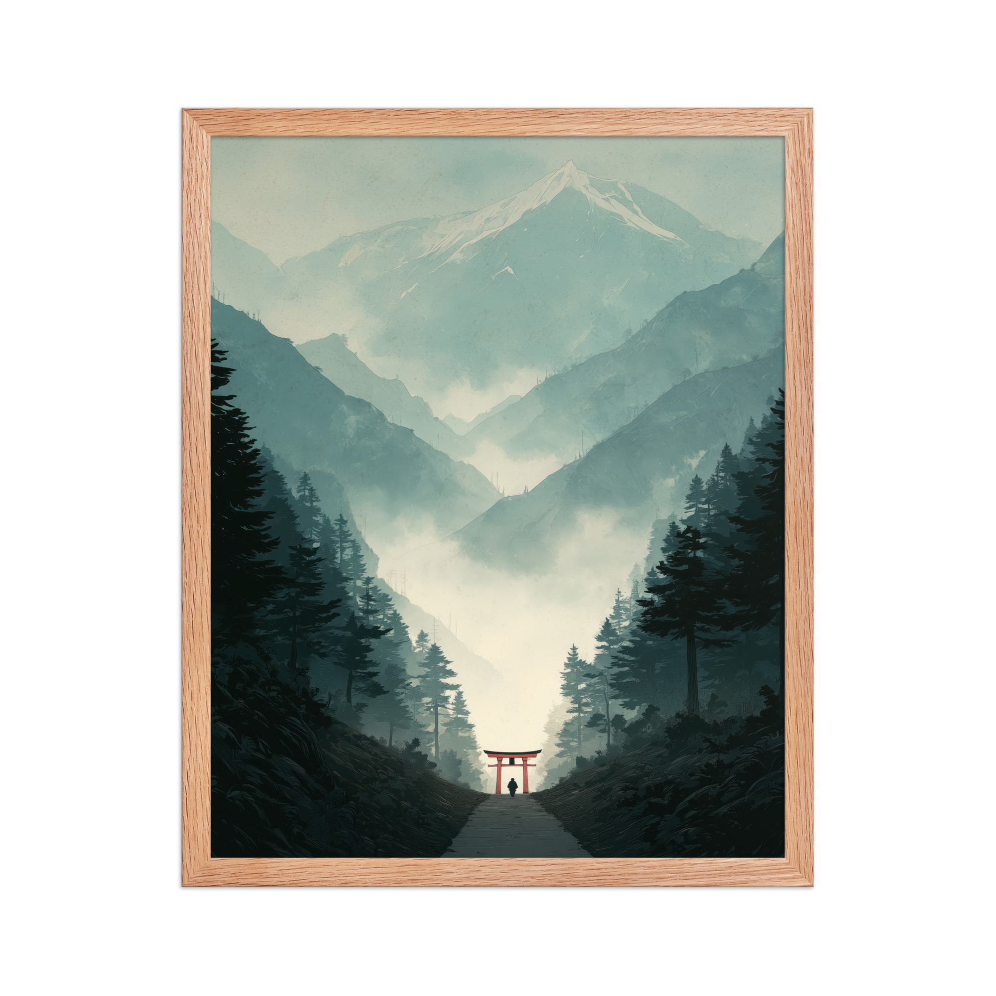 A quiet mountain pass opens toward a lone torii gate, its vermilion silhouette glowing through layered mist. The soft gradients and woodblock-style textures evoke calm passage, reflection, and arrival.