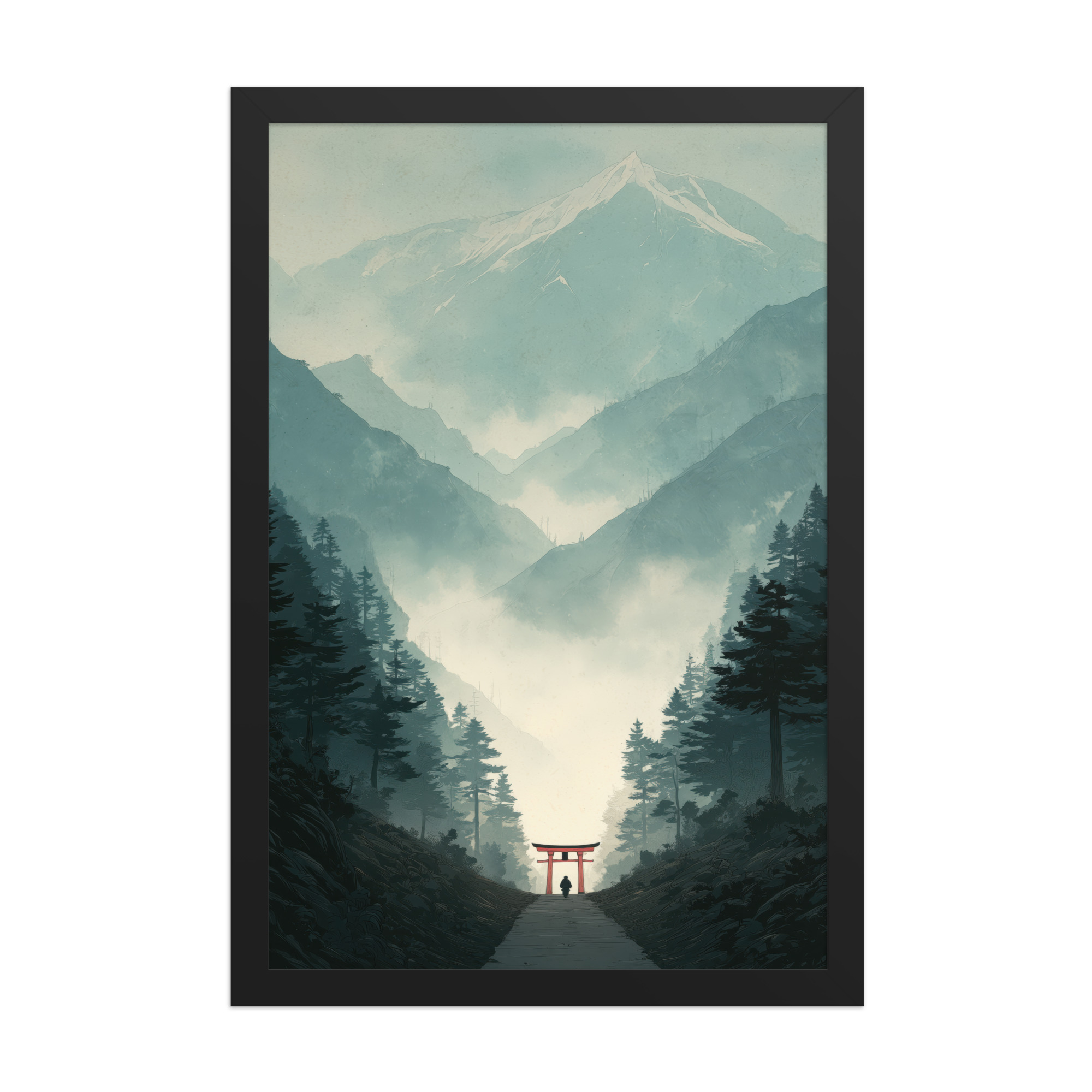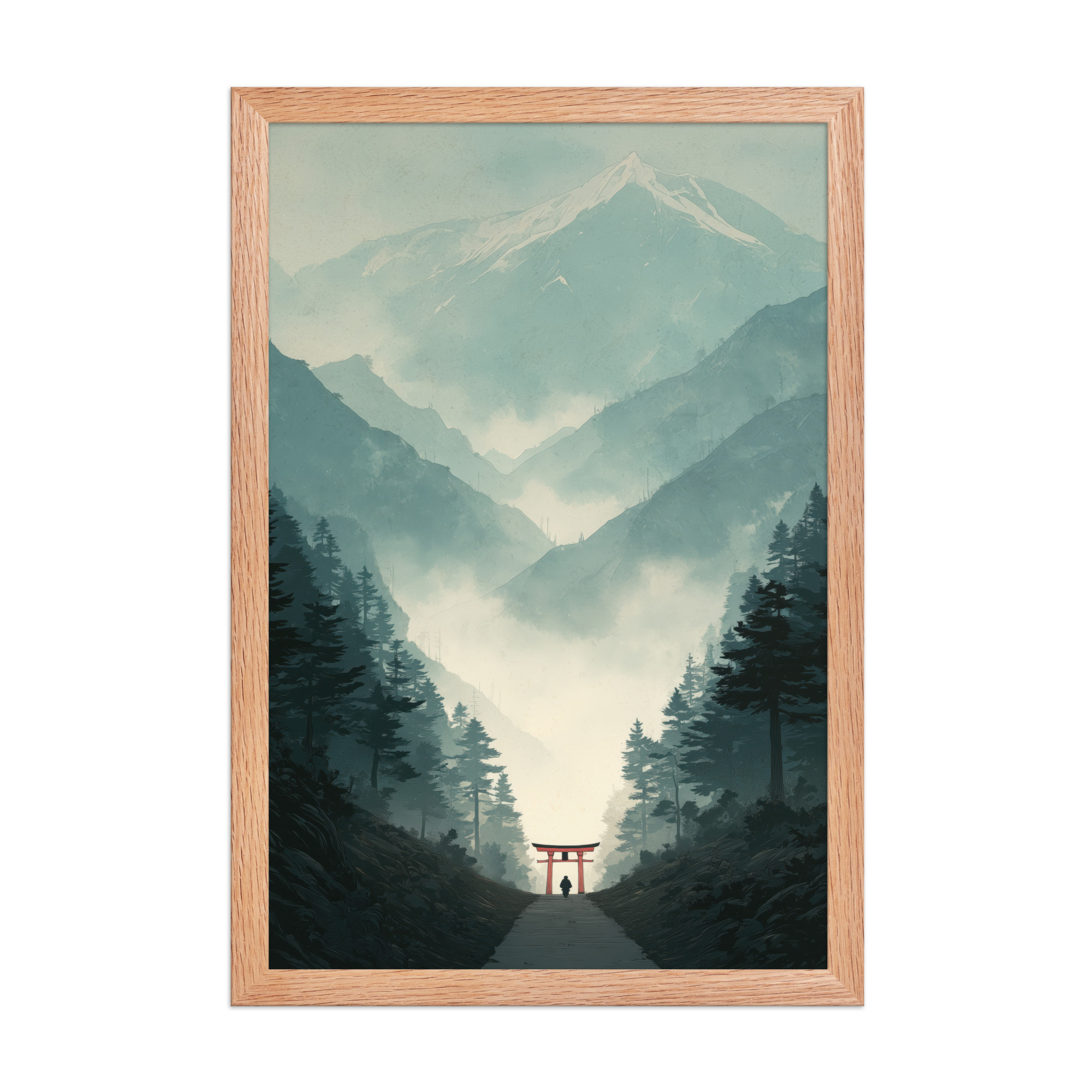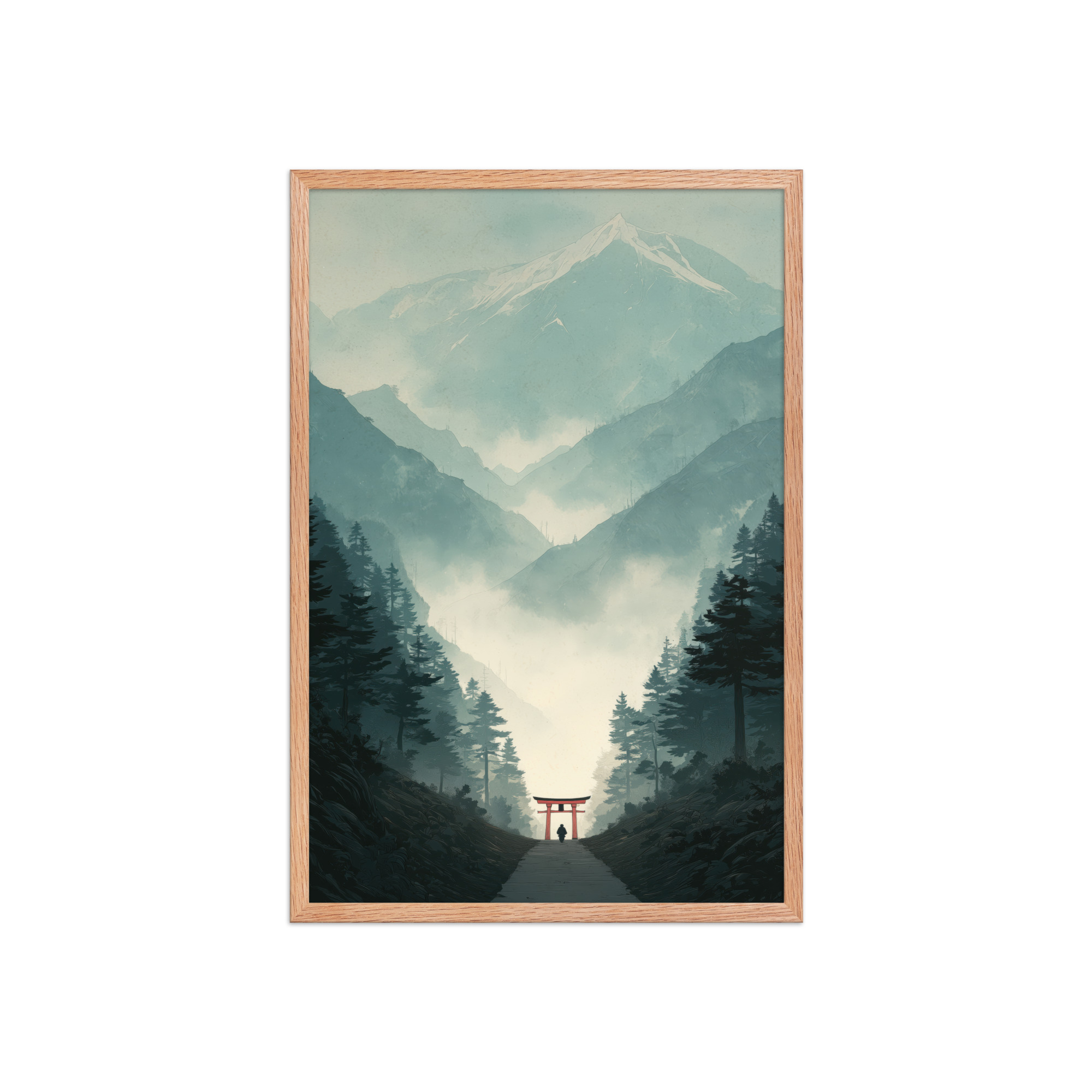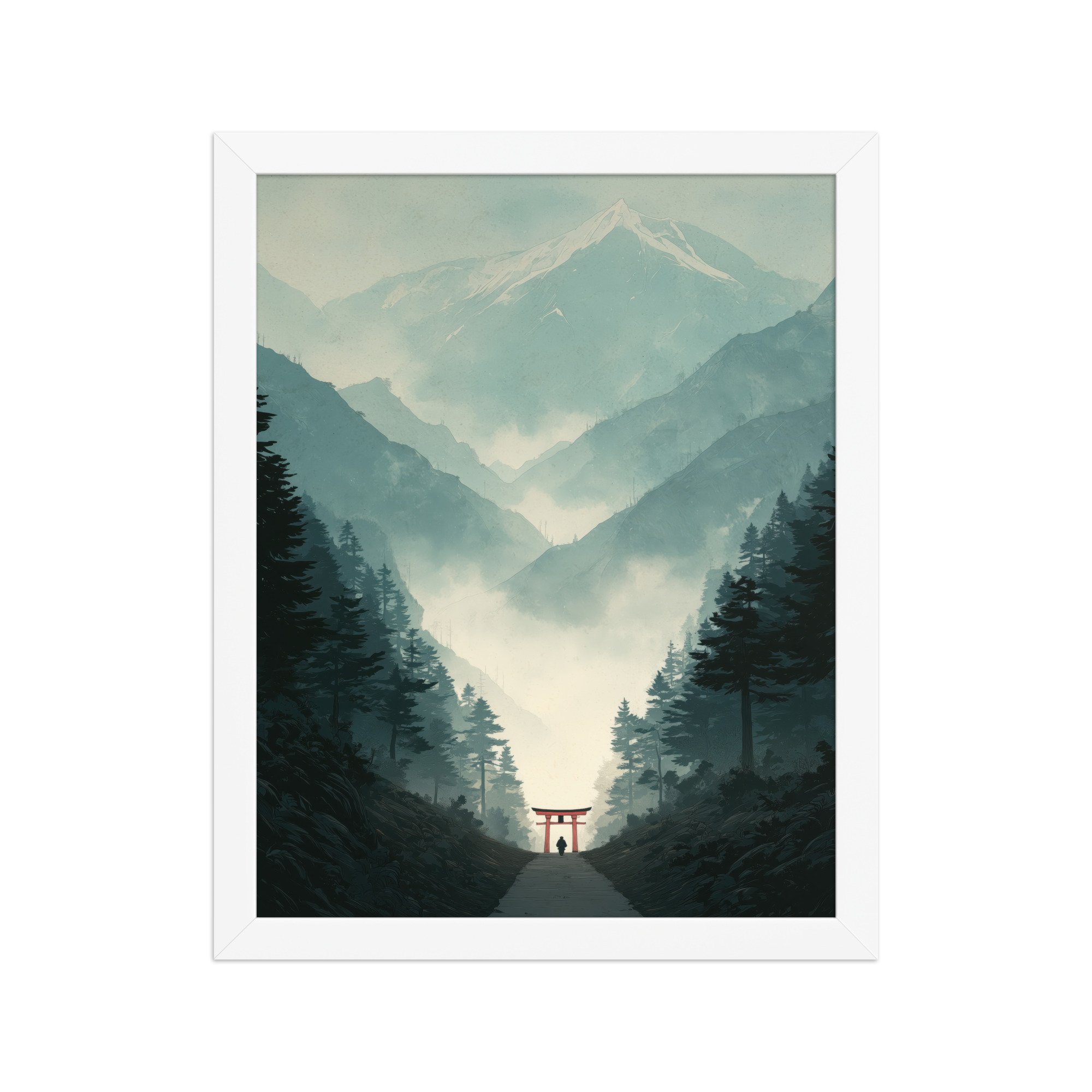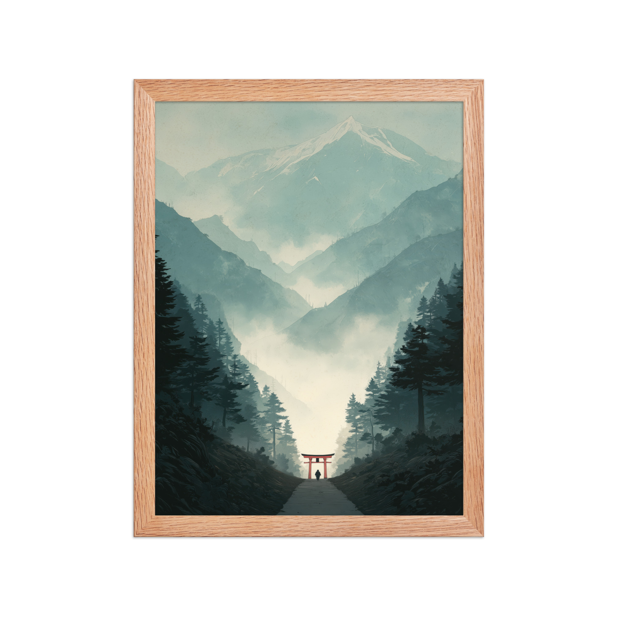A quiet mountain pass opens toward a lone torii gate, its vermilion silhouette glowing through layered mist. The soft gradients and woodblock-style textures evoke calm passage, reflection, and arrival.